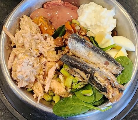 Typical lunch for Hera. What she eats, her puppies drink~ Here we have a small bed of high-grade Orijen kibble (50% puppy kibble, 50% adult kibble [red meat/fish kibbles mix]), topped with slow-cooked pork, sweet potato, and carrots (left and center), going clockwise she's also got chicken liver, cottage cheese, a hardboiled free-range egg (quartered), spinach, chopped asparagus, and sardines in olive oil. Yes, she eats better than I do haha!