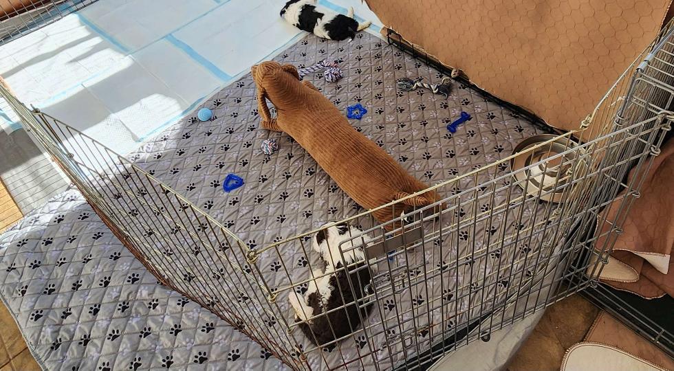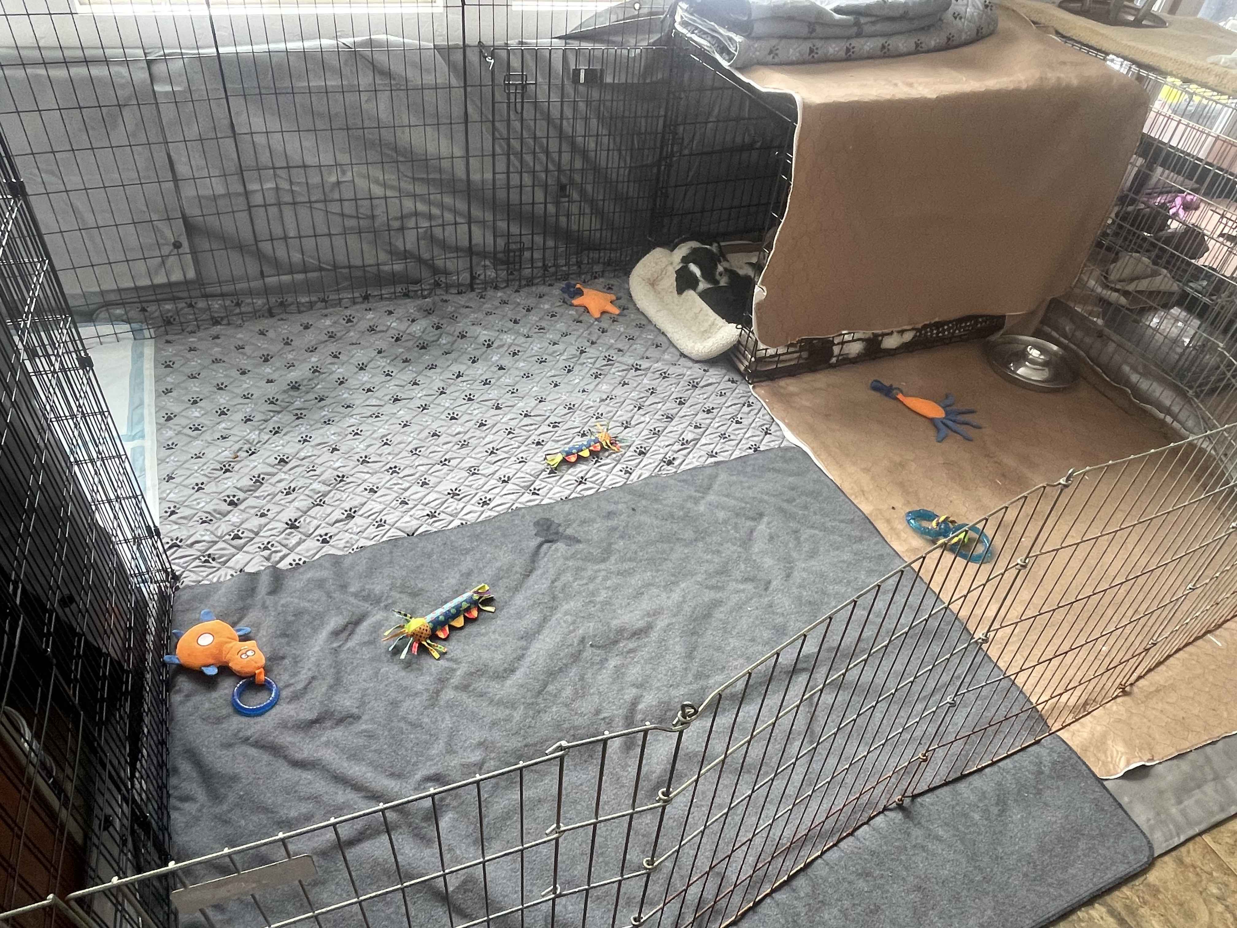Puppies are in a new home! We got furniture moved, pen set up, and all the fixings put in yesterday (the Friday after Christmas), but wanted to give the puppies (and ourselves) daylight hours to adjust to the move. They've got ample room to get their wiggles out now, and the pen will never be this clean again. 12 puppies, new tarps for mess control, we do our best and brace for the worst haha~