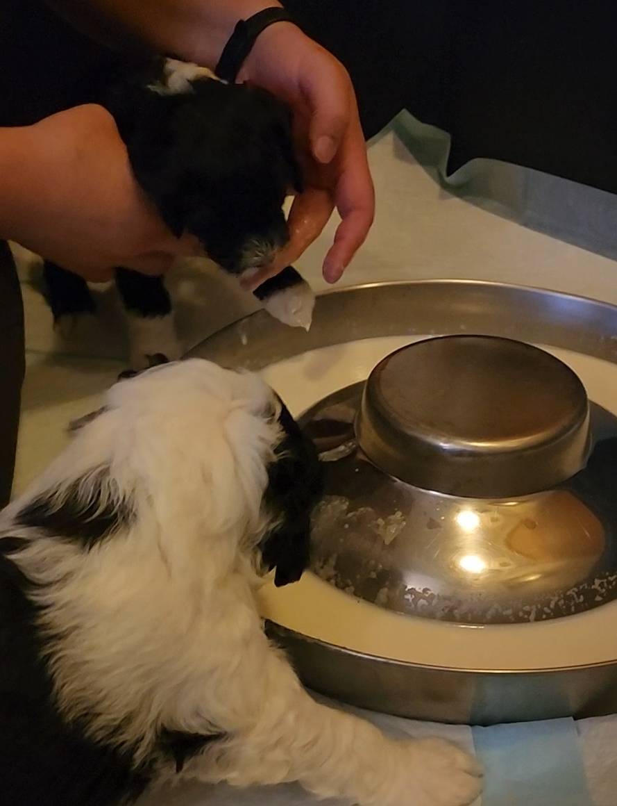 Today's the dreaded day... We're graduating from bottles to bowls. Or, trying to. Trying them out, let's say. We still keep bottles on hand for those who are getting frustrated and need food how they're used to getting food, which is normal! Especially with such a big litter. Many, many paper towels, puppy wipes, and piddle pads perished in today's efforts, but Hera enjoyed helping with the cleanup work~ Including what was left behind in their food bowl haha!
