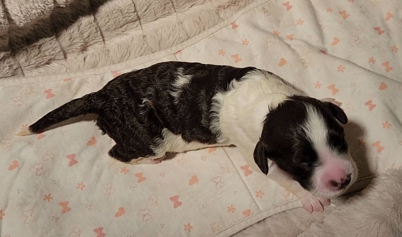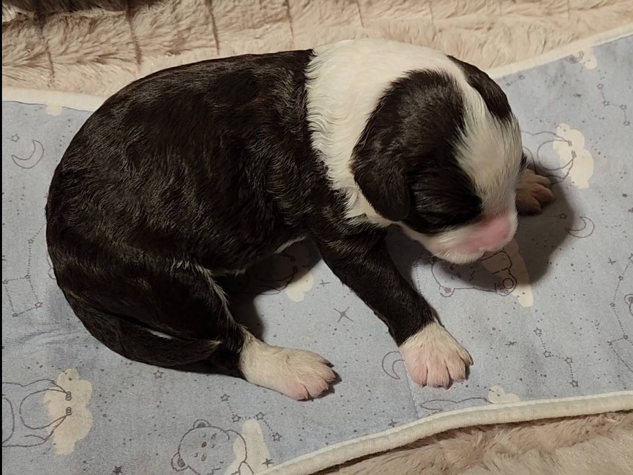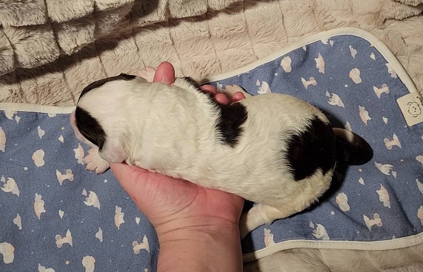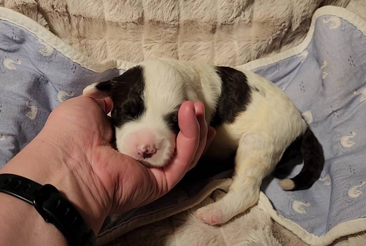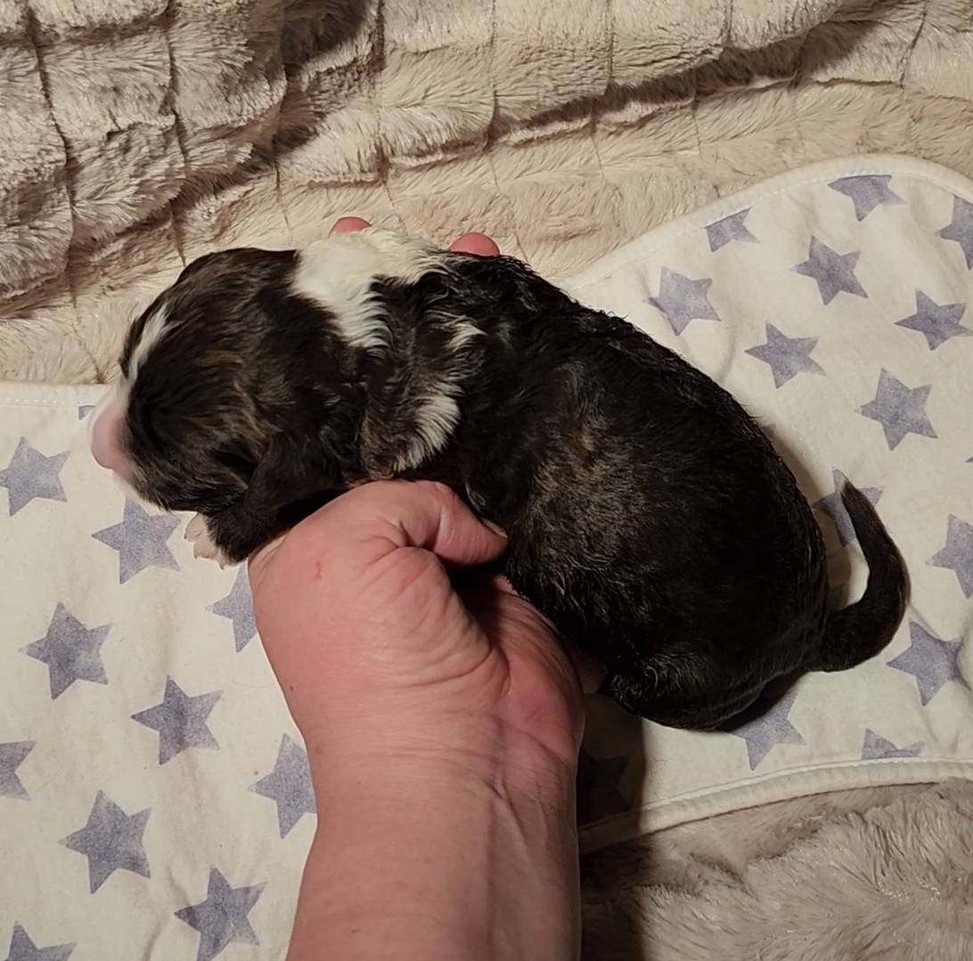 Born on 11/22, 2025, at 1:24pm, this boy is our only black parti puppy! He's a very handsome layout, in my opinion, reminds me a tuxedo with buttons so far, quite dashing (in my opinion). We're accustomed to pups being 'born in pairs,' followed by a bit more of a break, so to have him come in less than 20 minutes later was a welcome surprise - this his brother outdid him. This little boy, our only black parti coat, weighted in at 9.9oz.