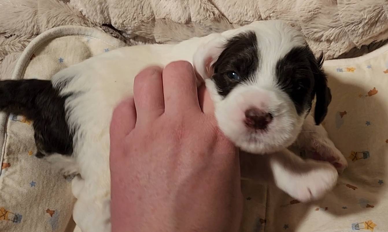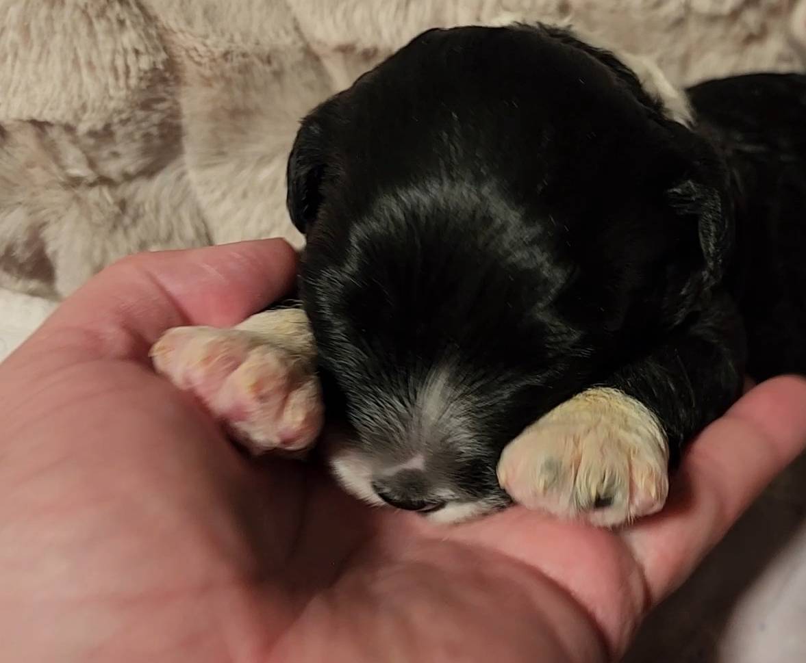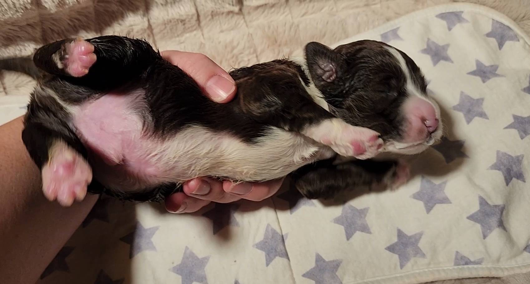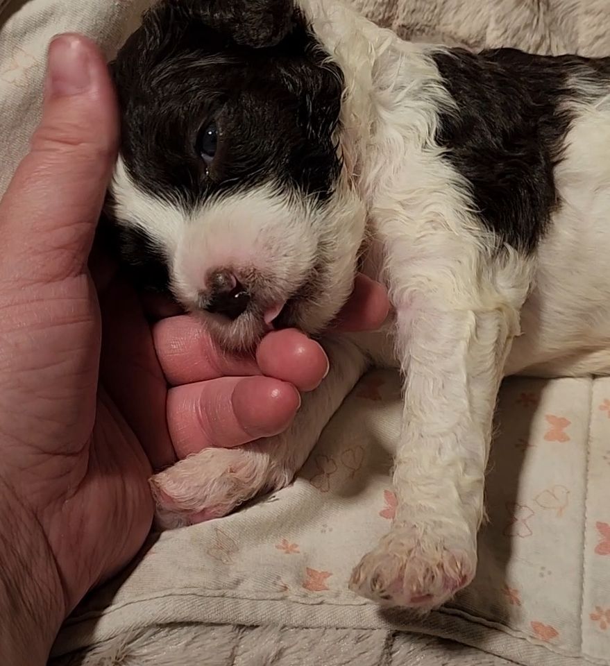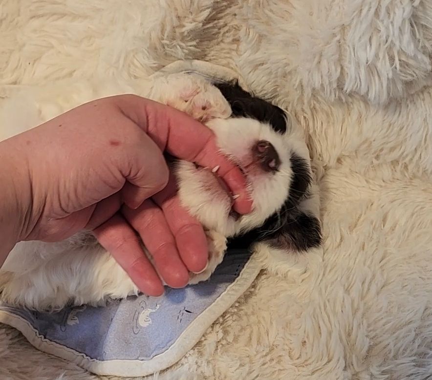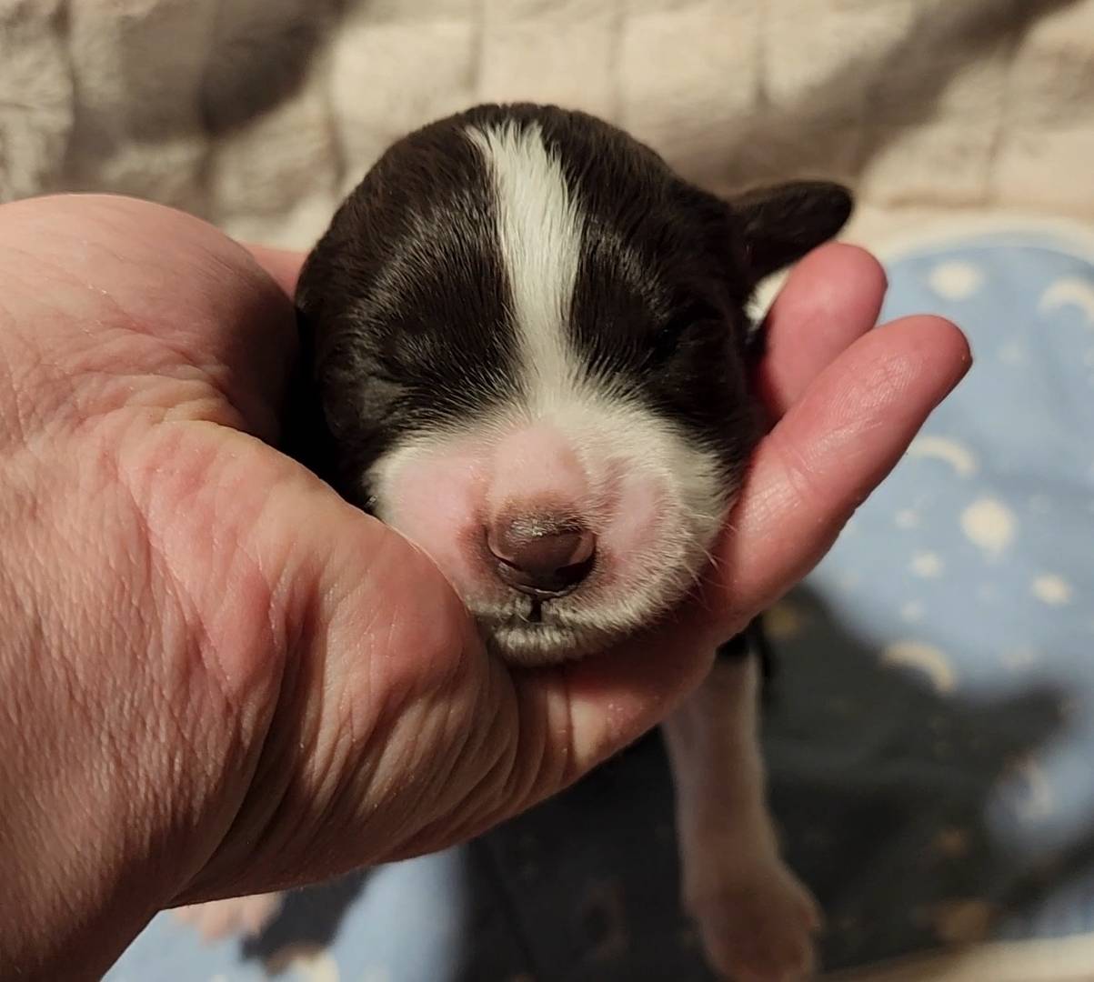 Born on 11/22, 2025, at 1:24pm, this boy is our only black parti puppy! He's a very handsome layout, in my opinion, reminds me a tuxedo with buttons so far, quite dashing (in my opinion). We're accustomed to pups being 'born in pairs,' followed by a bit more of a break, so to have him come in less than 20 minutes later was a welcome surprise - this his brother outdid him. This little boy, our only black parti coat, weighted in at 9.9oz.