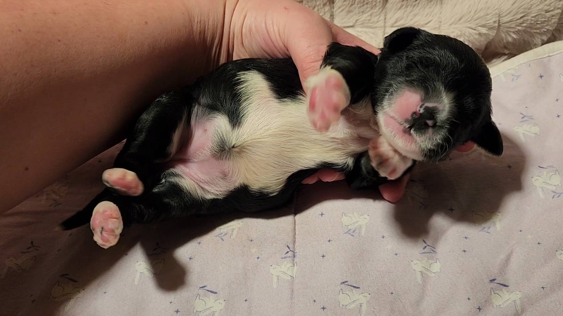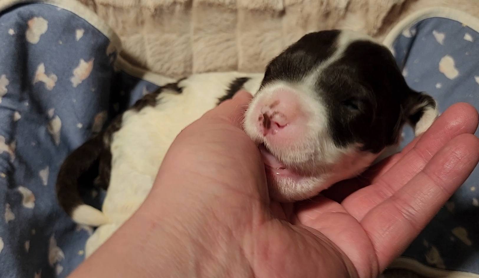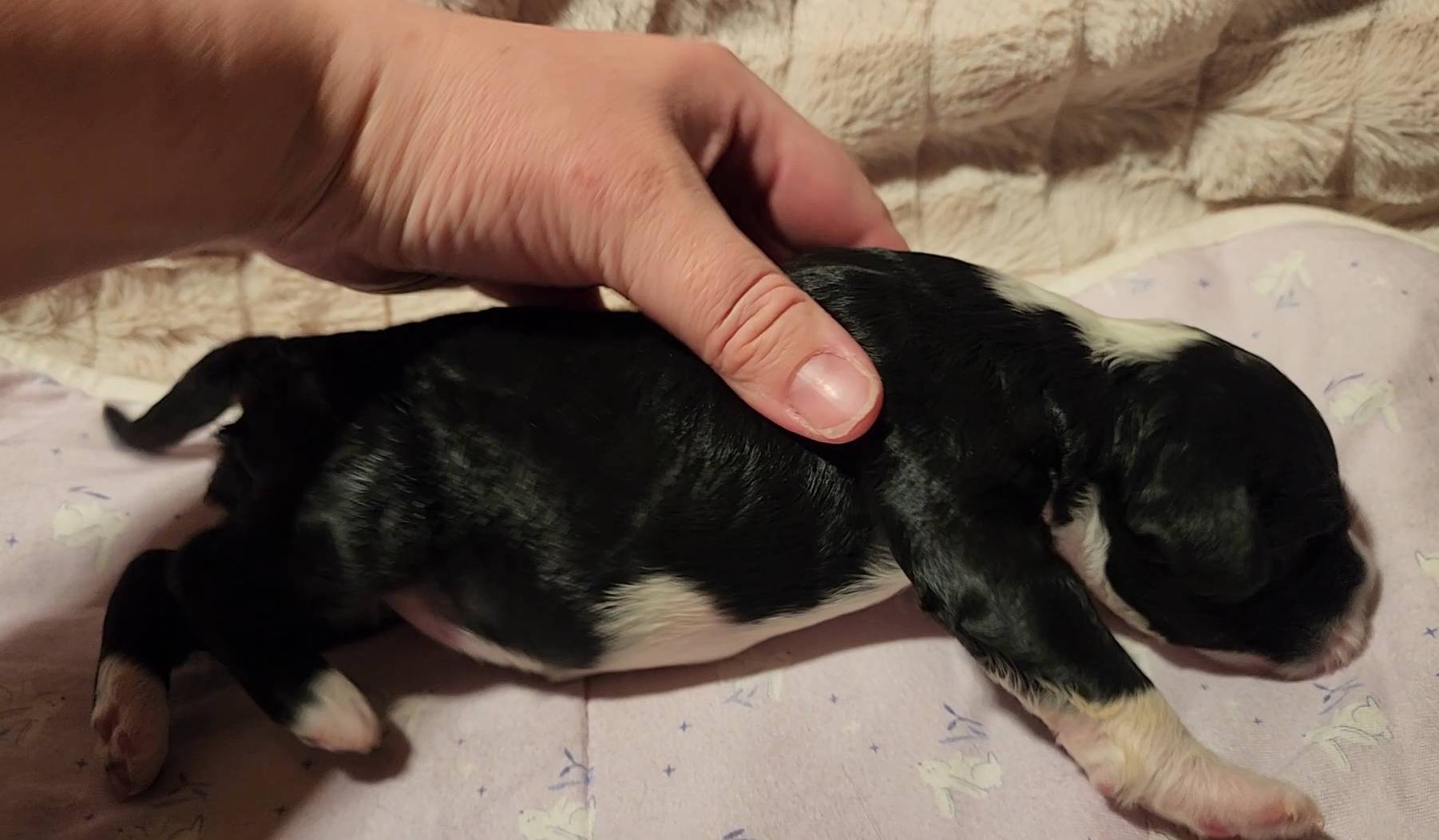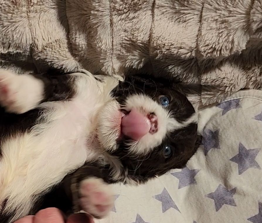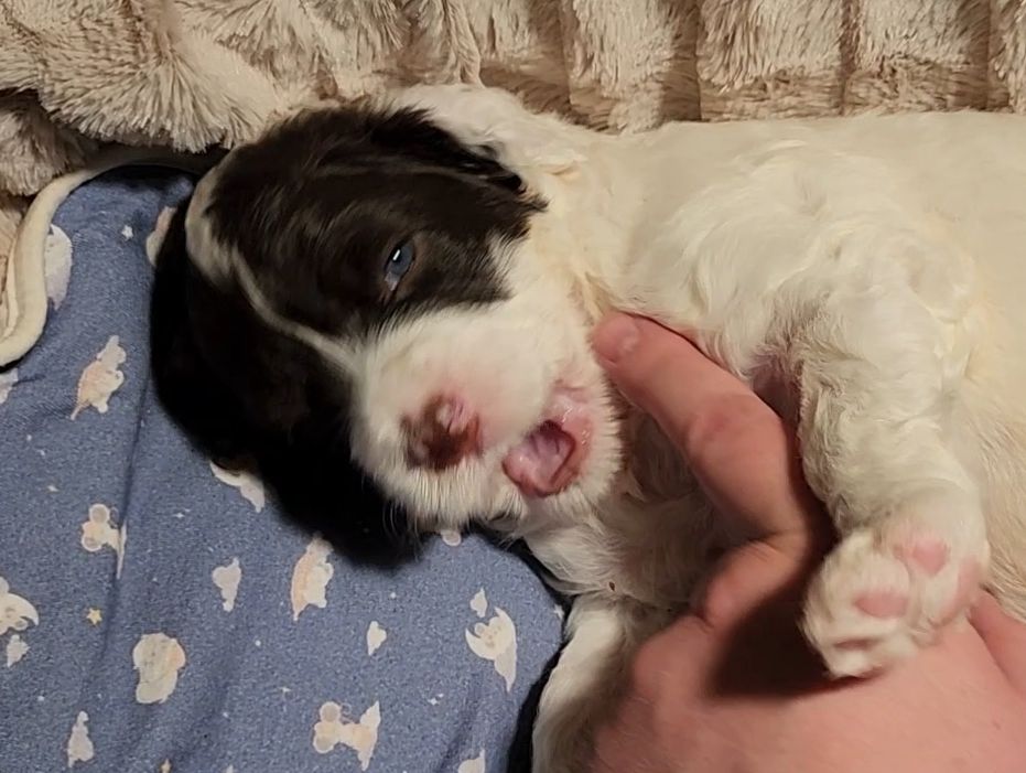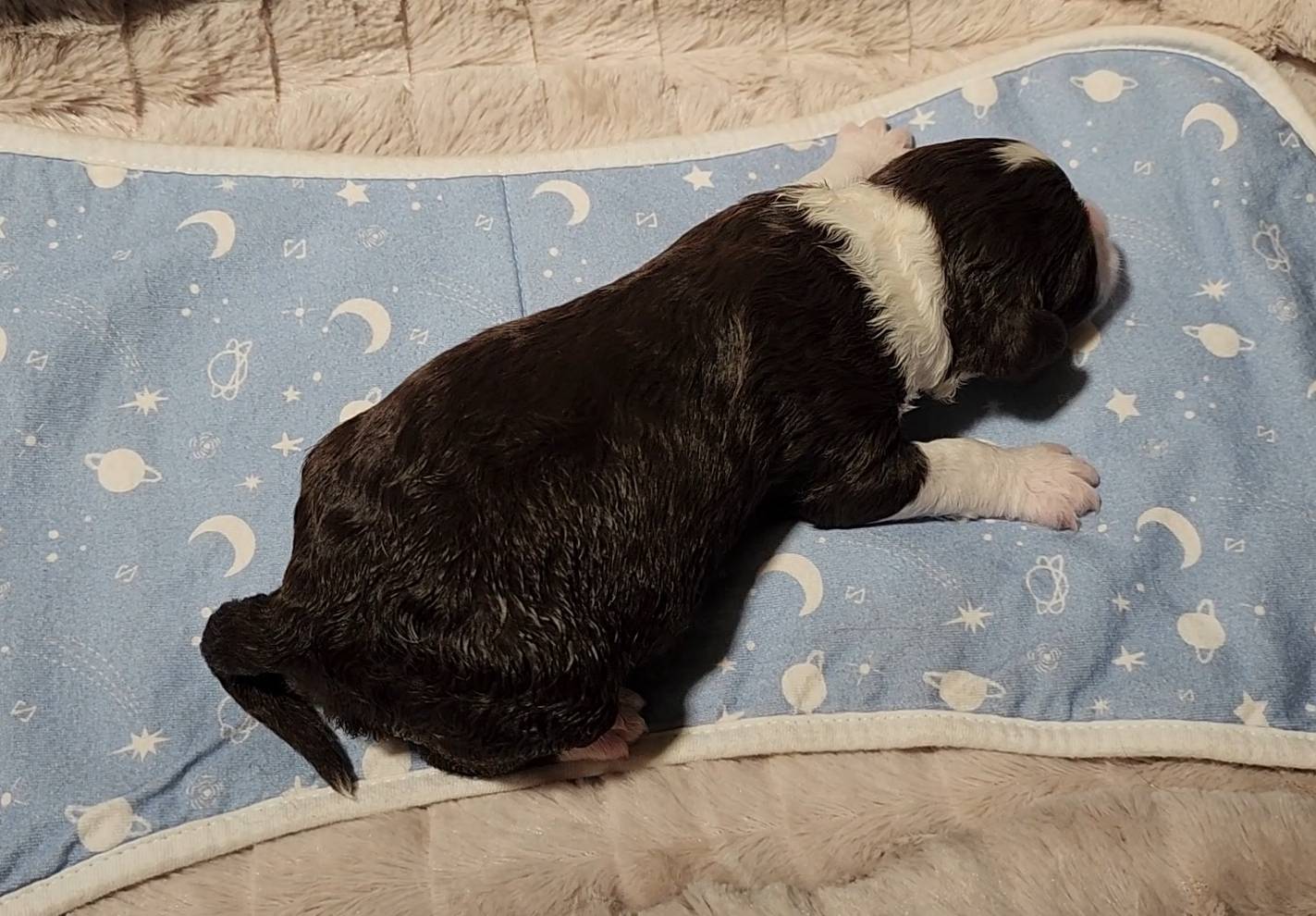 Born on 11/22, 2025, at 1:24pm, this boy is our only black parti puppy! He's a very handsome layout, in my opinion, reminds me a tuxedo with buttons so far, quite dashing (in my opinion). We're accustomed to pups being 'born in pairs,' followed by a bit more of a break, so to have him come in less than 20 minutes later was a welcome surprise - this his brother outdid him. This little boy, our only black parti coat, weighted in at 9.9oz.