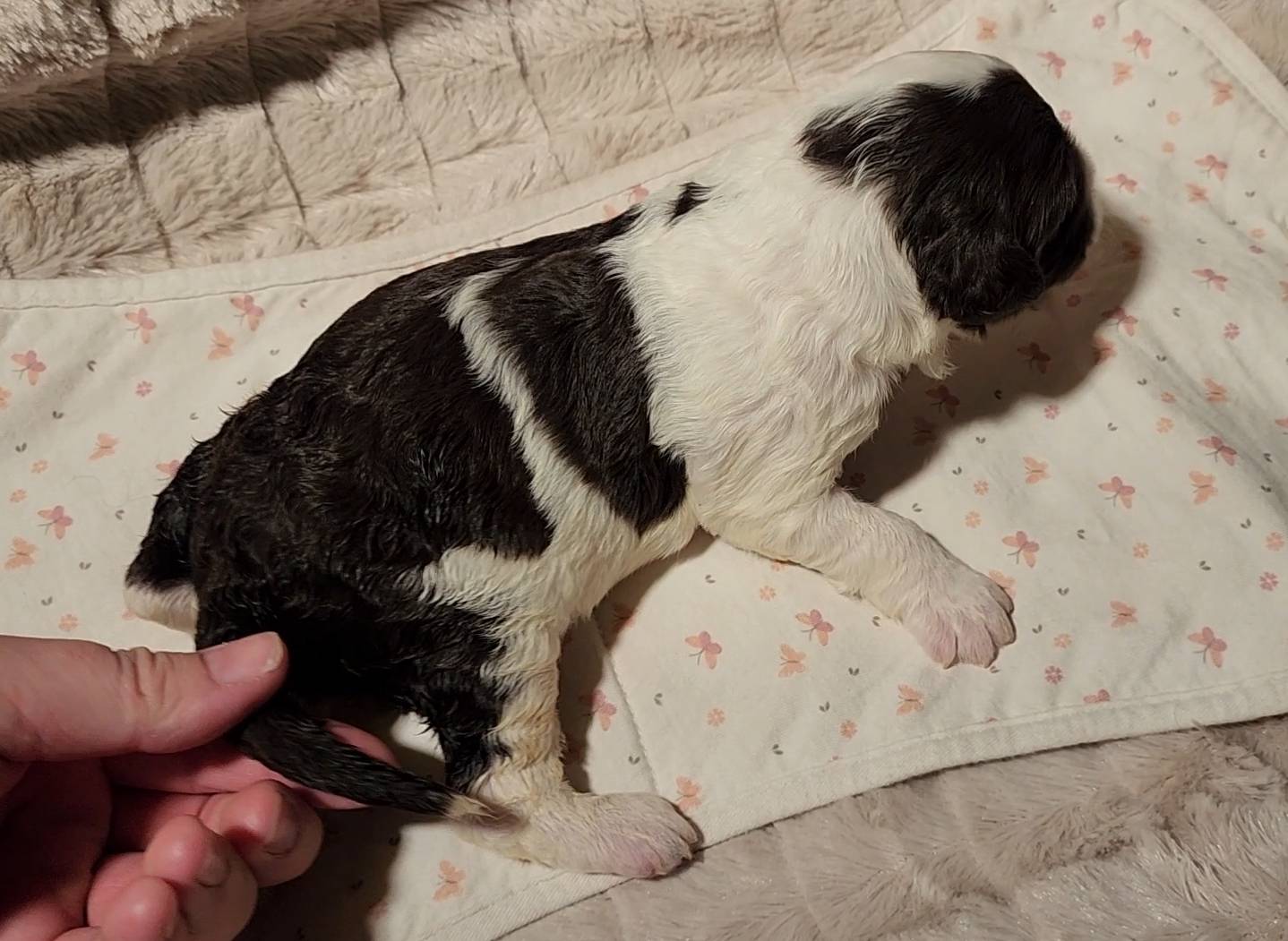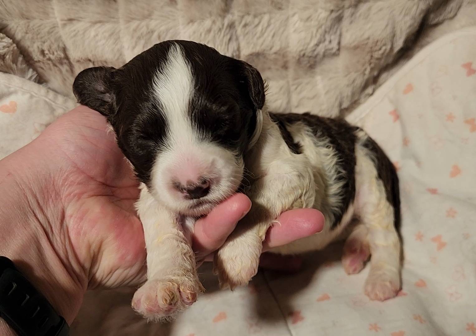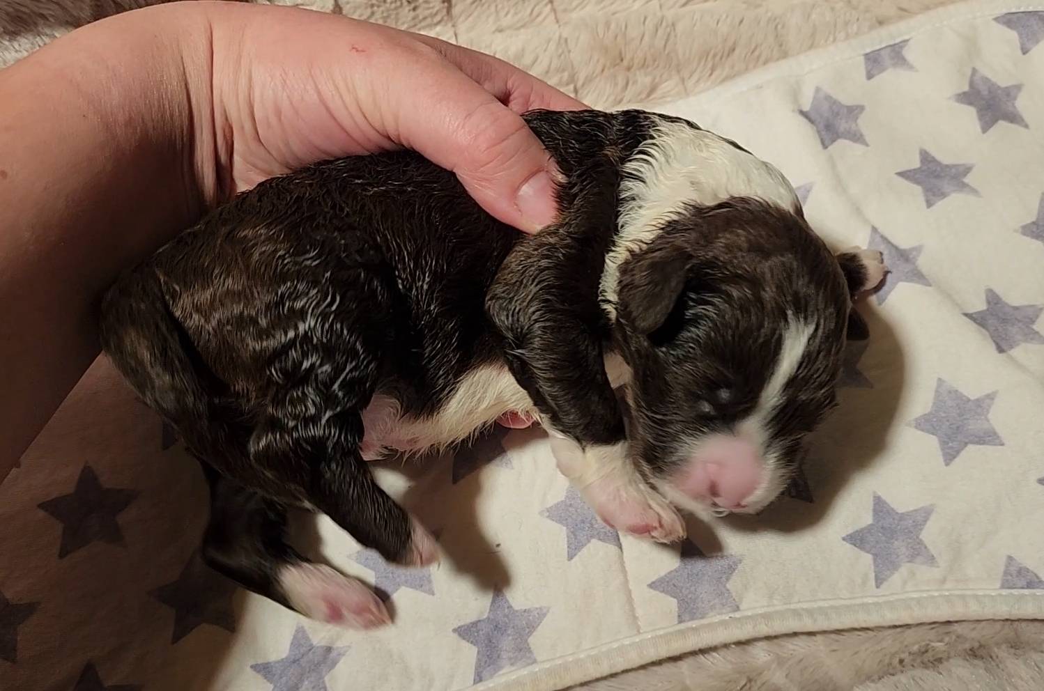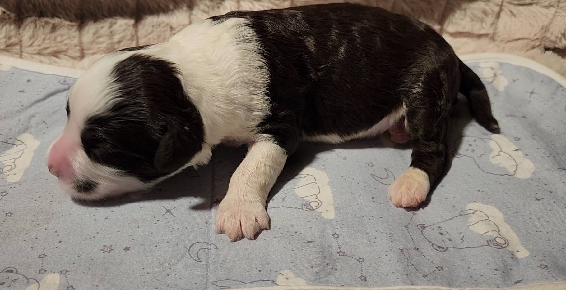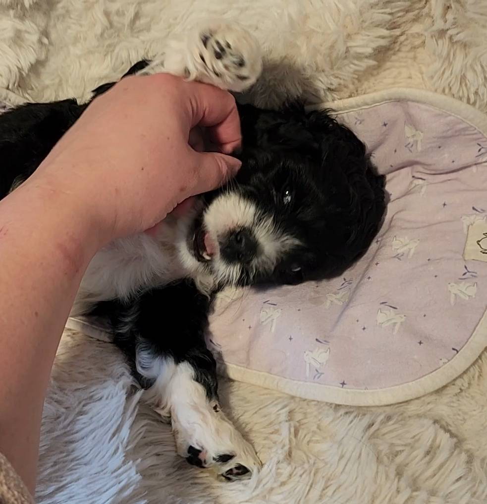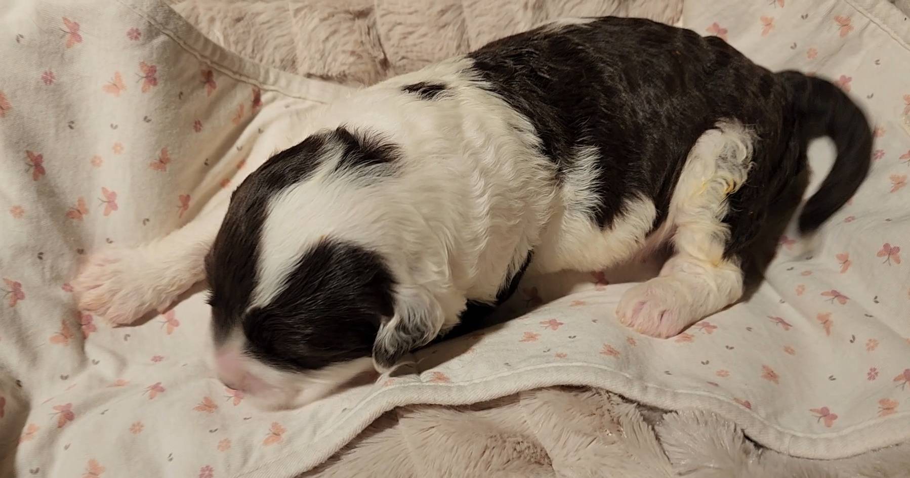 Born on 11/22, 2025, at 1:24pm, this boy is our only black parti puppy! He's a very handsome layout, in my opinion, reminds me a tuxedo with buttons so far, quite dashing (in my opinion). We're accustomed to pups being 'born in pairs,' followed by a bit more of a break, so to have him come in less than 20 minutes later was a welcome surprise - this his brother outdid him. This little boy, our only black parti coat, weighted in at 9.9oz.