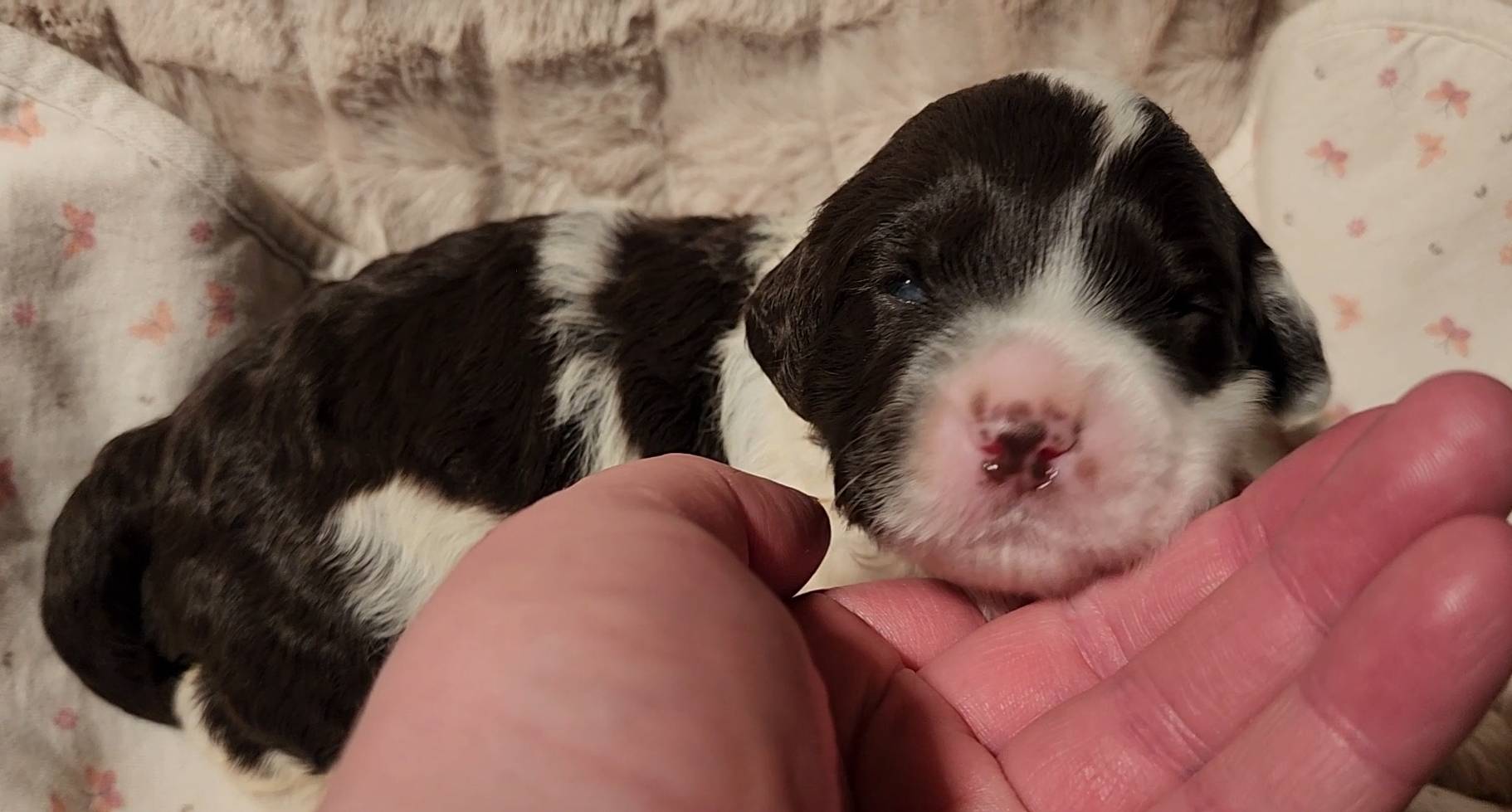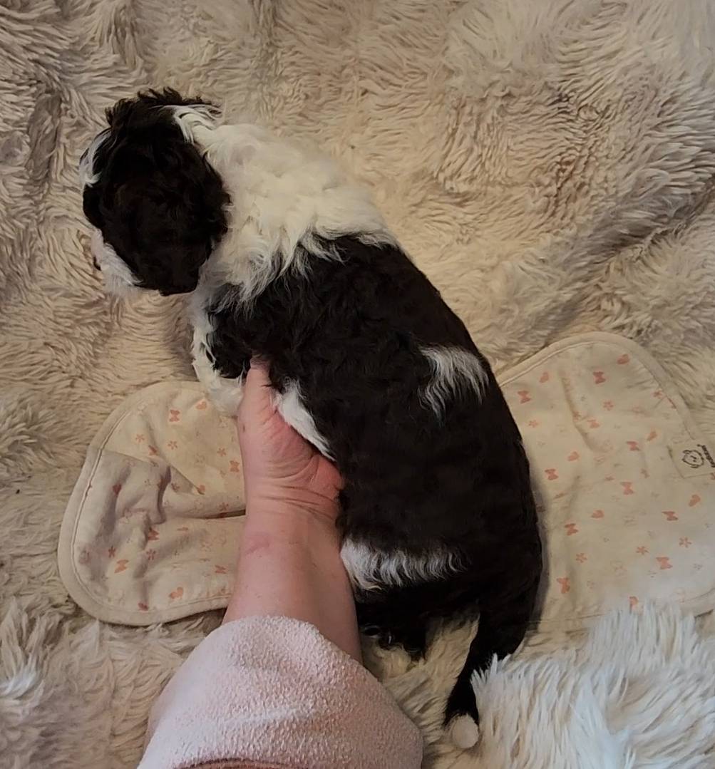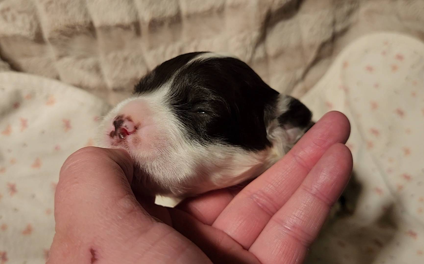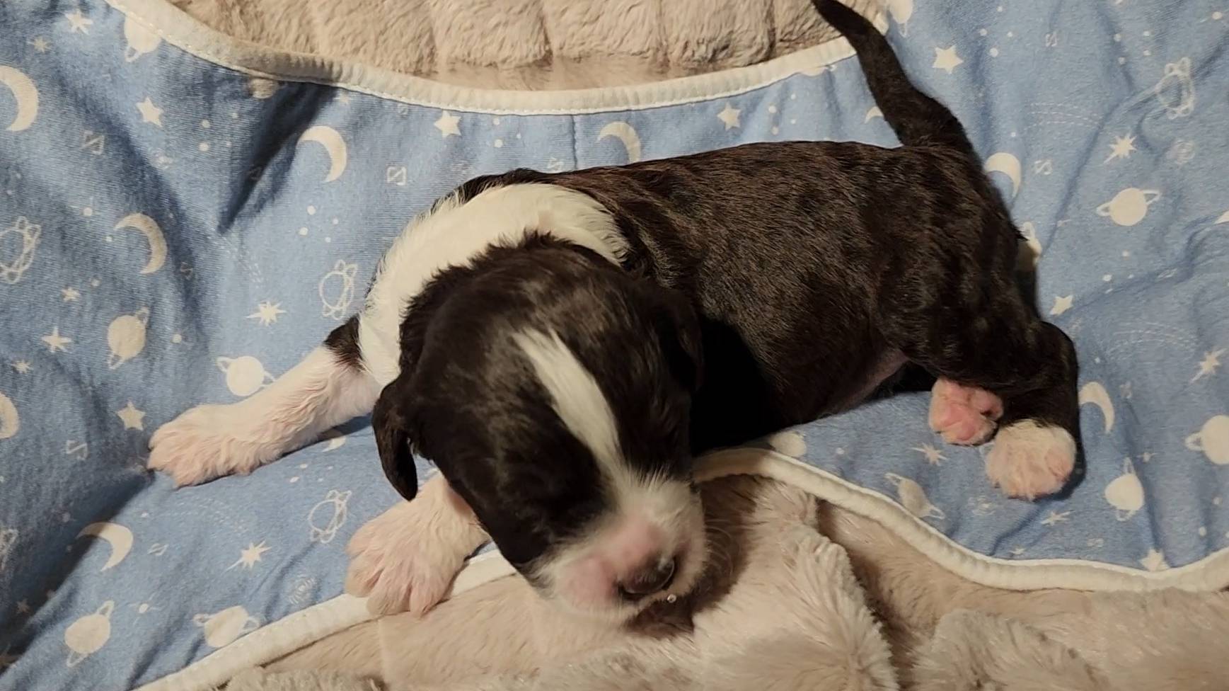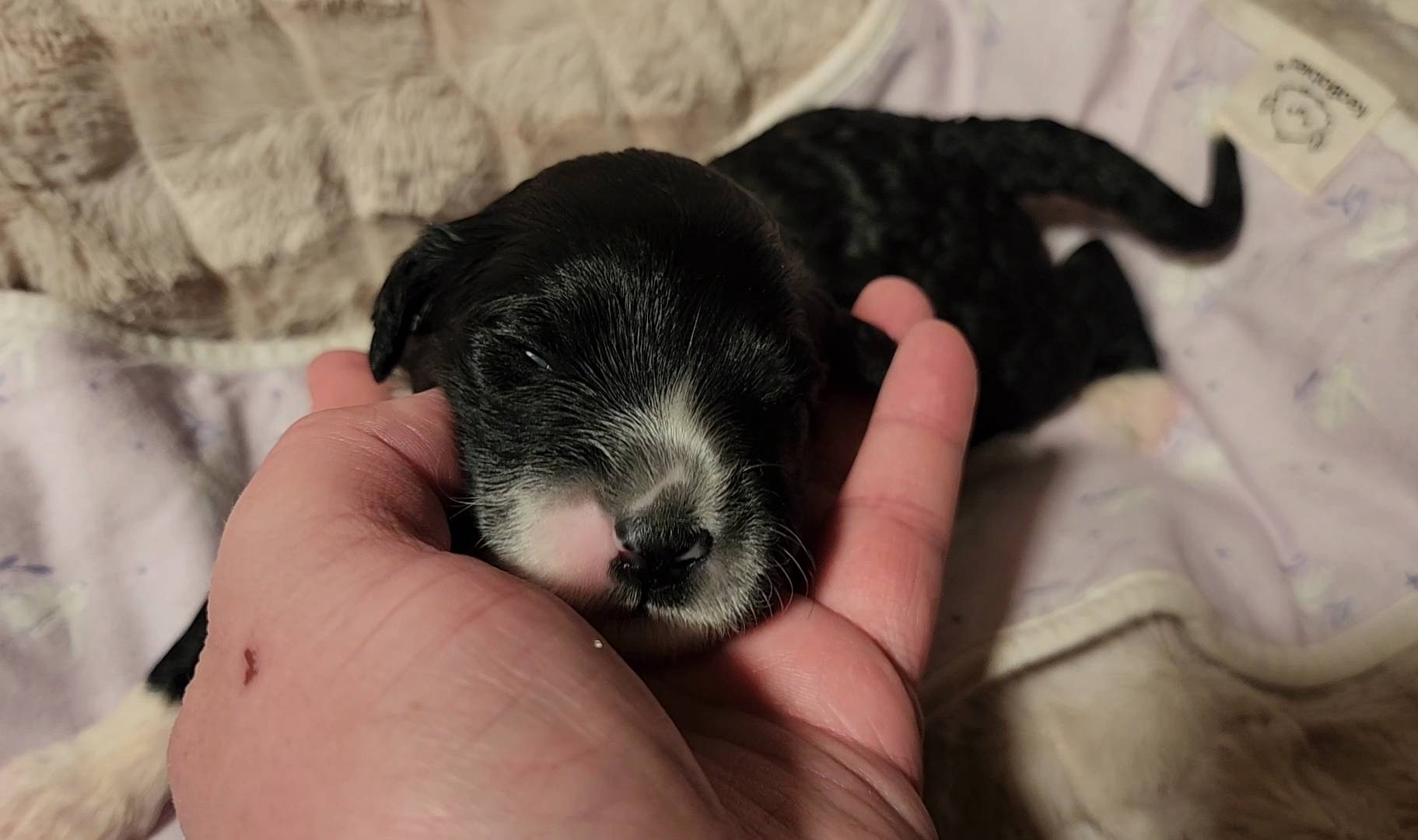 Born on 11/22, 2025, at 1:24pm, this boy is our only black parti puppy! He's a very handsome layout, in my opinion, reminds me a tuxedo with buttons so far, quite dashing (in my opinion). We're accustomed to pups being 'born in pairs,' followed by a bit more of a break, so to have him come in less than 20 minutes later was a welcome surprise - this his brother outdid him. This little boy, our only black parti coat, weighted in at 9.9oz.