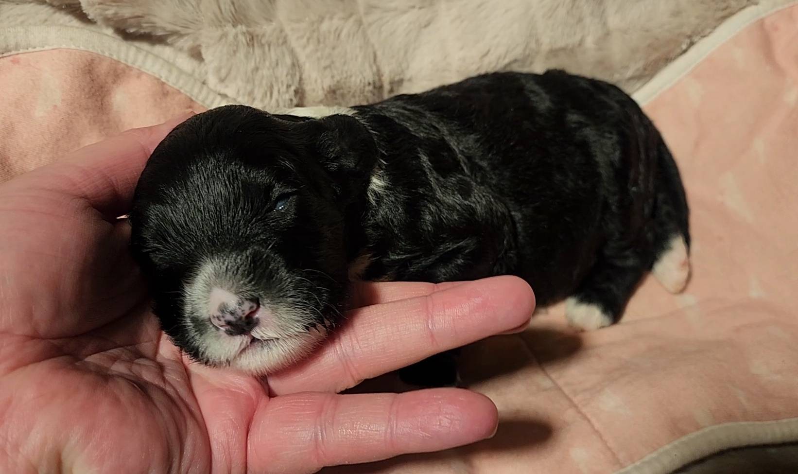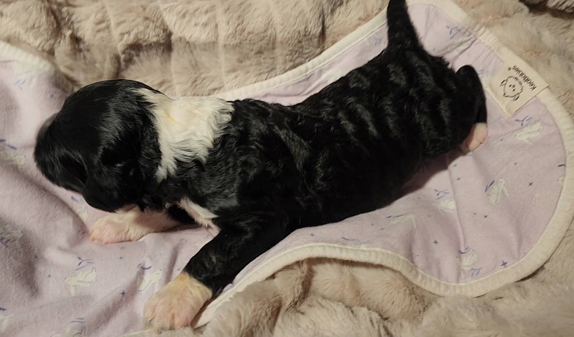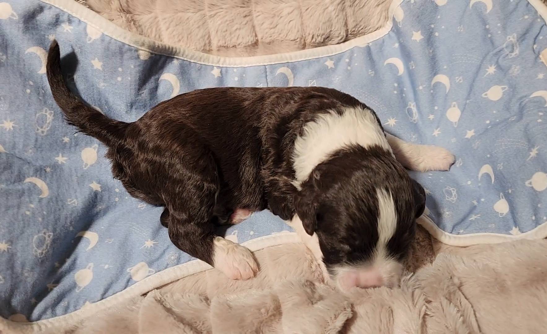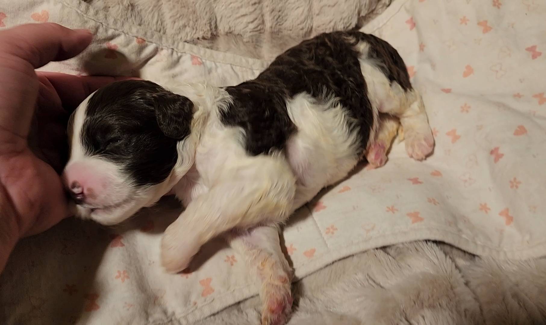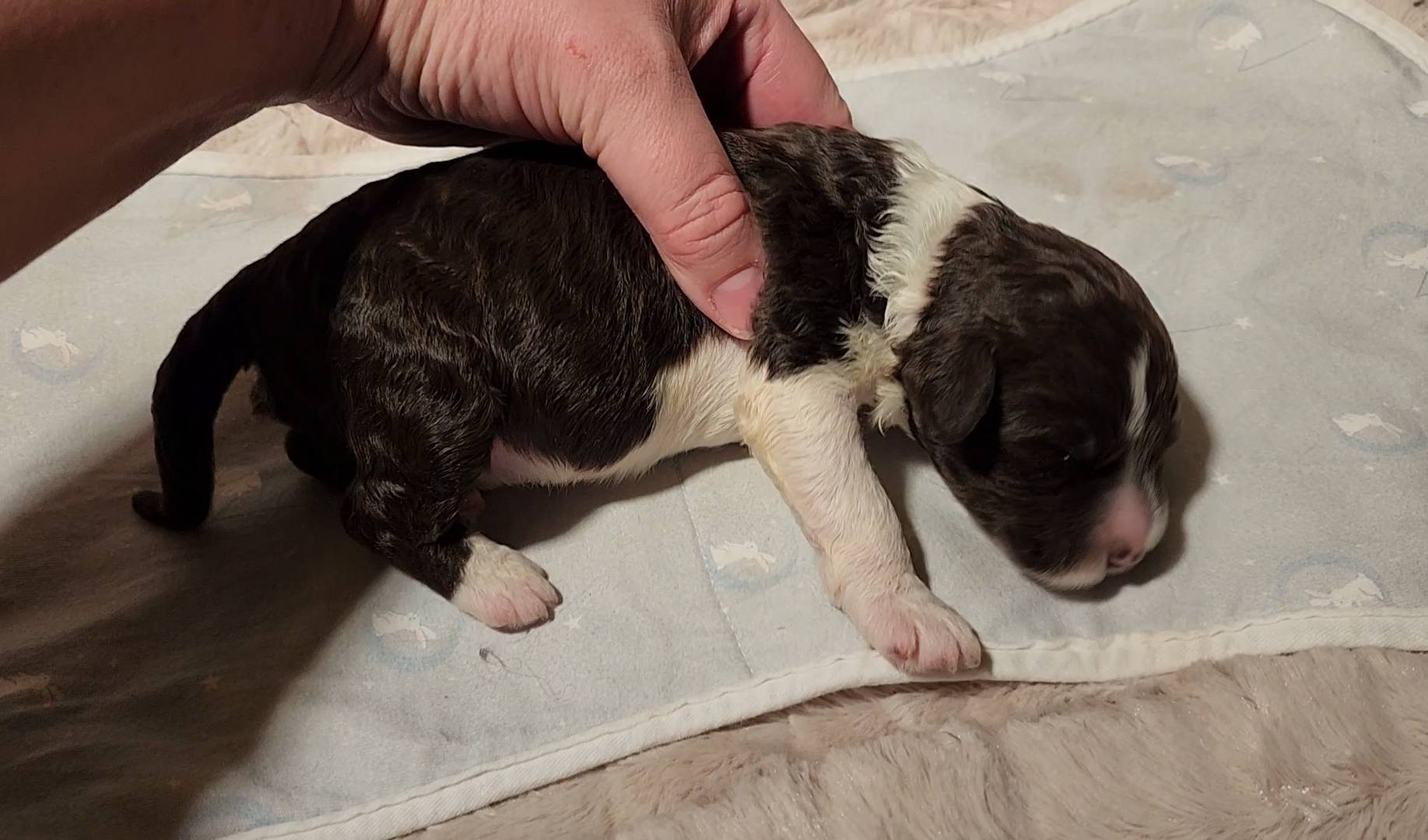 Born on 11/22, 2025, at 1:24pm, this boy is our only black parti puppy! He's a very handsome layout, in my opinion, reminds me a tuxedo with buttons so far, quite dashing (in my opinion). We're accustomed to pups being 'born in pairs,' followed by a bit more of a break, so to have him come in less than 20 minutes later was a welcome surprise - this his brother outdid him. This little boy, our only black parti coat, weighted in at 9.9oz.