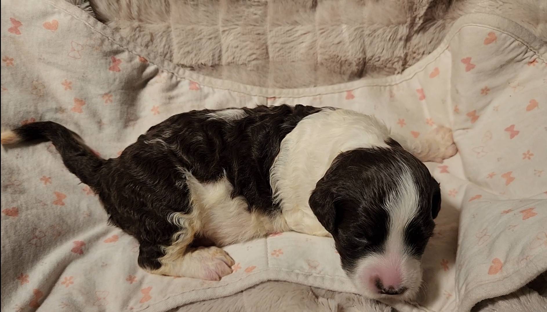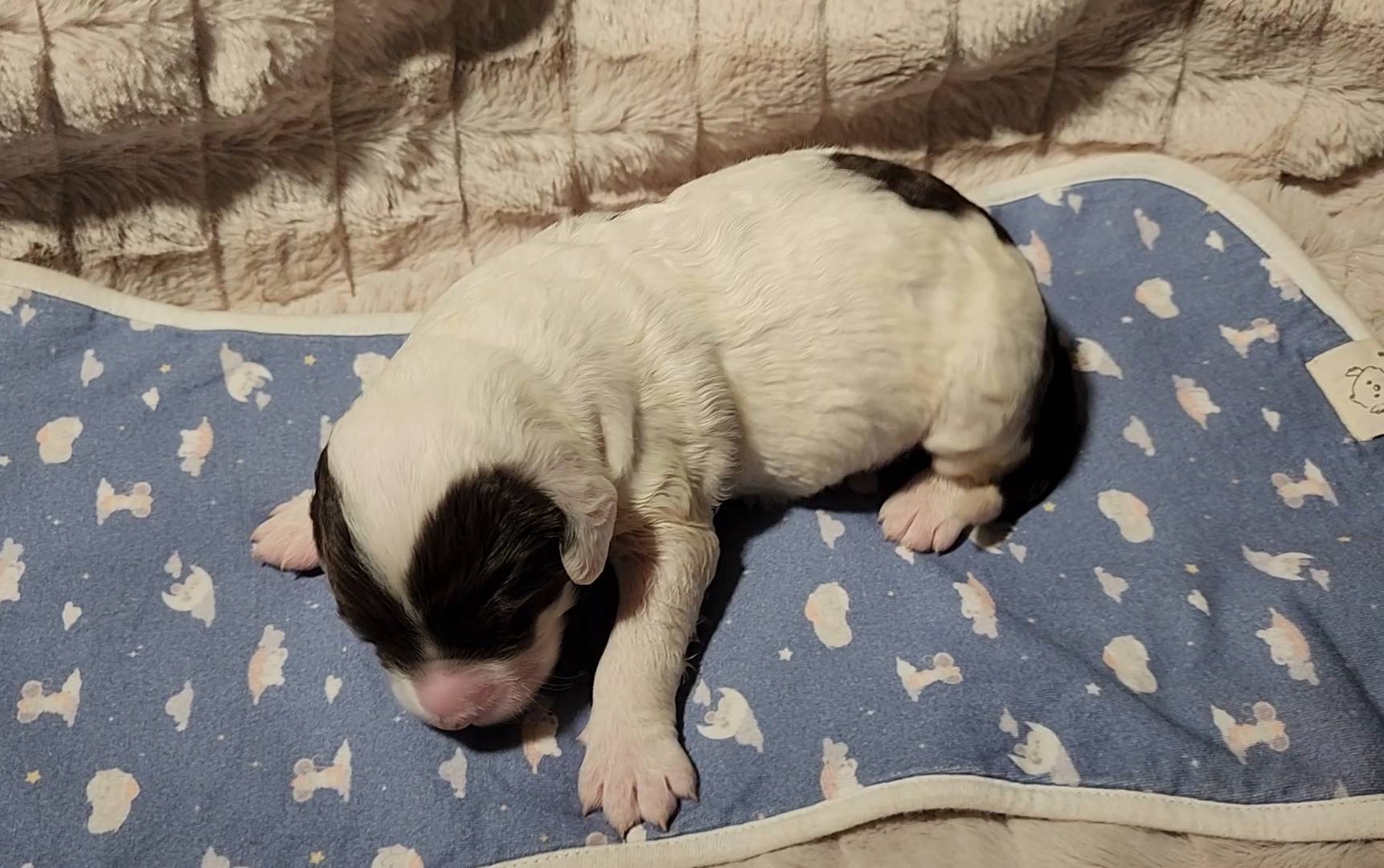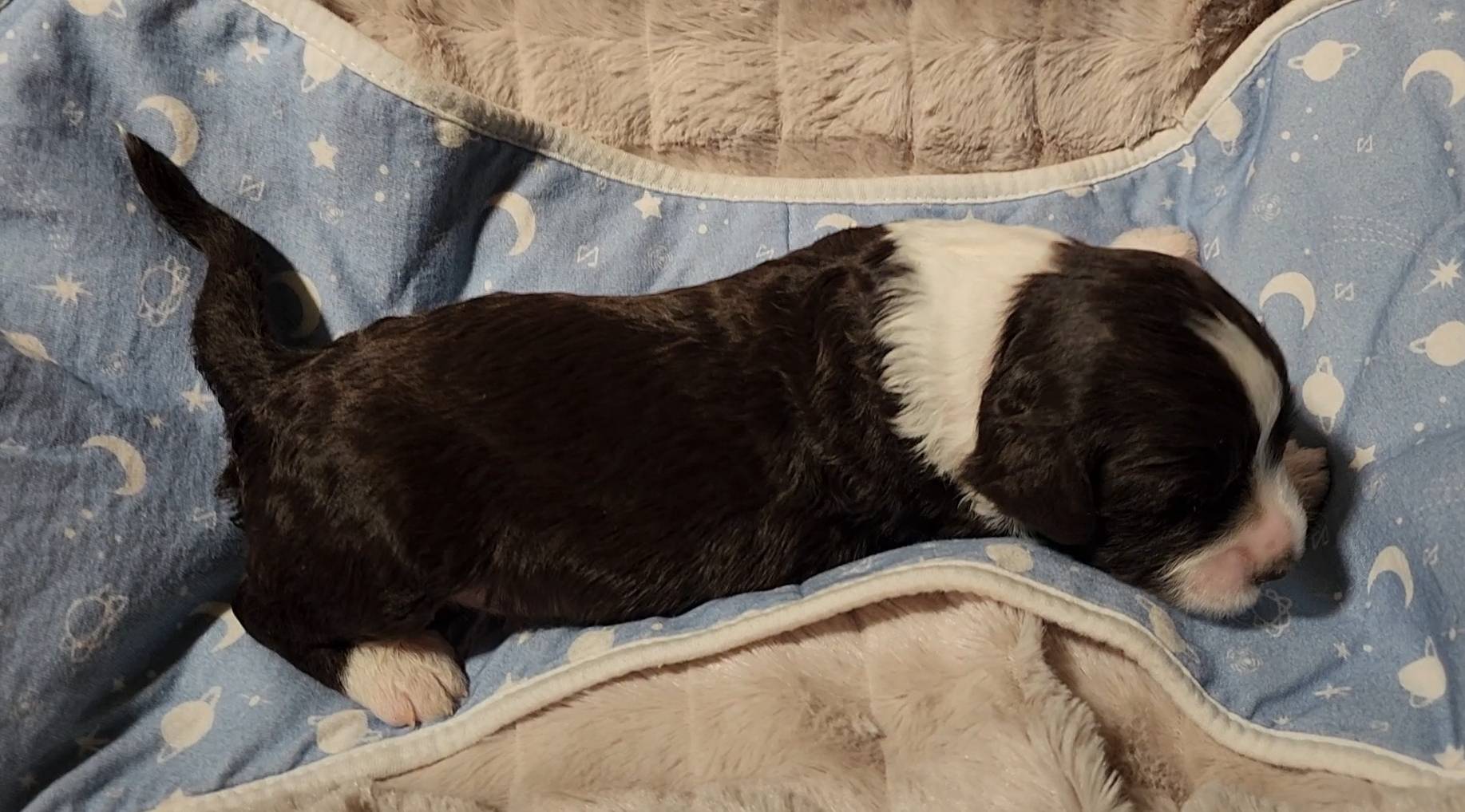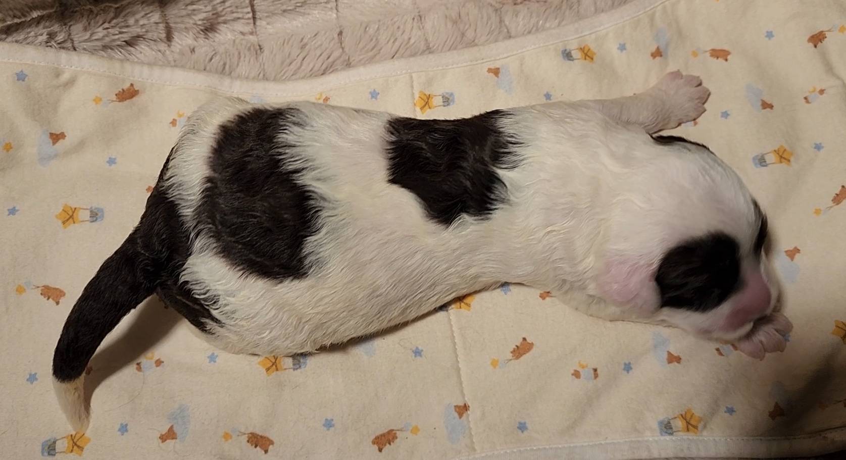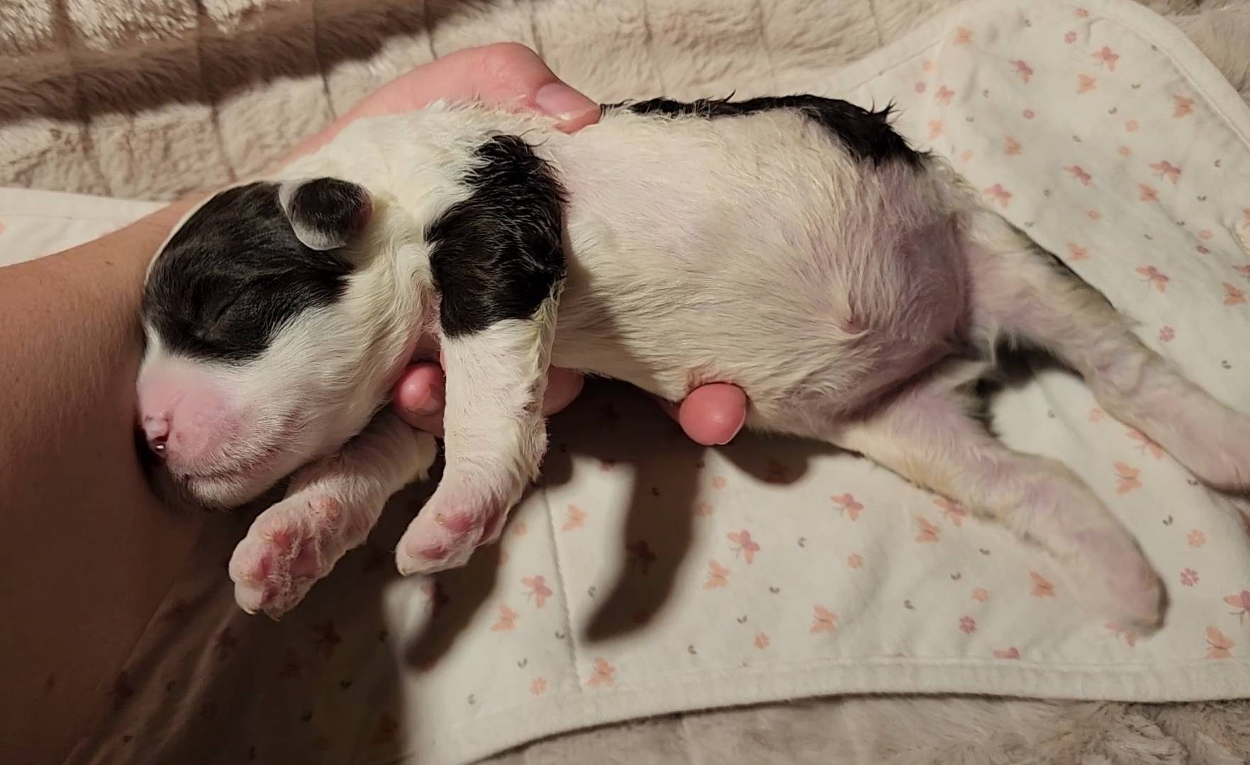 Born on 11/22, 2025, at 1:24pm, this boy is our only black parti puppy! He's a very handsome layout, in my opinion, reminds me a tuxedo with buttons so far, quite dashing (in my opinion). We're accustomed to pups being 'born in pairs,' followed by a bit more of a break, so to have him come in less than 20 minutes later was a welcome surprise - this his brother outdid him. This little boy, our only black parti coat, weighted in at 9.9oz.