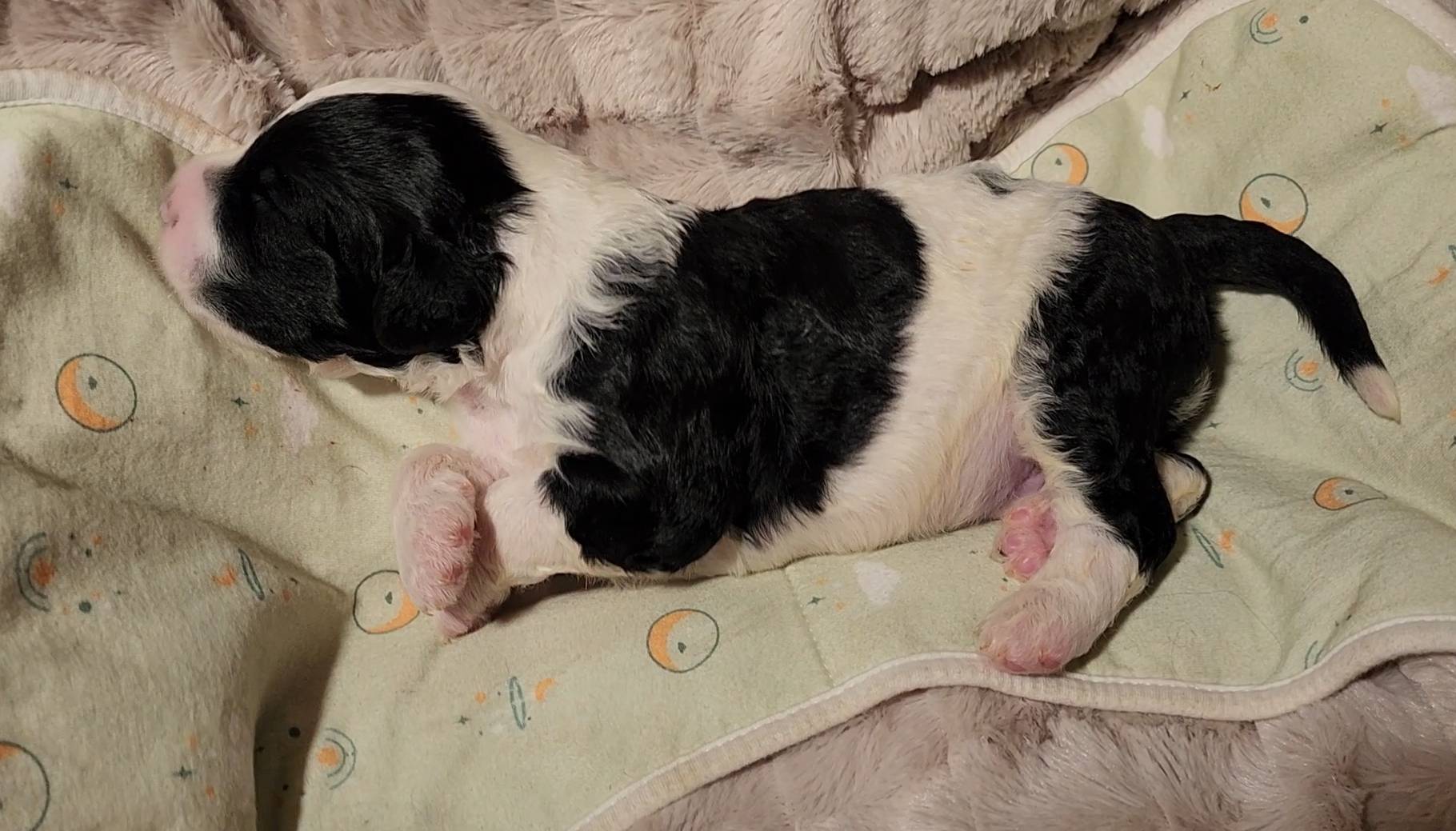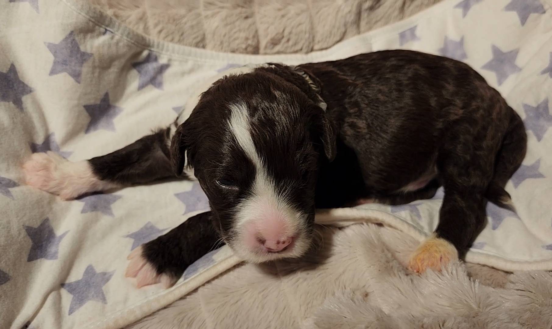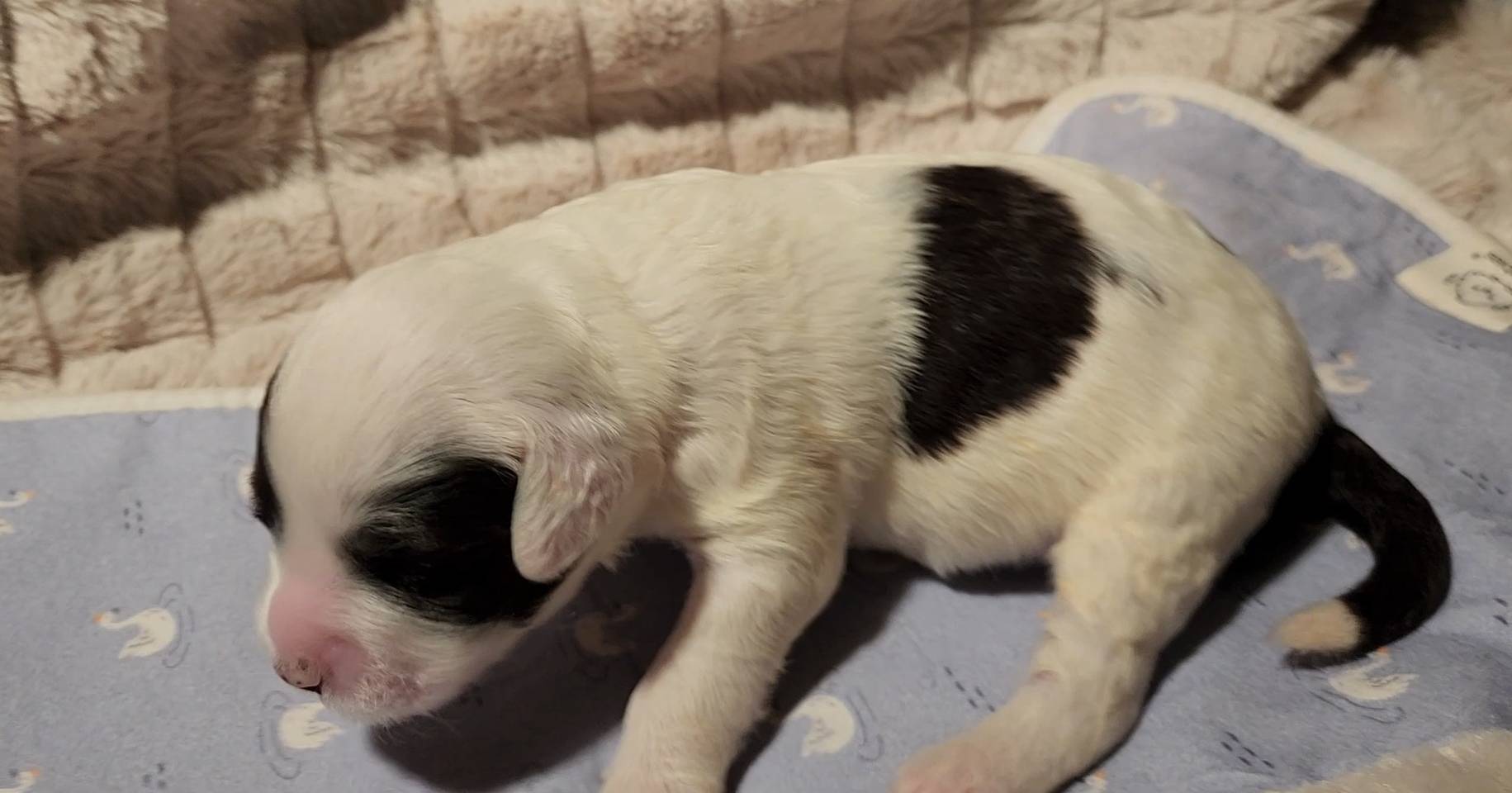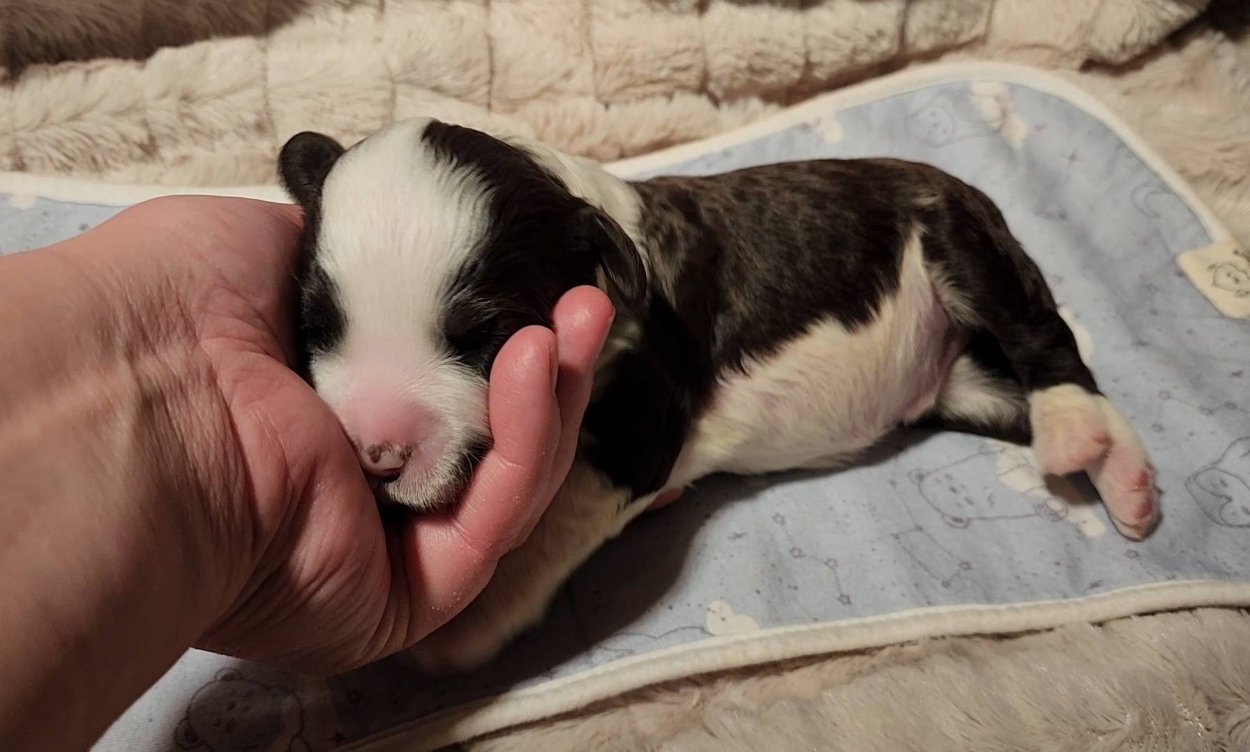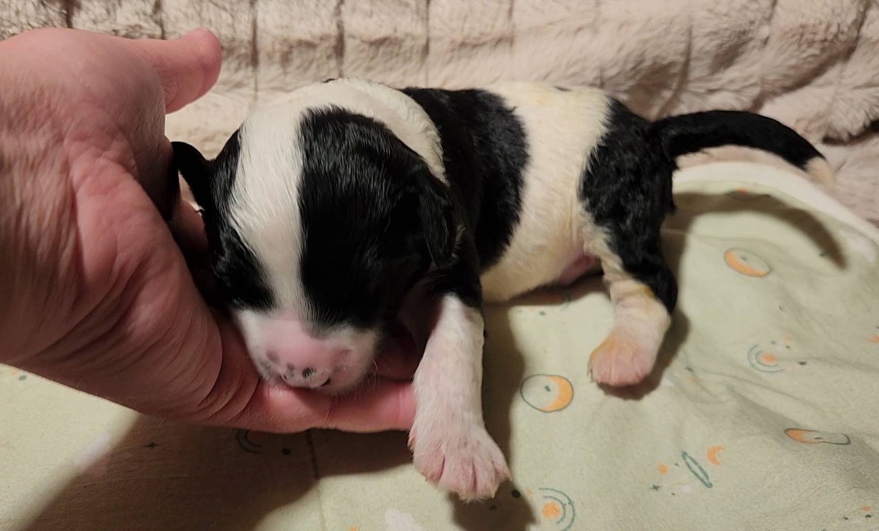 Born on 11/22, 2025, at 1:24pm, this boy is our only black parti puppy! He's a very handsome layout, in my opinion, reminds me a tuxedo with buttons so far, quite dashing (in my opinion). We're accustomed to pups being 'born in pairs,' followed by a bit more of a break, so to have him come in less than 20 minutes later was a welcome surprise - this his brother outdid him. This little boy, our only black parti coat, weighted in at 9.9oz.
