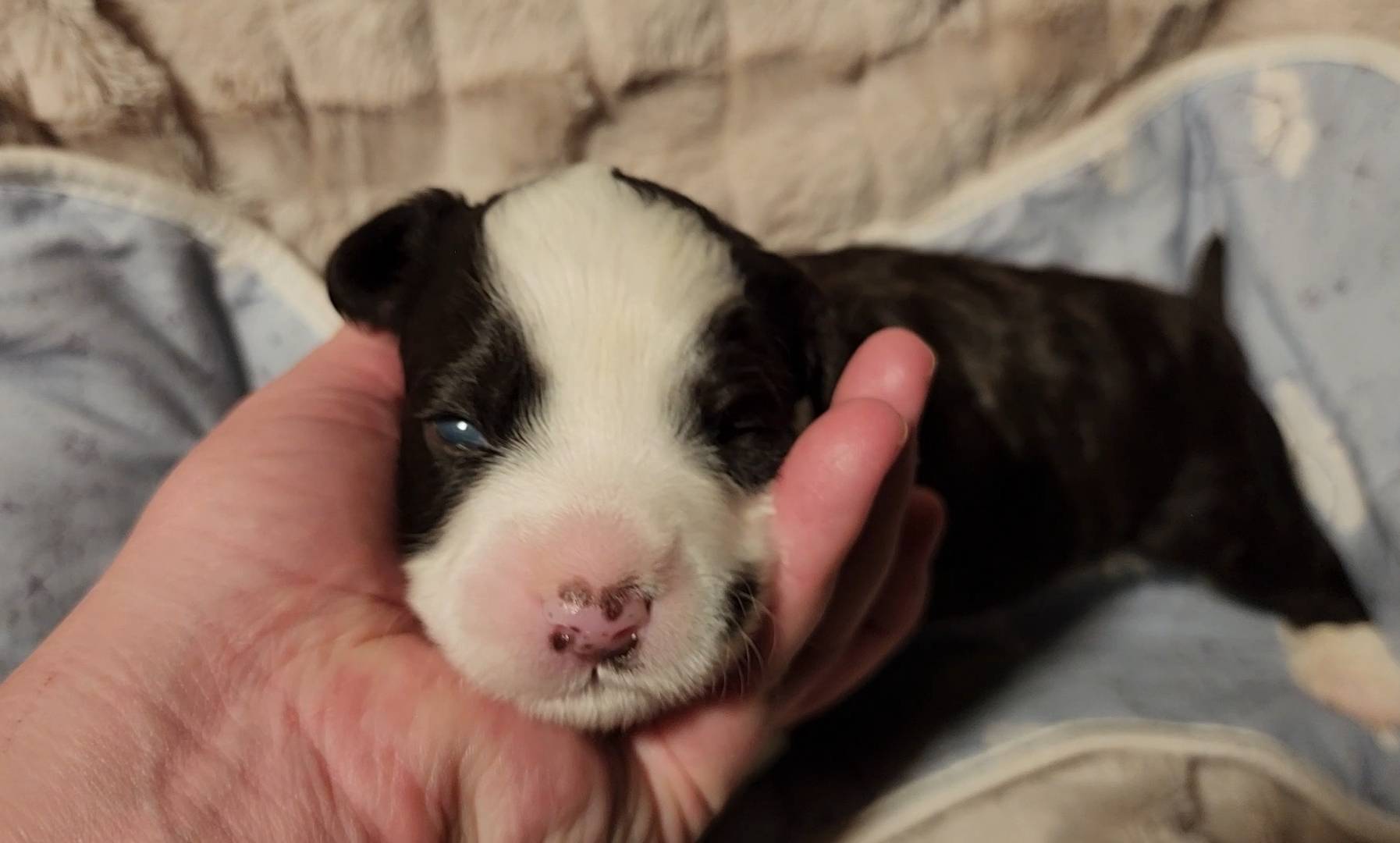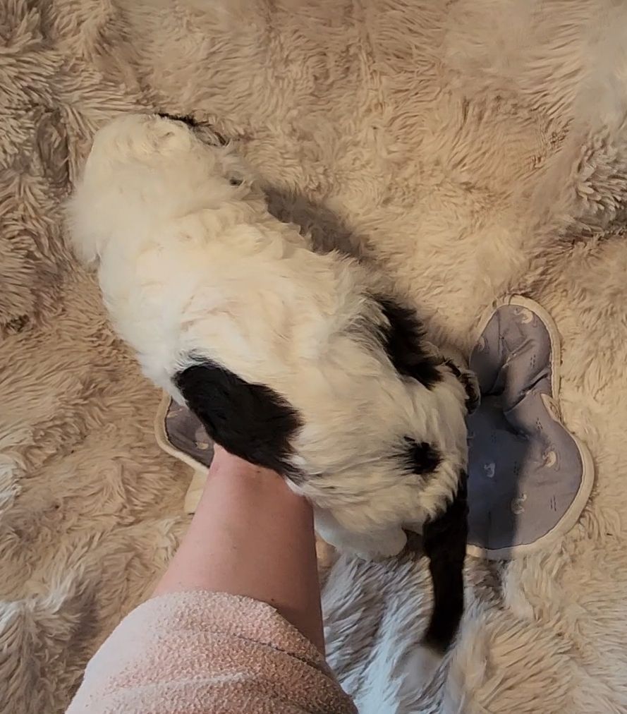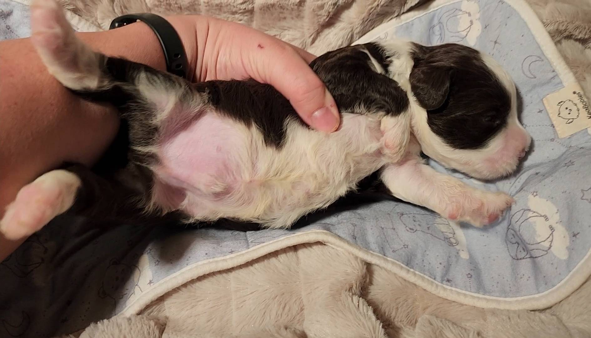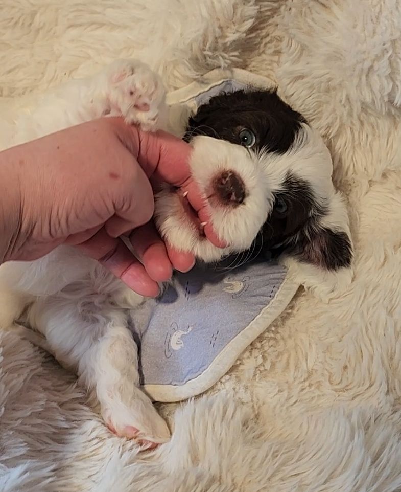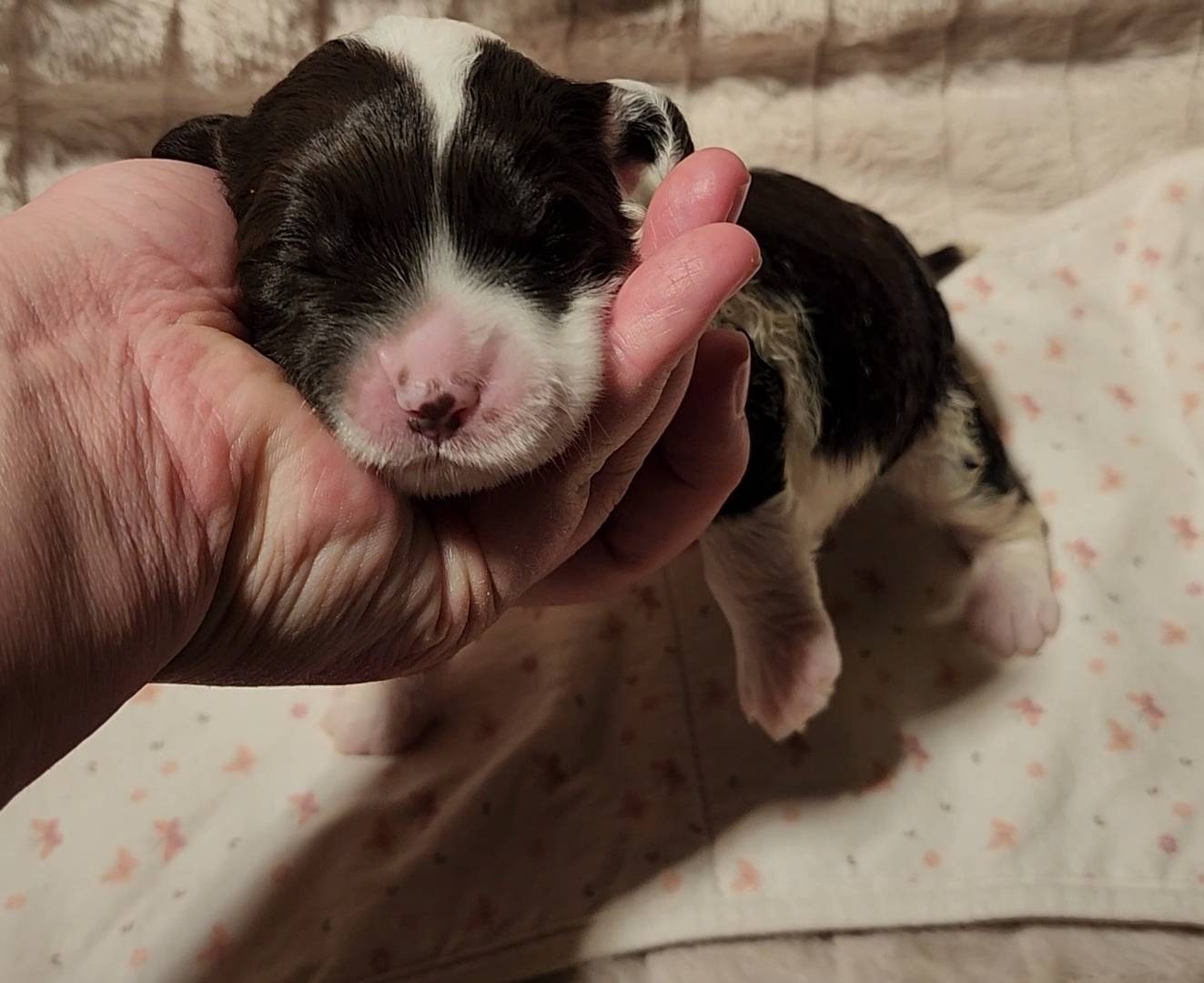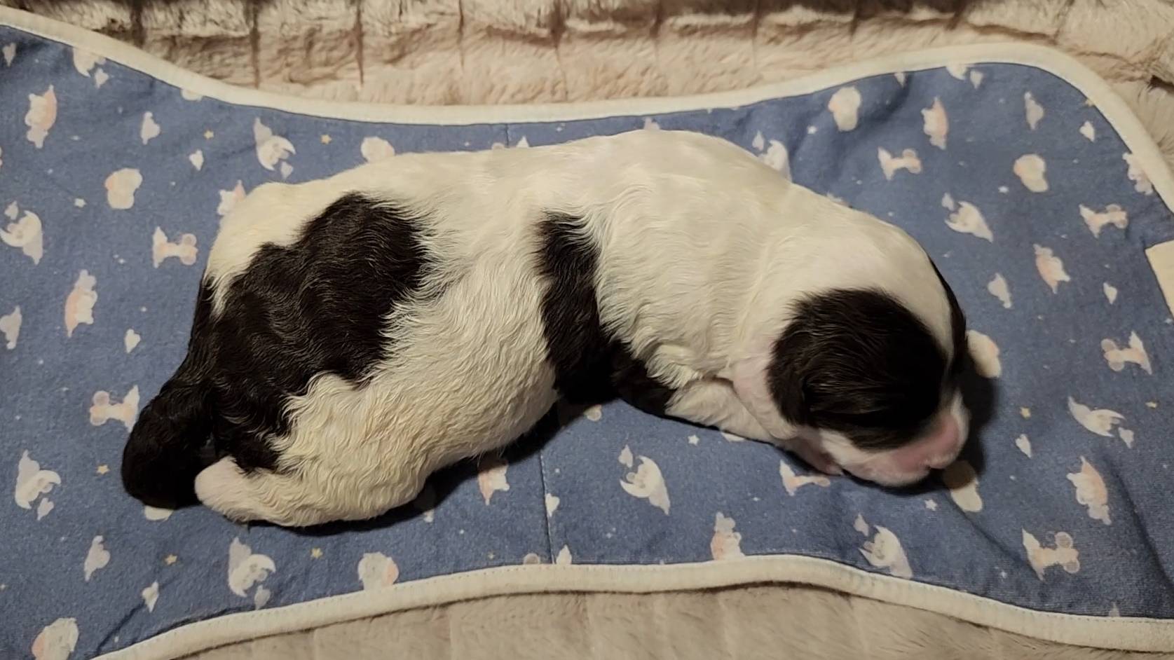 Born on 11/22, 2025, at 1:24pm, this boy is our only black parti puppy! He's a very handsome layout, in my opinion, reminds me a tuxedo with buttons so far, quite dashing (in my opinion). We're accustomed to pups being 'born in pairs,' followed by a bit more of a break, so to have him come in less than 20 minutes later was a welcome surprise - this his brother outdid him. This little boy, our only black parti coat, weighted in at 9.9oz.