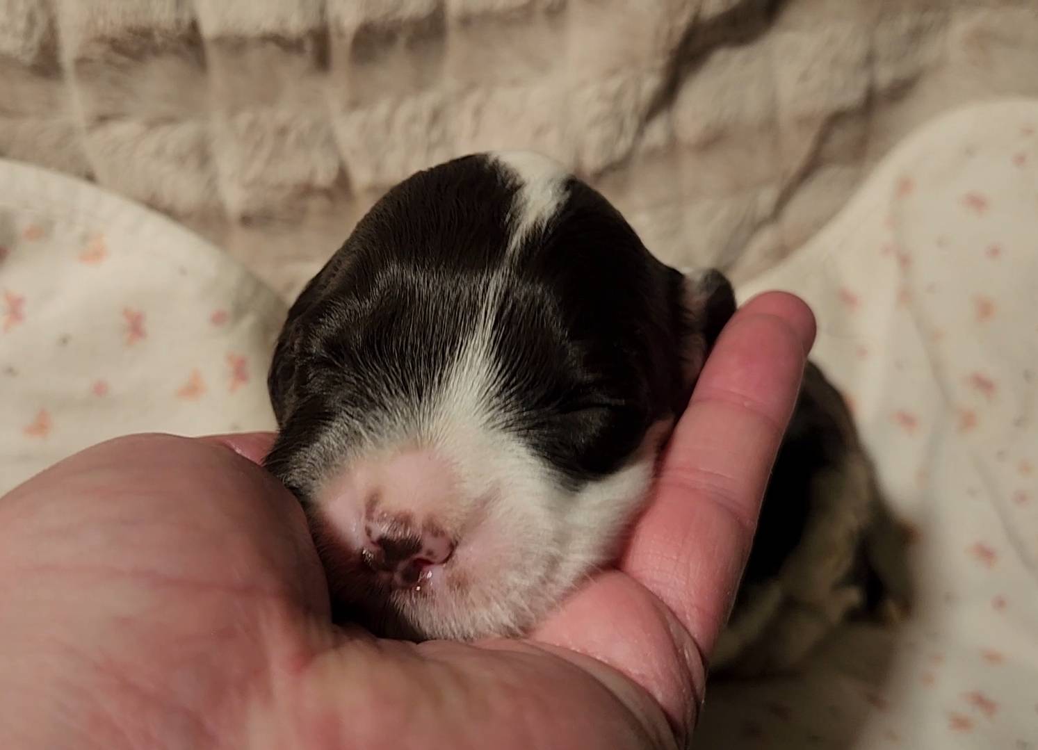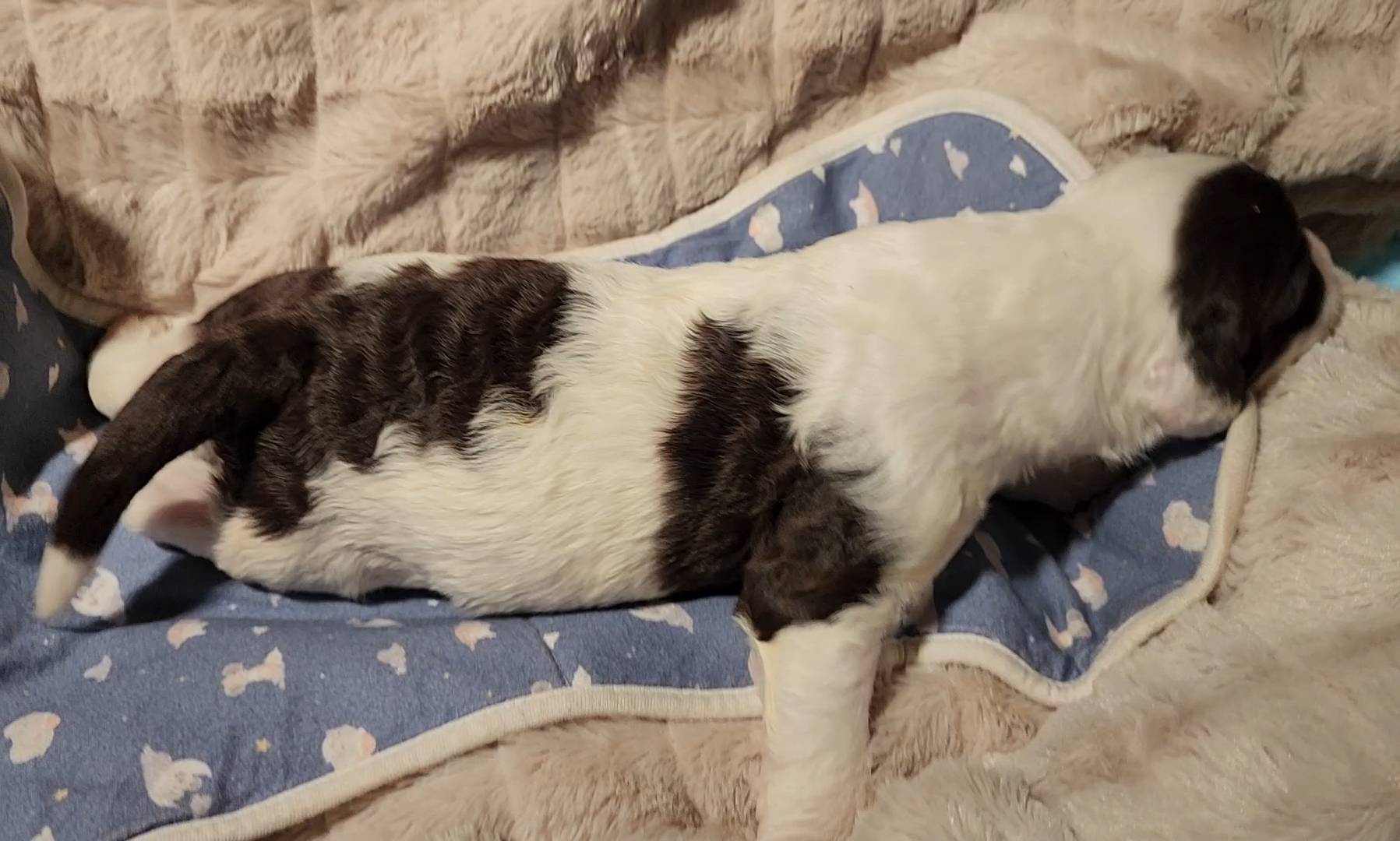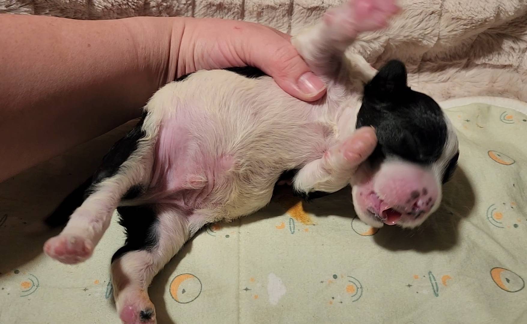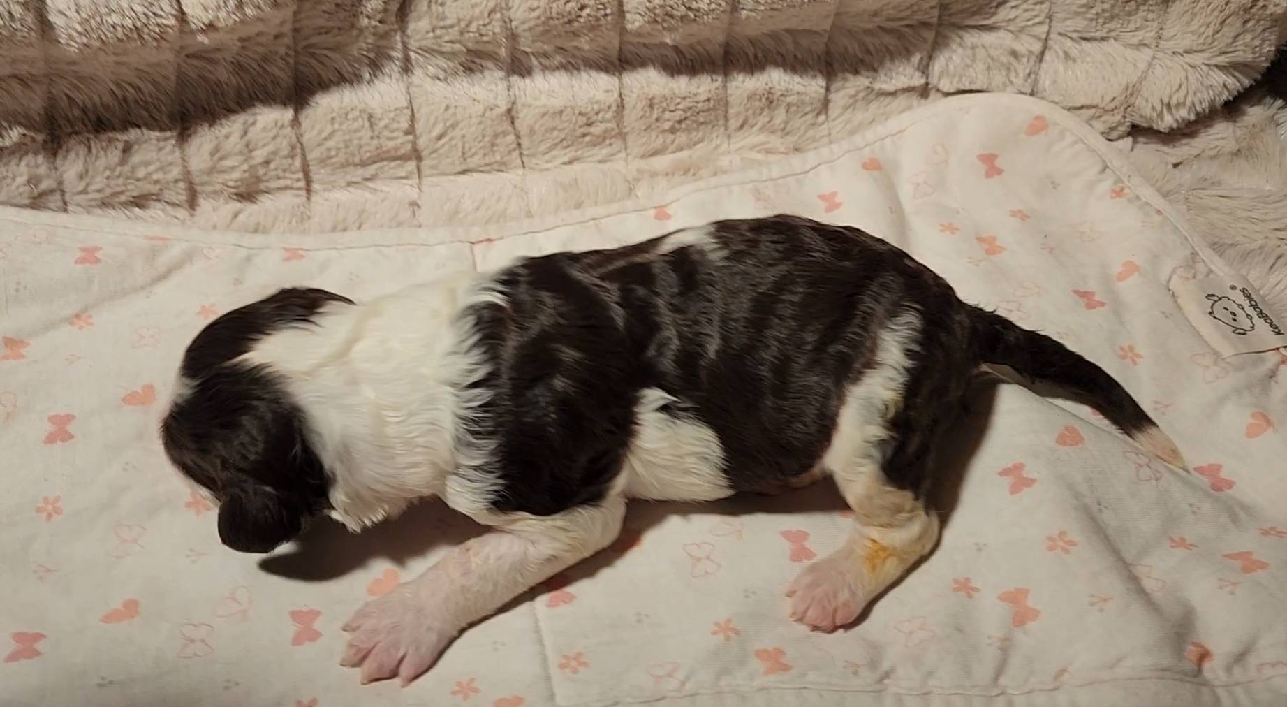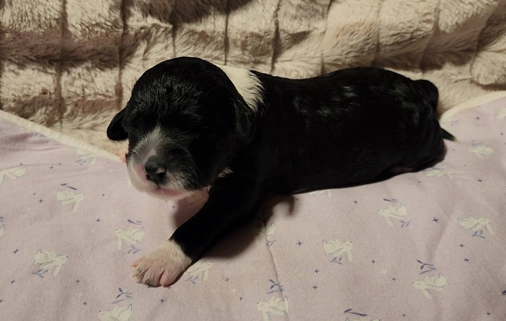 Born on 11/22, 2025, at 1:24pm, this boy is our only black parti puppy! He's a very handsome layout, in my opinion, reminds me a tuxedo with buttons so far, quite dashing (in my opinion). We're accustomed to pups being 'born in pairs,' followed by a bit more of a break, so to have him come in less than 20 minutes later was a welcome surprise - this his brother outdid him. This little boy, our only black parti coat, weighted in at 9.9oz.