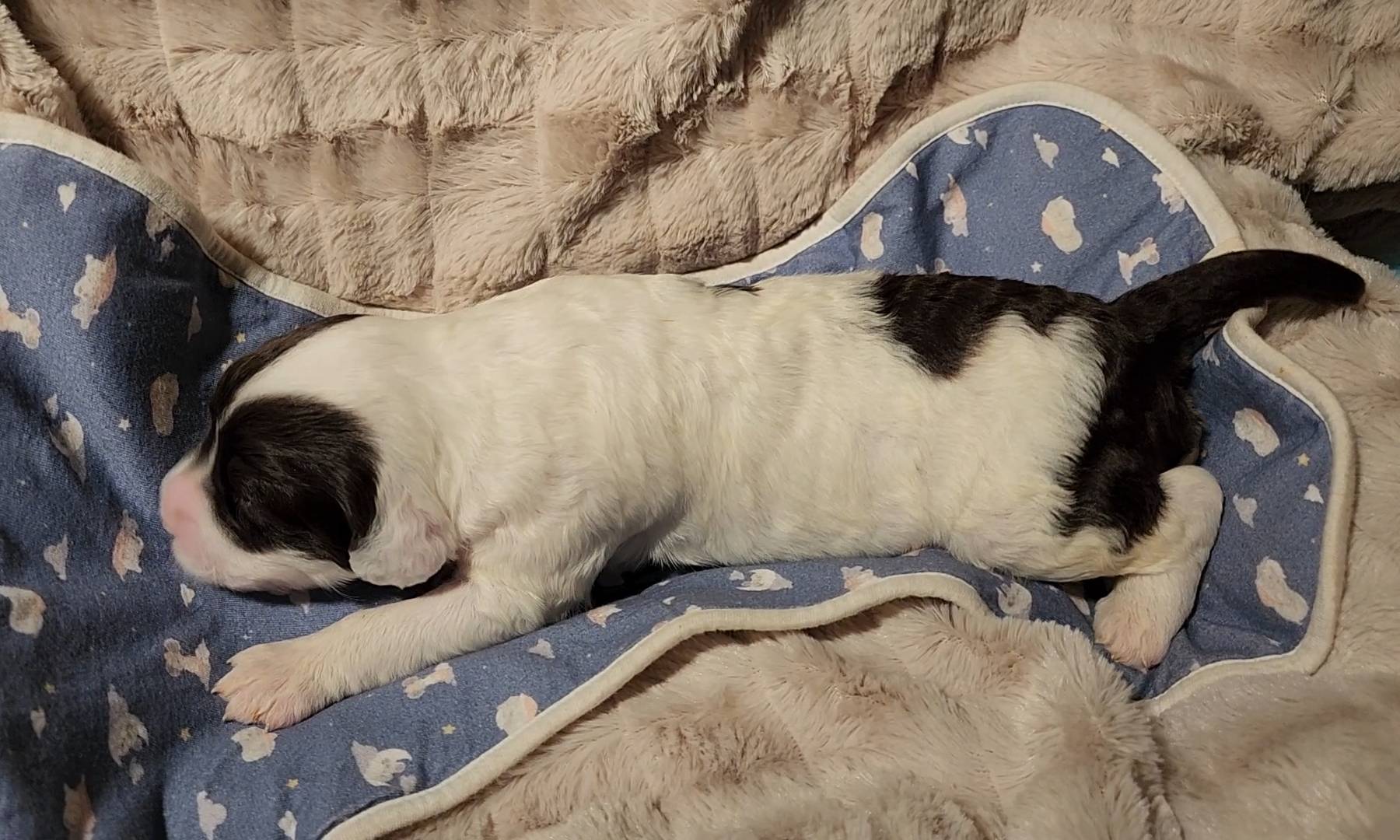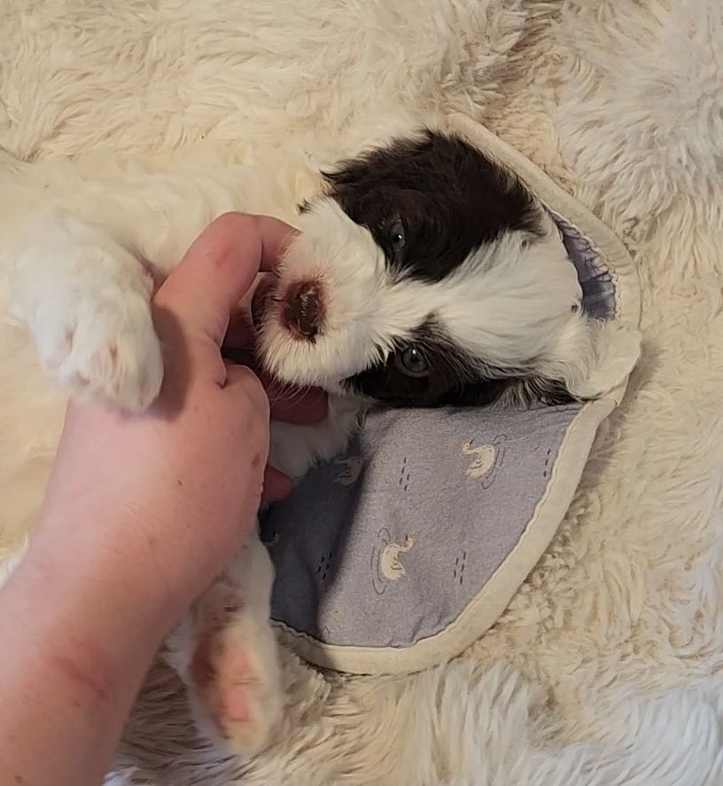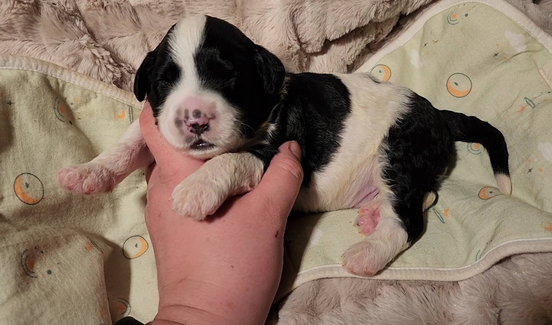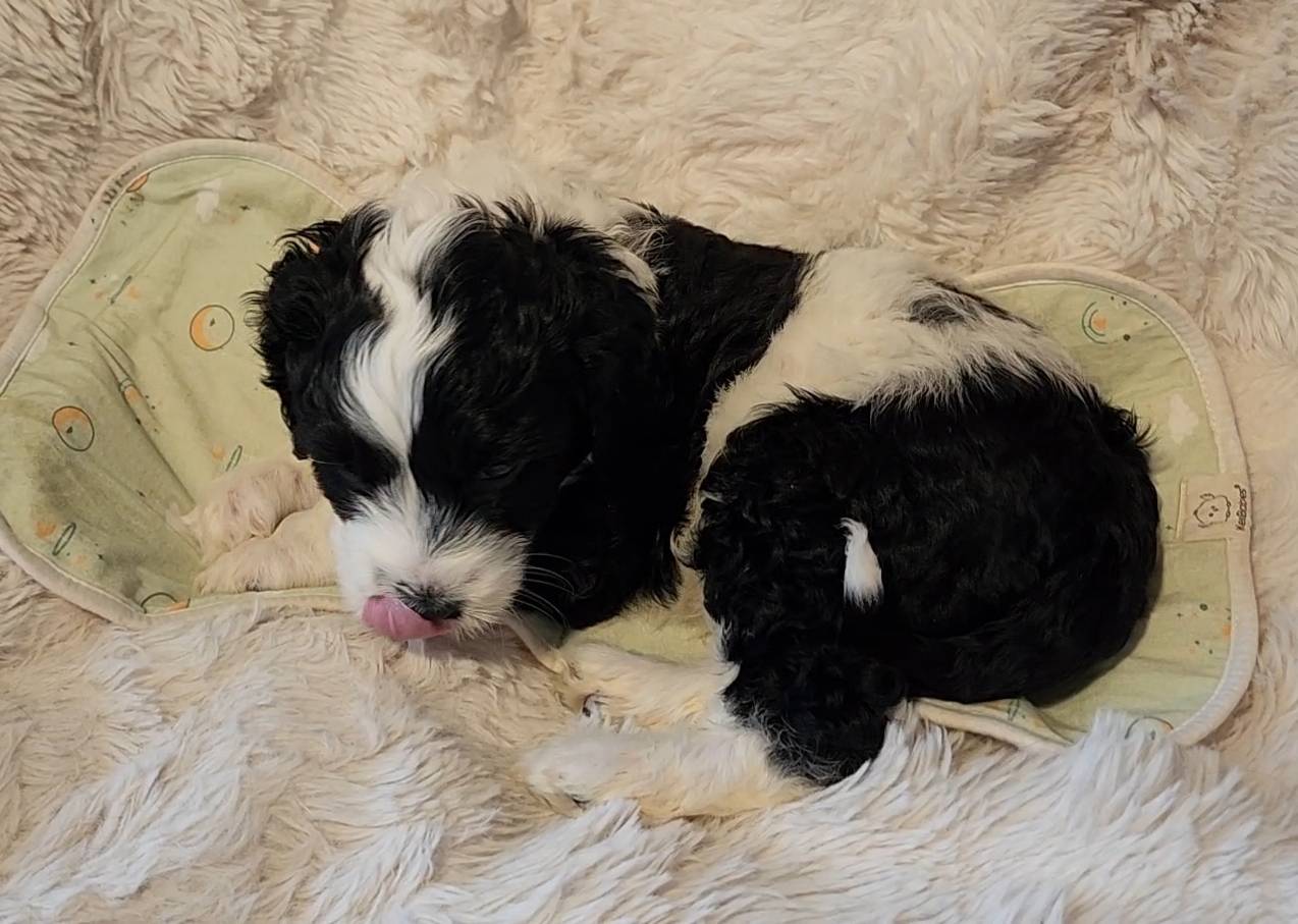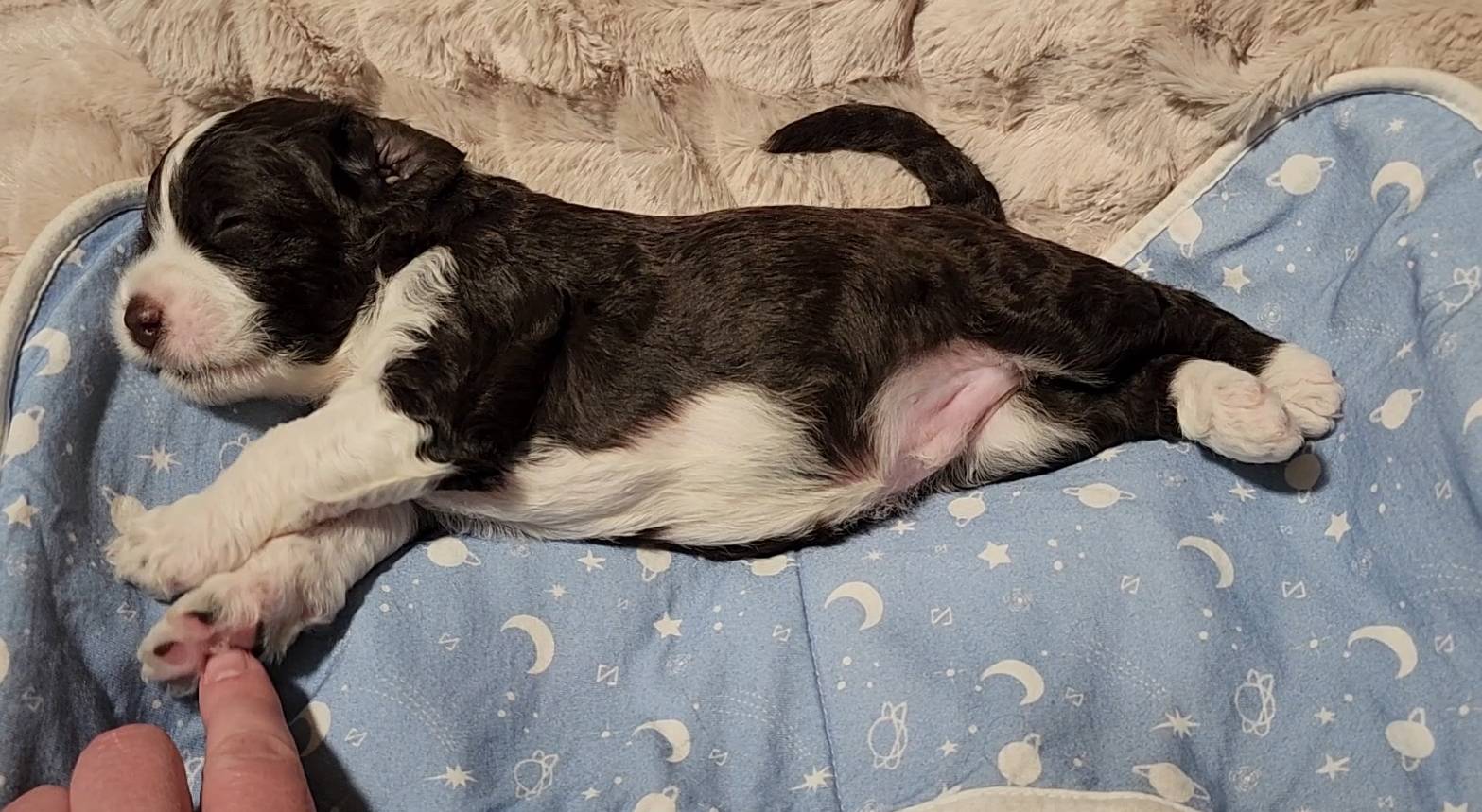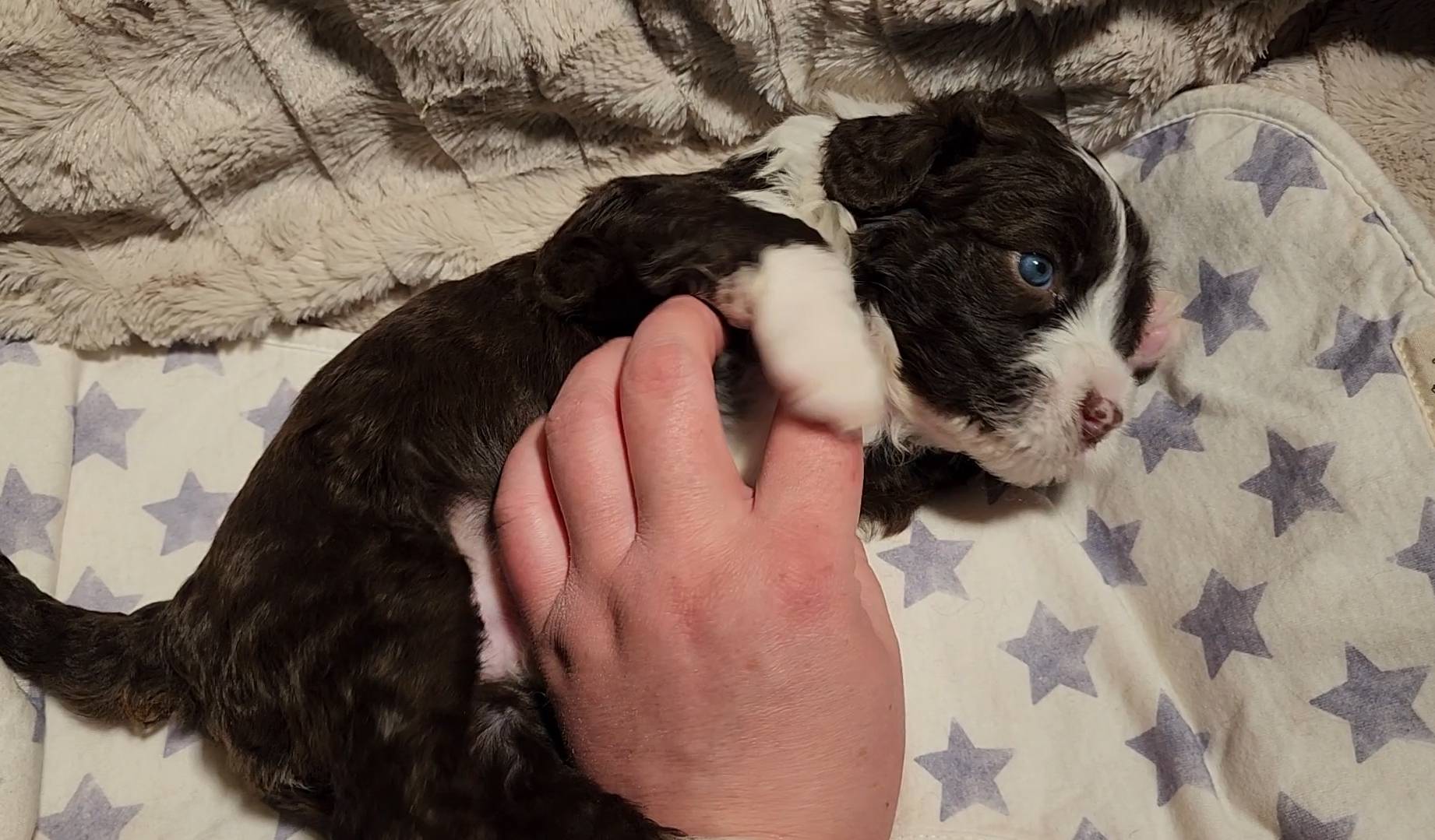 Born on 11/22, 2025, at 1:24pm, this boy is our only black parti puppy! He's a very handsome layout, in my opinion, reminds me a tuxedo with buttons so far, quite dashing (in my opinion). We're accustomed to pups being 'born in pairs,' followed by a bit more of a break, so to have him come in less than 20 minutes later was a welcome surprise - this his brother outdid him. This little boy, our only black parti coat, weighted in at 9.9oz.
