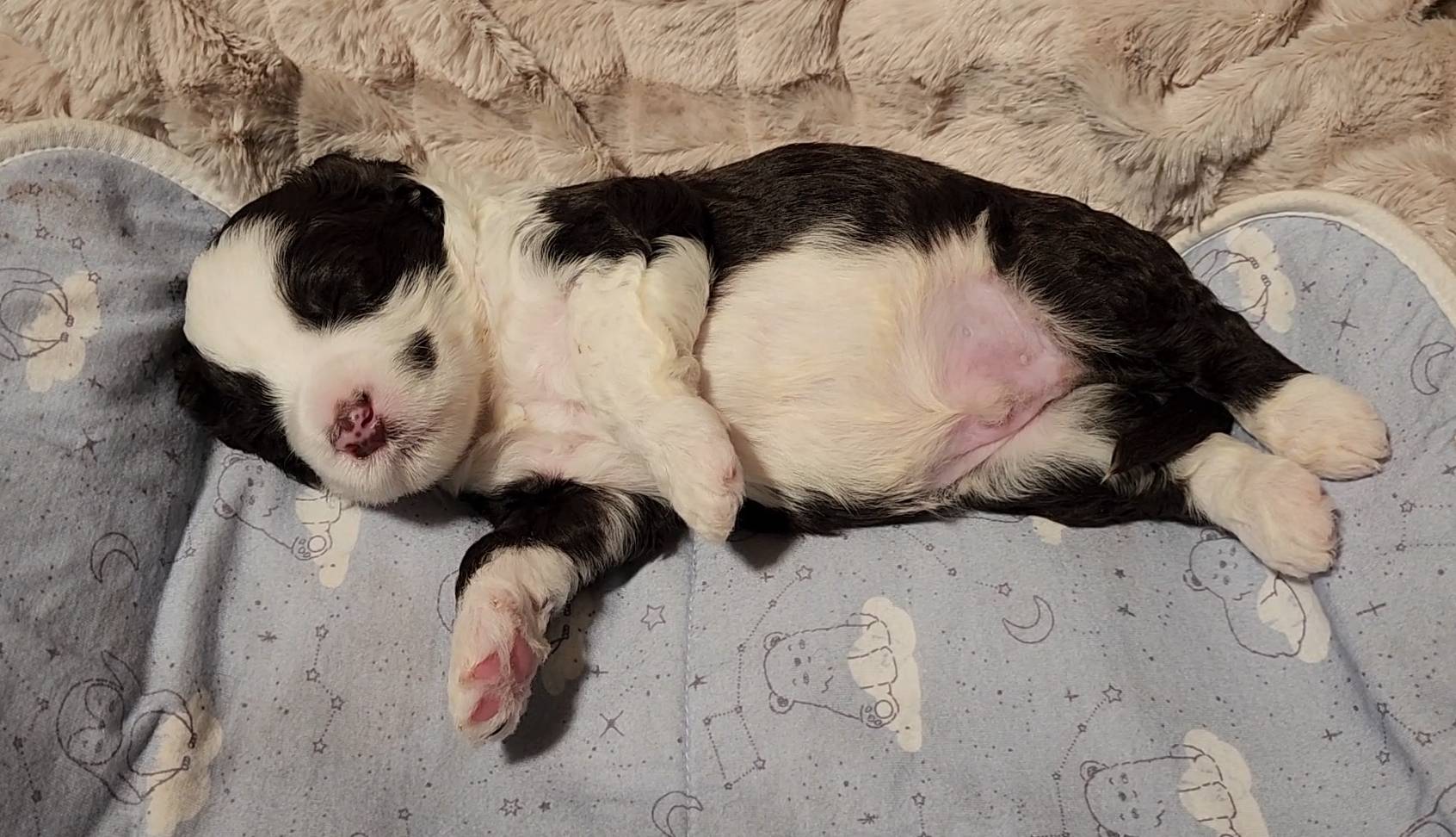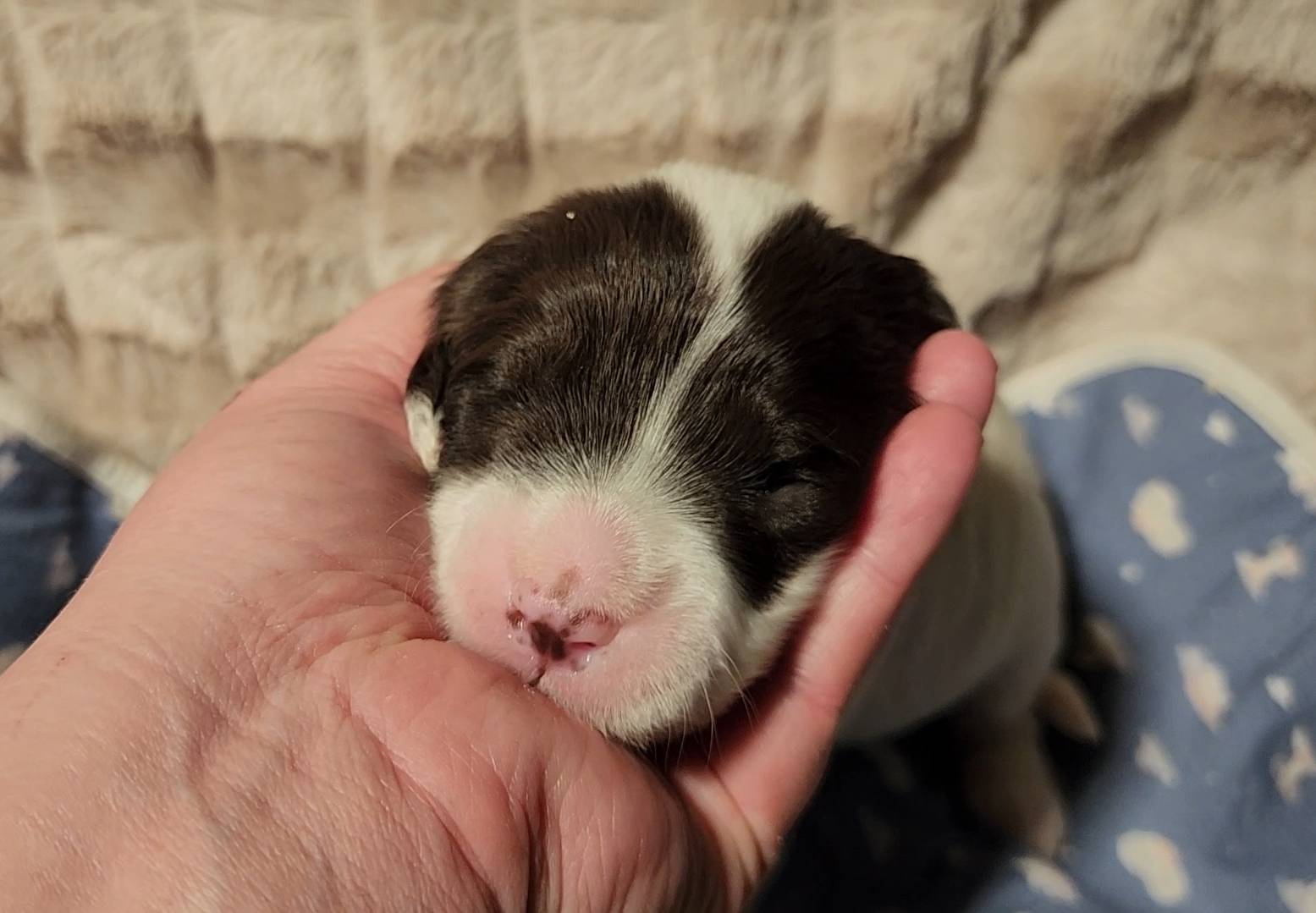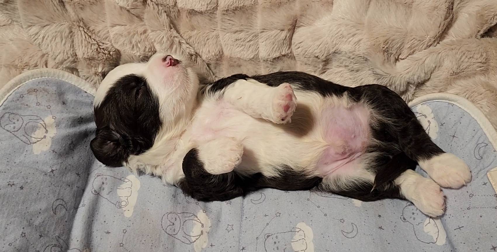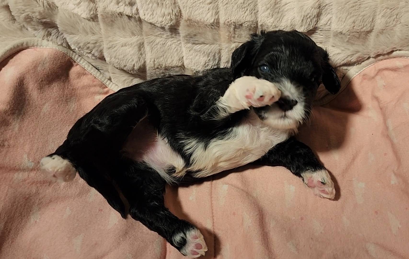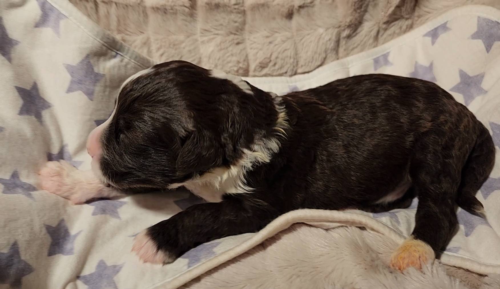 Born on 11/22, 2025, at 1:24pm, this boy is our only black parti puppy! He's a very handsome layout, in my opinion, reminds me a tuxedo with buttons so far, quite dashing (in my opinion). We're accustomed to pups being 'born in pairs,' followed by a bit more of a break, so to have him come in less than 20 minutes later was a welcome surprise - this his brother outdid him. This little boy, our only black parti coat, weighted in at 9.9oz.