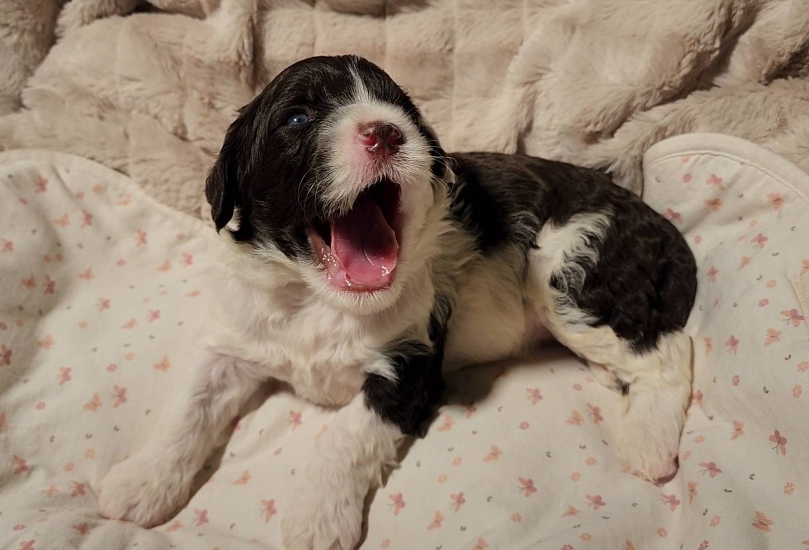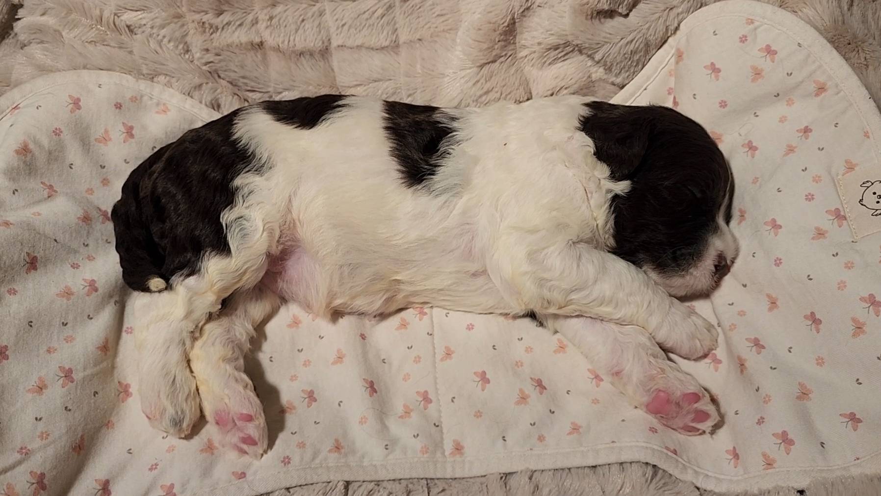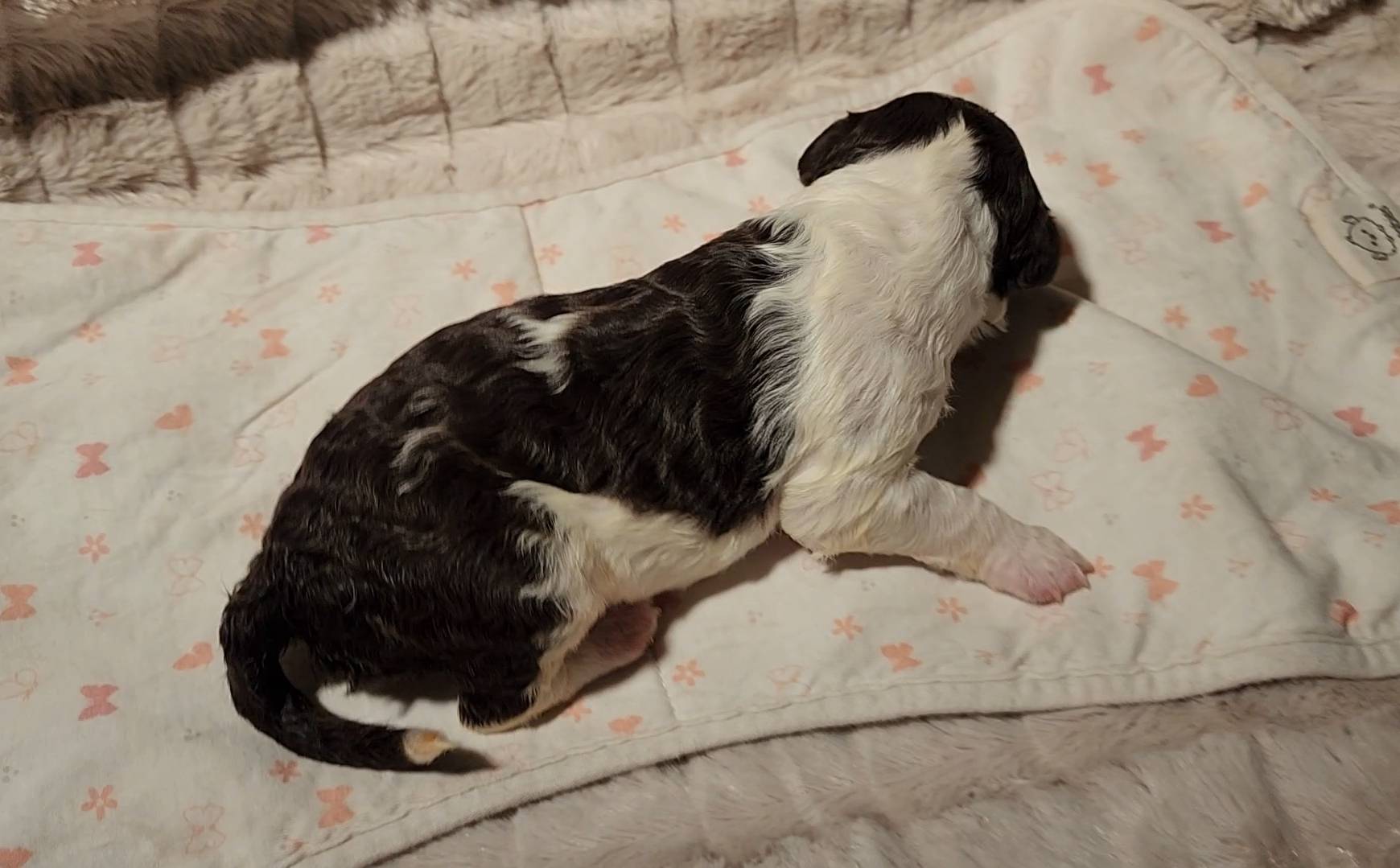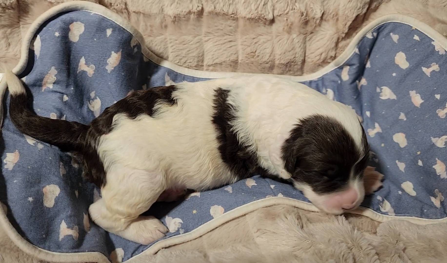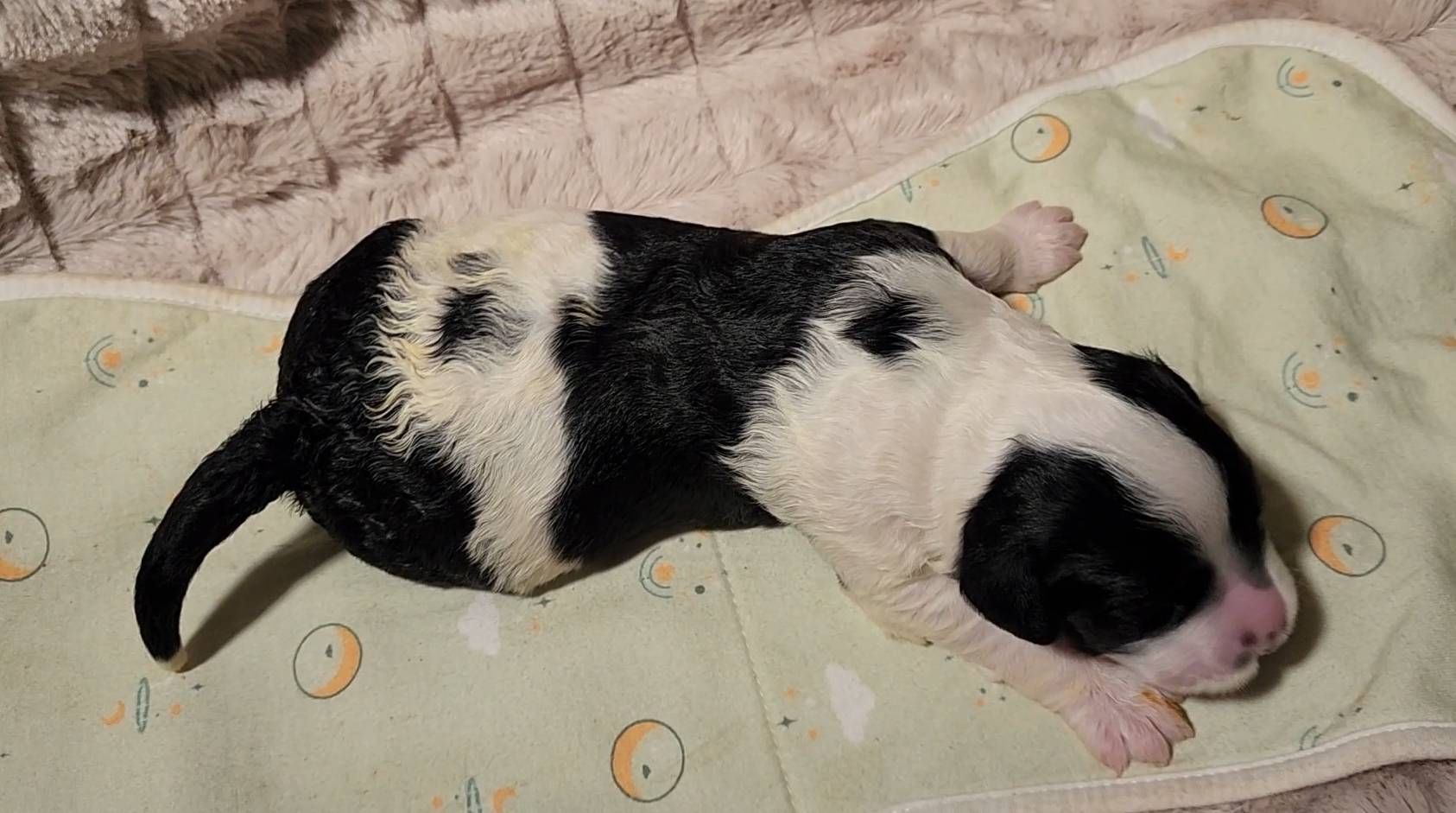 Born on 11/22, 2025, at 1:24pm, this boy is our only black parti puppy! He's a very handsome layout, in my opinion, reminds me a tuxedo with buttons so far, quite dashing (in my opinion). We're accustomed to pups being 'born in pairs,' followed by a bit more of a break, so to have him come in less than 20 minutes later was a welcome surprise - this his brother outdid him. This little boy, our only black parti coat, weighted in at 9.9oz.