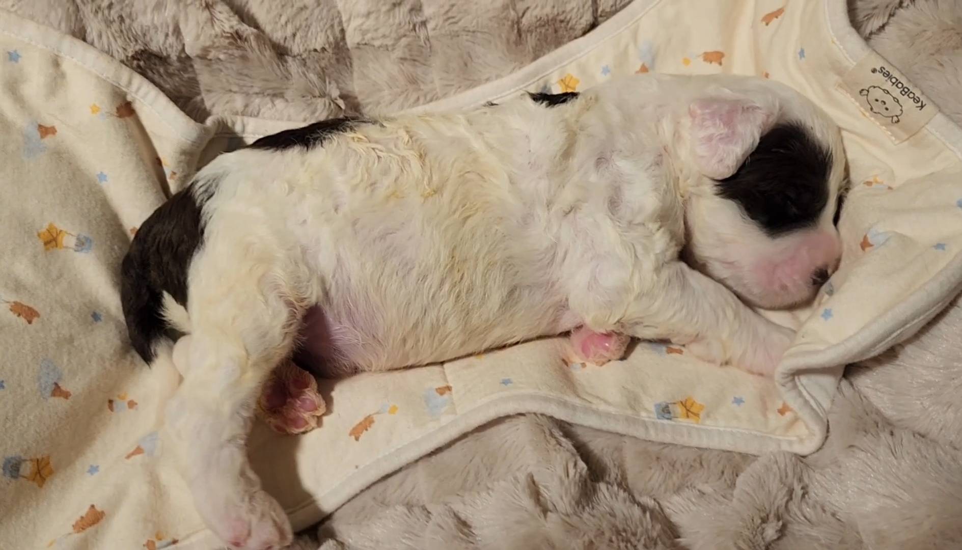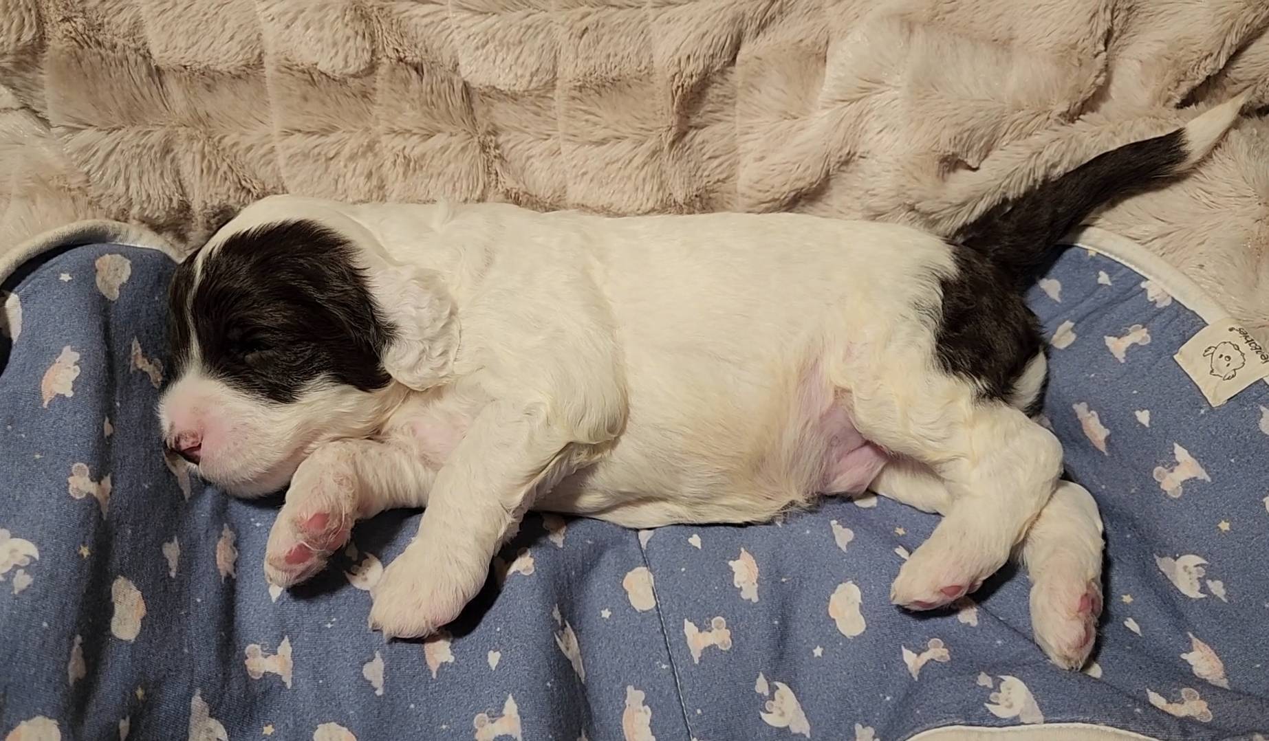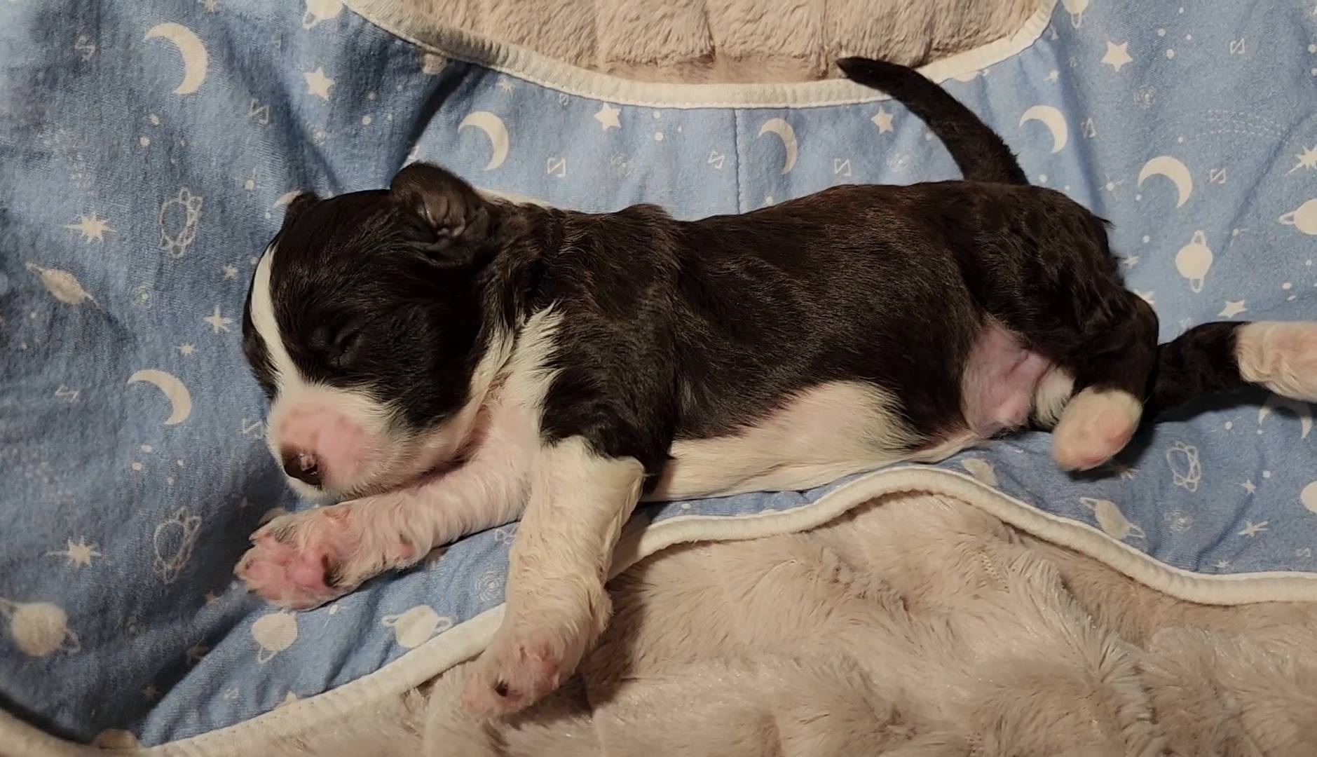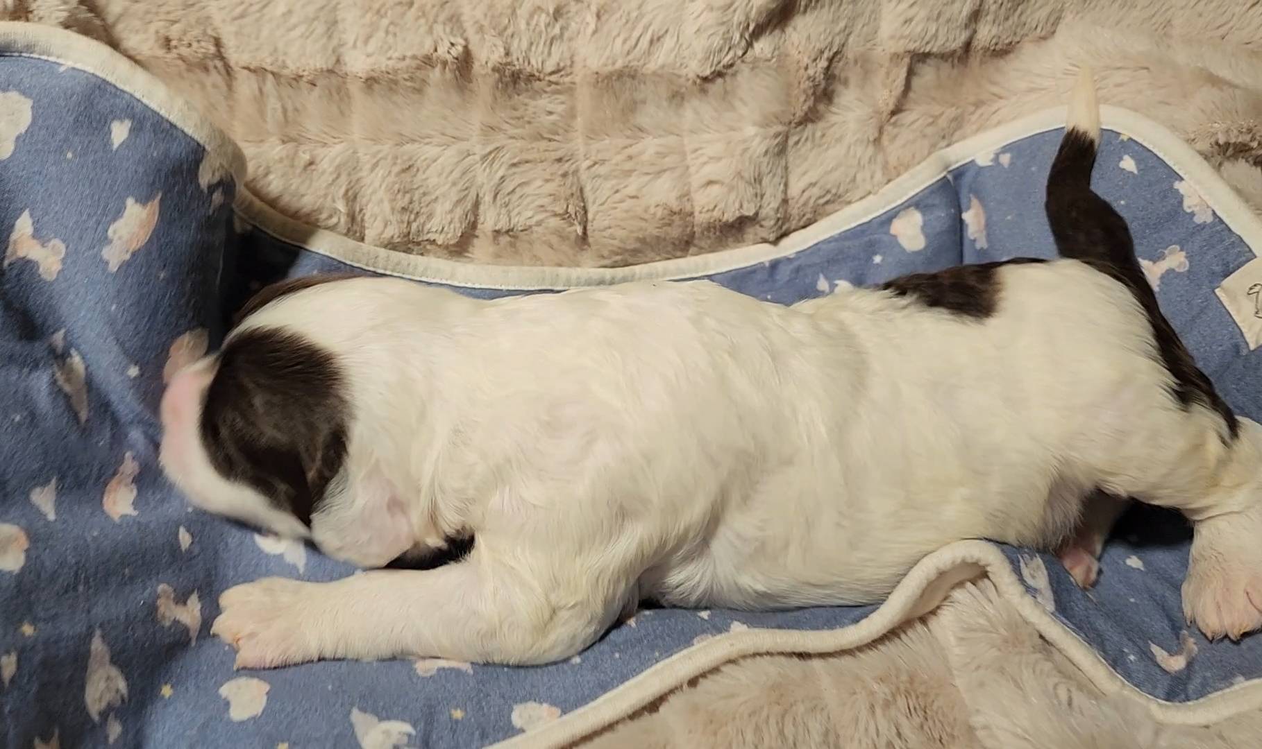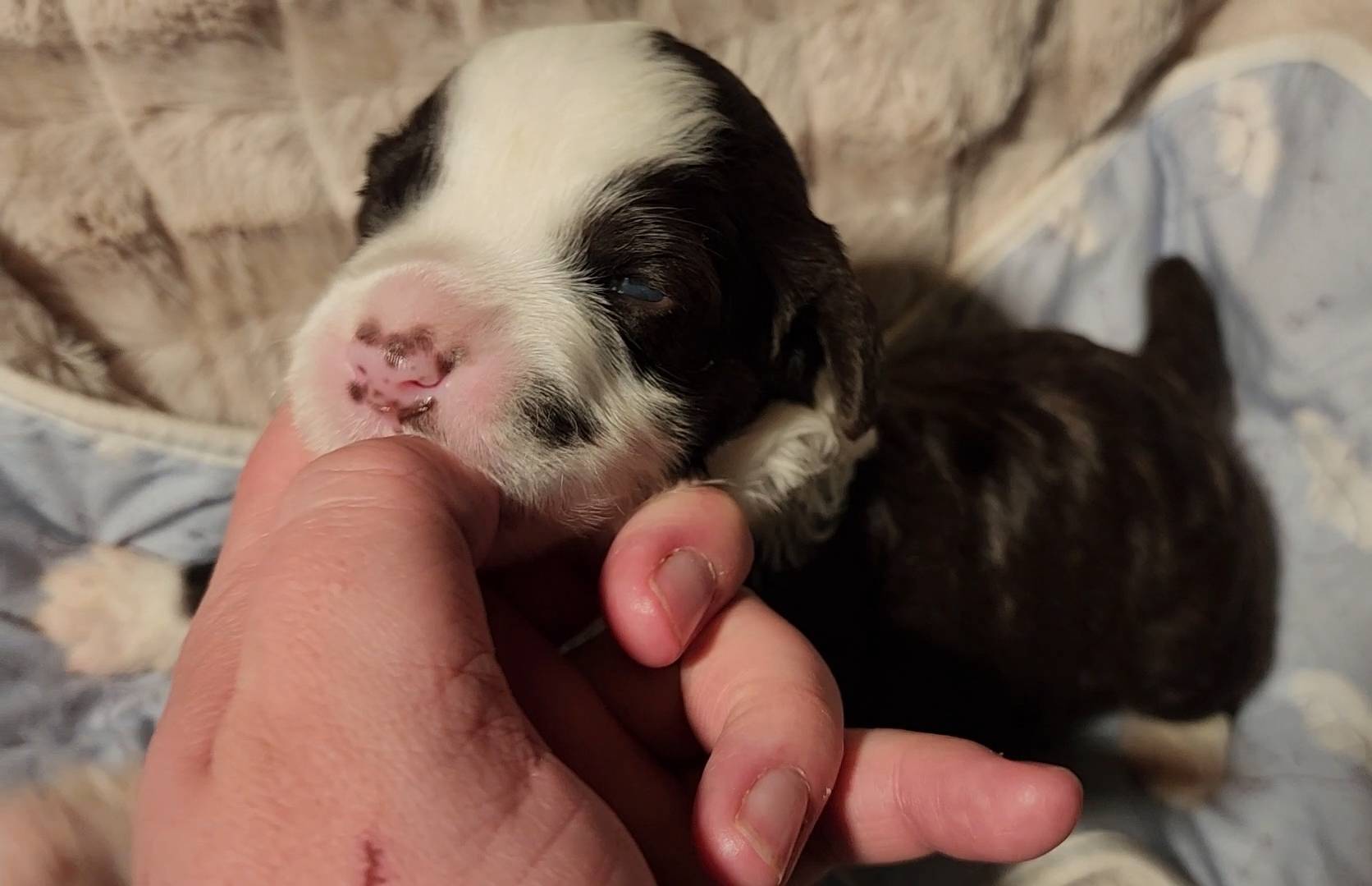 Born on 11/22, 2025, at 1:24pm, this boy is our only black parti puppy! He's a very handsome layout, in my opinion, reminds me a tuxedo with buttons so far, quite dashing (in my opinion). We're accustomed to pups being 'born in pairs,' followed by a bit more of a break, so to have him come in less than 20 minutes later was a welcome surprise - this his brother outdid him. This little boy, our only black parti coat, weighted in at 9.9oz.