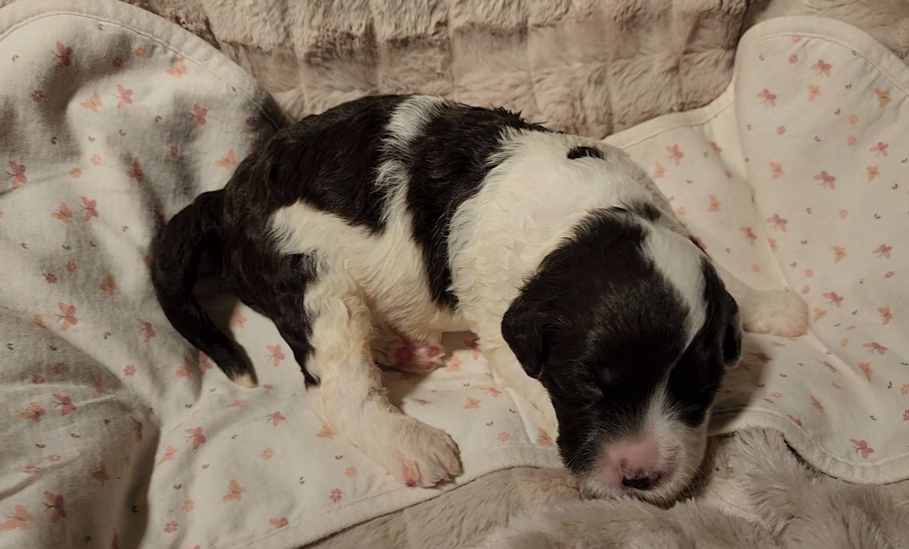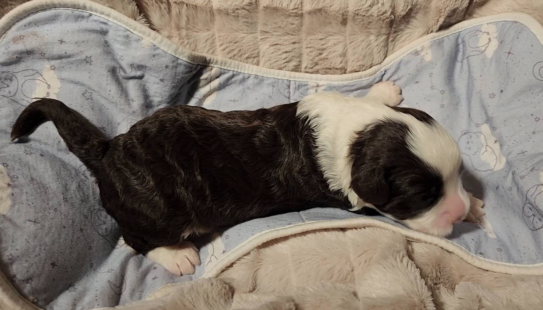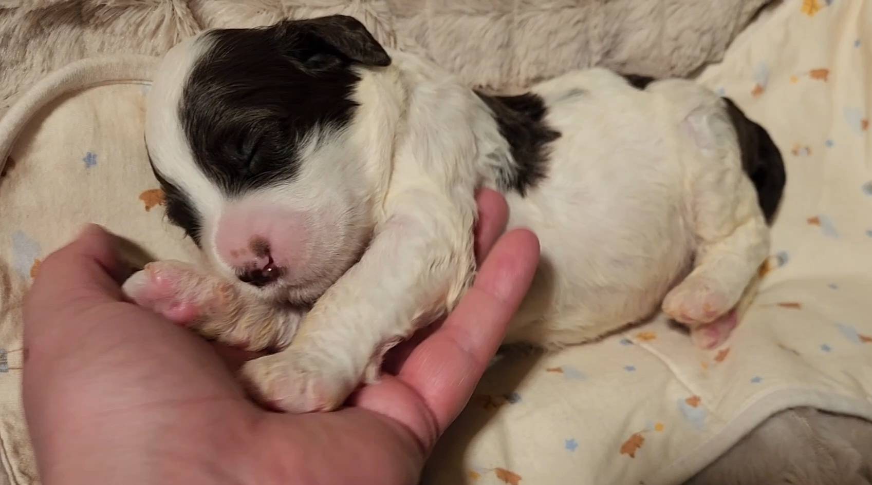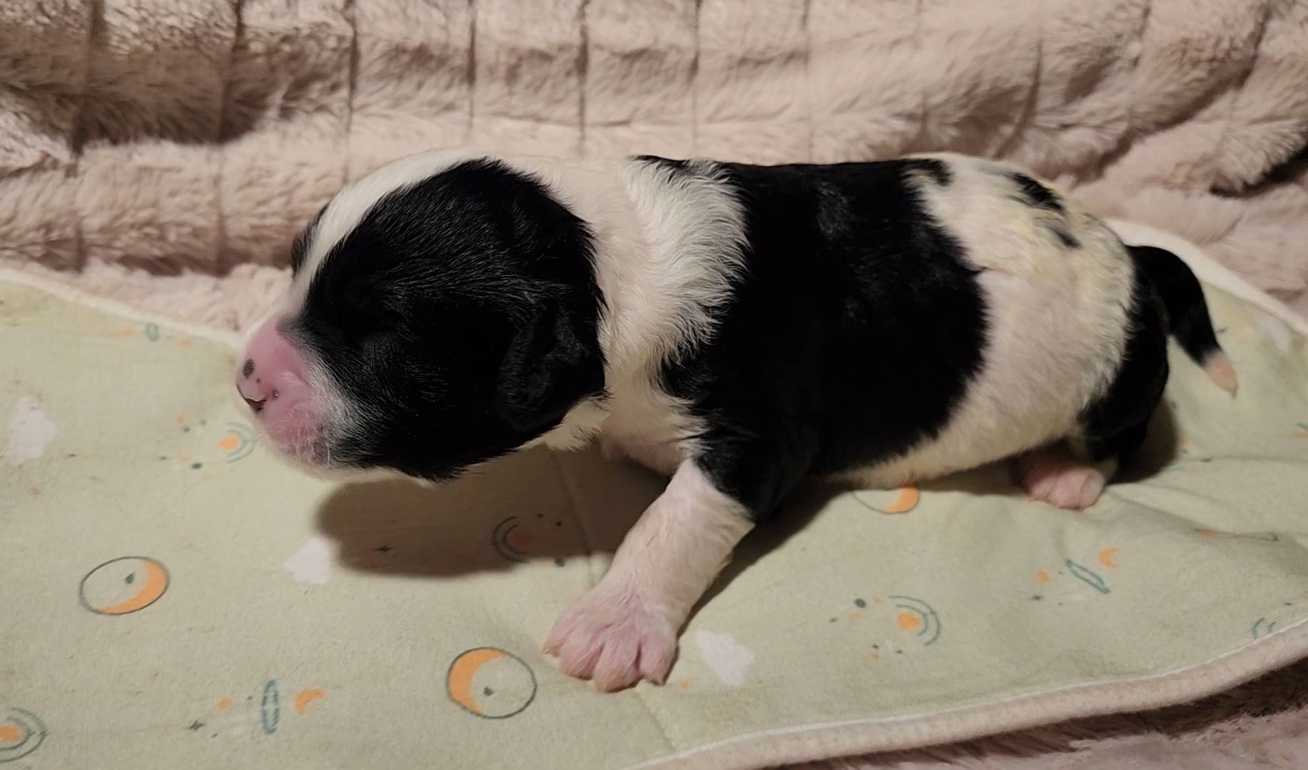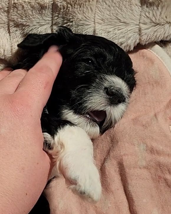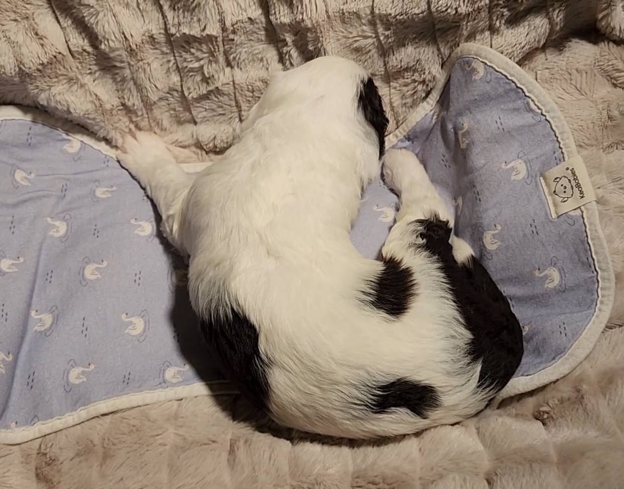 Born on 11/22, 2025, at 1:24pm, this boy is our only black parti puppy! He's a very handsome layout, in my opinion, reminds me a tuxedo with buttons so far, quite dashing (in my opinion). We're accustomed to pups being 'born in pairs,' followed by a bit more of a break, so to have him come in less than 20 minutes later was a welcome surprise - this his brother outdid him. This little boy, our only black parti coat, weighted in at 9.9oz.