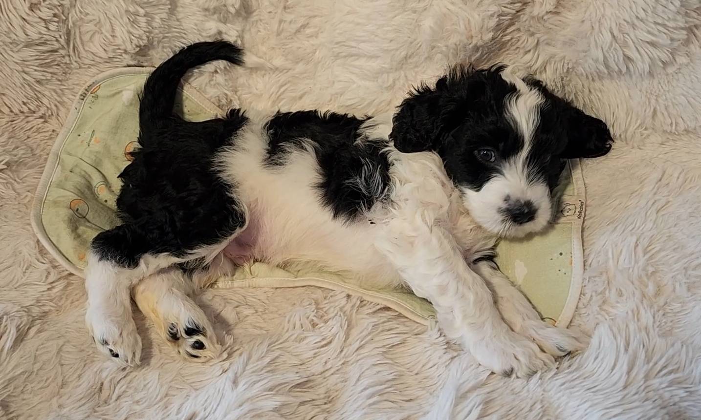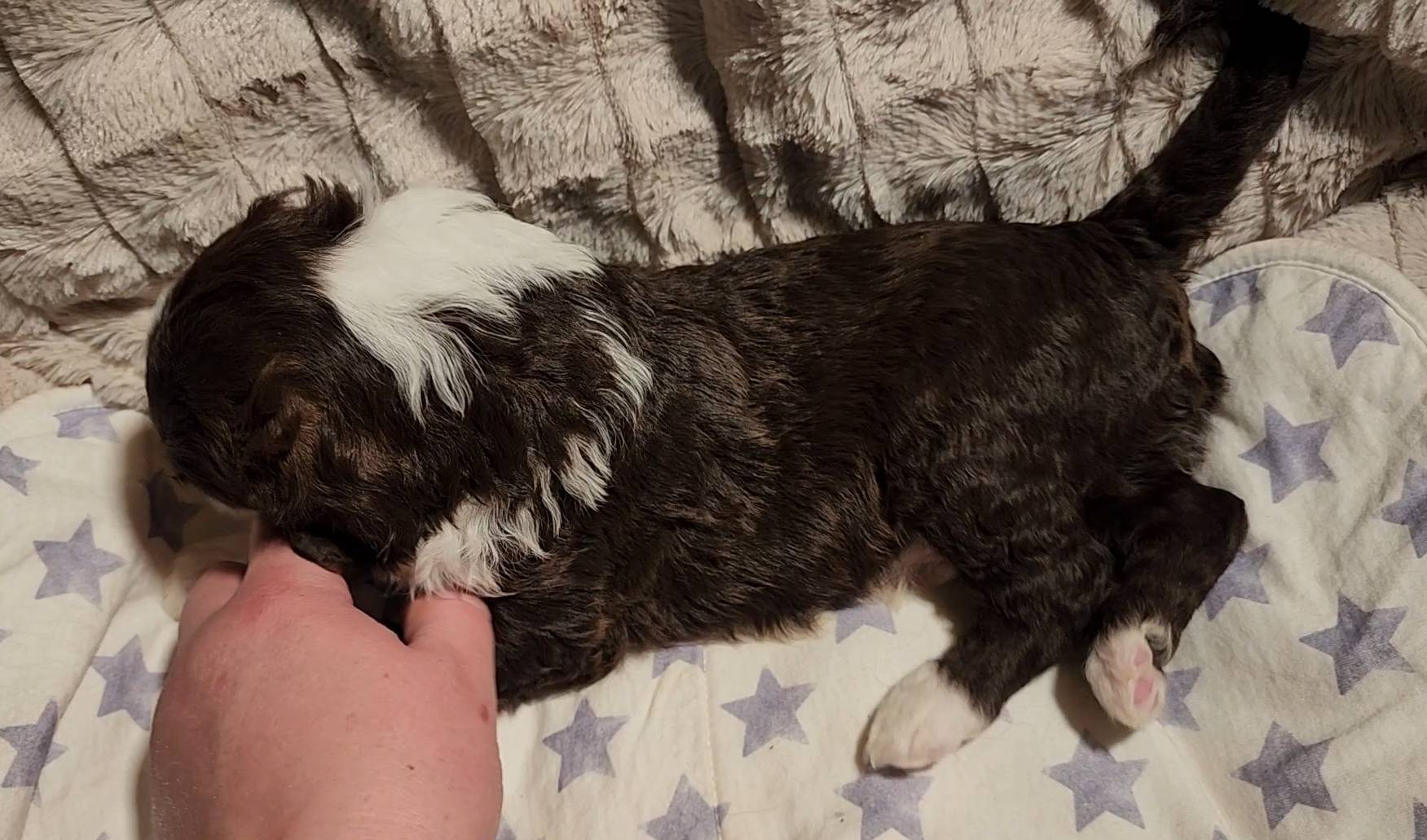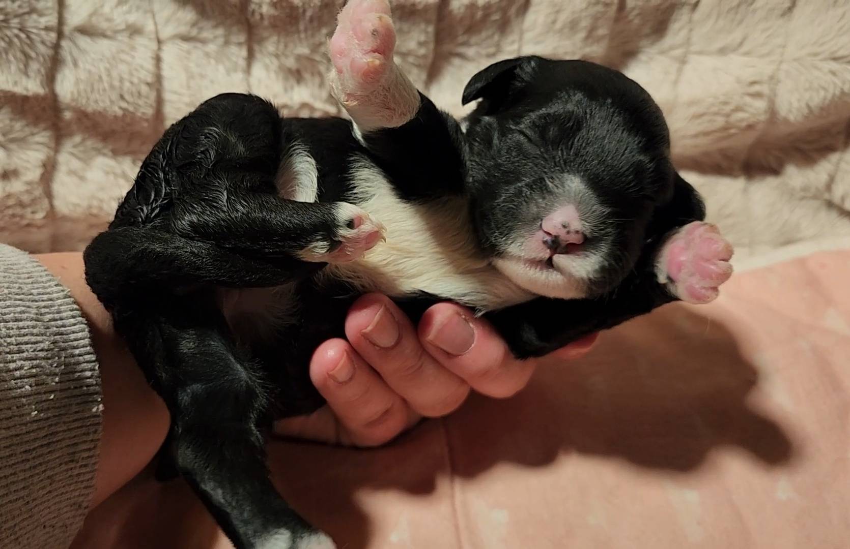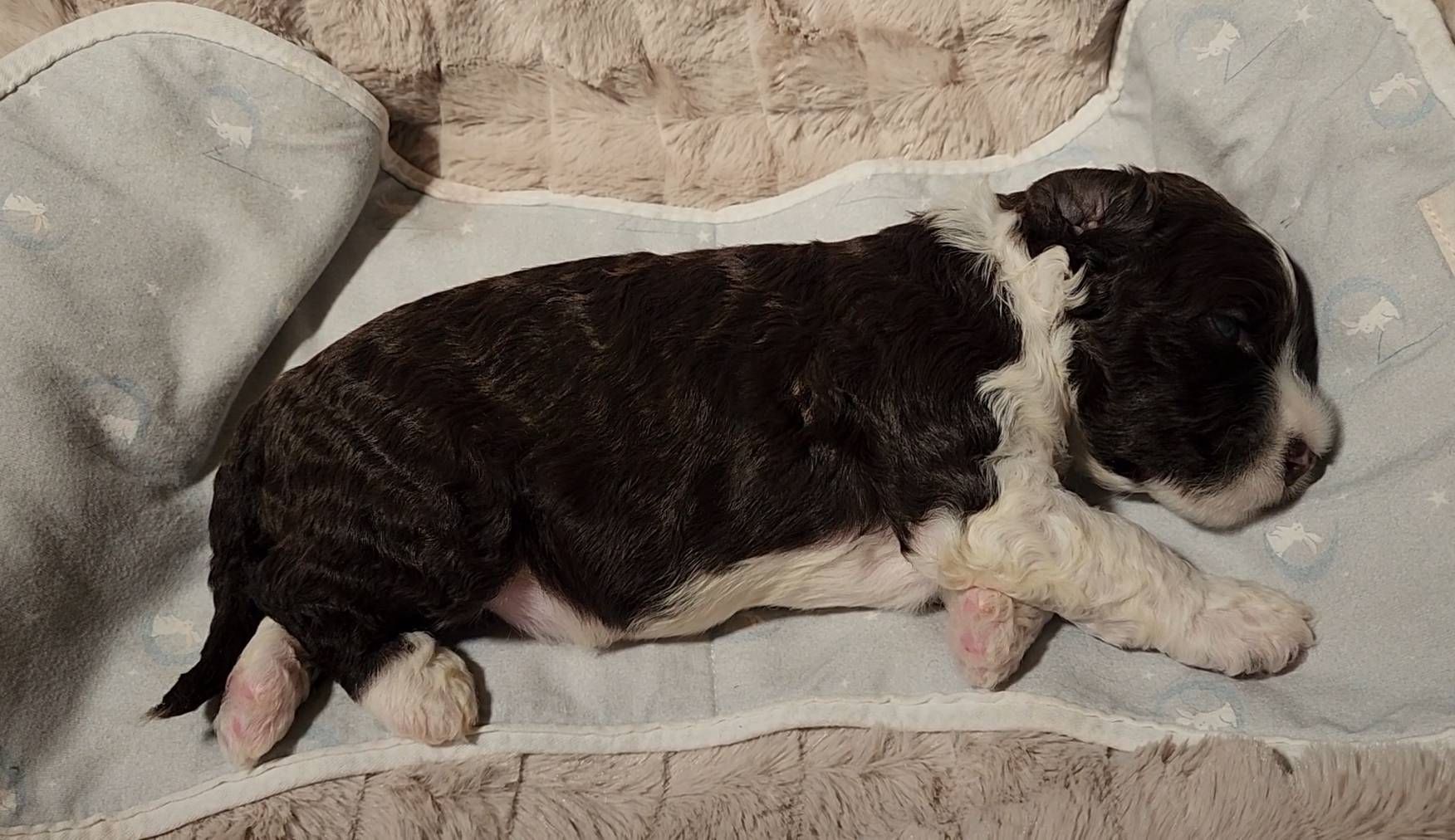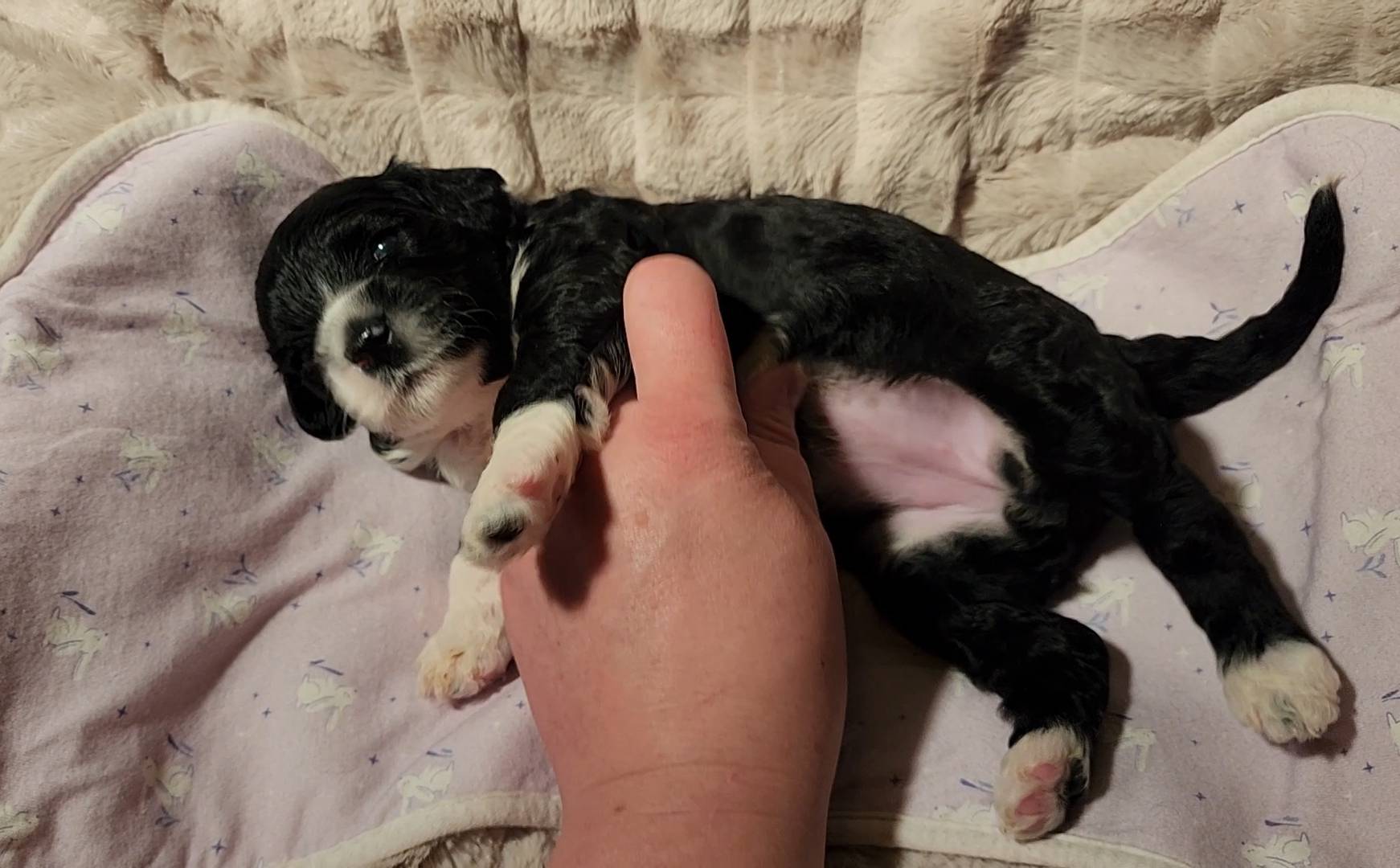 Born on 11/22, 2025, at 1:24pm, this boy is our only black parti puppy! He's a very handsome layout, in my opinion, reminds me a tuxedo with buttons so far, quite dashing (in my opinion). We're accustomed to pups being 'born in pairs,' followed by a bit more of a break, so to have him come in less than 20 minutes later was a welcome surprise - this his brother outdid him. This little boy, our only black parti coat, weighted in at 9.9oz.