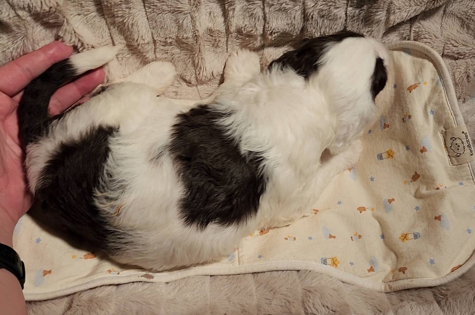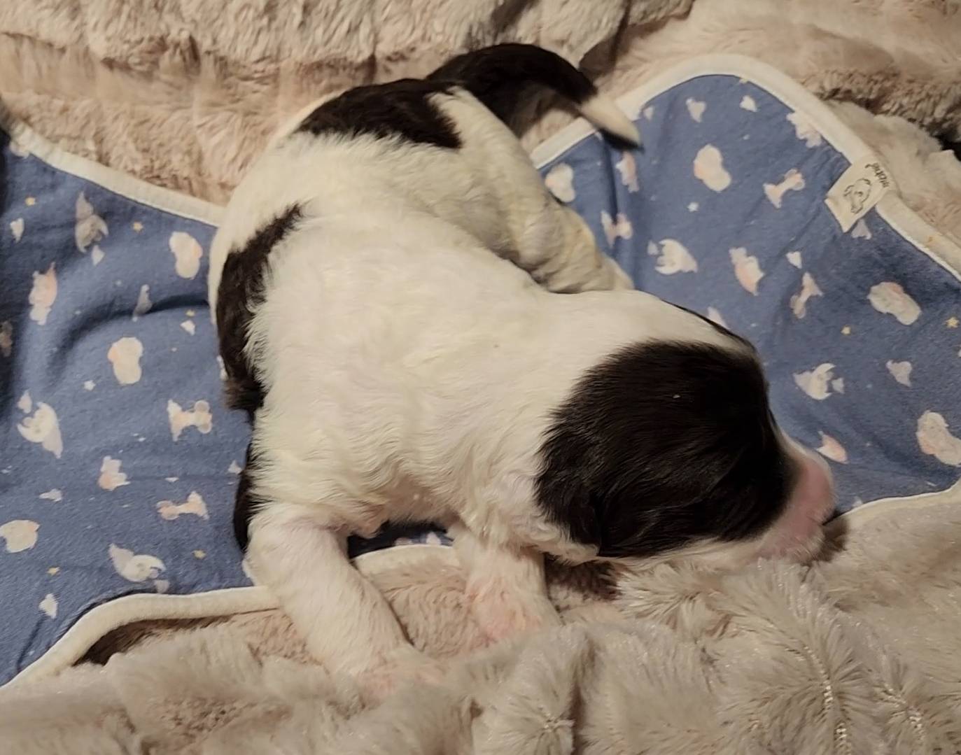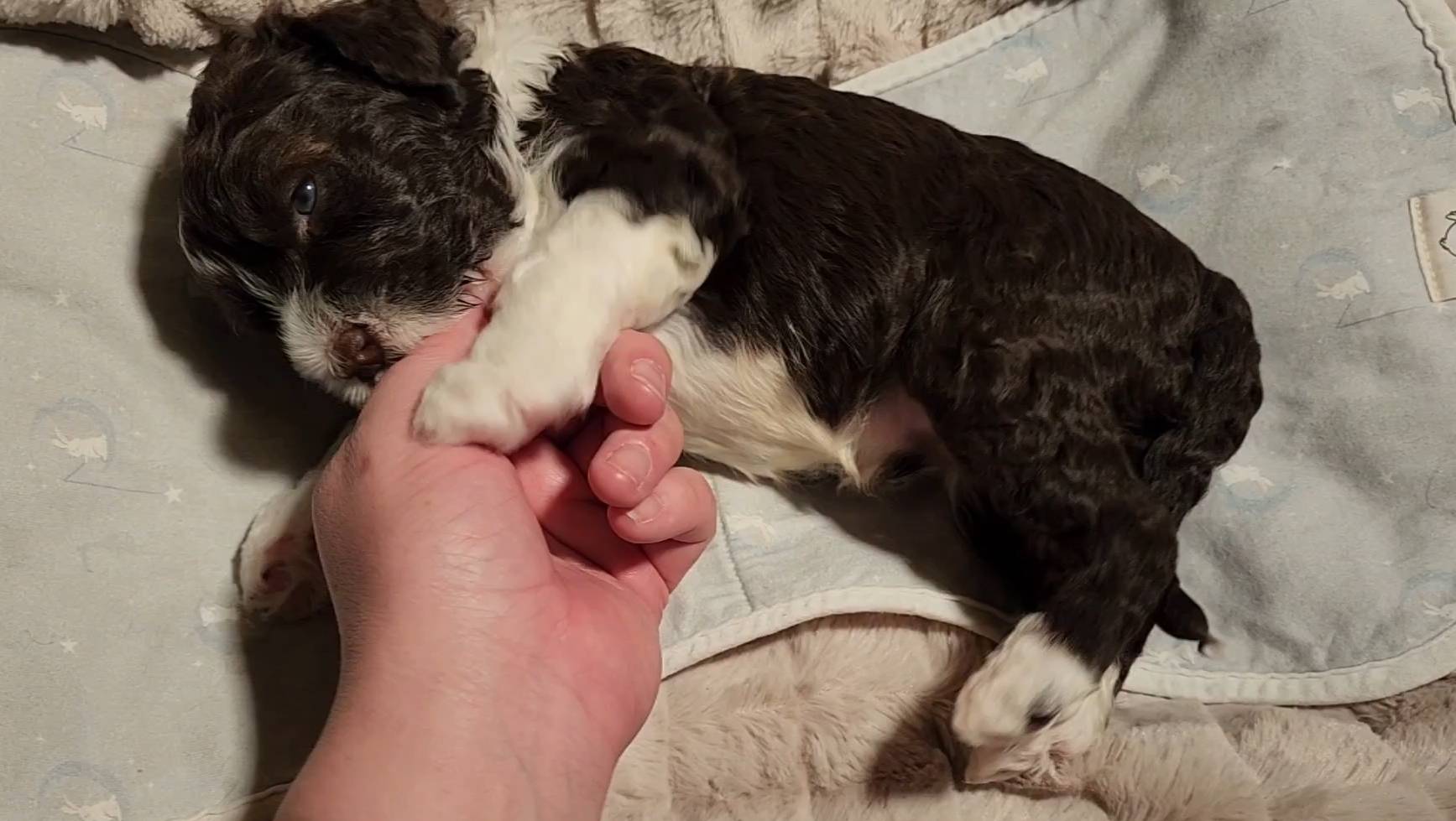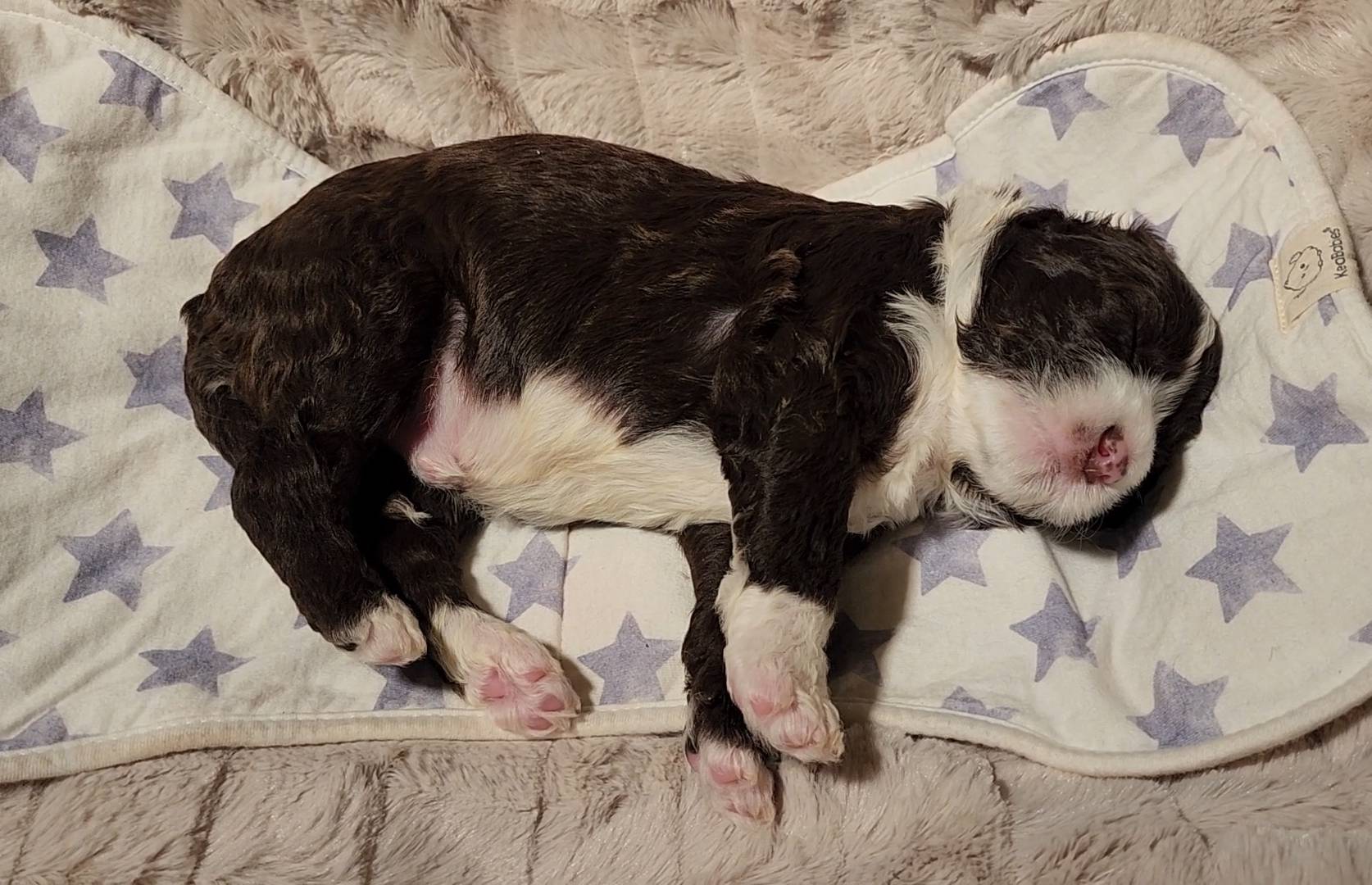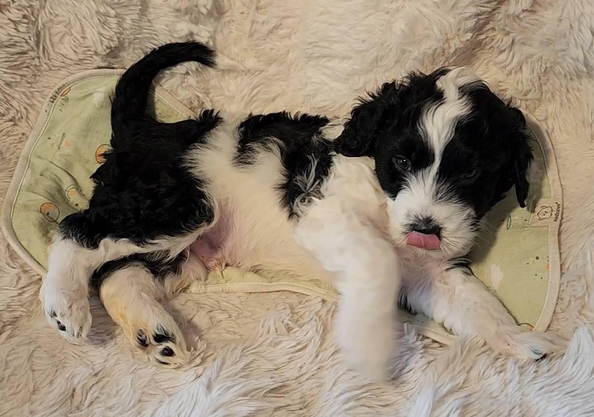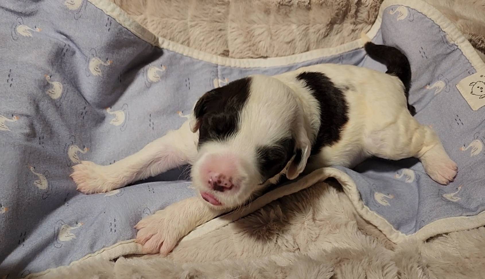 Born on 11/22, 2025, at 1:24pm, this boy is our only black parti puppy! He's a very handsome layout, in my opinion, reminds me a tuxedo with buttons so far, quite dashing (in my opinion). We're accustomed to pups being 'born in pairs,' followed by a bit more of a break, so to have him come in less than 20 minutes later was a welcome surprise - this his brother outdid him. This little boy, our only black parti coat, weighted in at 9.9oz.