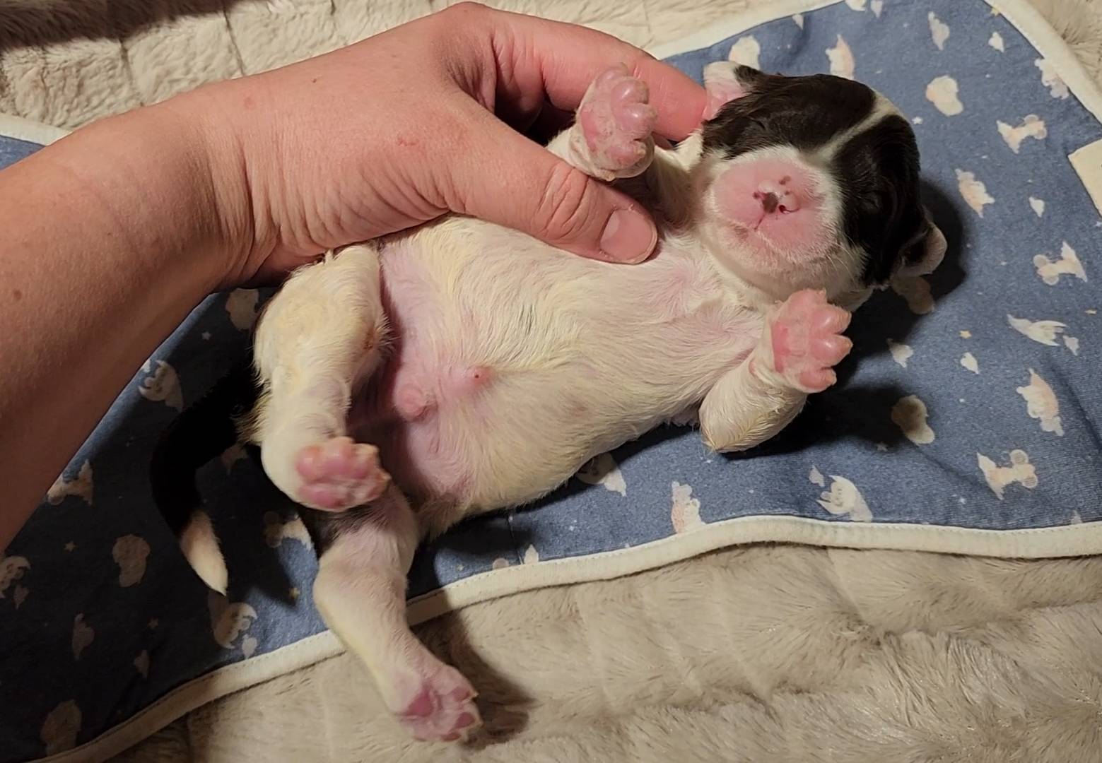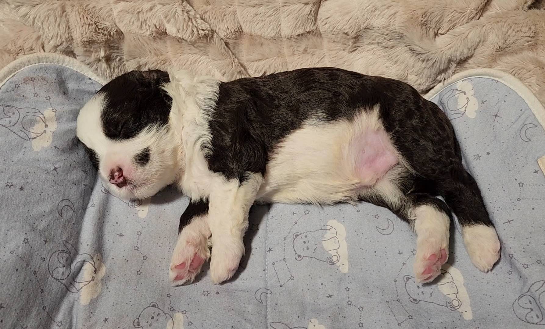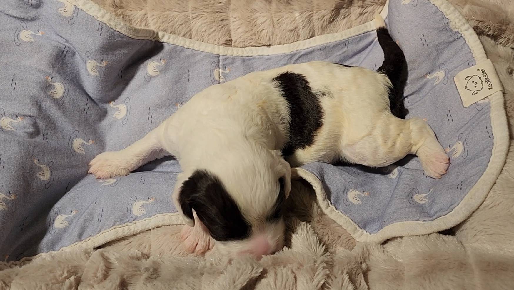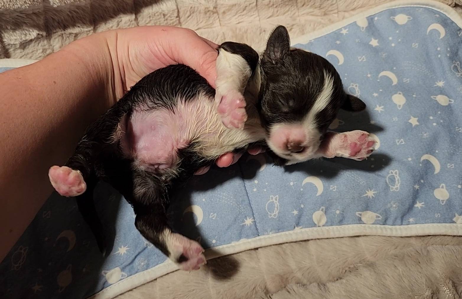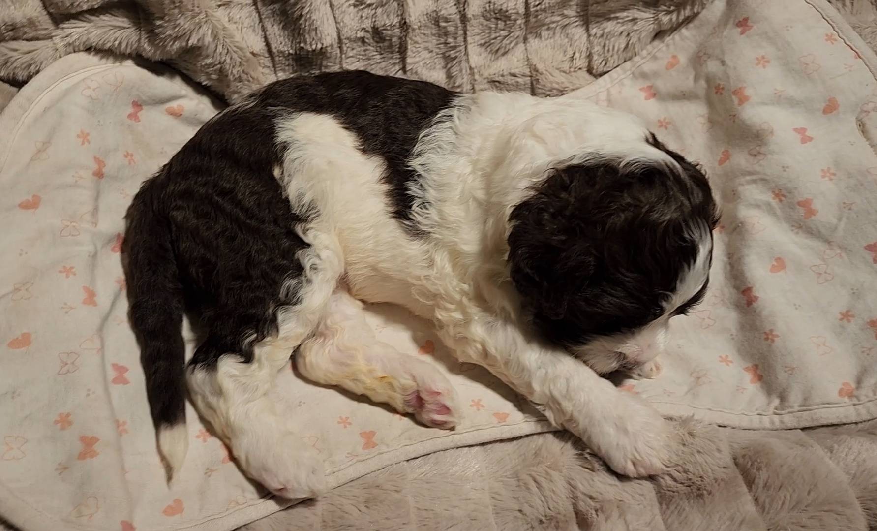Born on 11/22, 2025, at 1:24pm, this boy is our only black parti puppy! He's a very handsome layout, in my opinion, reminds me a tuxedo with buttons so far, quite dashing (in my opinion). We're accustomed to pups being 'born in pairs,' followed by a bit more of a break, so to have him come in less than 20 minutes later was a welcome surprise - this his brother outdid him. This little boy, our only black parti coat, weighted in at 9.9oz.