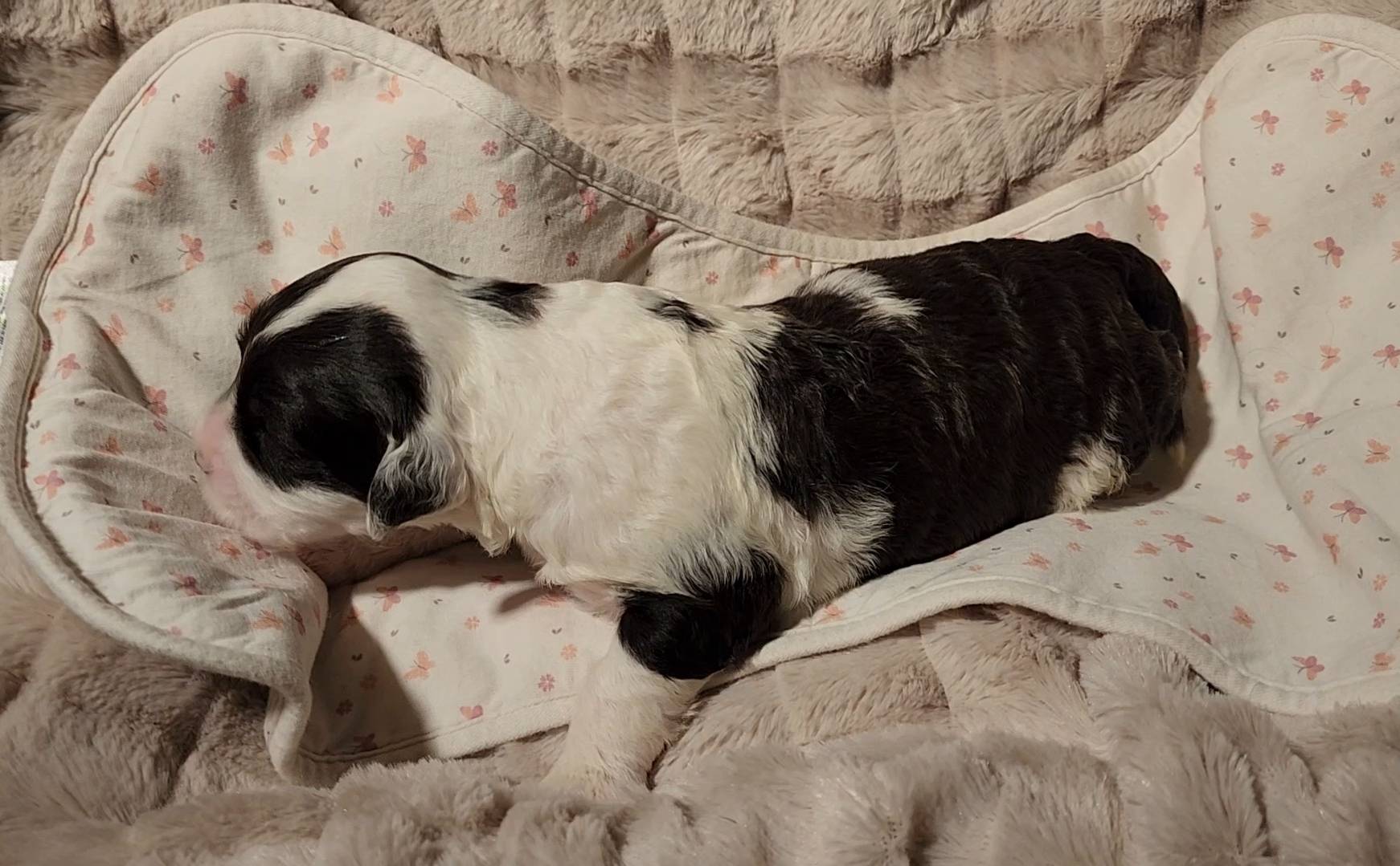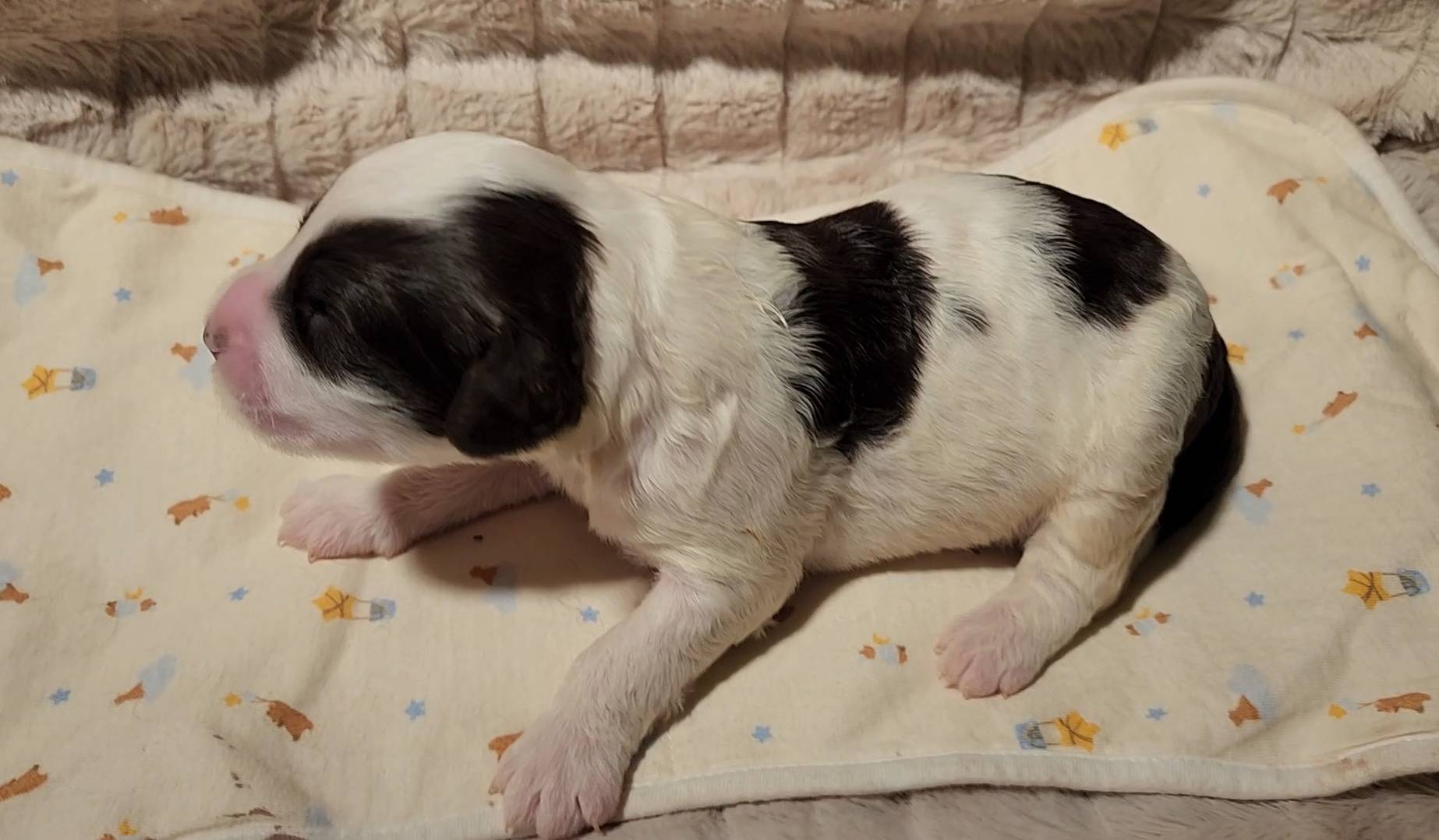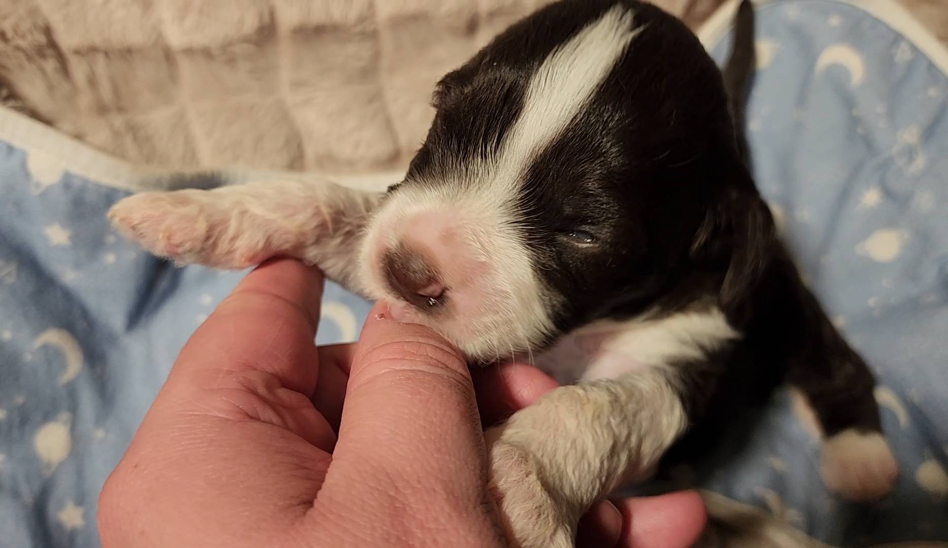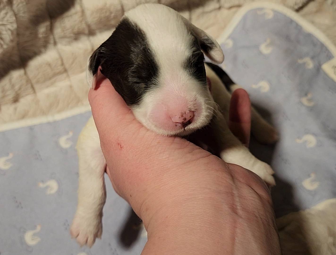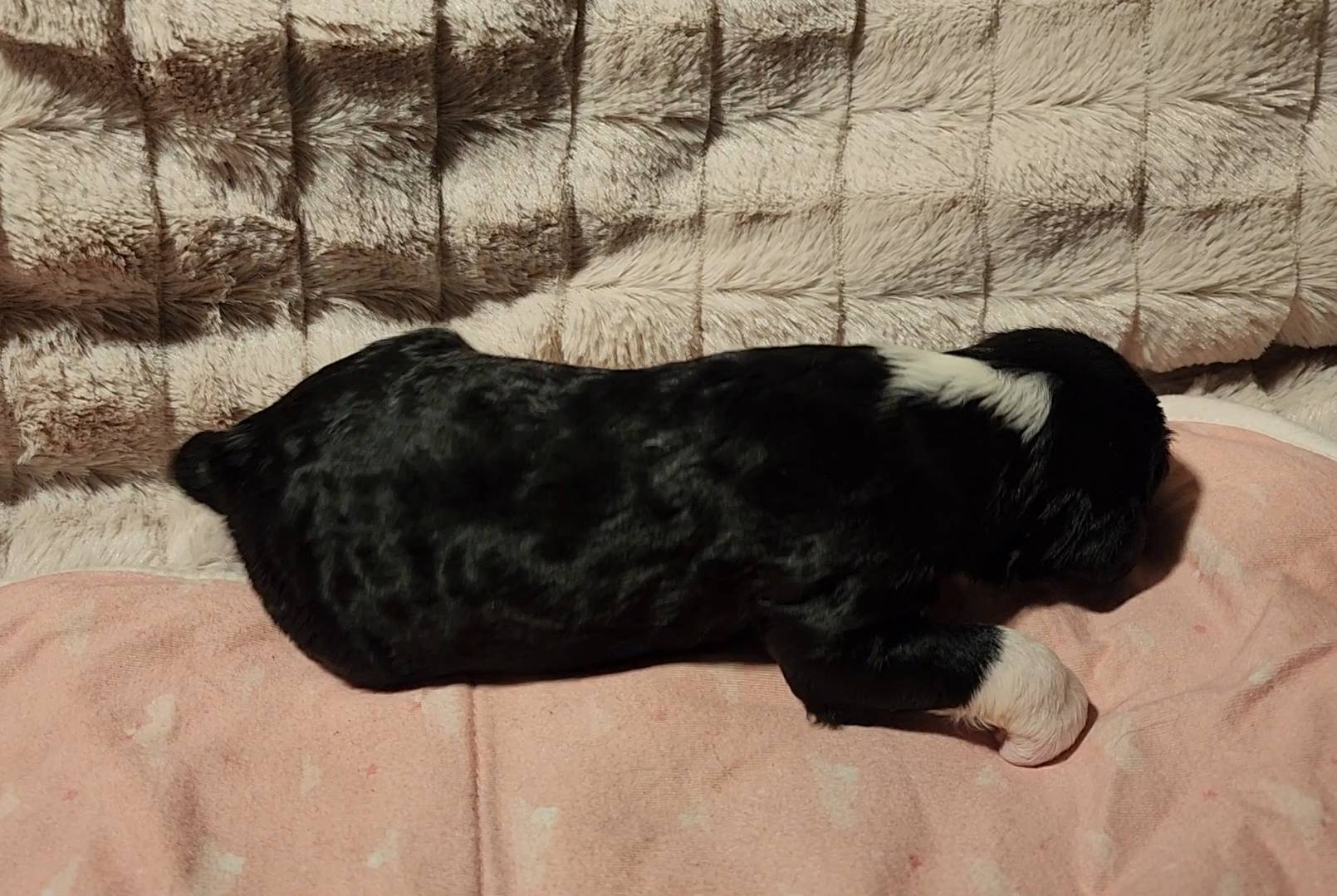 Born on 11/22, 2025, at 1:24pm, this boy is our only black parti puppy! He's a very handsome layout, in my opinion, reminds me a tuxedo with buttons so far, quite dashing (in my opinion). We're accustomed to pups being 'born in pairs,' followed by a bit more of a break, so to have him come in less than 20 minutes later was a welcome surprise - this his brother outdid him. This little boy, our only black parti coat, weighted in at 9.9oz.