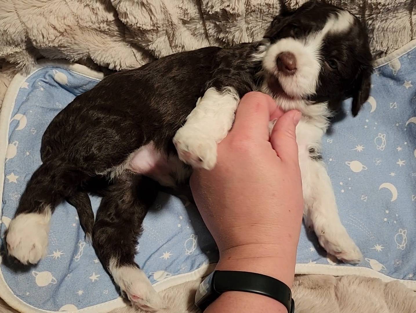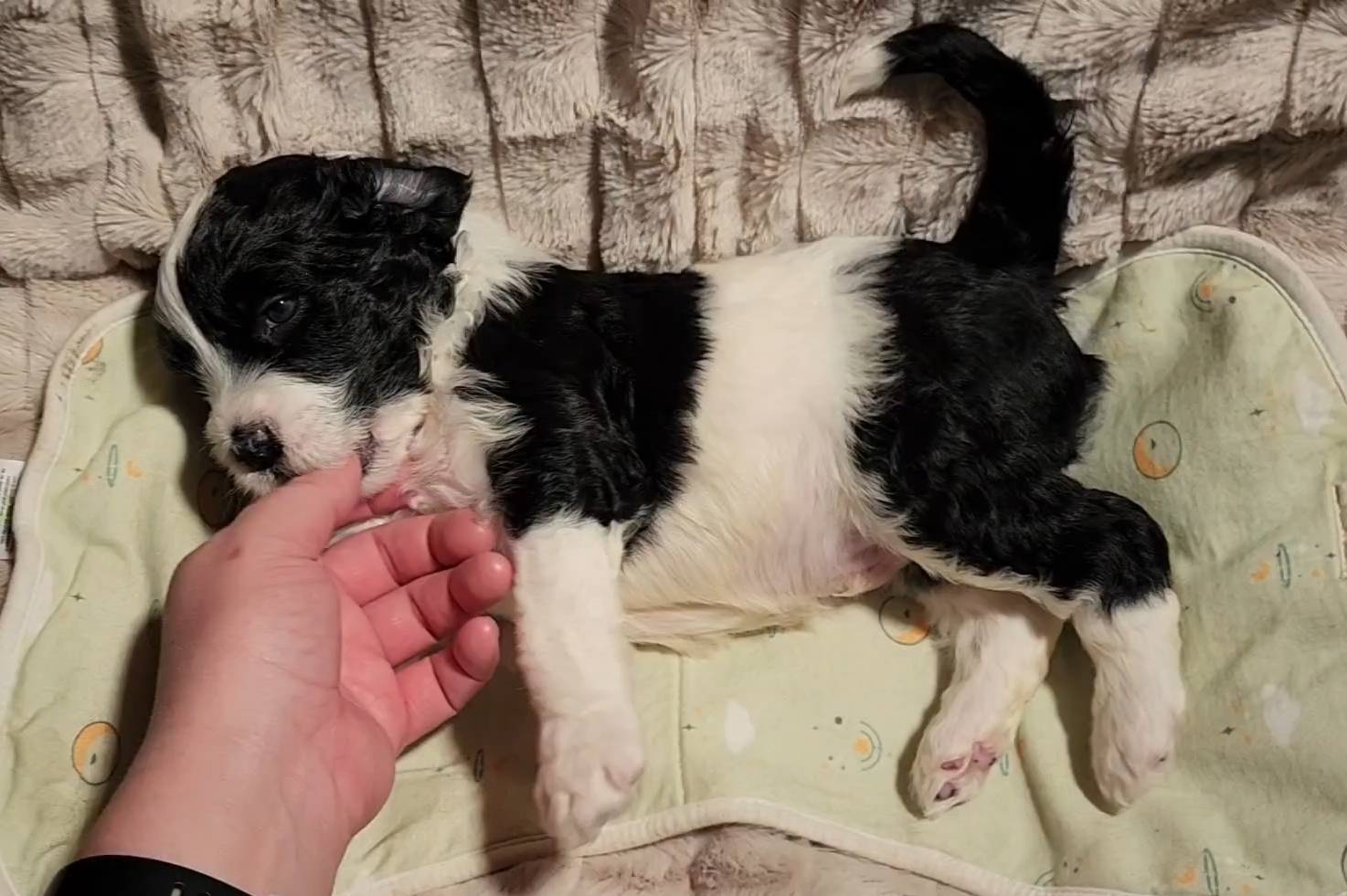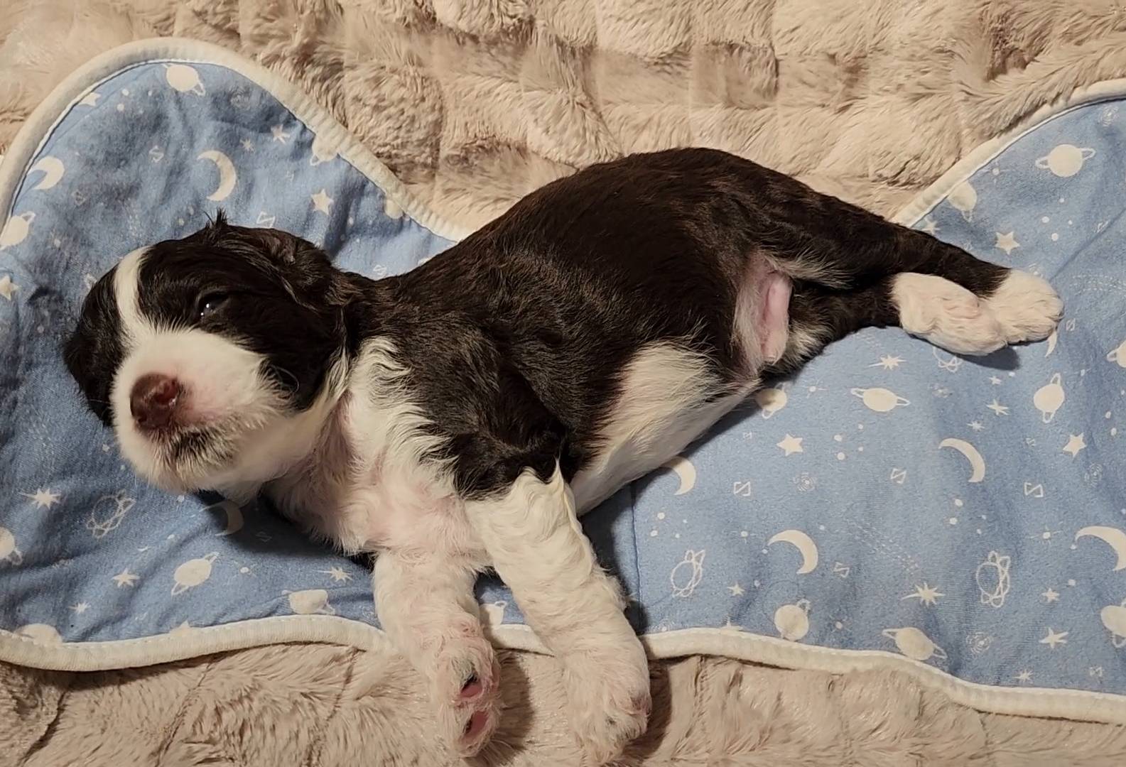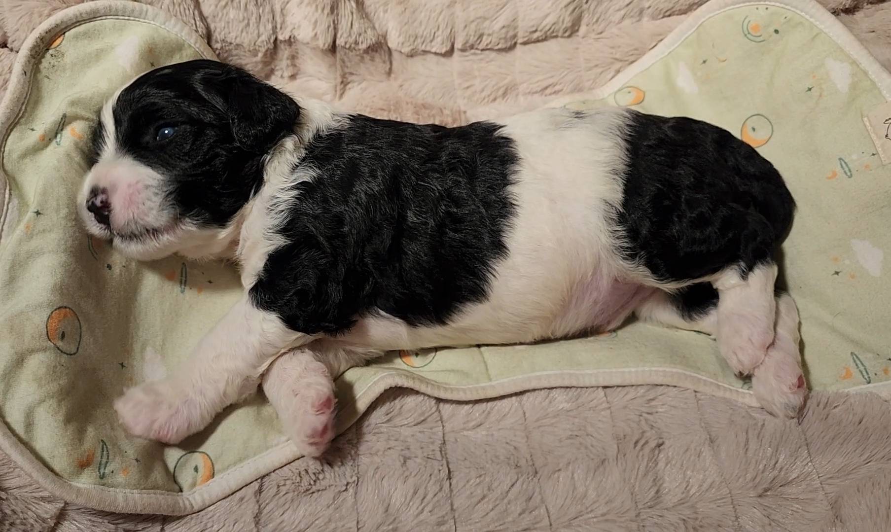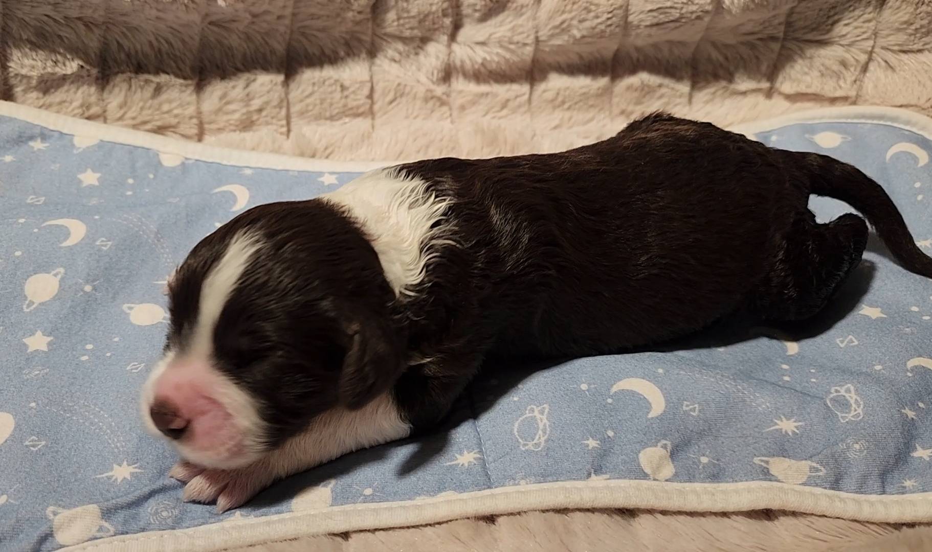 Born on 11/22, 2025, at 1:24pm, this boy is our only black parti puppy! He's a very handsome layout, in my opinion, reminds me a tuxedo with buttons so far, quite dashing (in my opinion). We're accustomed to pups being 'born in pairs,' followed by a bit more of a break, so to have him come in less than 20 minutes later was a welcome surprise - this his brother outdid him. This little boy, our only black parti coat, weighted in at 9.9oz.