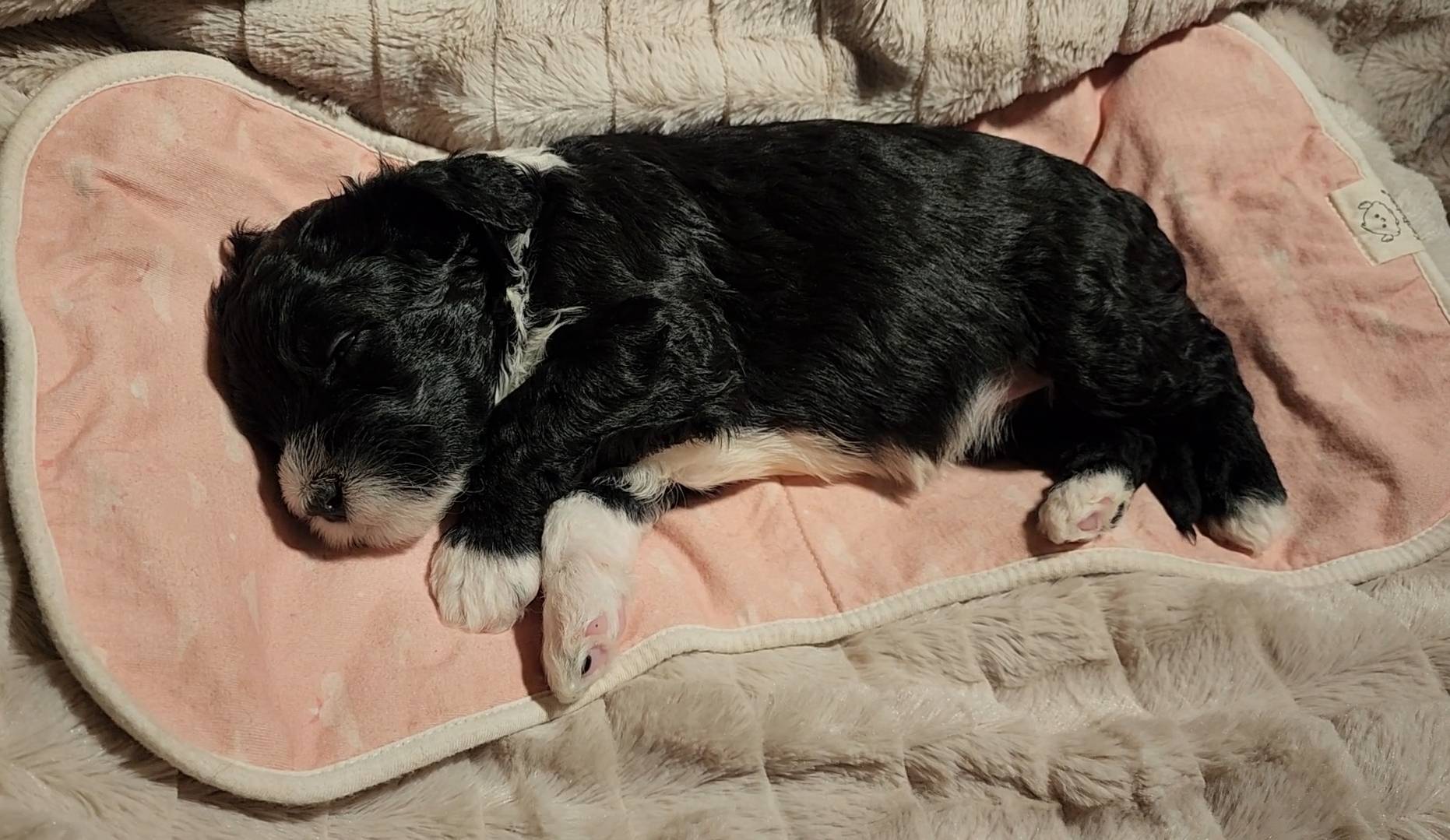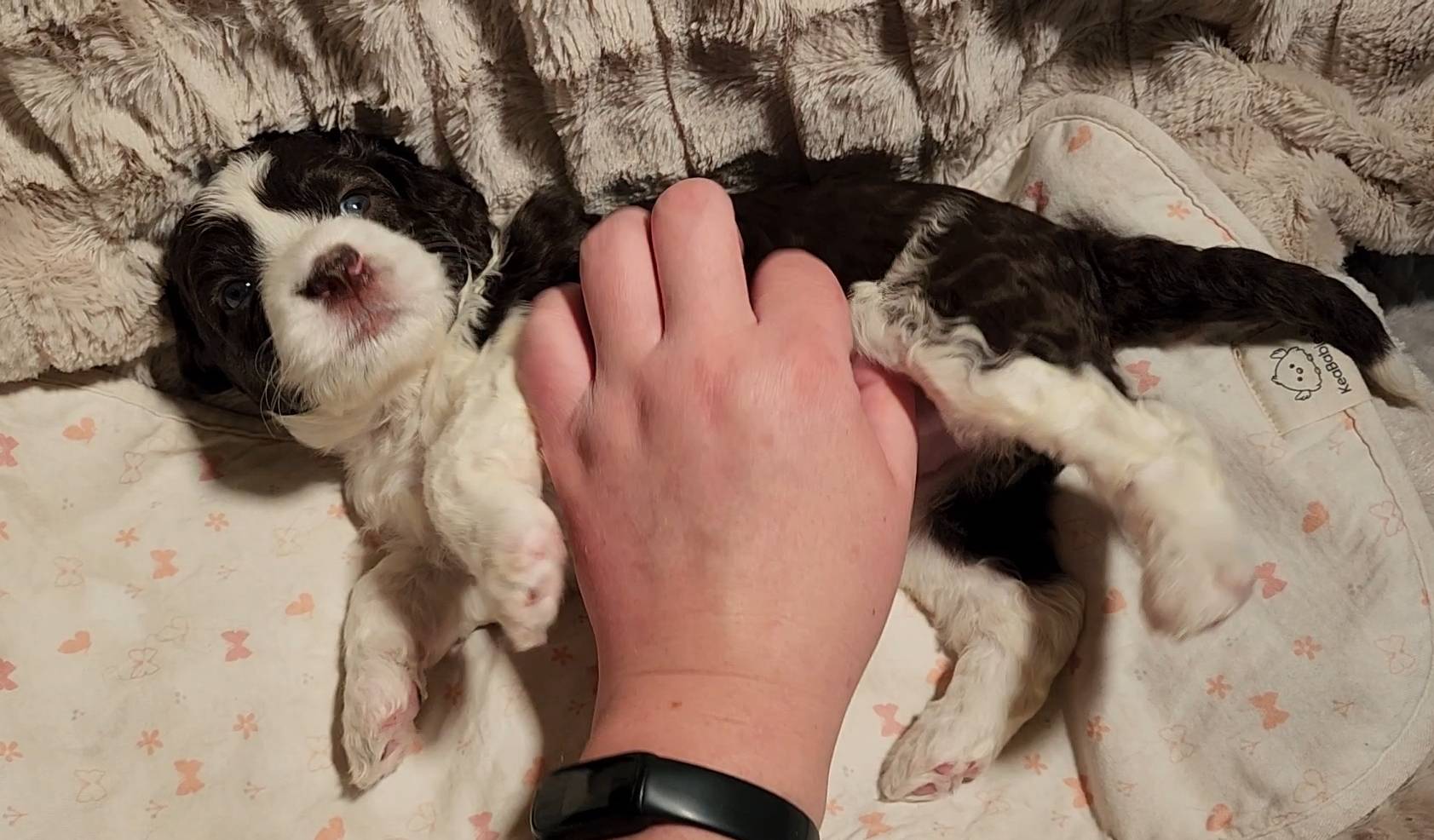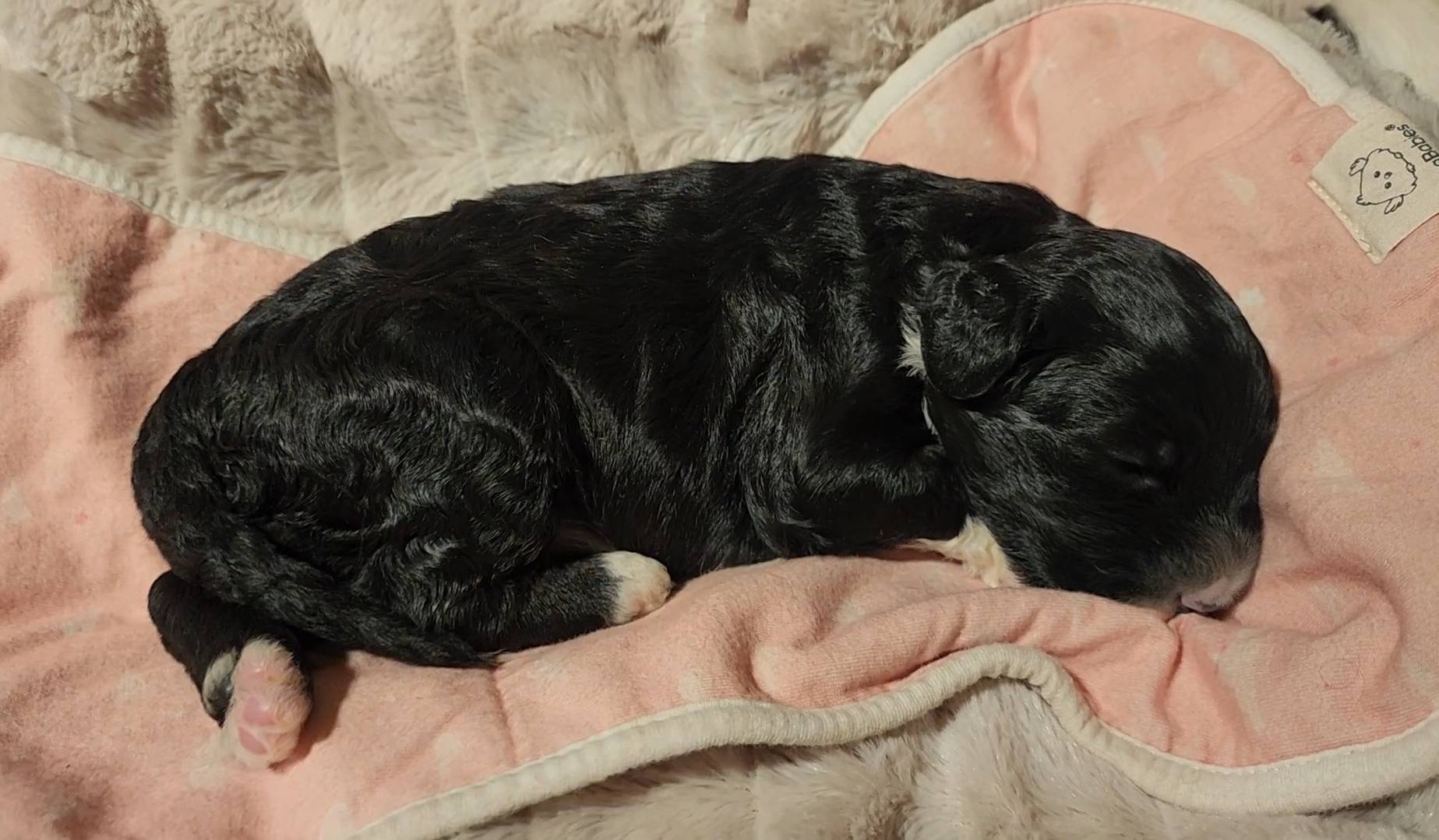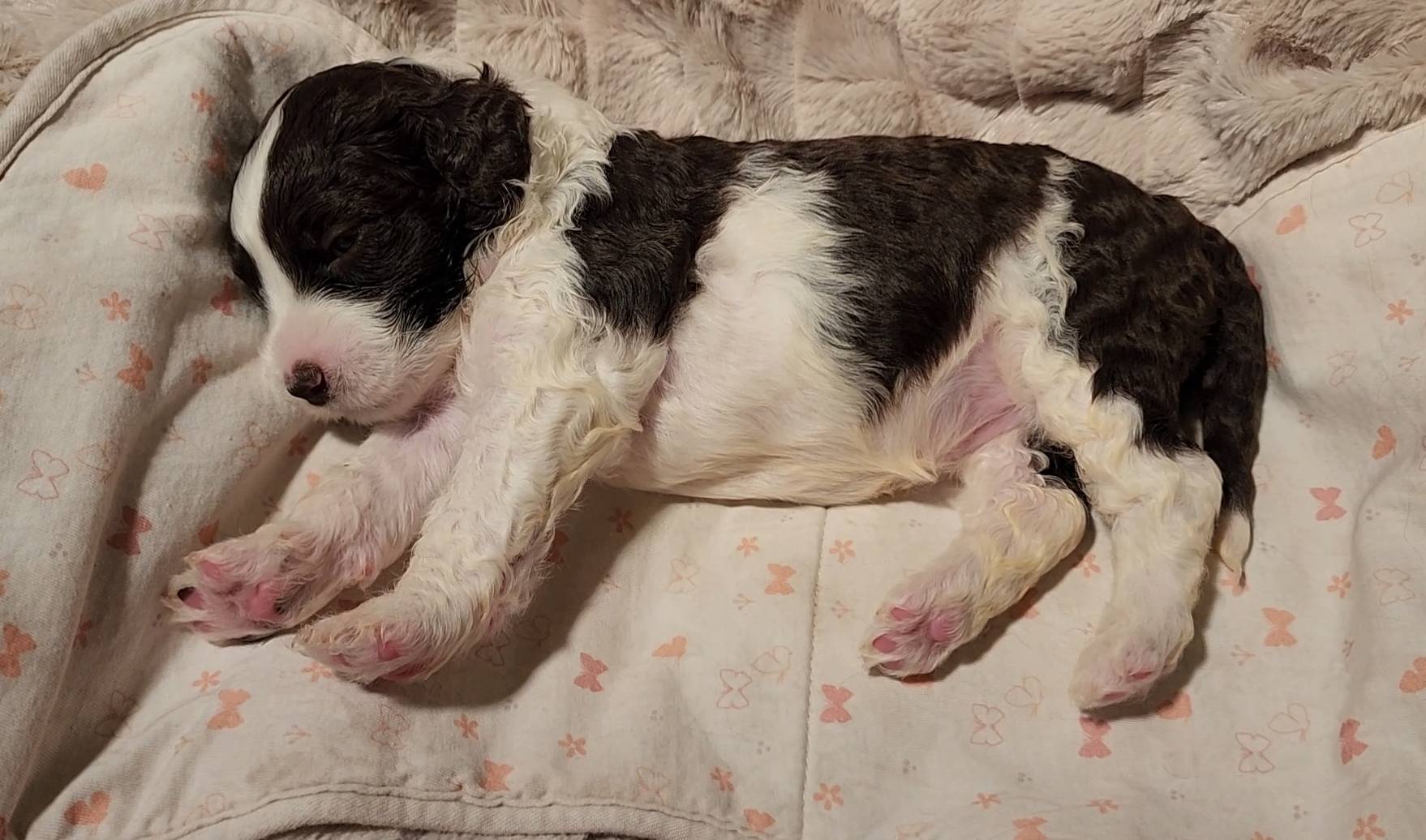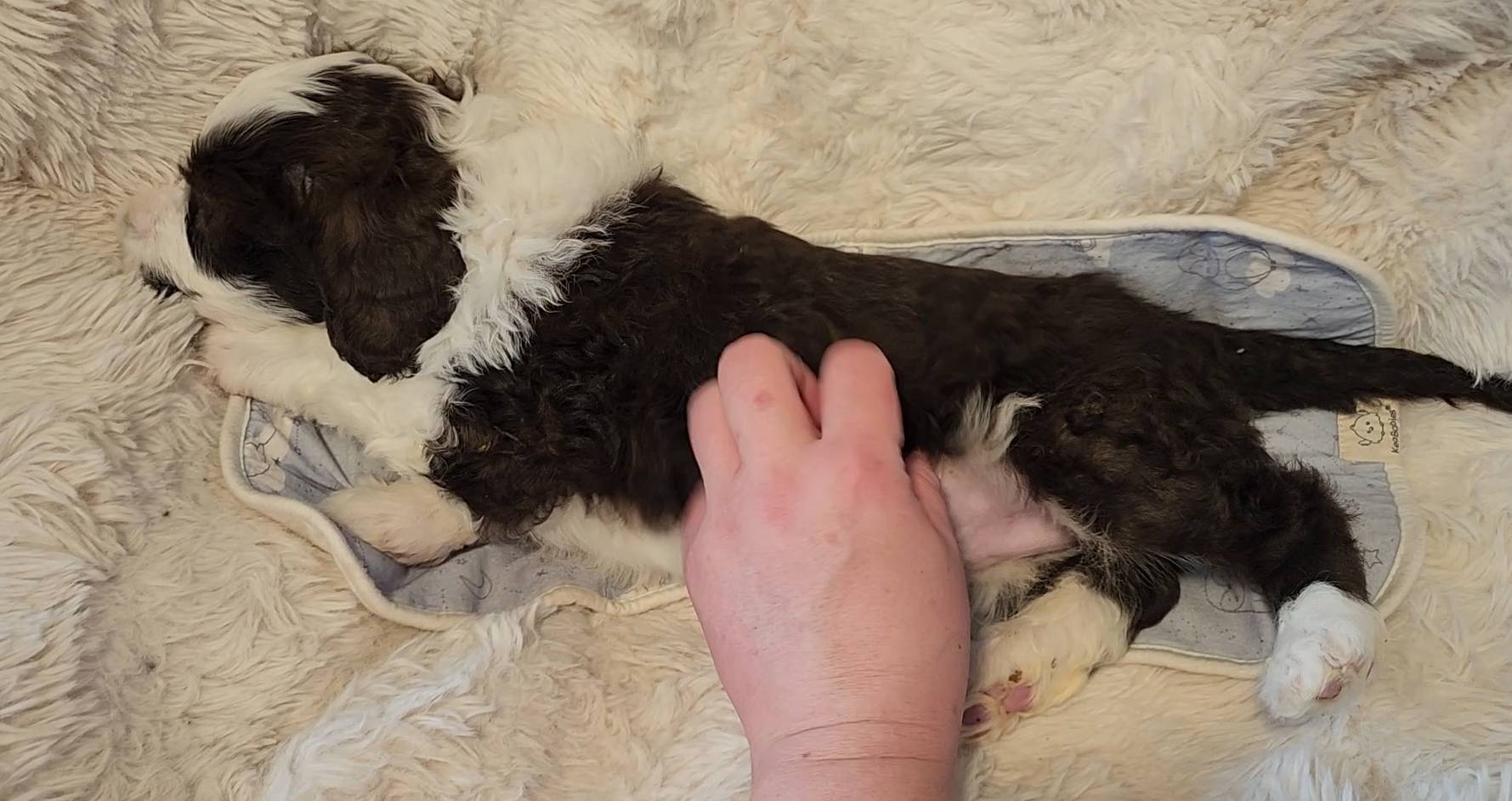 Born on 11/22, 2025, at 1:24pm, this boy is our only black parti puppy! He's a very handsome layout, in my opinion, reminds me a tuxedo with buttons so far, quite dashing (in my opinion). We're accustomed to pups being 'born in pairs,' followed by a bit more of a break, so to have him come in less than 20 minutes later was a welcome surprise - this his brother outdid him. This little boy, our only black parti coat, weighted in at 9.9oz.