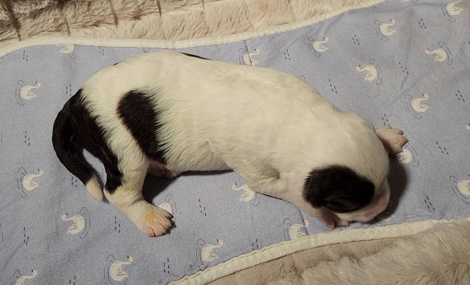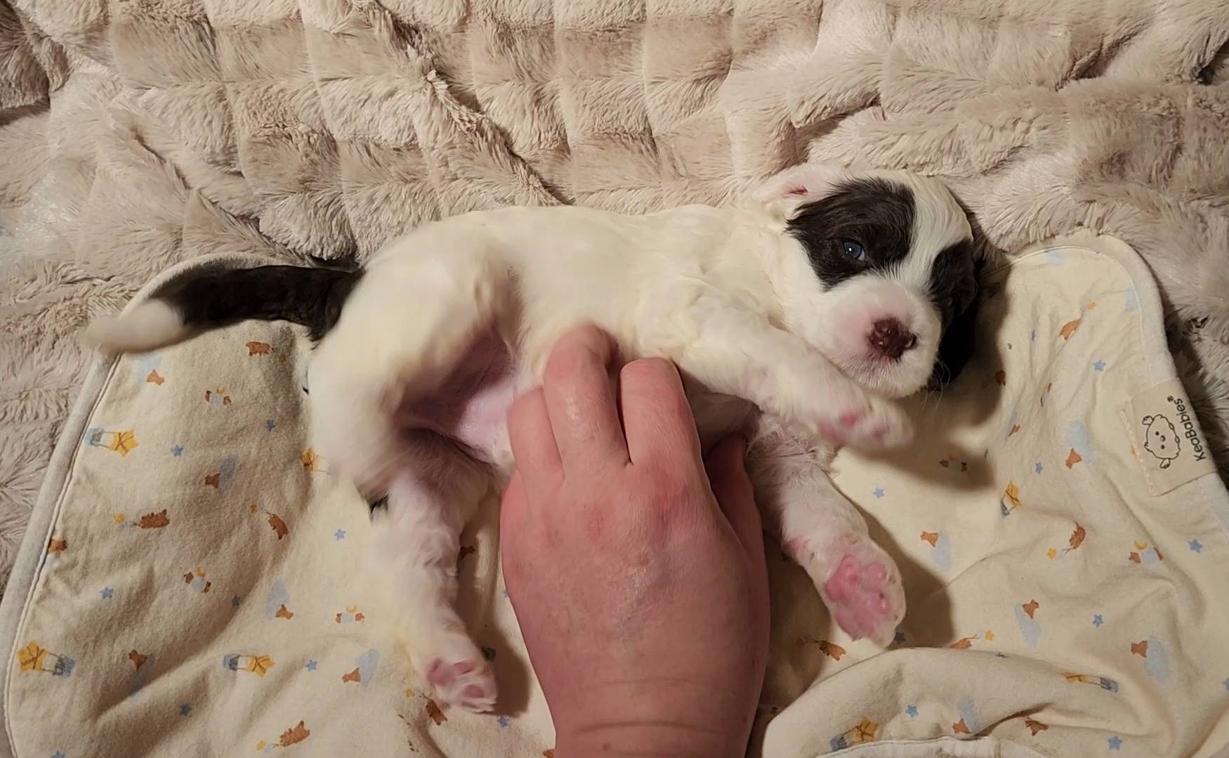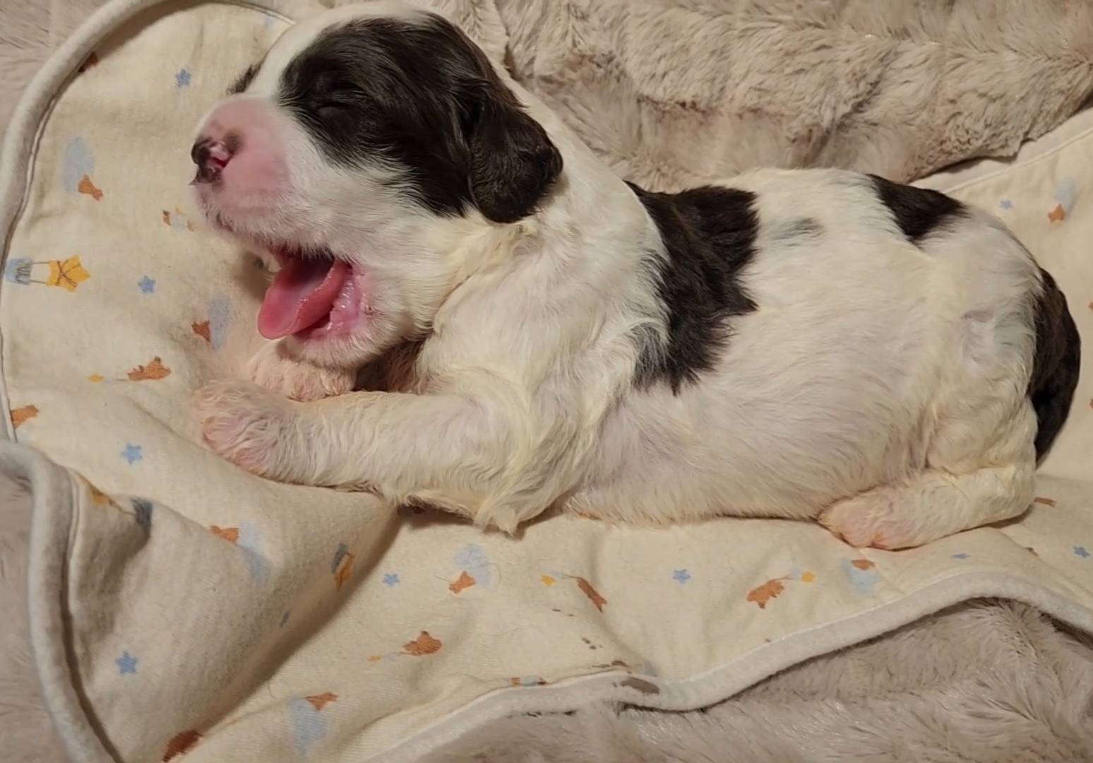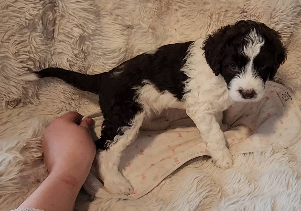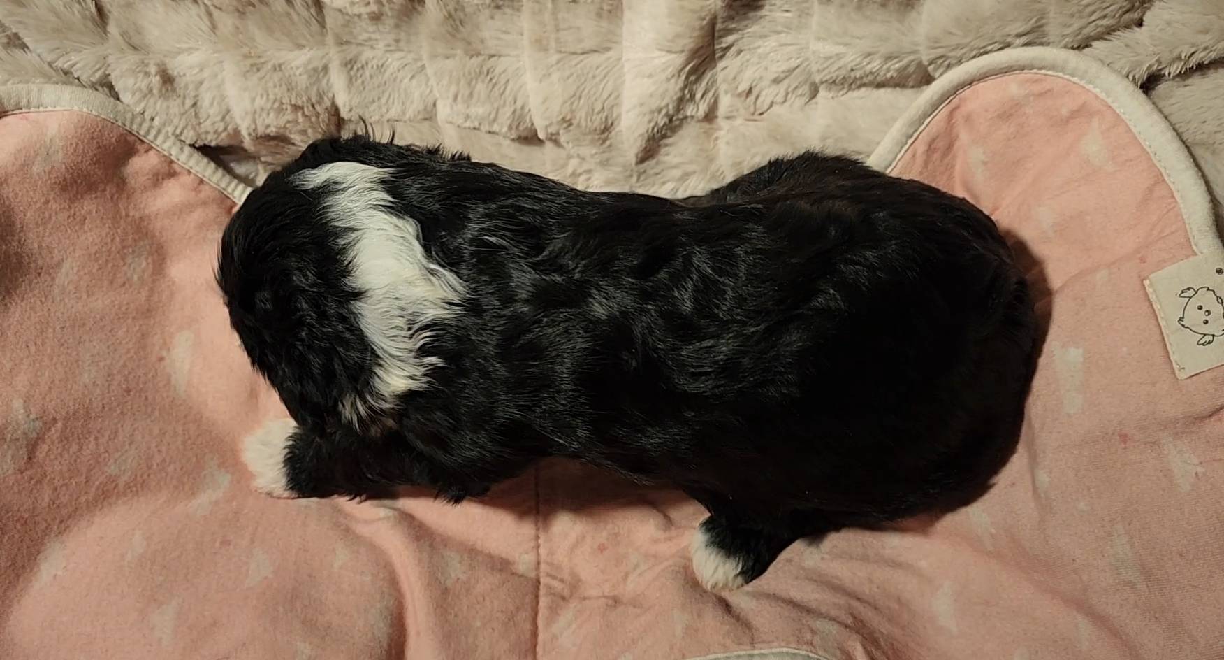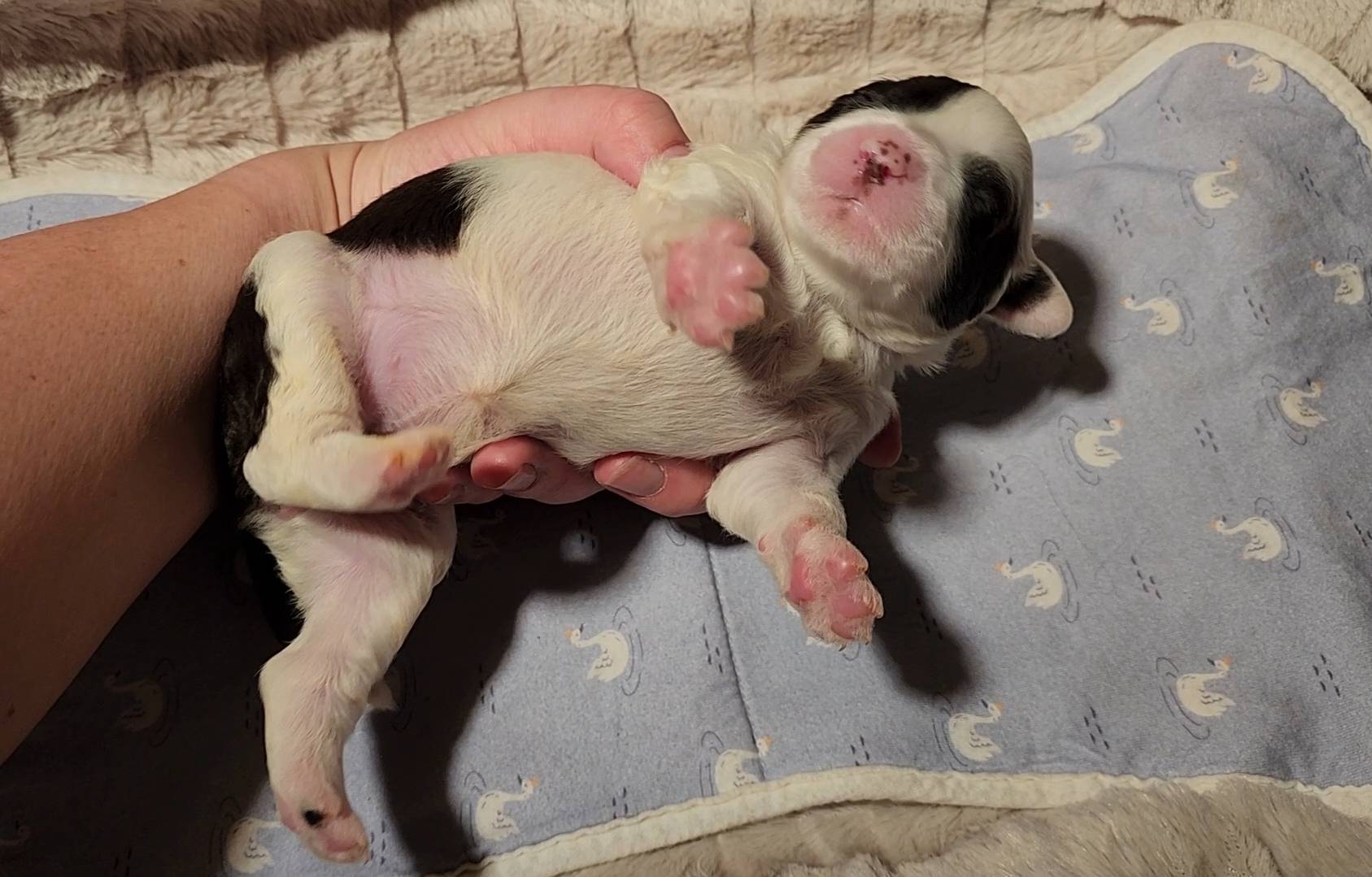 Born on 11/22, 2025, at 1:24pm, this boy is our only black parti puppy! He's a very handsome layout, in my opinion, reminds me a tuxedo with buttons so far, quite dashing (in my opinion). We're accustomed to pups being 'born in pairs,' followed by a bit more of a break, so to have him come in less than 20 minutes later was a welcome surprise - this his brother outdid him. This little boy, our only black parti coat, weighted in at 9.9oz.