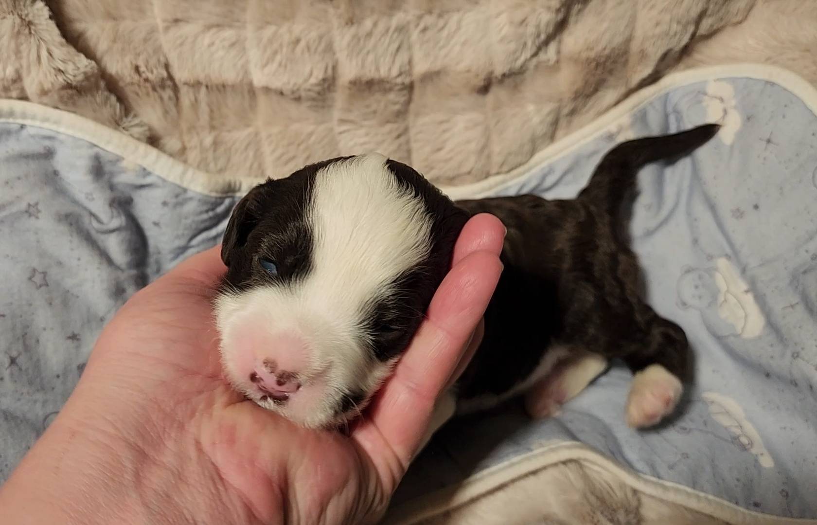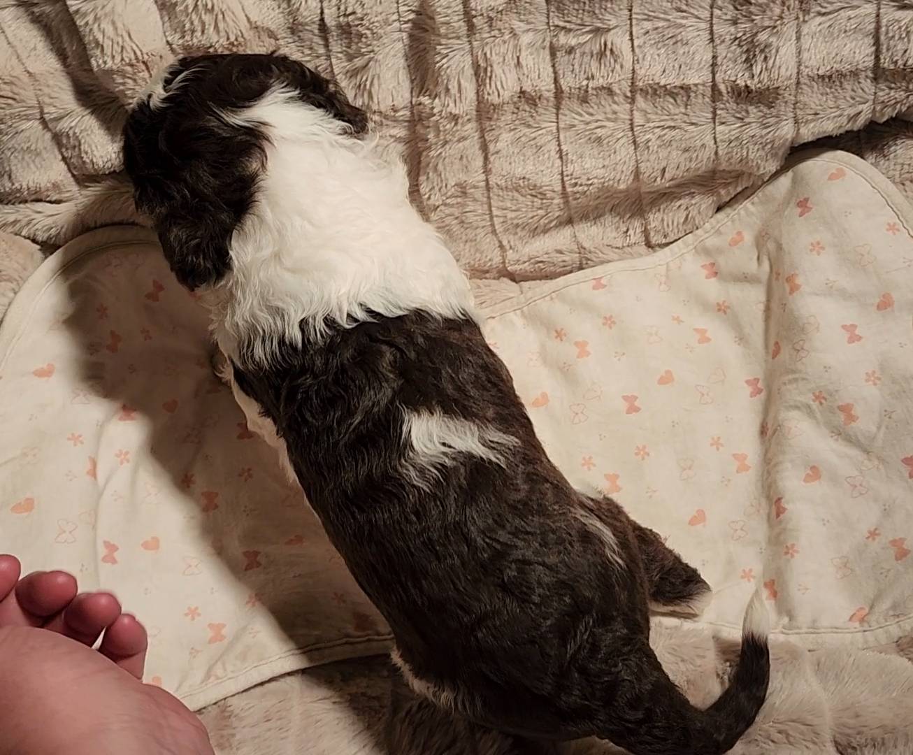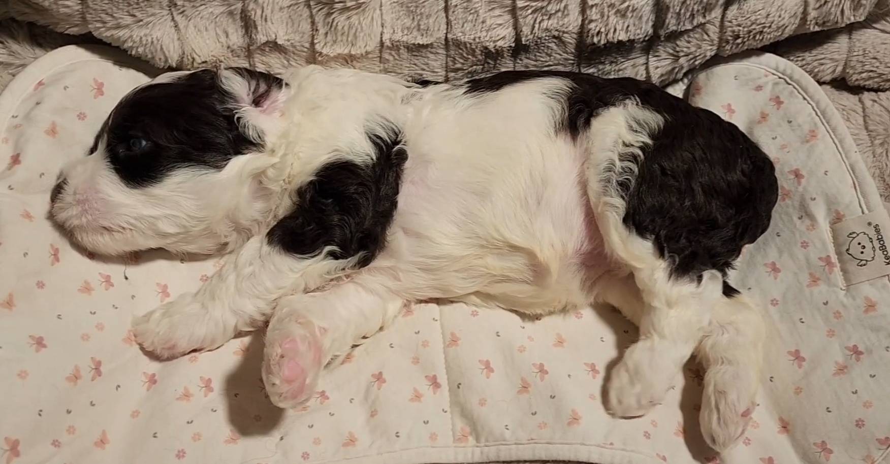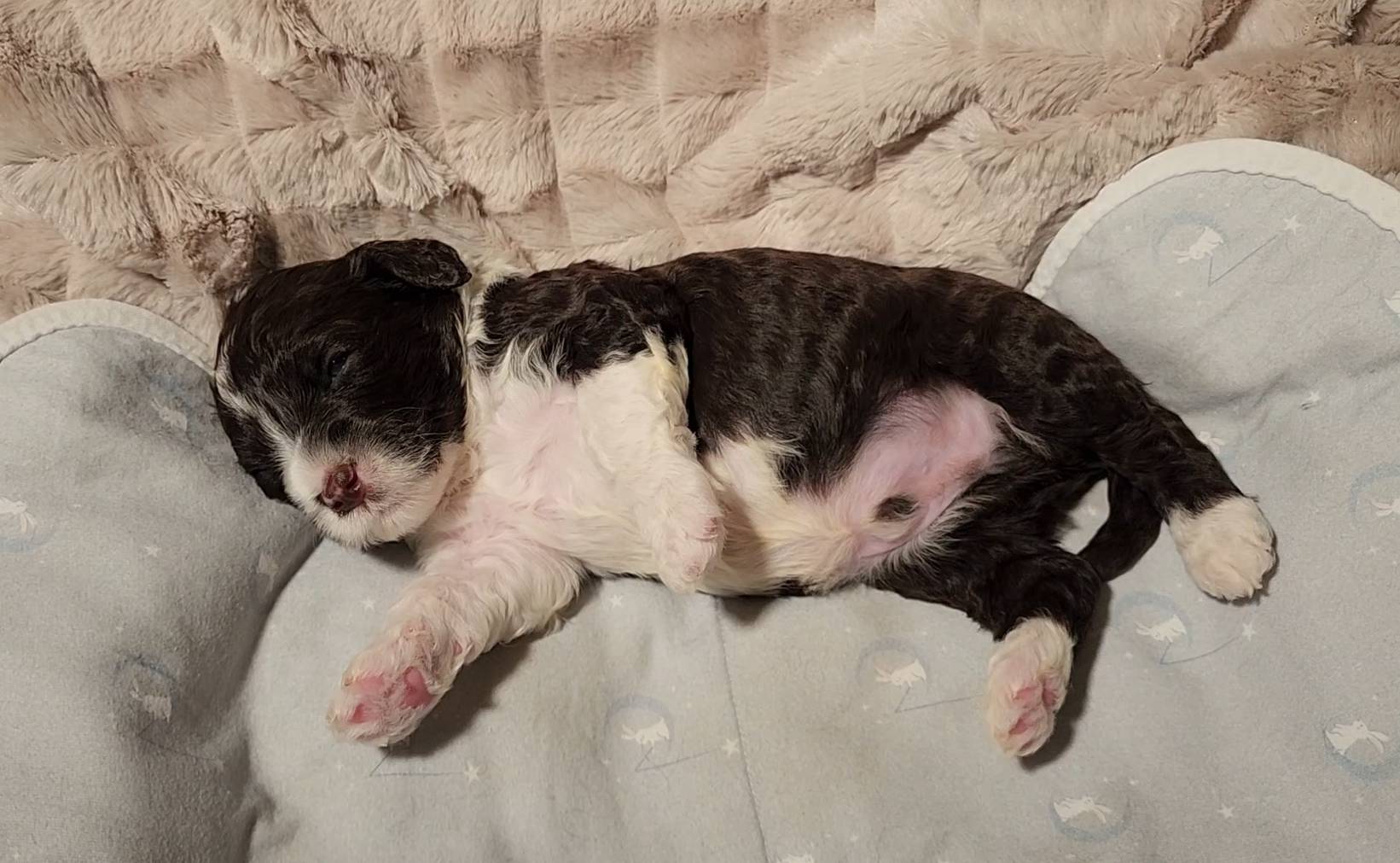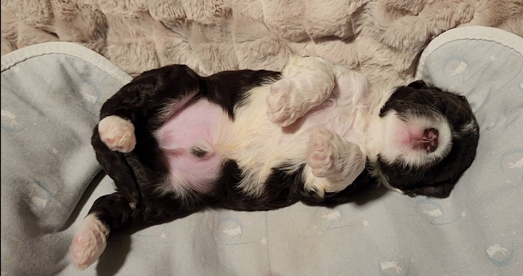 Born on 11/22, 2025, at 1:24pm, this boy is our only black parti puppy! He's a very handsome layout, in my opinion, reminds me a tuxedo with buttons so far, quite dashing (in my opinion). We're accustomed to pups being 'born in pairs,' followed by a bit more of a break, so to have him come in less than 20 minutes later was a welcome surprise - this his brother outdid him. This little boy, our only black parti coat, weighted in at 9.9oz.