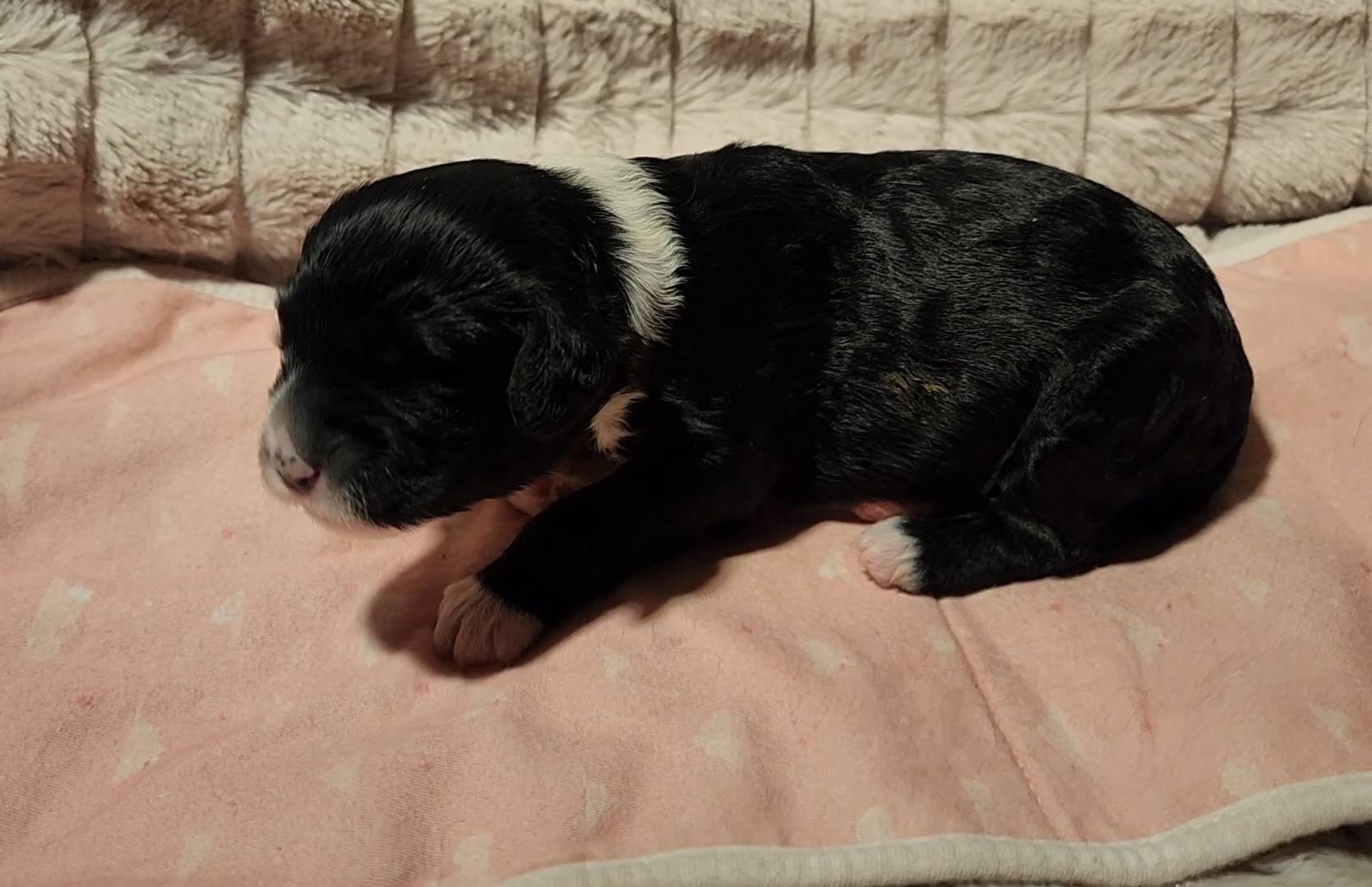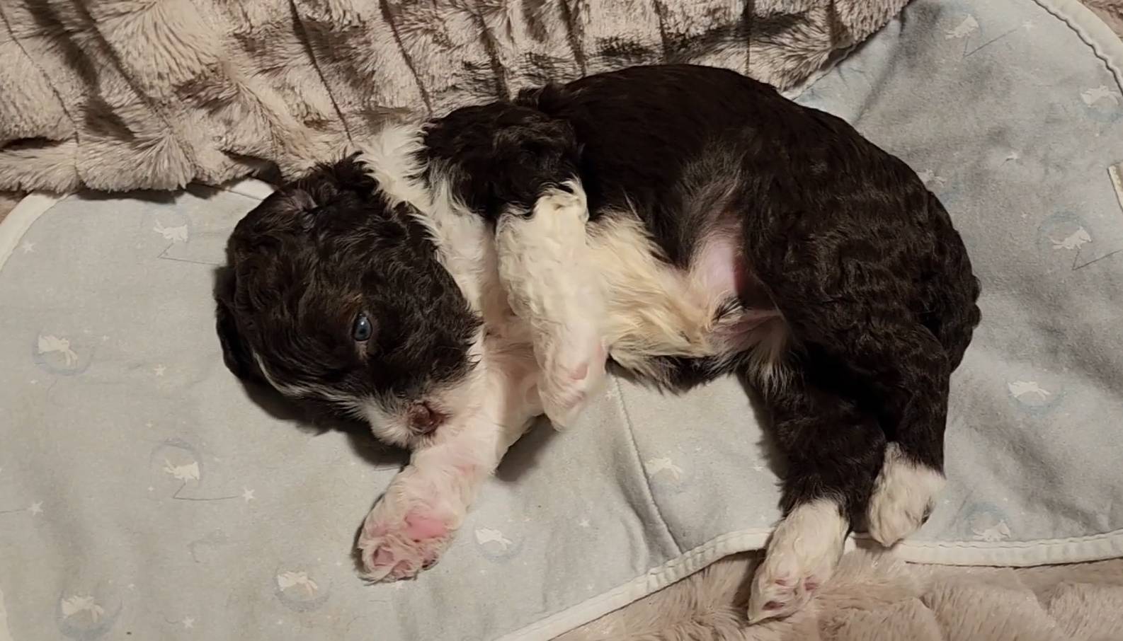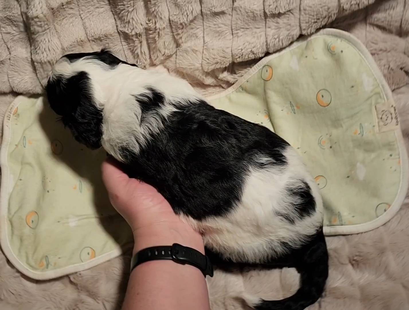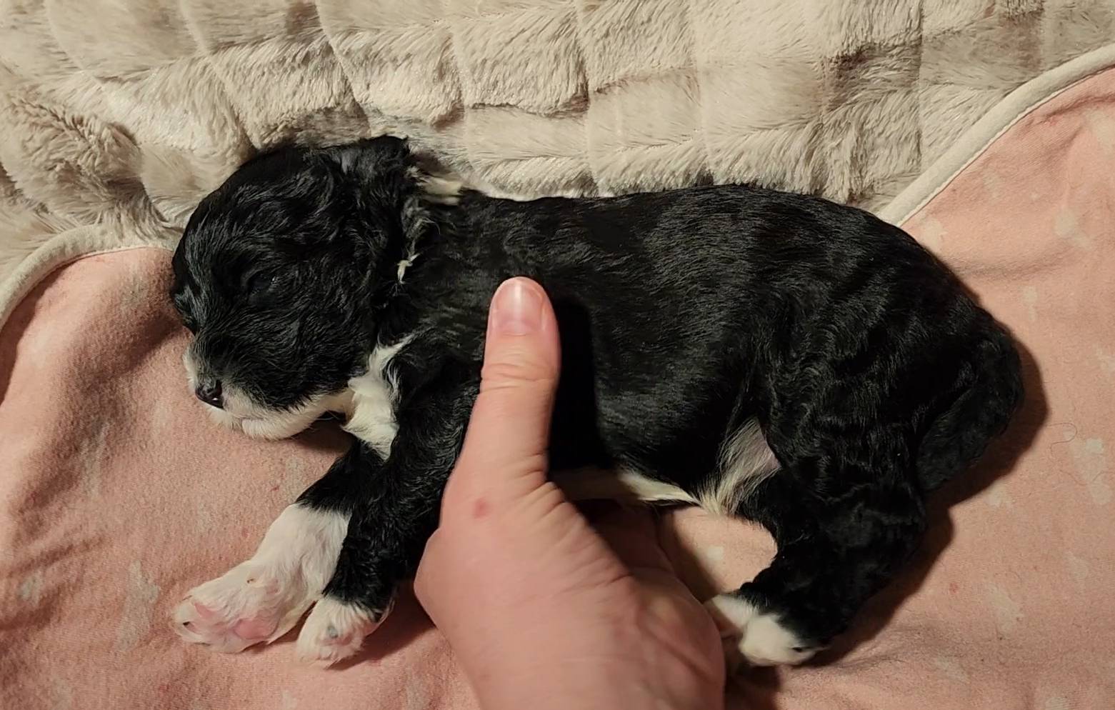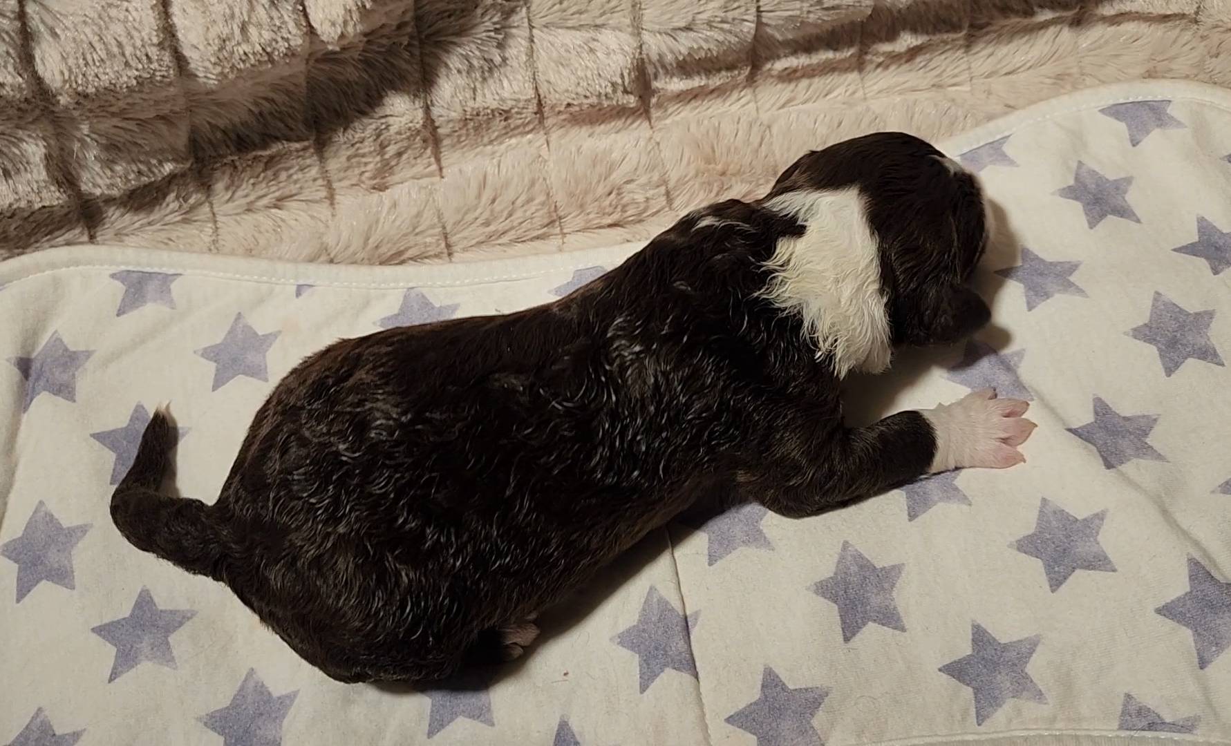 Born on 11/22, 2025, at 1:24pm, this boy is our only black parti puppy! He's a very handsome layout, in my opinion, reminds me a tuxedo with buttons so far, quite dashing (in my opinion). We're accustomed to pups being 'born in pairs,' followed by a bit more of a break, so to have him come in less than 20 minutes later was a welcome surprise - this his brother outdid him. This little boy, our only black parti coat, weighted in at 9.9oz.