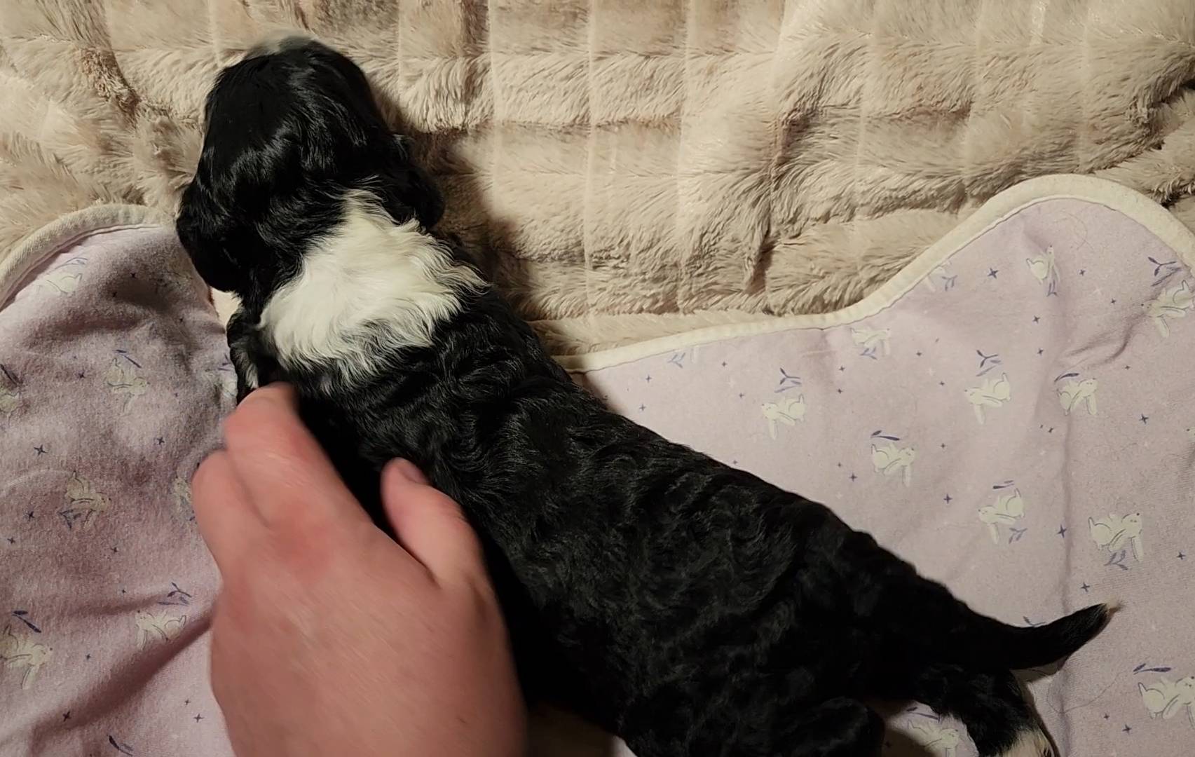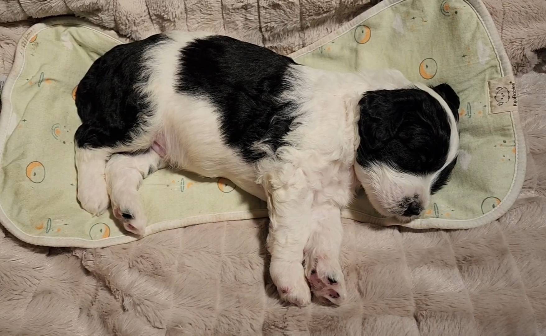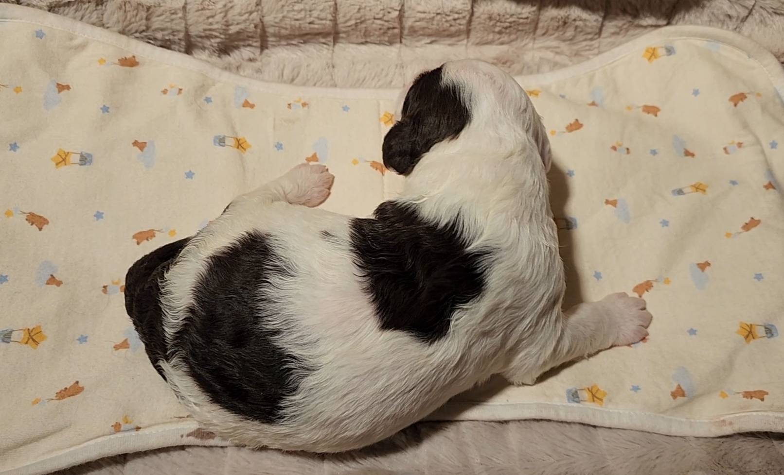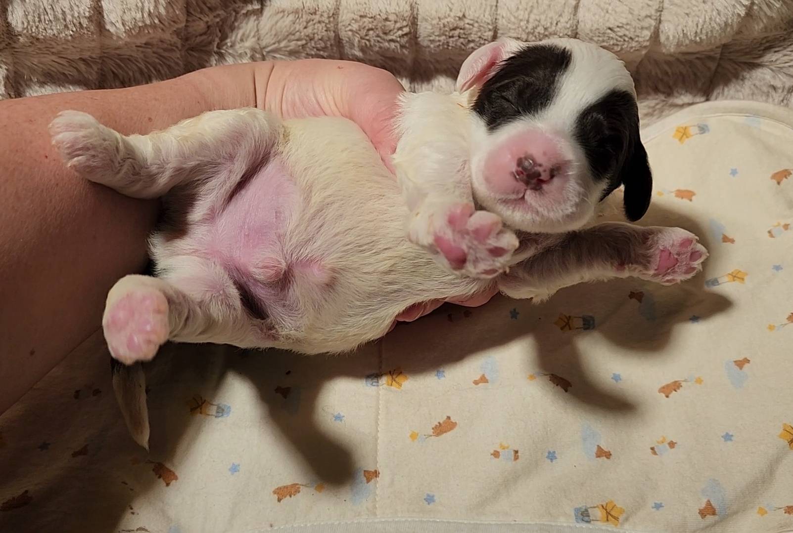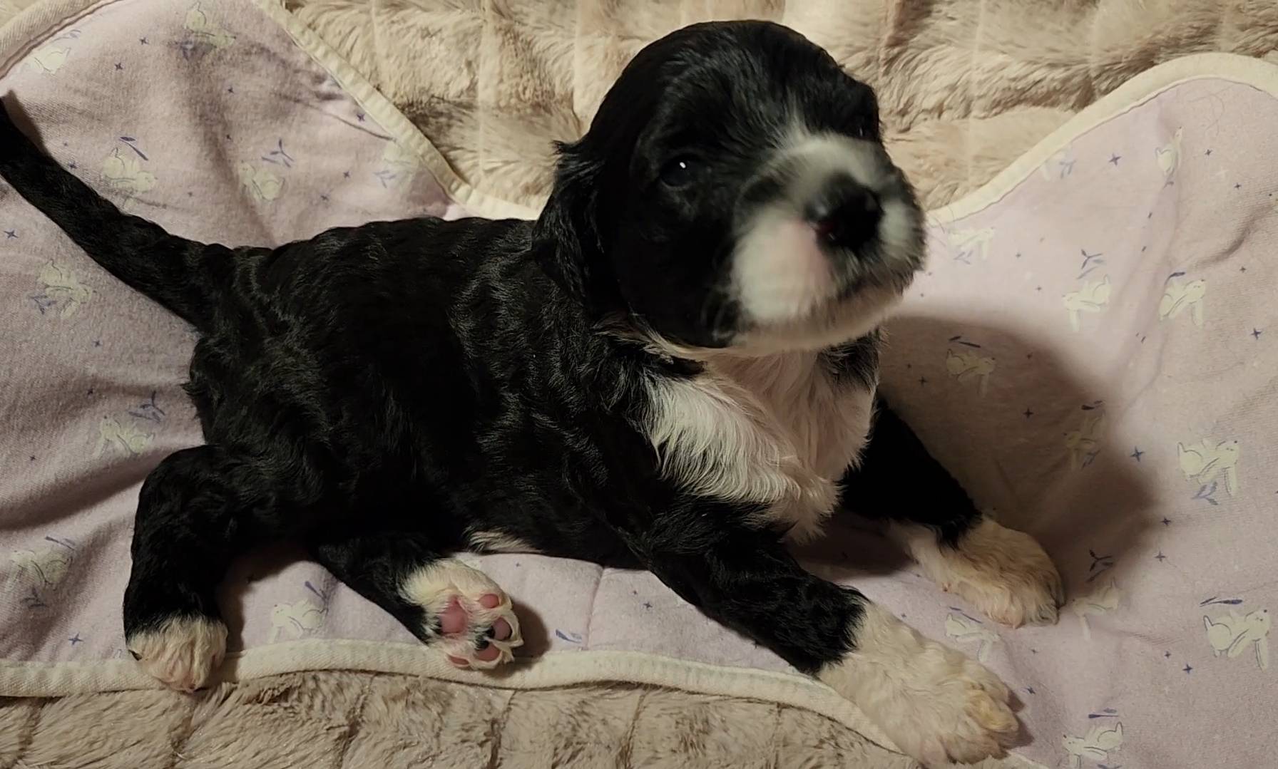 Born on 11/22, 2025, at 1:24pm, this boy is our only black parti puppy! He's a very handsome layout, in my opinion, reminds me a tuxedo with buttons so far, quite dashing (in my opinion). We're accustomed to pups being 'born in pairs,' followed by a bit more of a break, so to have him come in less than 20 minutes later was a welcome surprise - this his brother outdid him. This little boy, our only black parti coat, weighted in at 9.9oz.