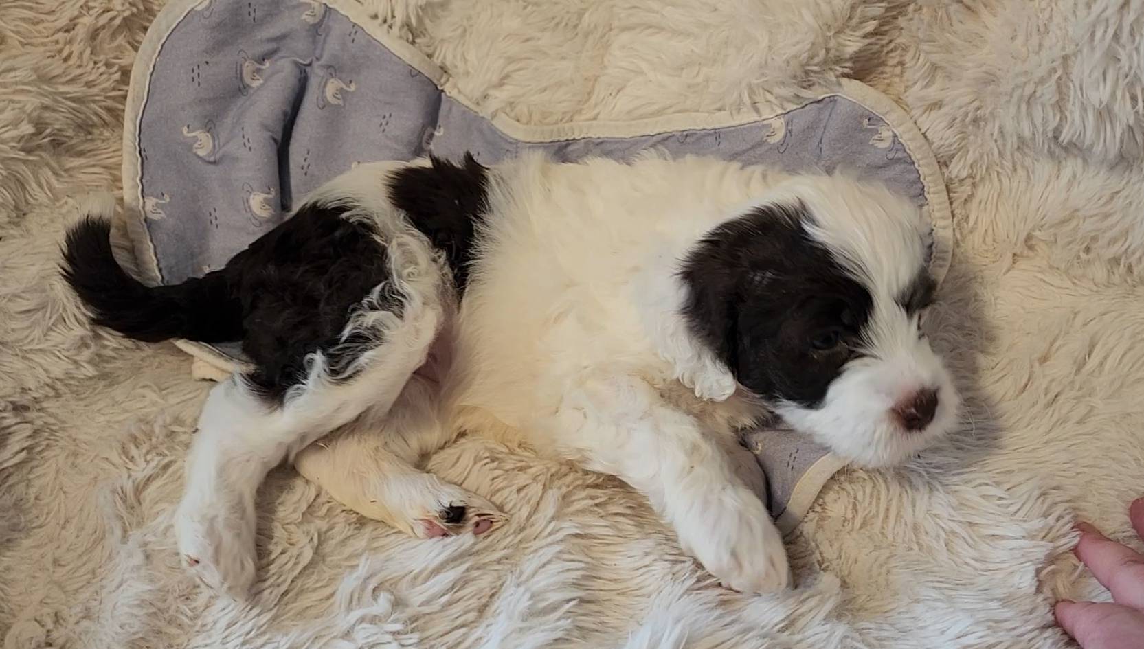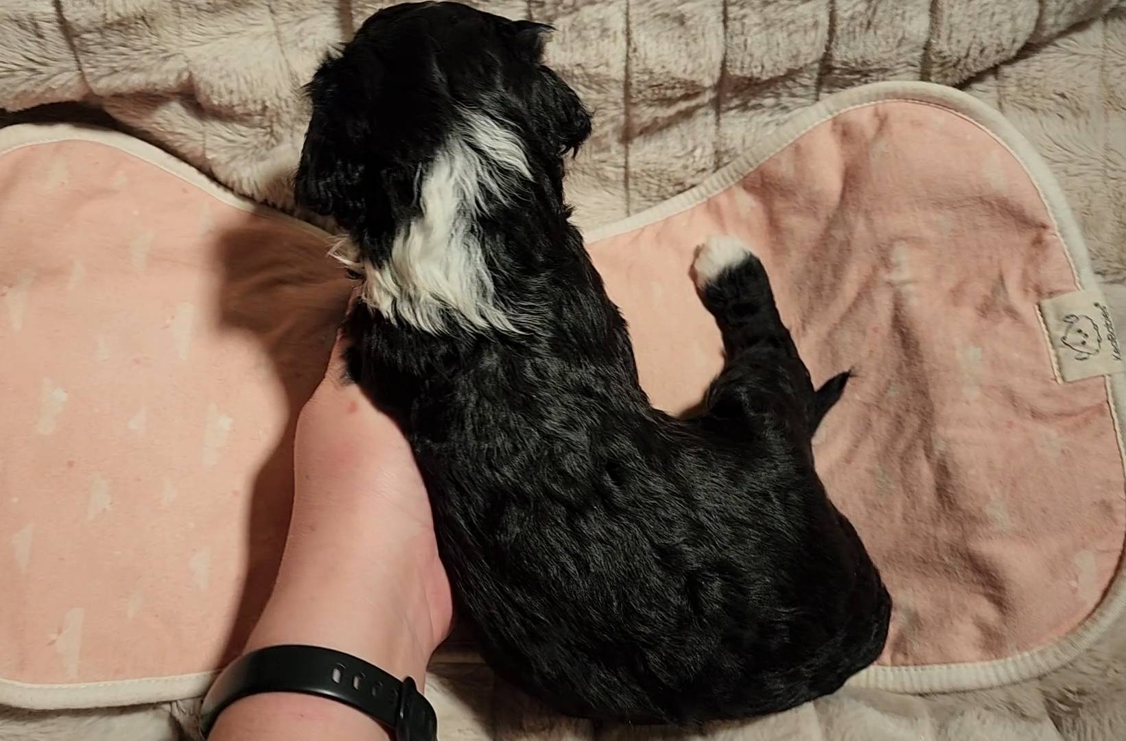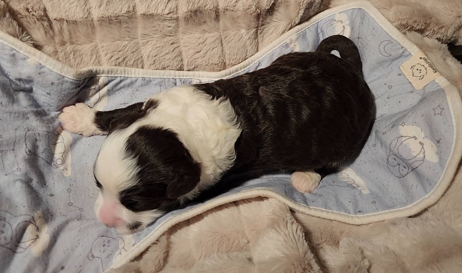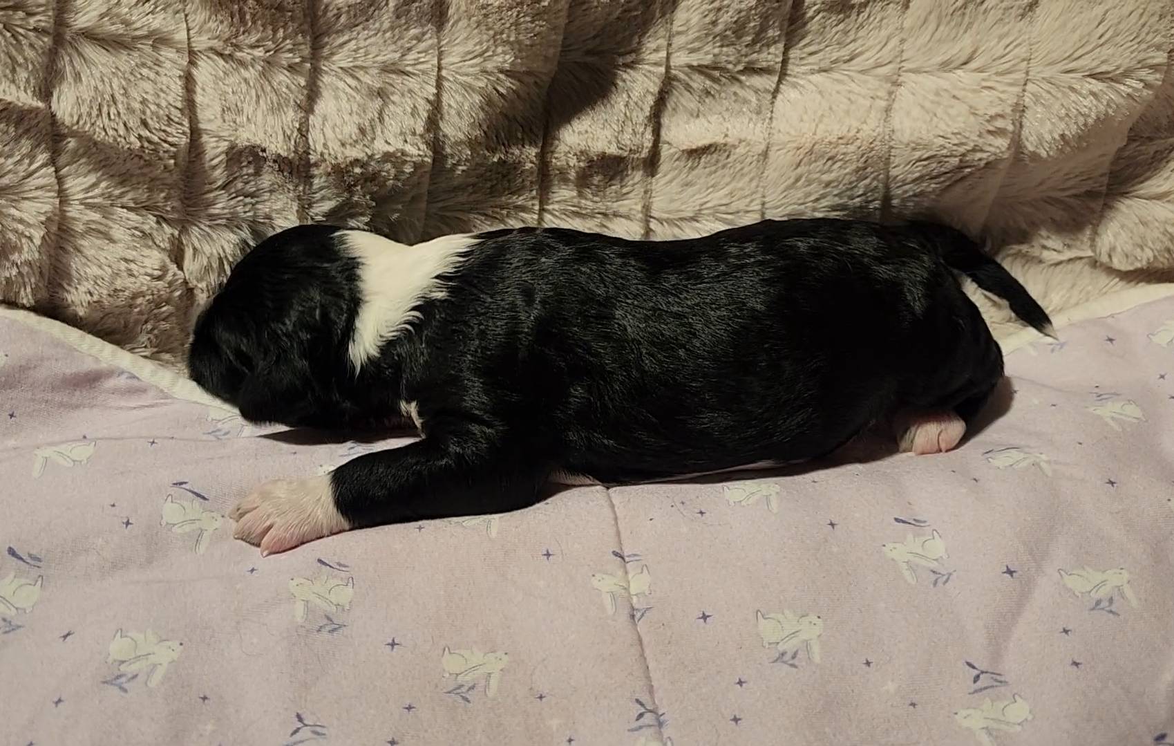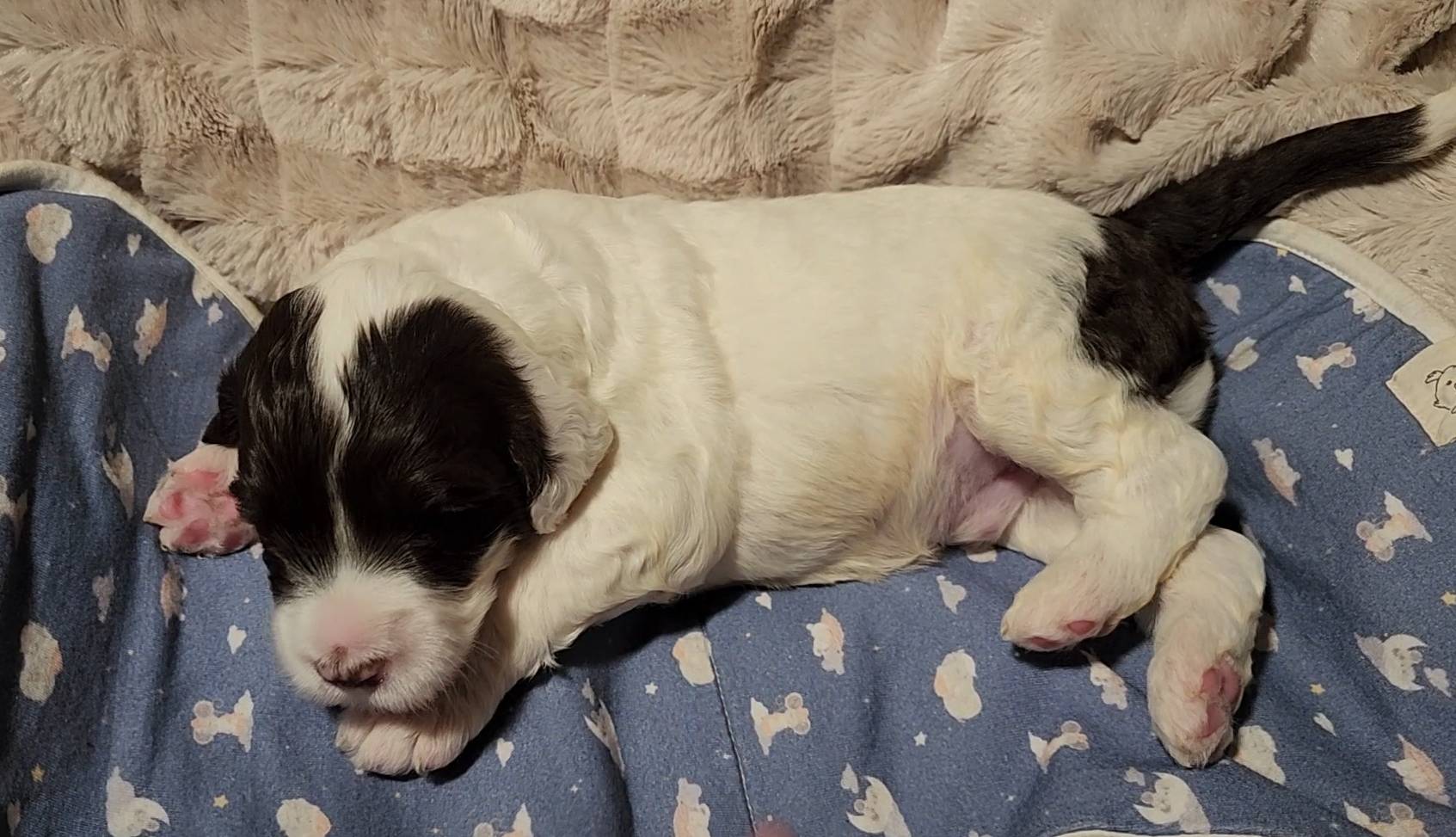 Born on 11/22, 2025, at 1:24pm, this boy is our only black parti puppy! He's a very handsome layout, in my opinion, reminds me a tuxedo with buttons so far, quite dashing (in my opinion). We're accustomed to pups being 'born in pairs,' followed by a bit more of a break, so to have him come in less than 20 minutes later was a welcome surprise - this his brother outdid him. This little boy, our only black parti coat, weighted in at 9.9oz.