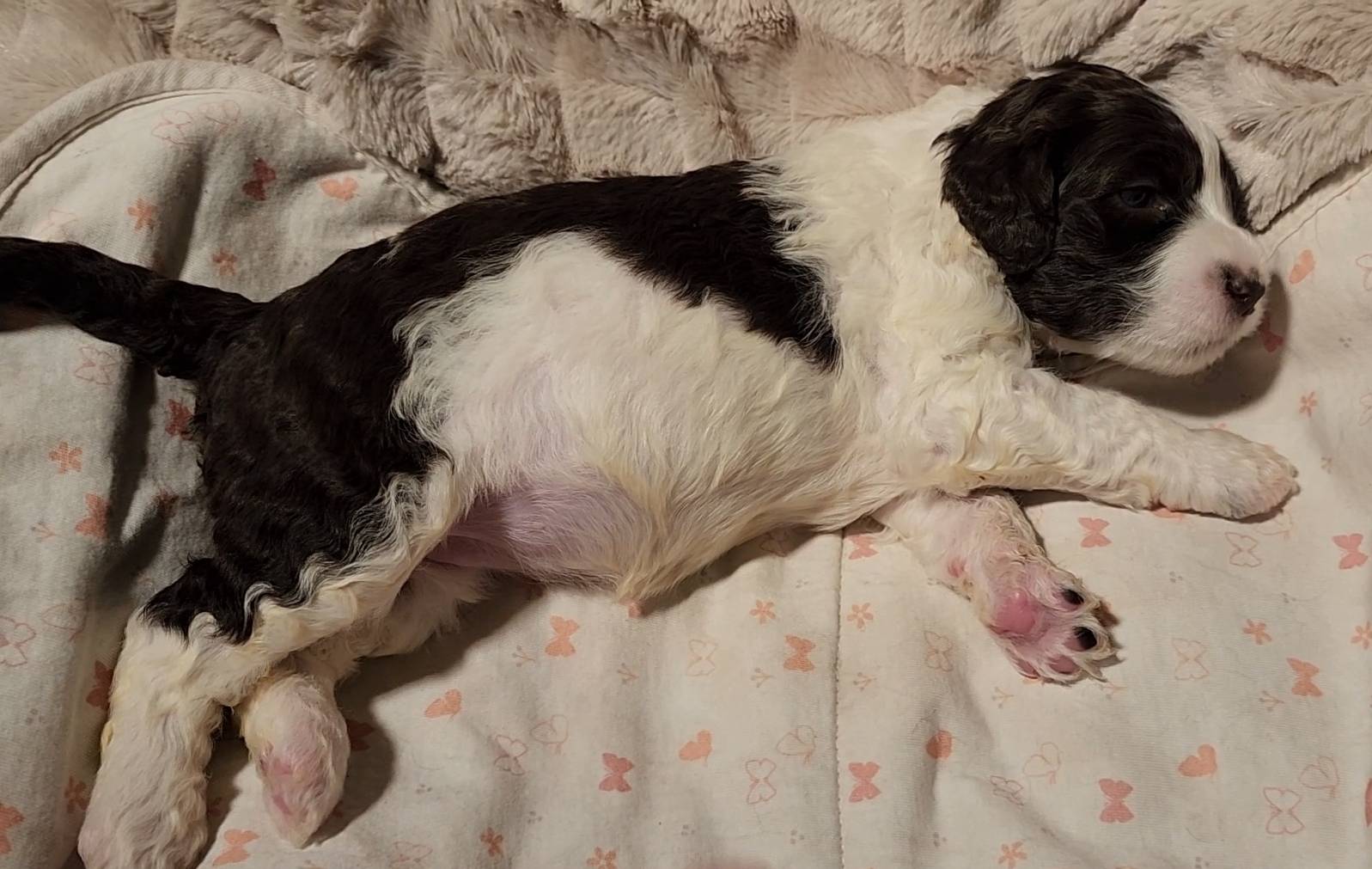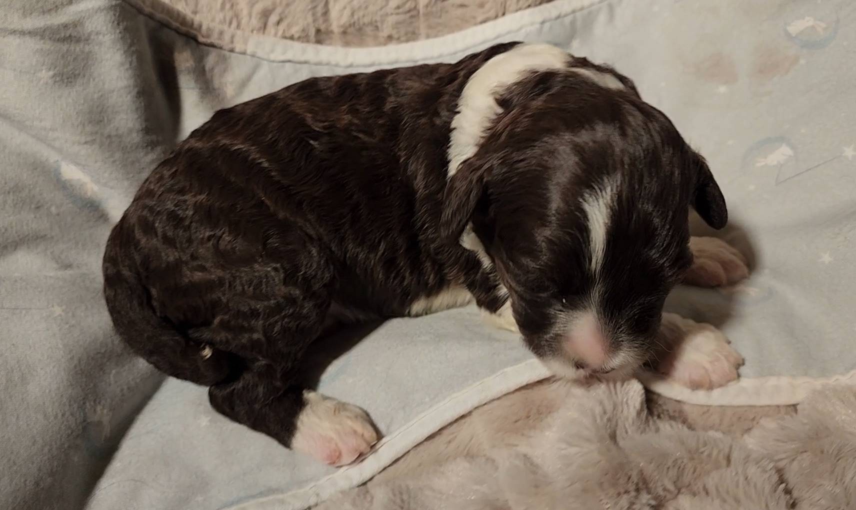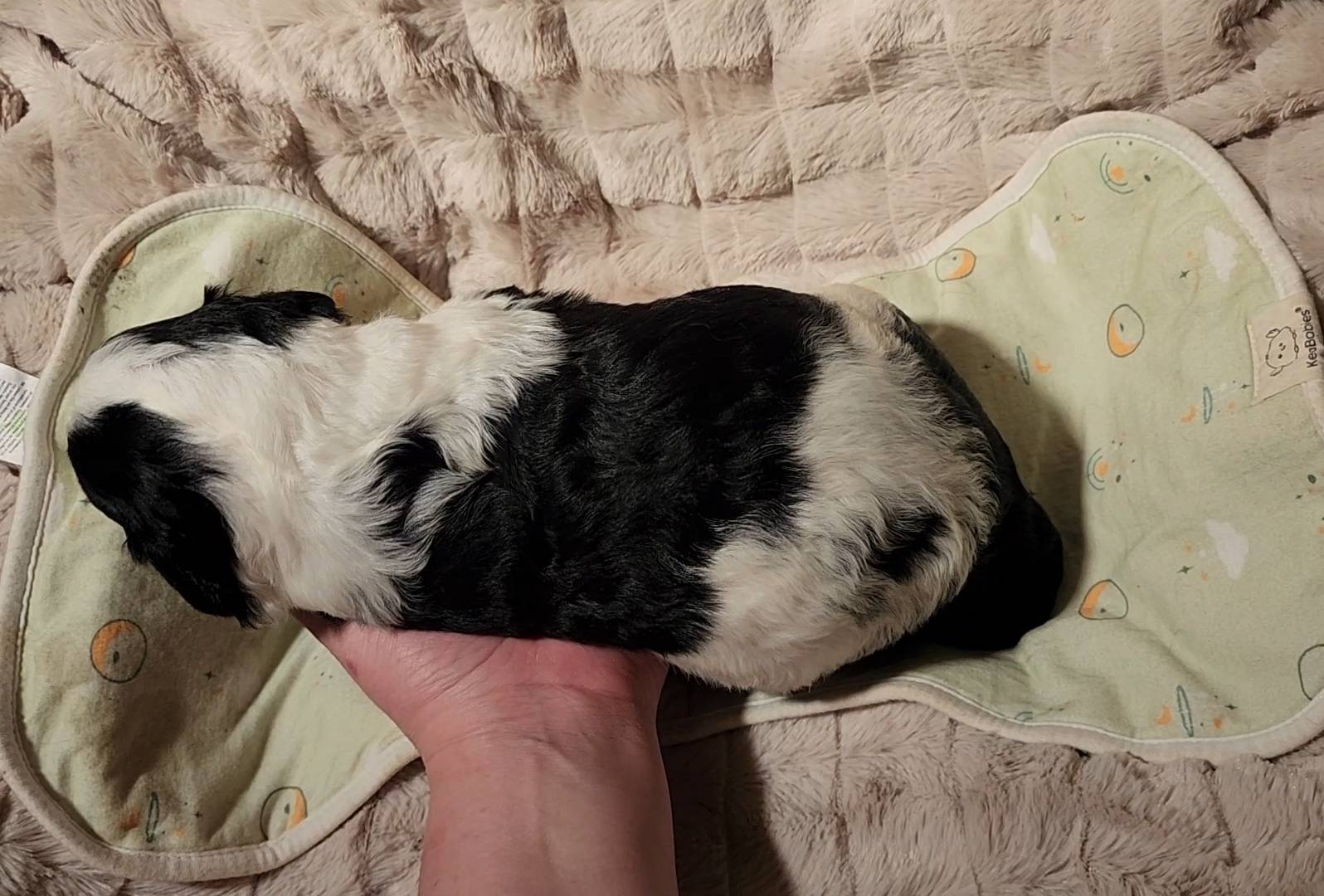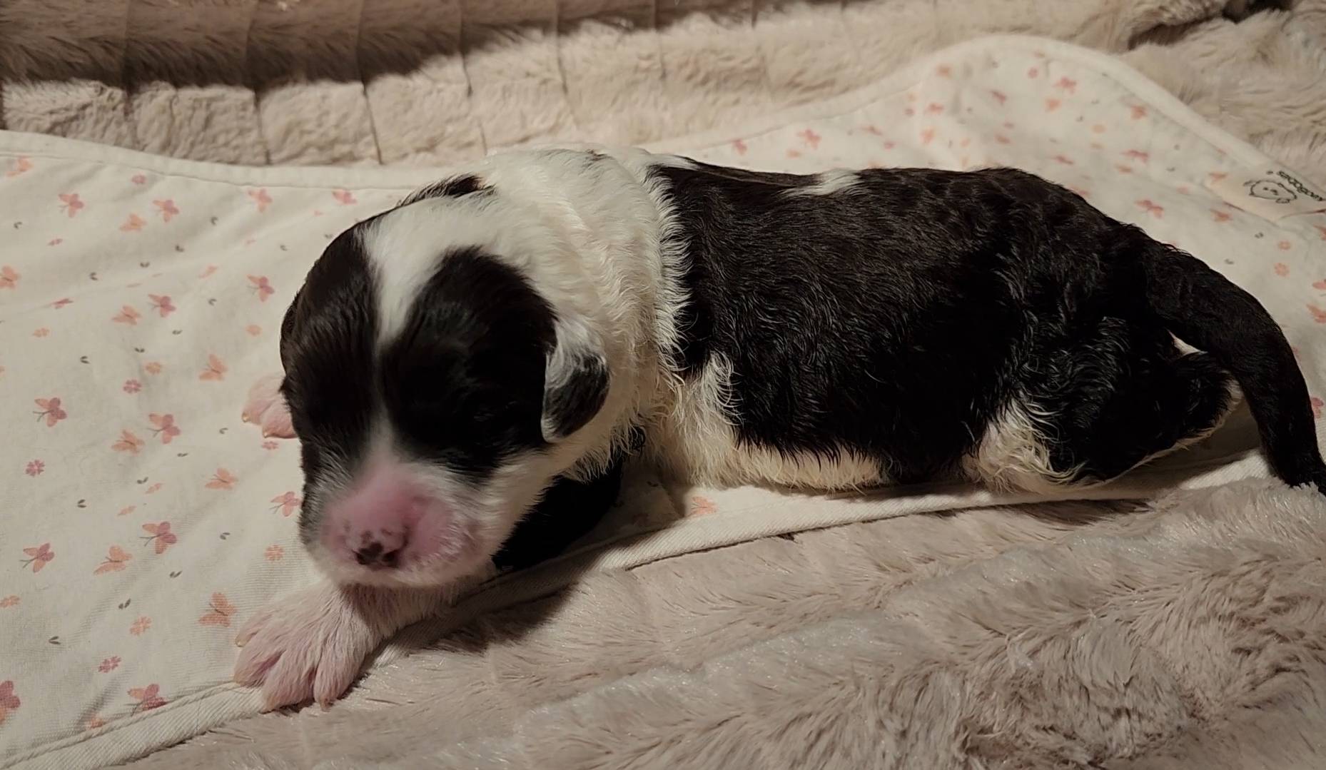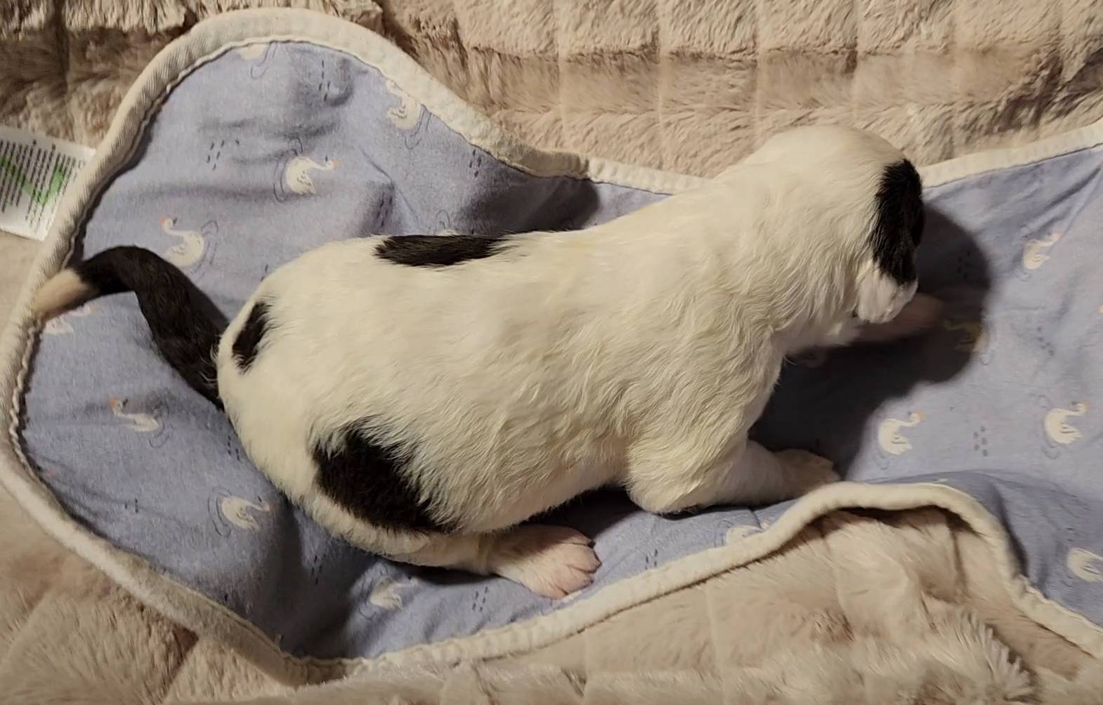 Born on 11/22, 2025, at 1:24pm, this boy is our only black parti puppy! He's a very handsome layout, in my opinion, reminds me a tuxedo with buttons so far, quite dashing (in my opinion). We're accustomed to pups being 'born in pairs,' followed by a bit more of a break, so to have him come in less than 20 minutes later was a welcome surprise - this his brother outdid him. This little boy, our only black parti coat, weighted in at 9.9oz.