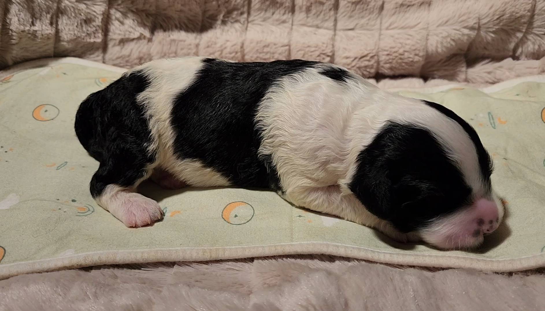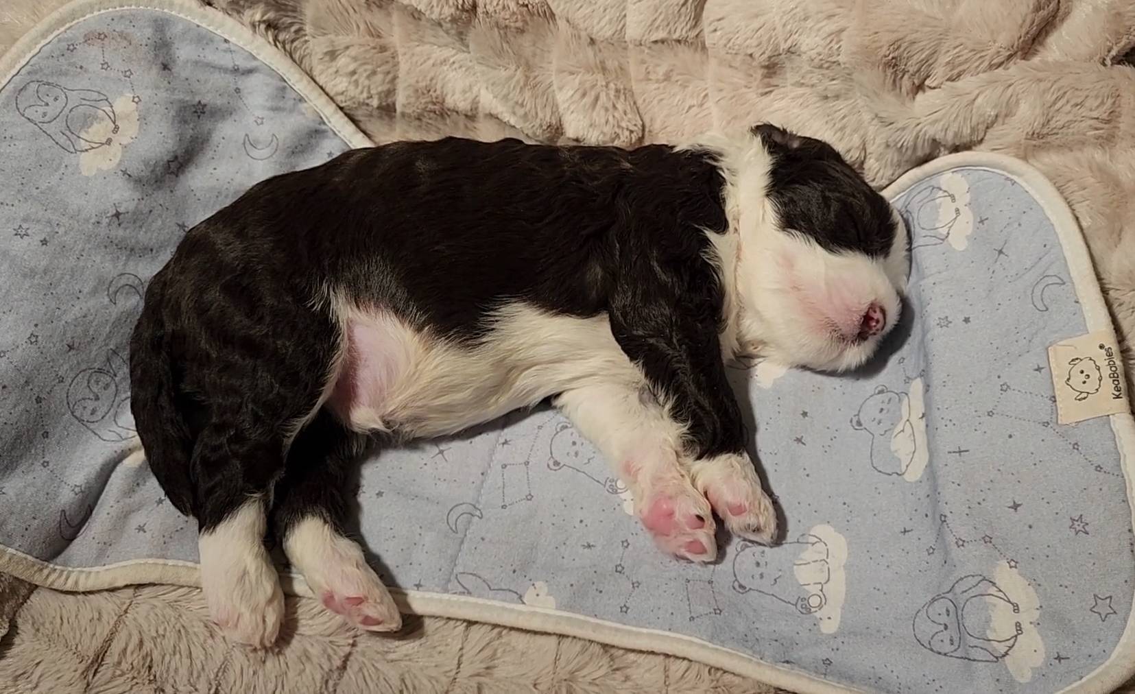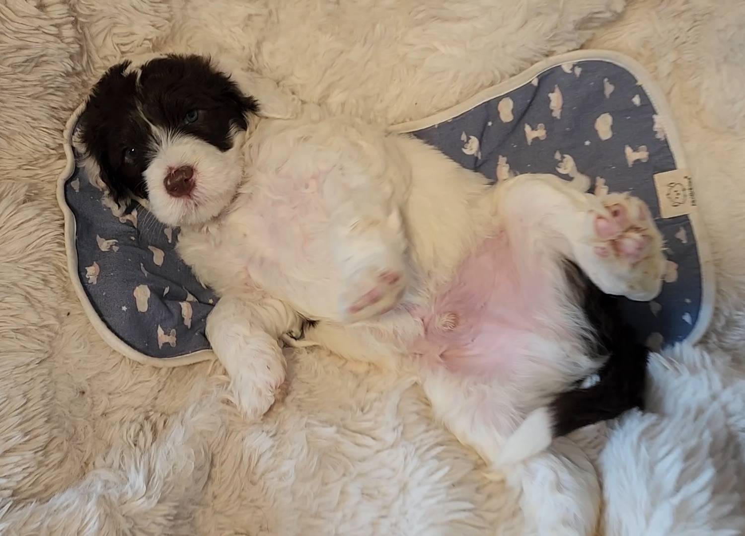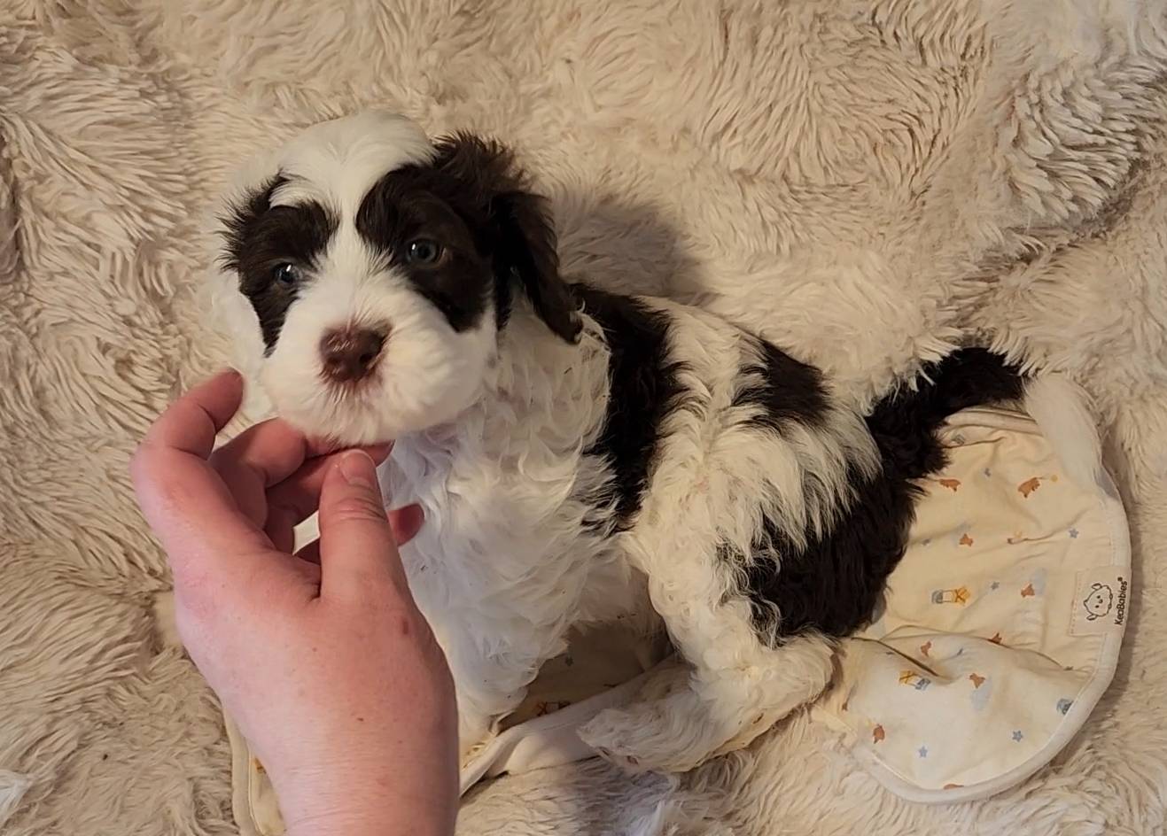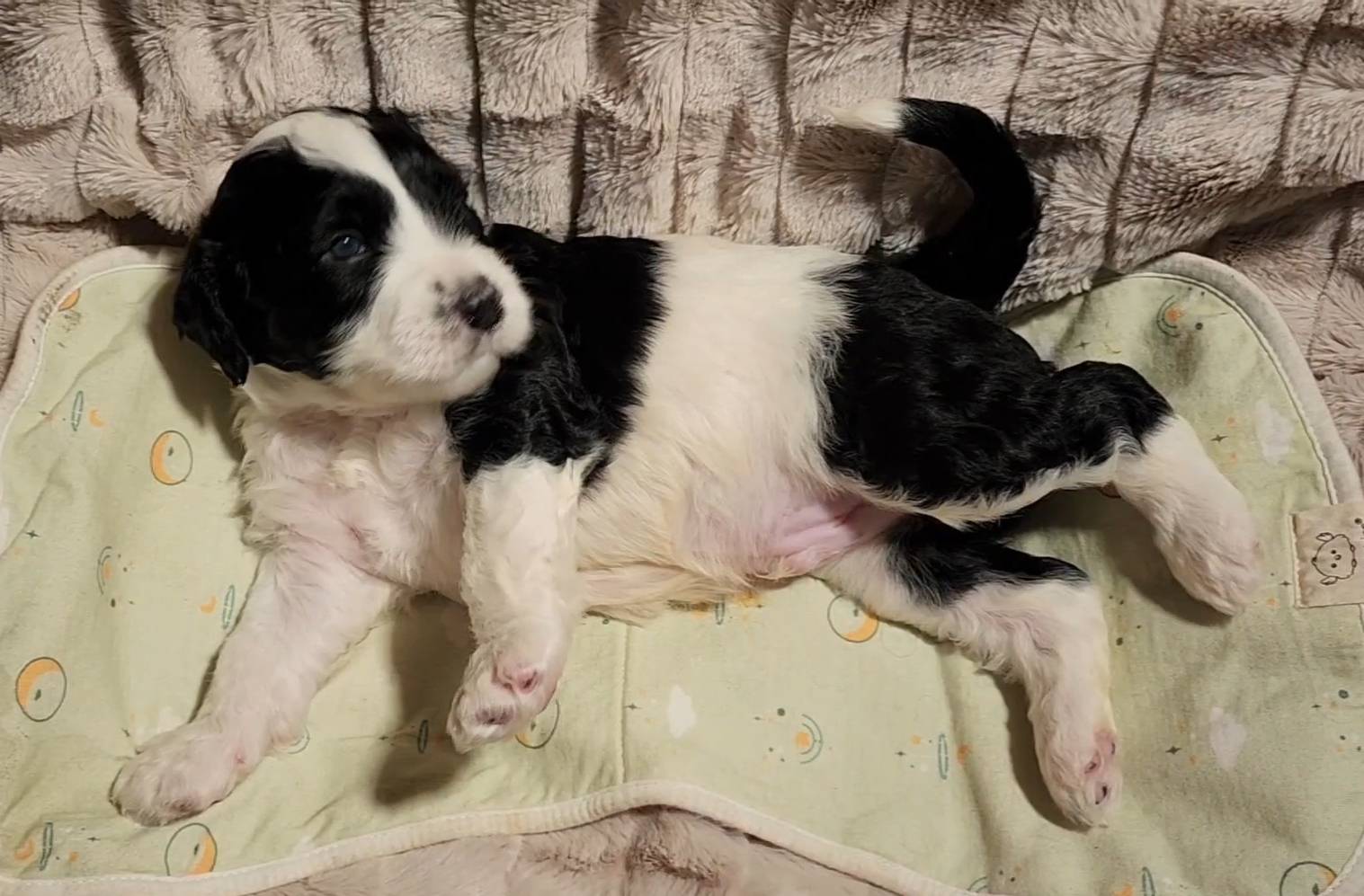 Born on 11/22, 2025, at 1:24pm, this boy is our only black parti puppy! He's a very handsome layout, in my opinion, reminds me a tuxedo with buttons so far, quite dashing (in my opinion). We're accustomed to pups being 'born in pairs,' followed by a bit more of a break, so to have him come in less than 20 minutes later was a welcome surprise - this his brother outdid him. This little boy, our only black parti coat, weighted in at 9.9oz.