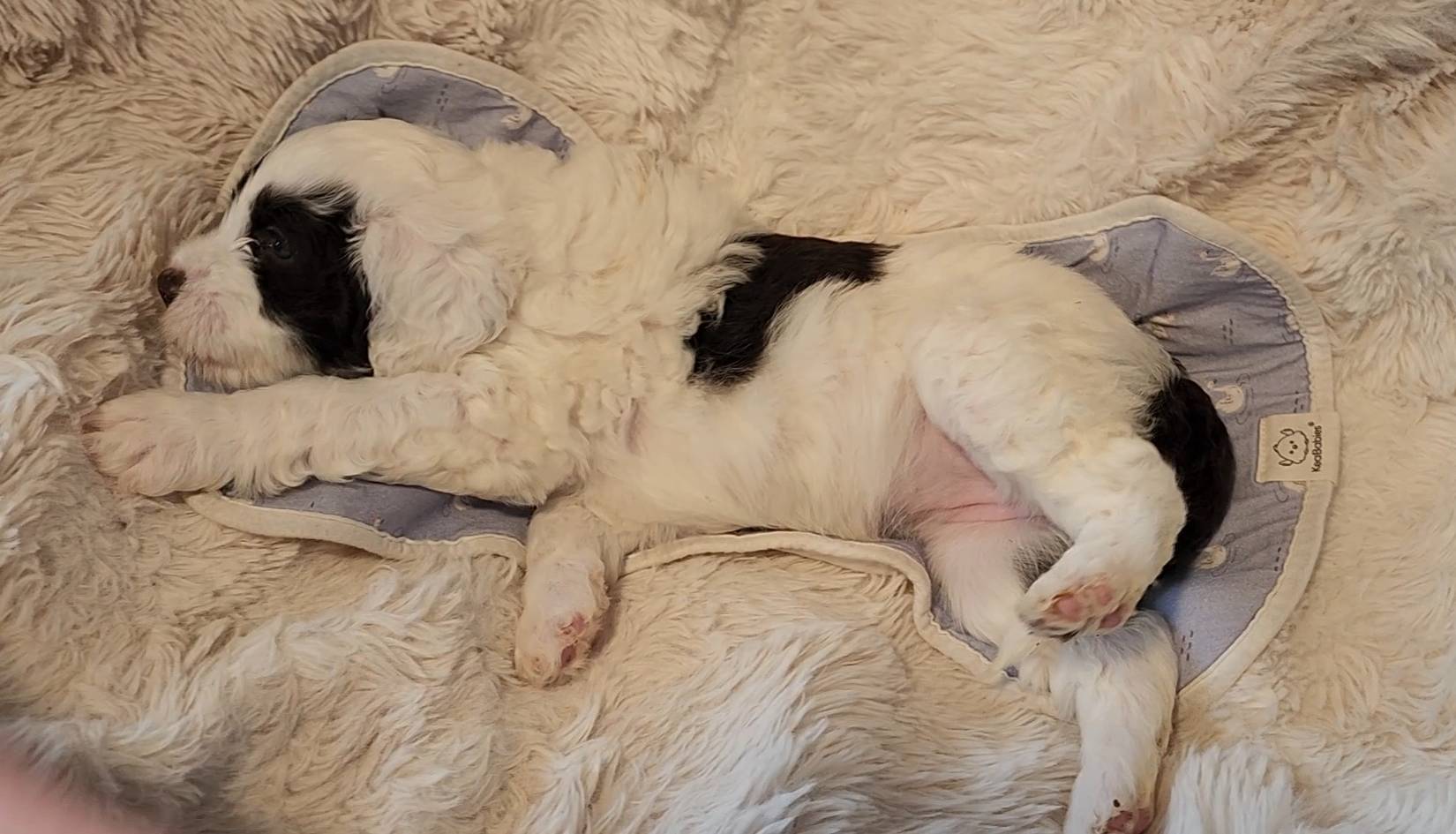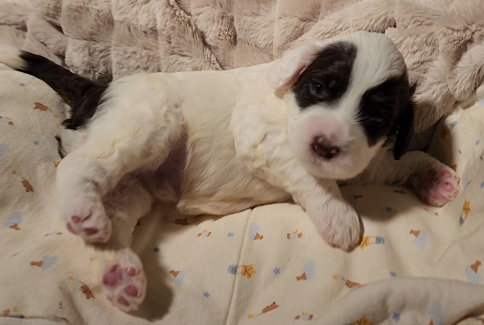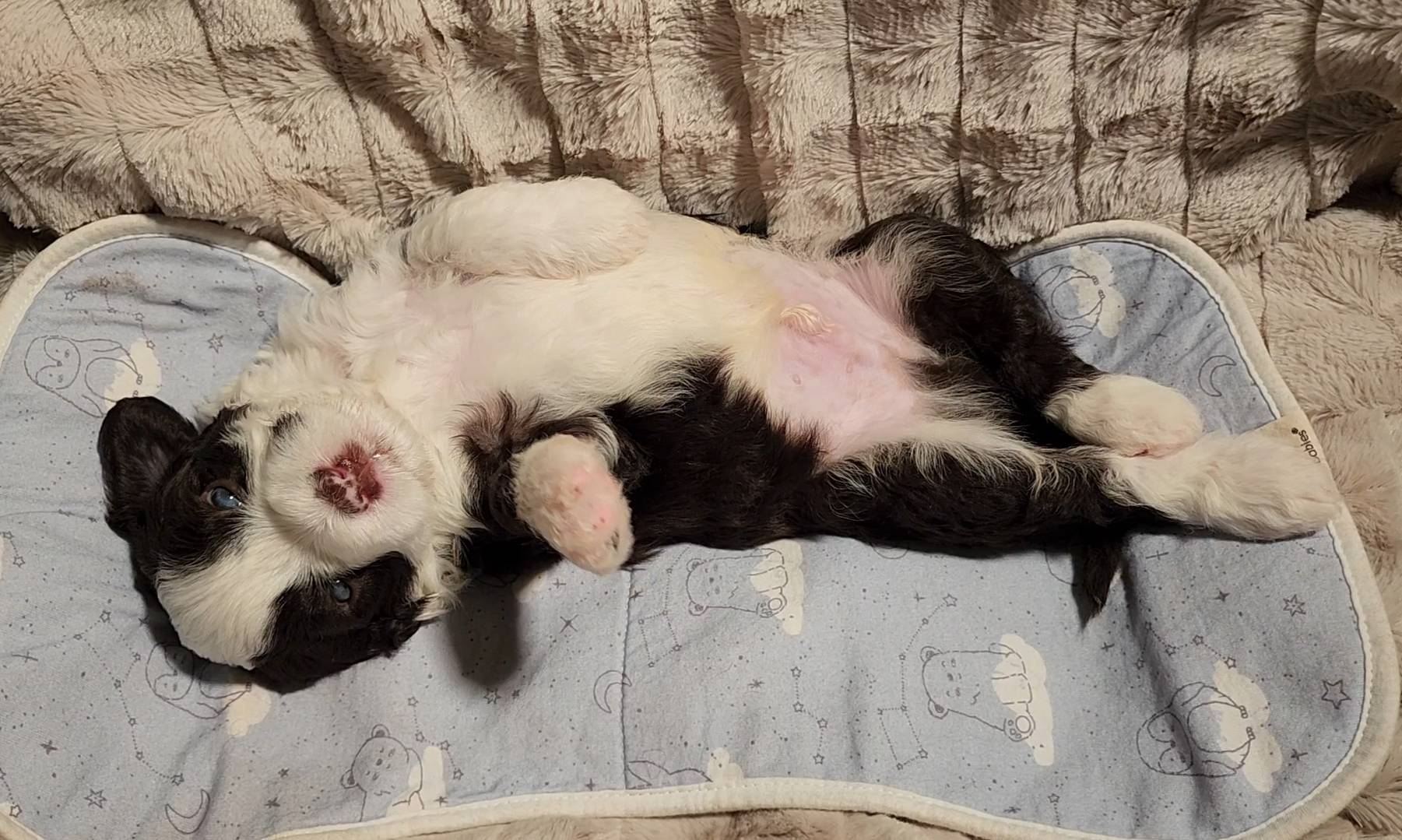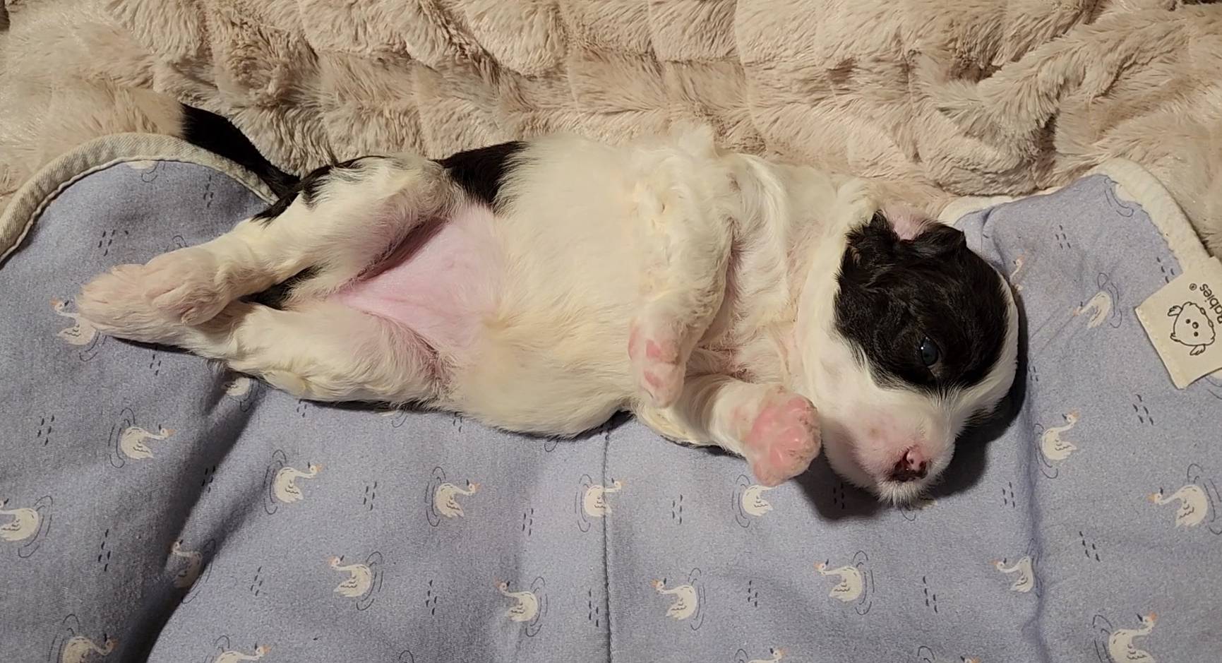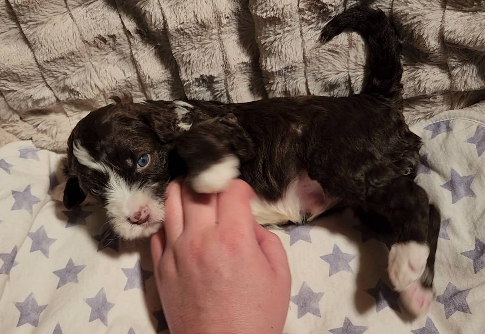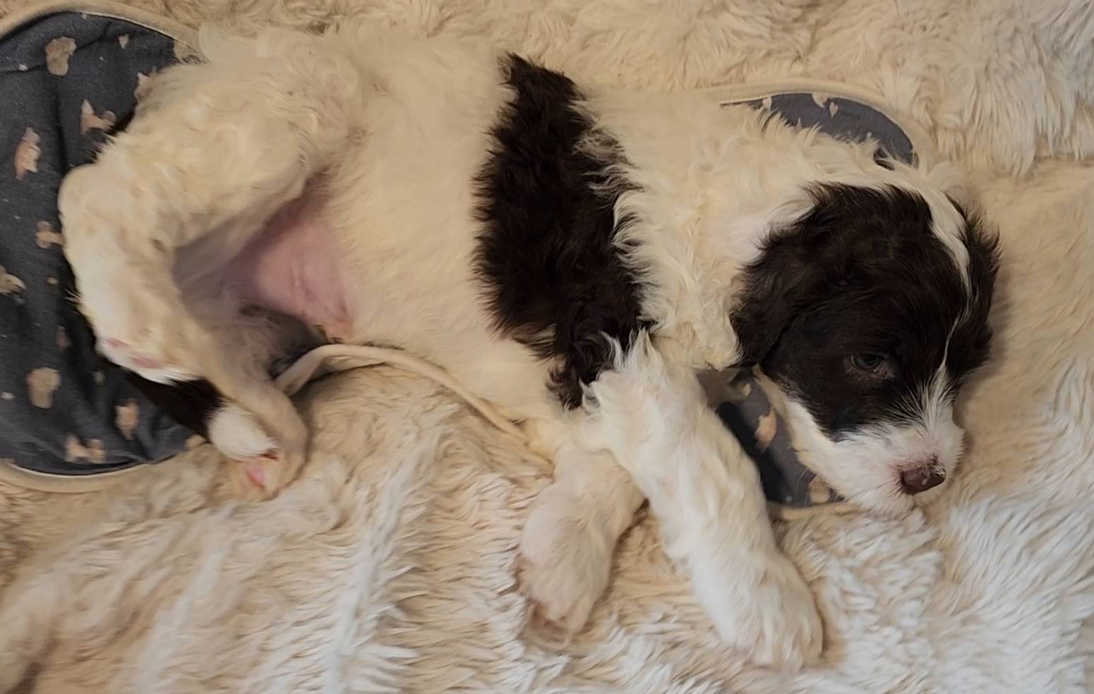 Born on 11/22, 2025, at 1:24pm, this boy is our only black parti puppy! He's a very handsome layout, in my opinion, reminds me a tuxedo with buttons so far, quite dashing (in my opinion). We're accustomed to pups being 'born in pairs,' followed by a bit more of a break, so to have him come in less than 20 minutes later was a welcome surprise - this his brother outdid him. This little boy, our only black parti coat, weighted in at 9.9oz.