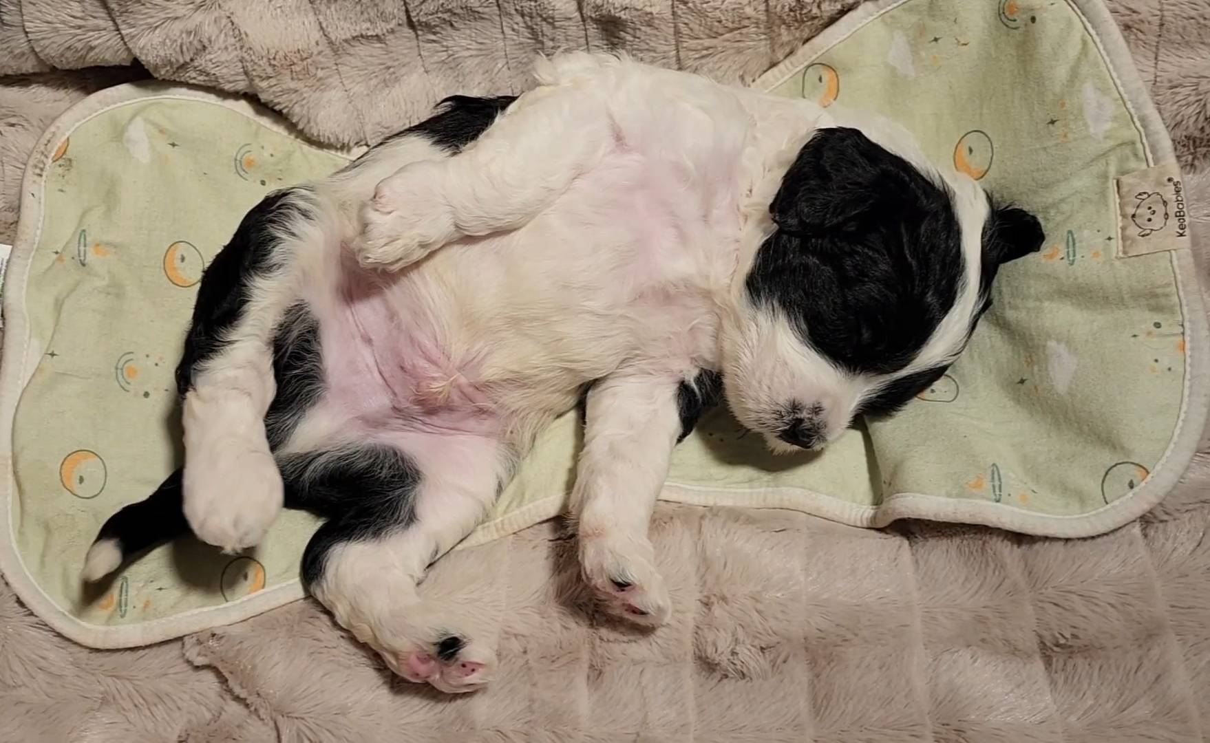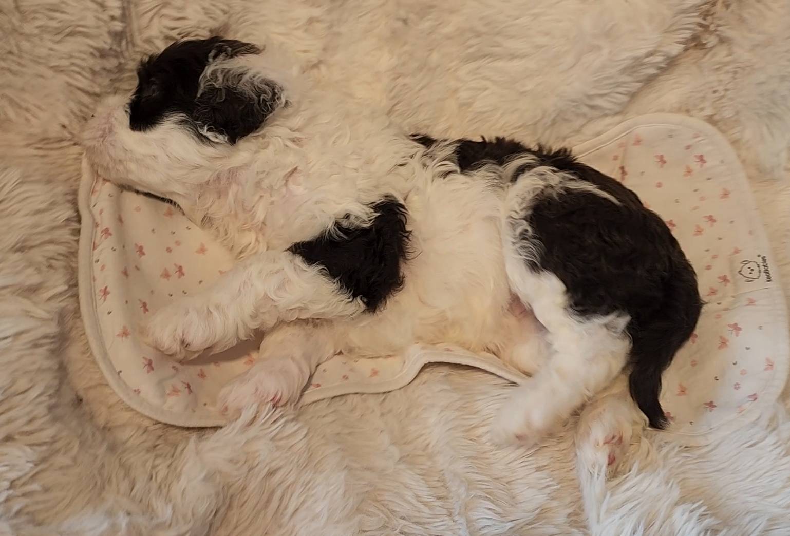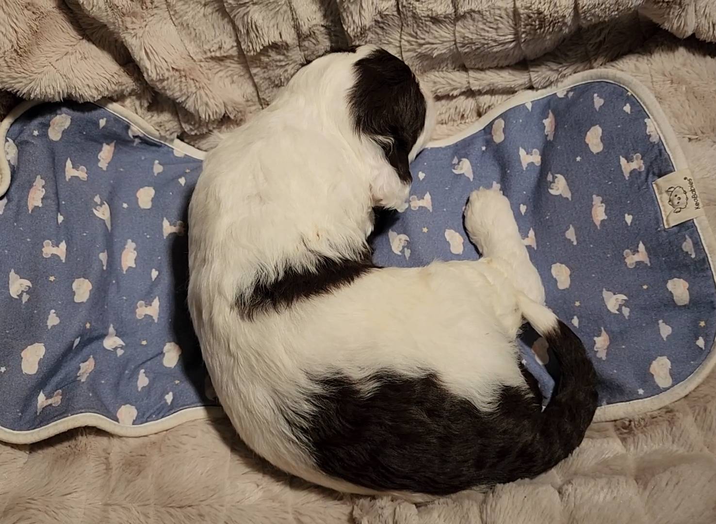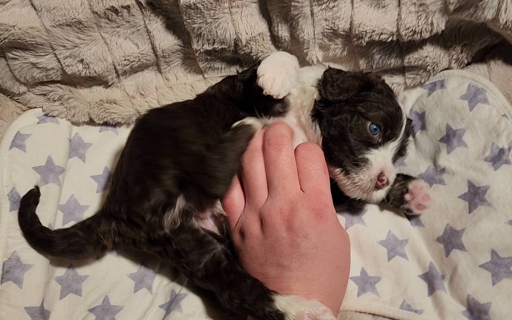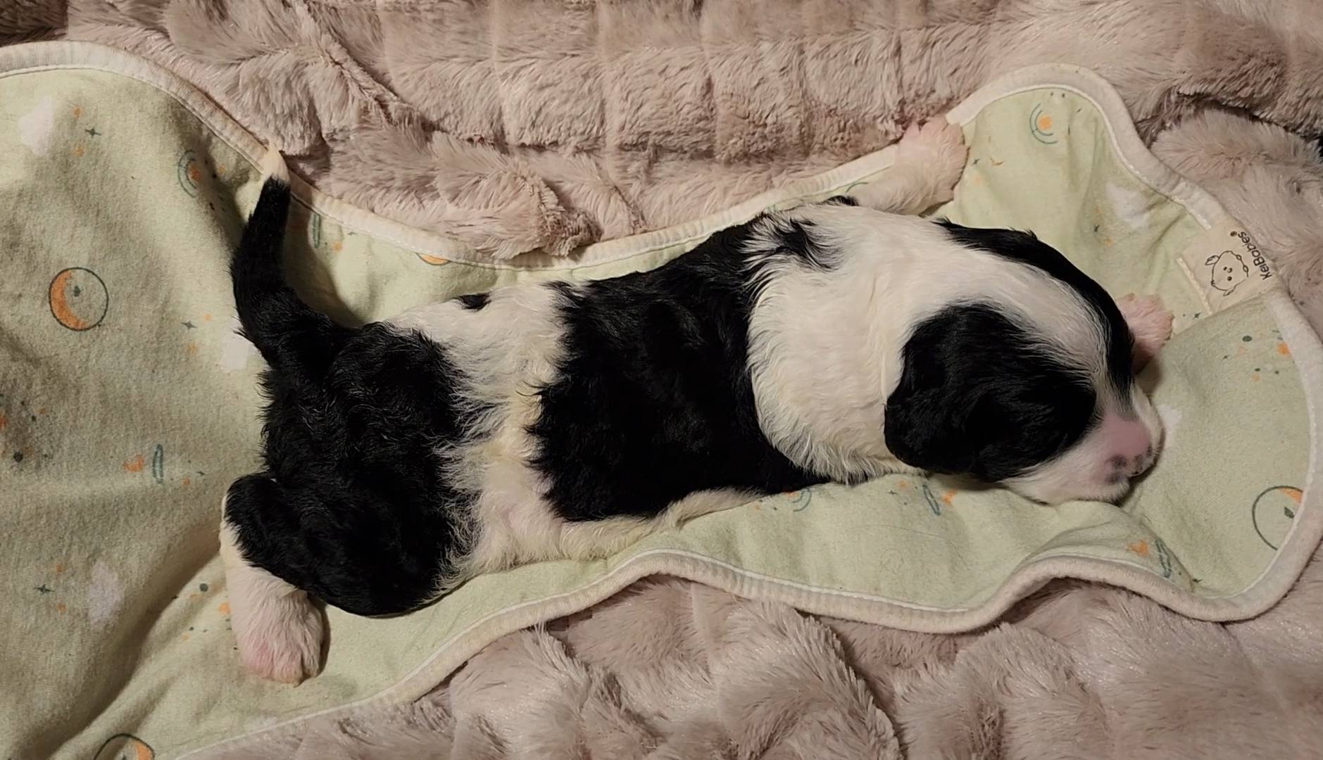 Born on 11/22, 2025, at 1:24pm, this boy is our only black parti puppy! He's a very handsome layout, in my opinion, reminds me a tuxedo with buttons so far, quite dashing (in my opinion). We're accustomed to pups being 'born in pairs,' followed by a bit more of a break, so to have him come in less than 20 minutes later was a welcome surprise - this his brother outdid him. This little boy, our only black parti coat, weighted in at 9.9oz.