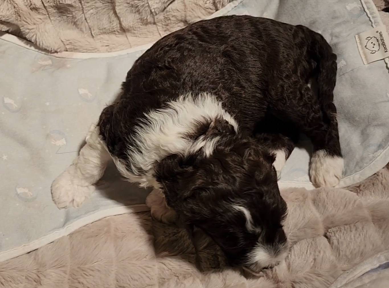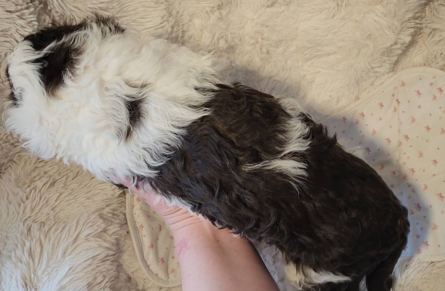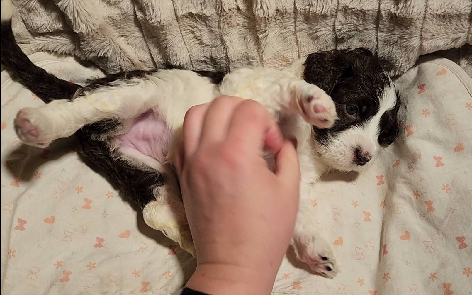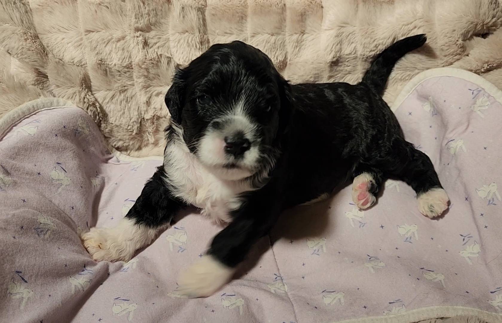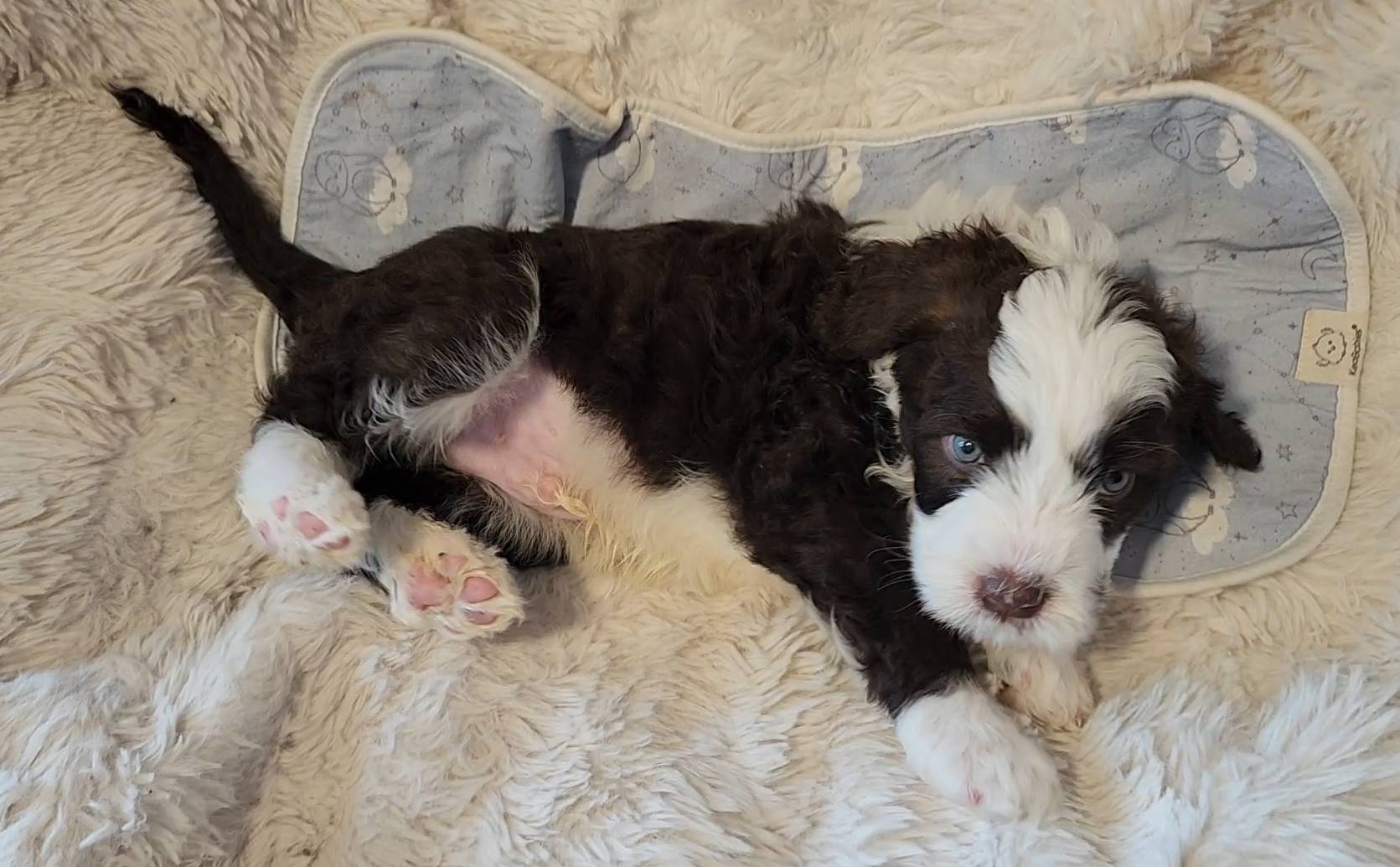 Born on 11/22, 2025, at 1:24pm, this boy is our only black parti puppy! He's a very handsome layout, in my opinion, reminds me a tuxedo with buttons so far, quite dashing (in my opinion). We're accustomed to pups being 'born in pairs,' followed by a bit more of a break, so to have him come in less than 20 minutes later was a welcome surprise - this his brother outdid him. This little boy, our only black parti coat, weighted in at 9.9oz.