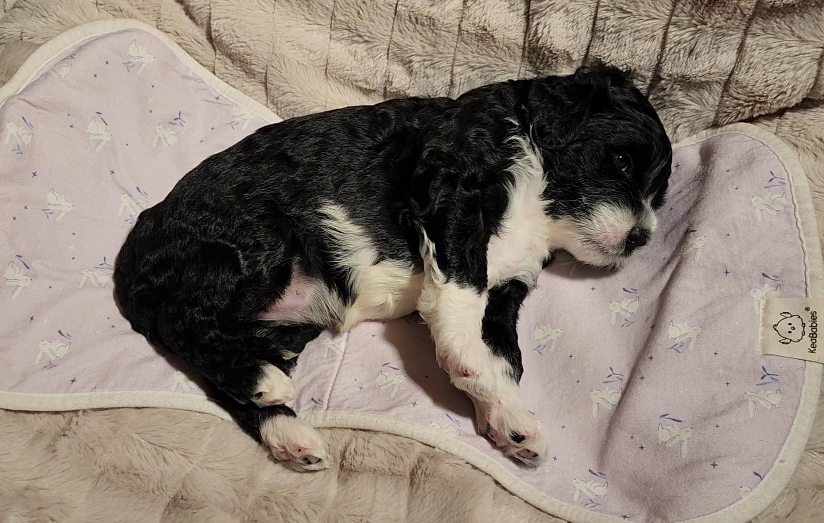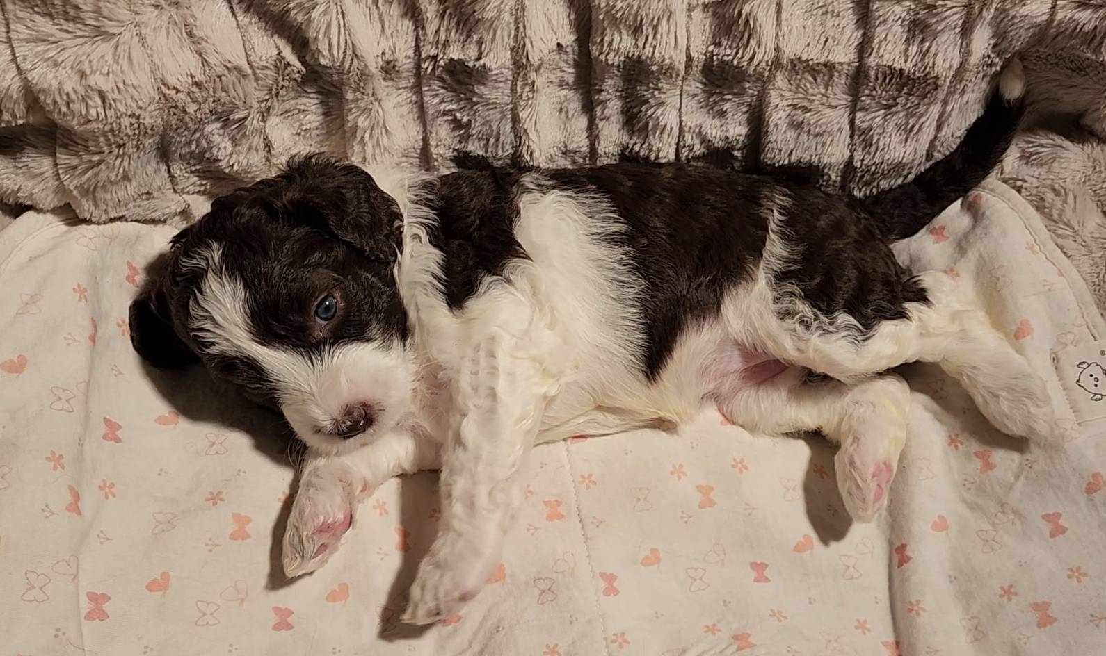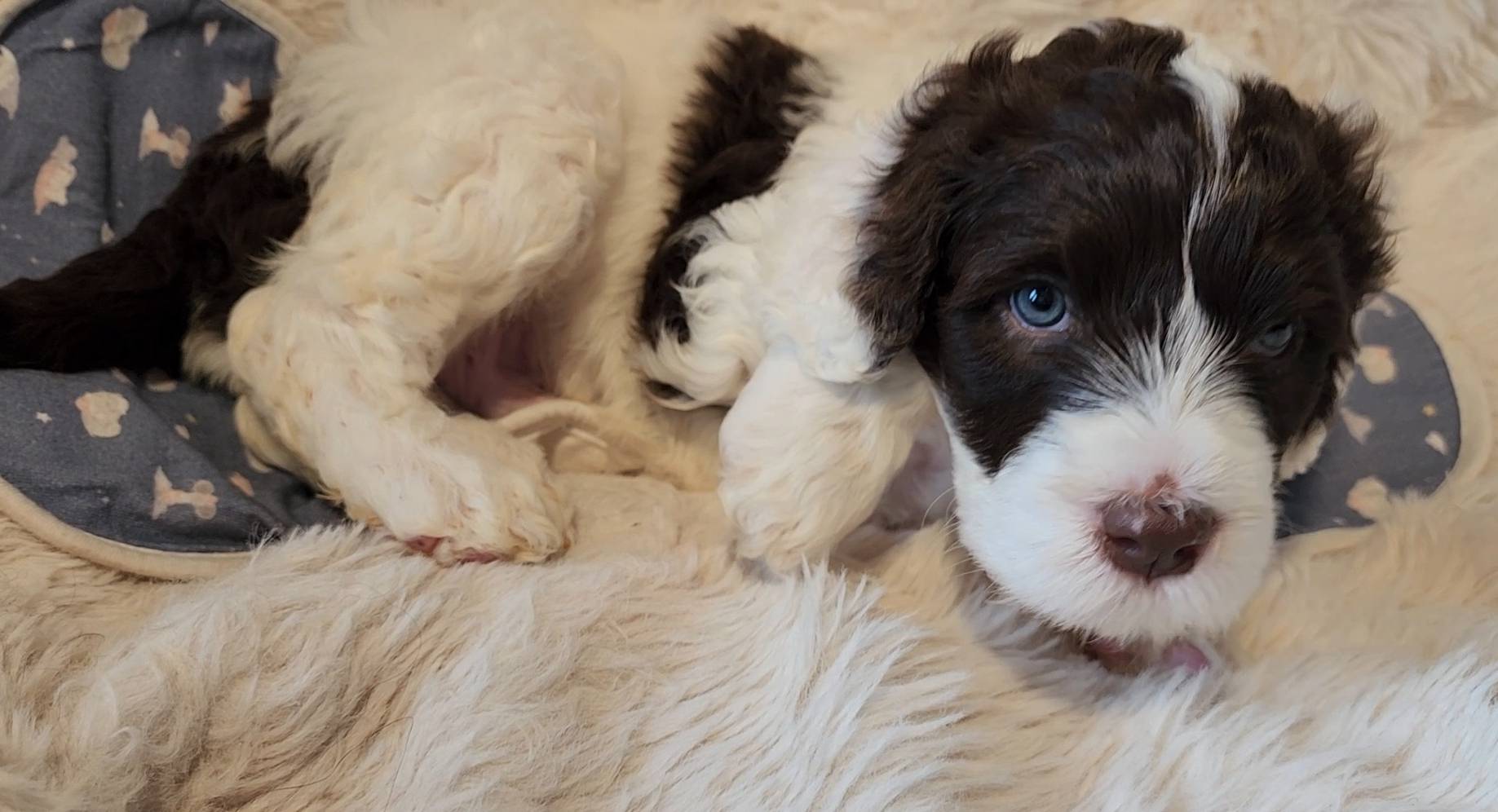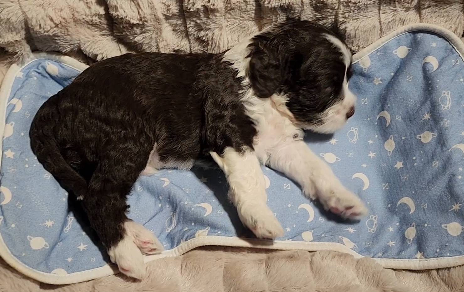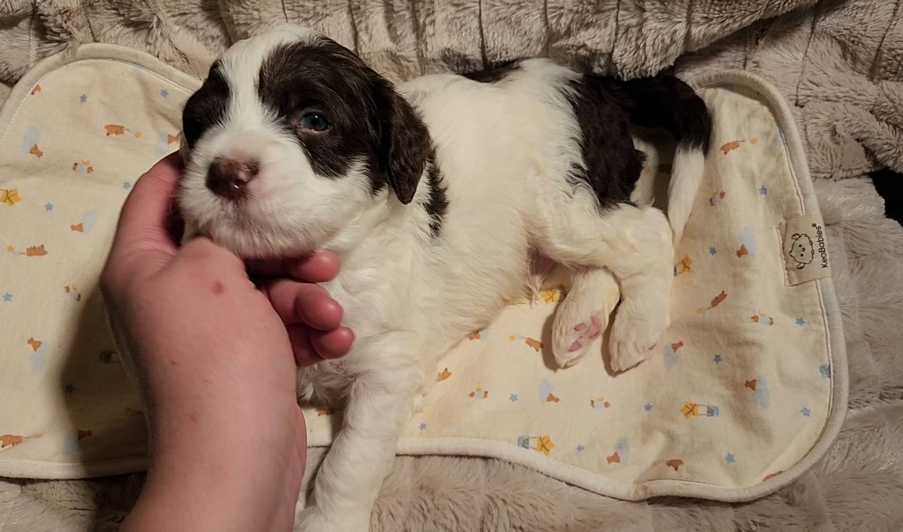 Born on 11/22, 2025, at 1:24pm, this boy is our only black parti puppy! He's a very handsome layout, in my opinion, reminds me a tuxedo with buttons so far, quite dashing (in my opinion). We're accustomed to pups being 'born in pairs,' followed by a bit more of a break, so to have him come in less than 20 minutes later was a welcome surprise - this his brother outdid him. This little boy, our only black parti coat, weighted in at 9.9oz.