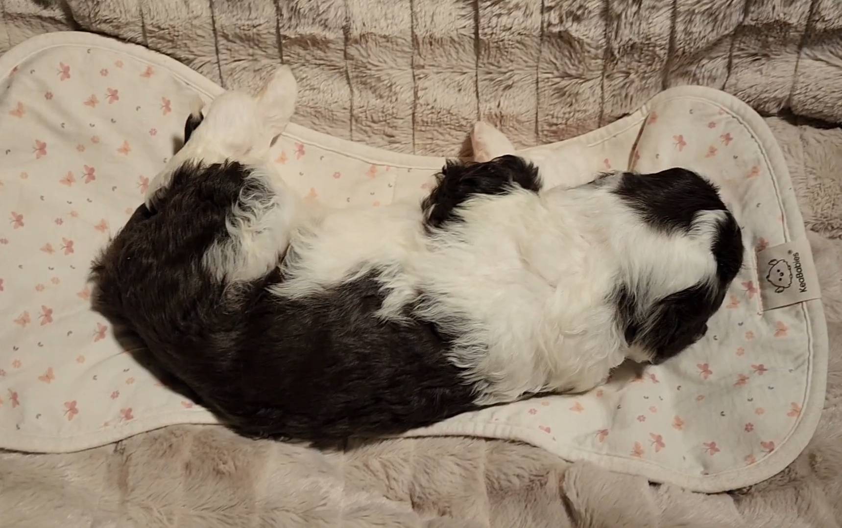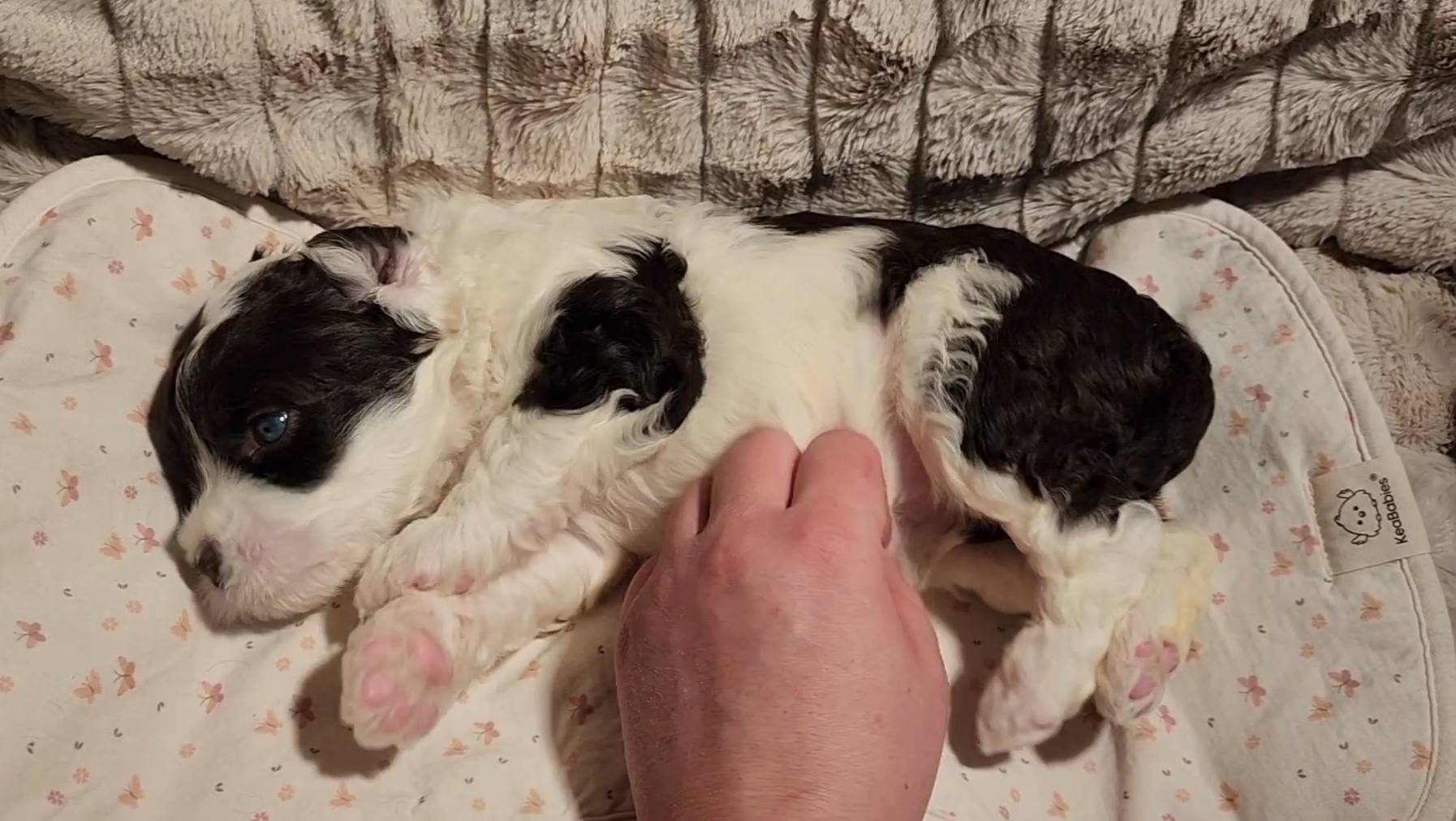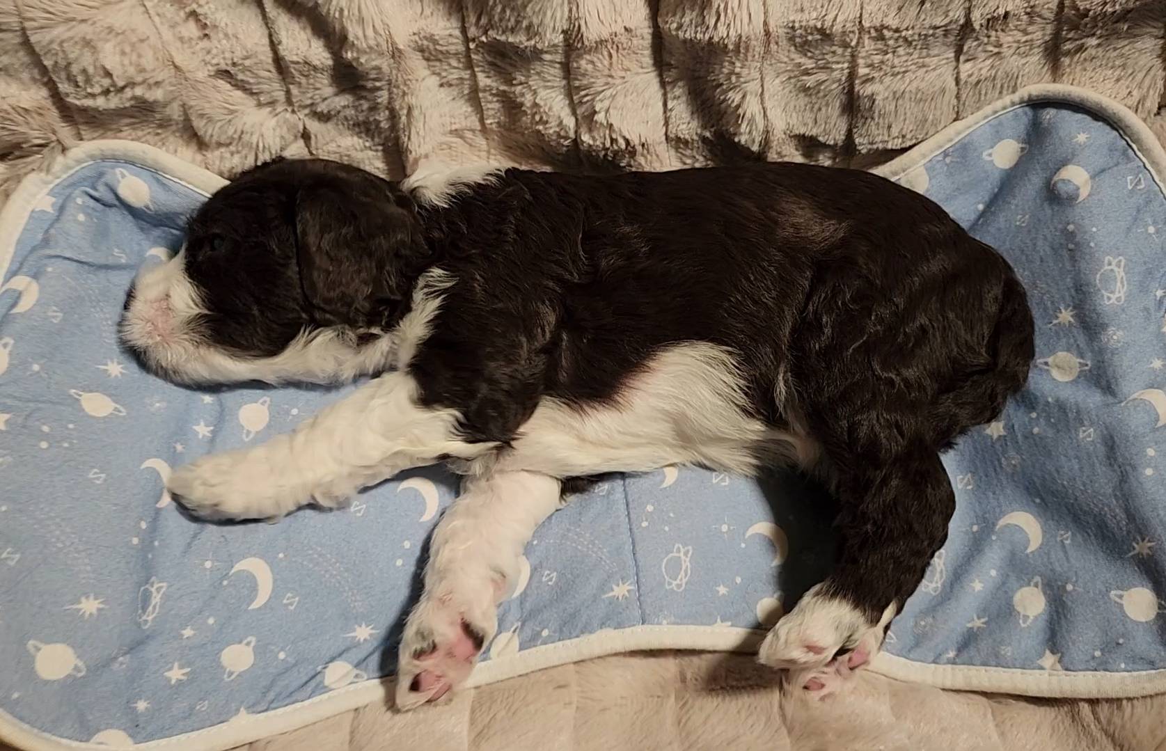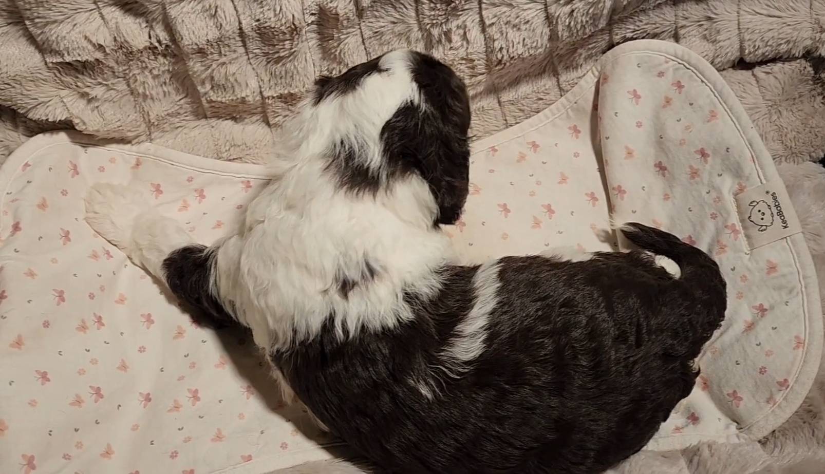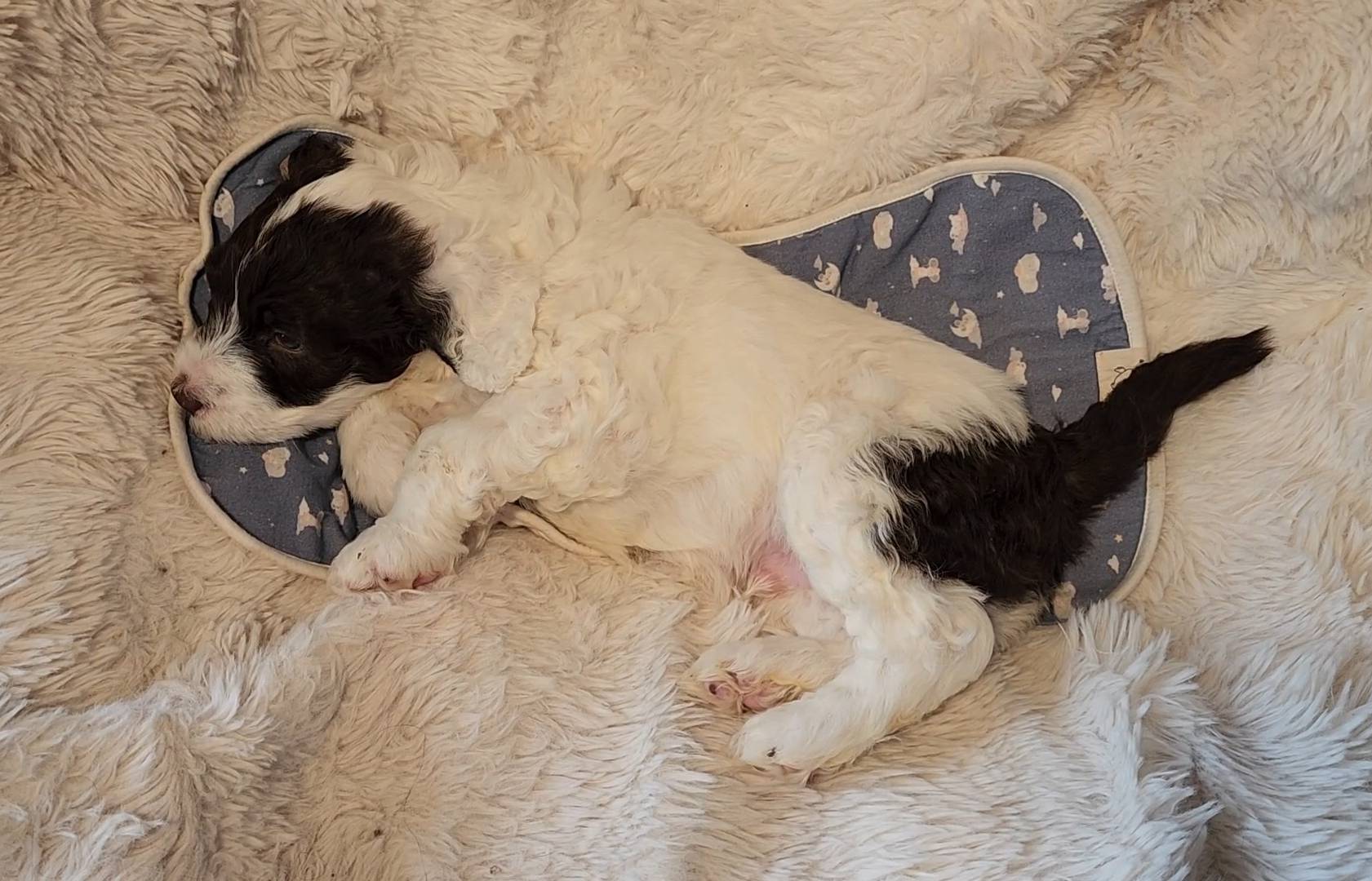 Born on 11/22, 2025, at 1:24pm, this boy is our only black parti puppy! He's a very handsome layout, in my opinion, reminds me a tuxedo with buttons so far, quite dashing (in my opinion). We're accustomed to pups being 'born in pairs,' followed by a bit more of a break, so to have him come in less than 20 minutes later was a welcome surprise - this his brother outdid him. This little boy, our only black parti coat, weighted in at 9.9oz.