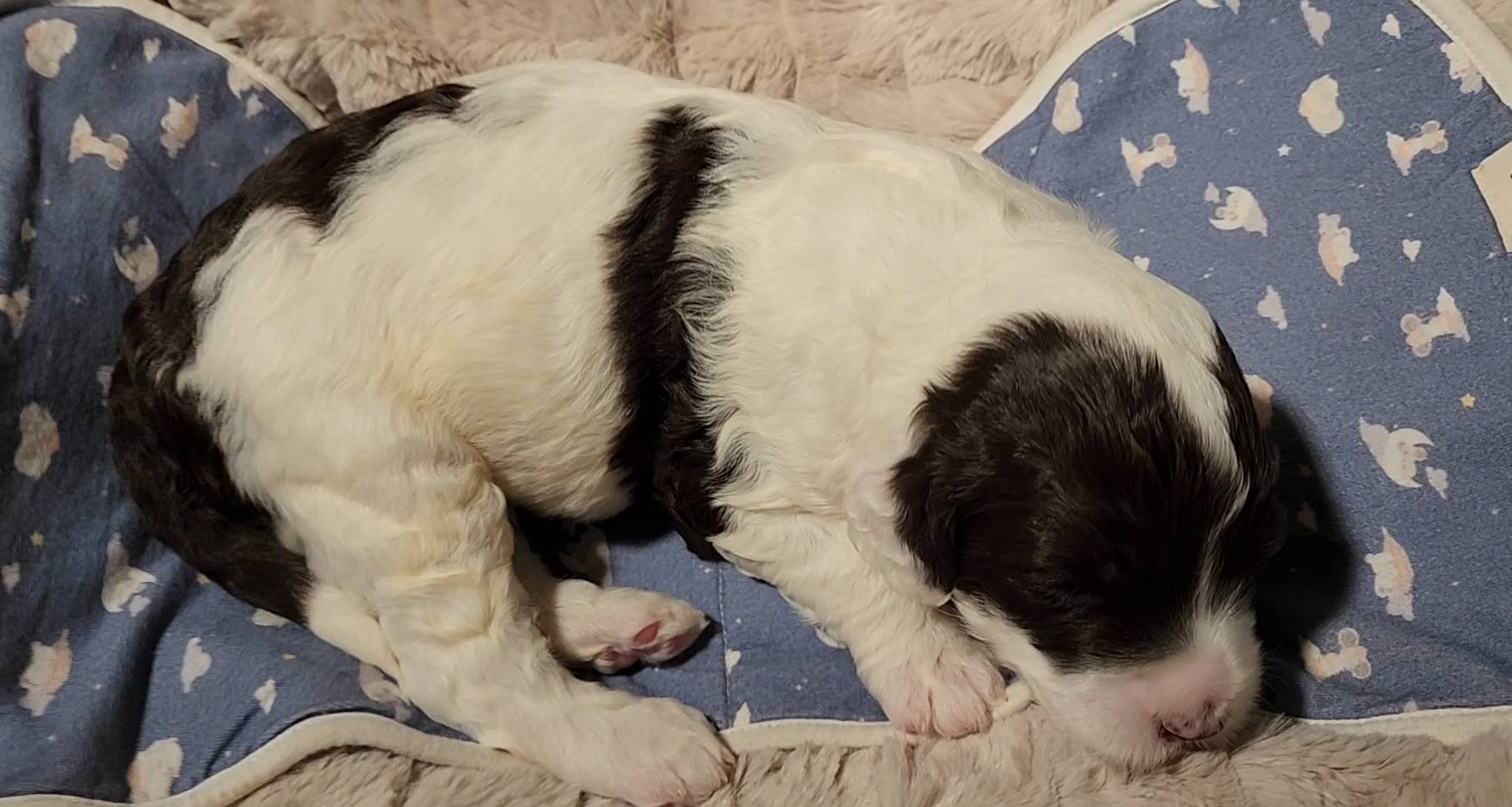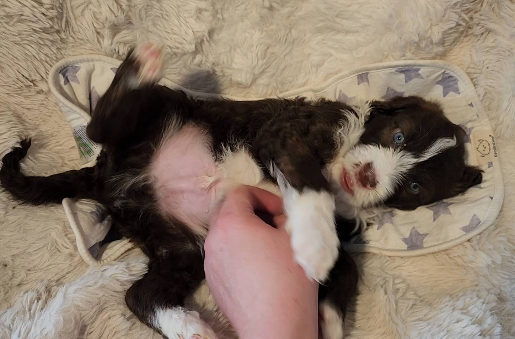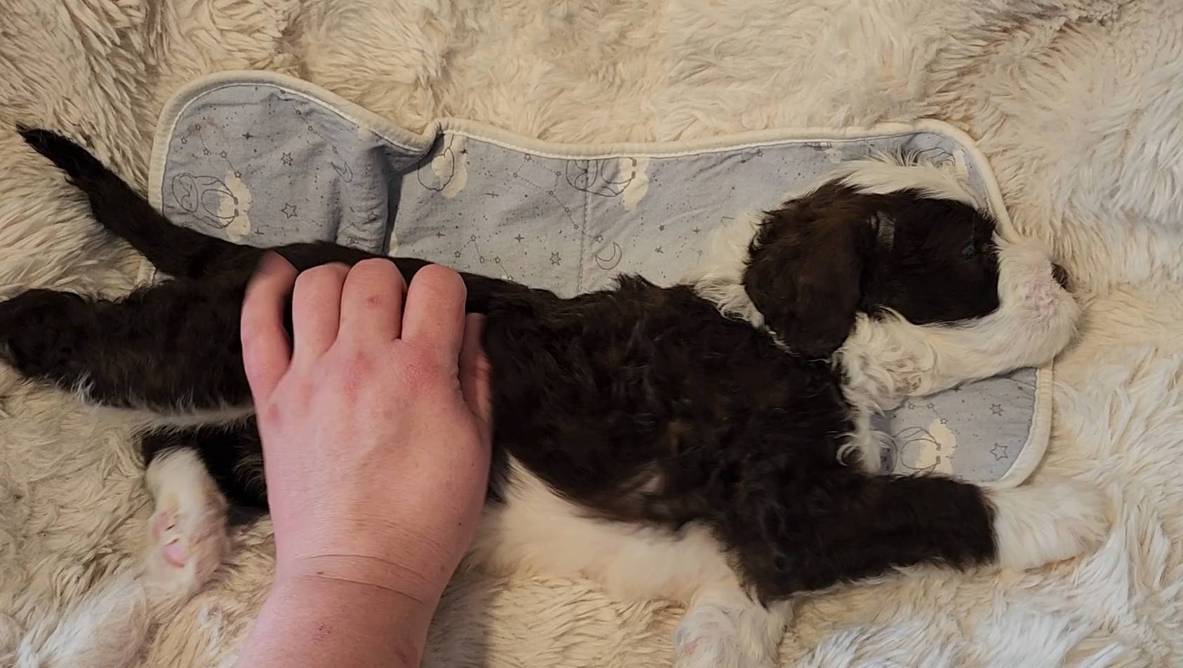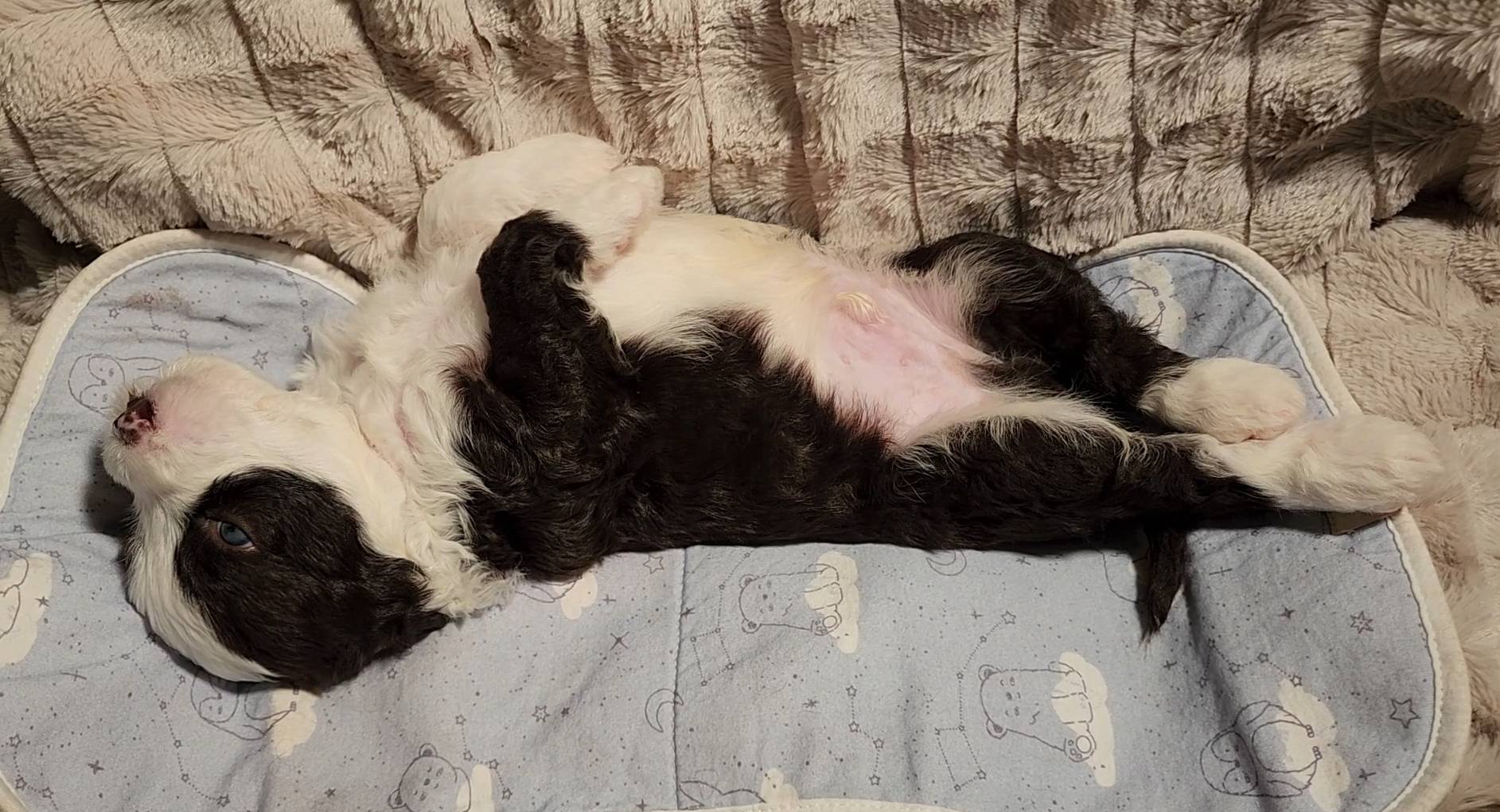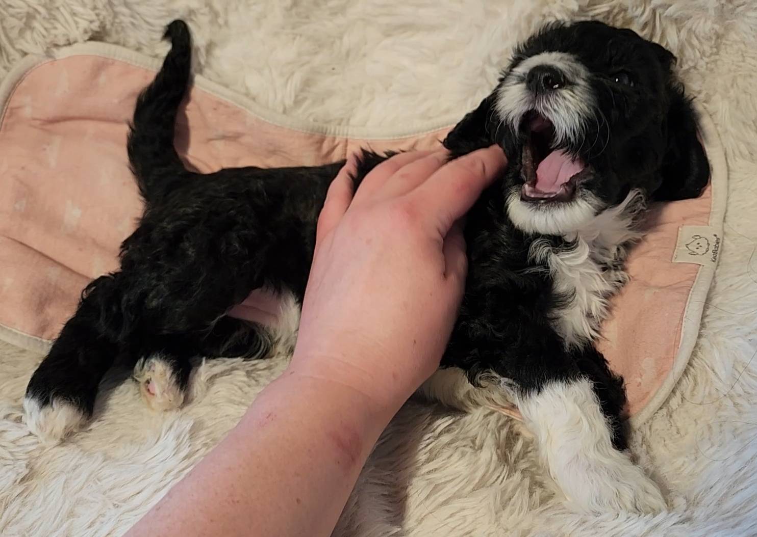Born on 11/22, 2025, at 1:24pm, this boy is our only black parti puppy! He's a very handsome layout, in my opinion, reminds me a tuxedo with buttons so far, quite dashing (in my opinion). We're accustomed to pups being 'born in pairs,' followed by a bit more of a break, so to have him come in less than 20 minutes later was a welcome surprise - this his brother outdid him. This little boy, our only black parti coat, weighted in at 9.9oz.