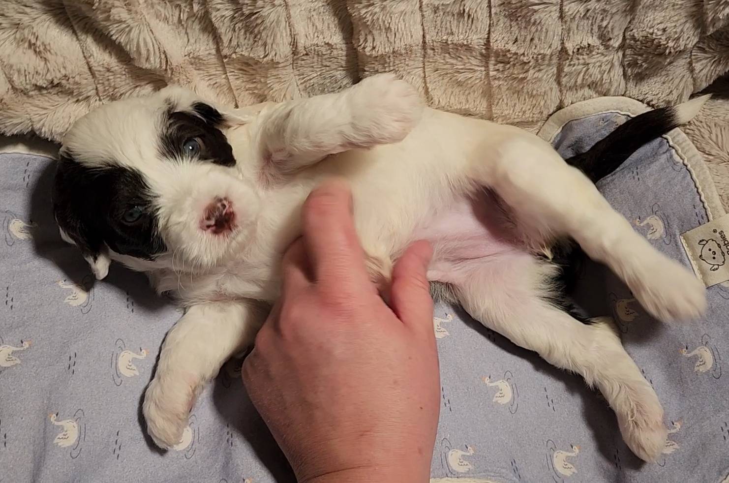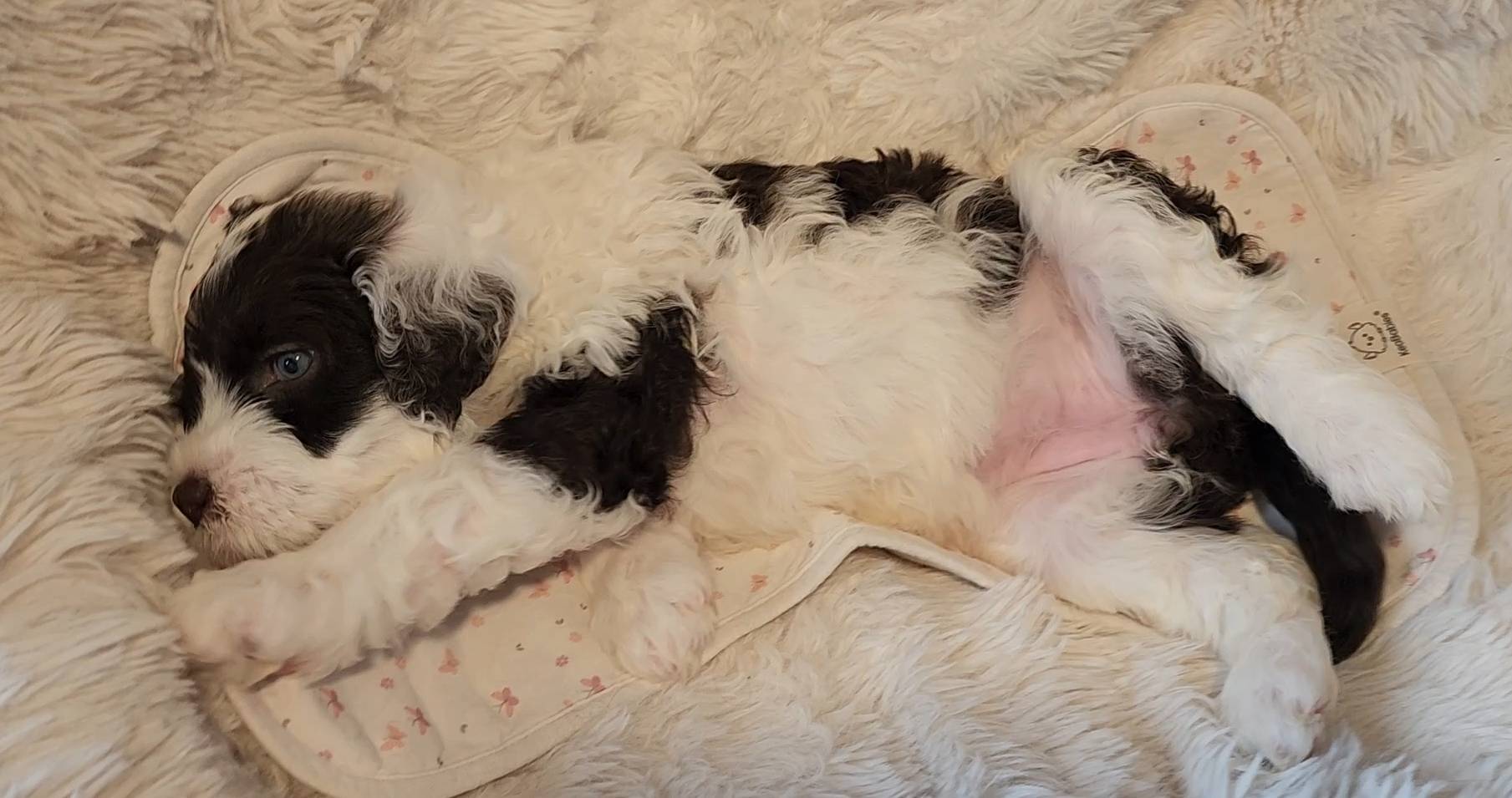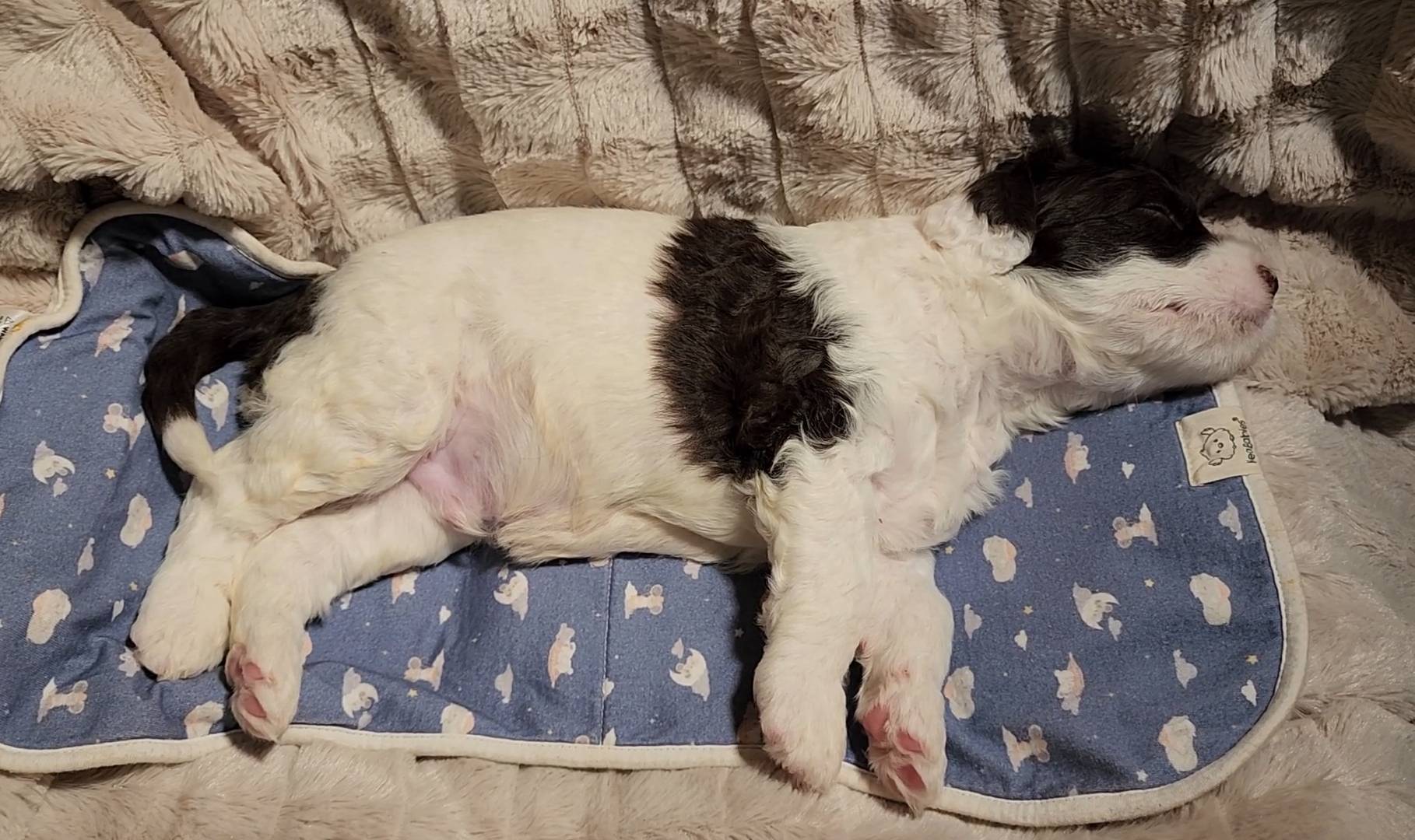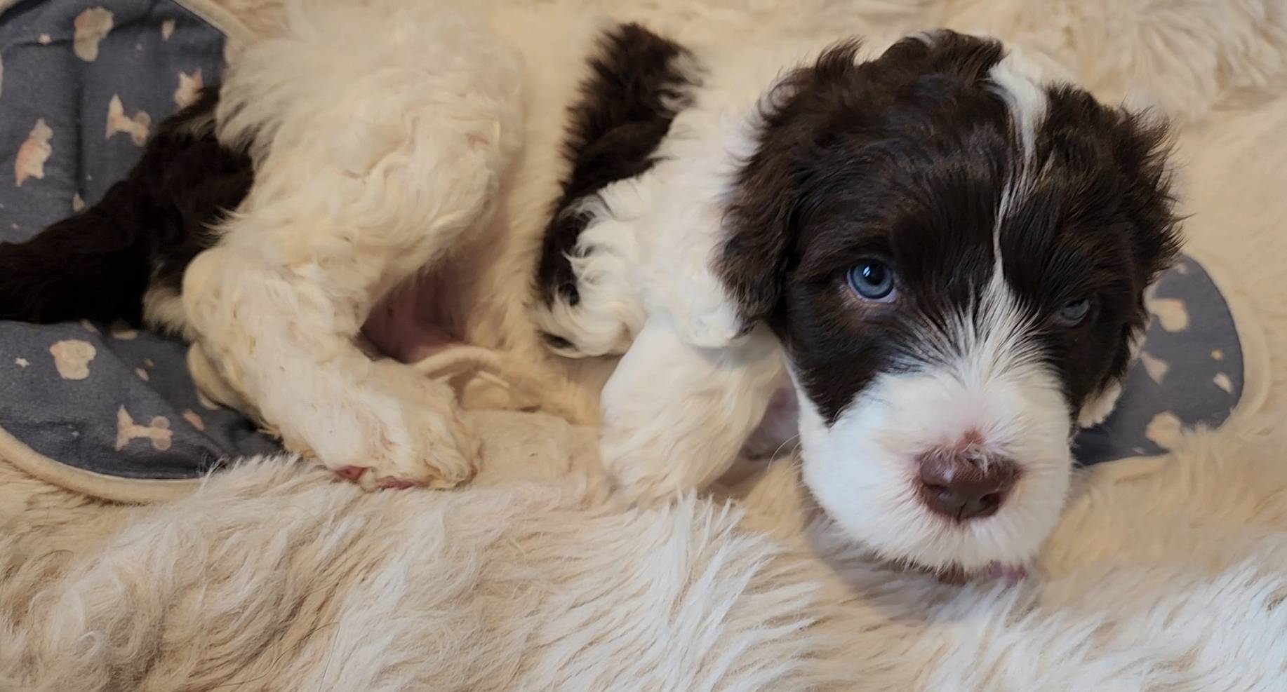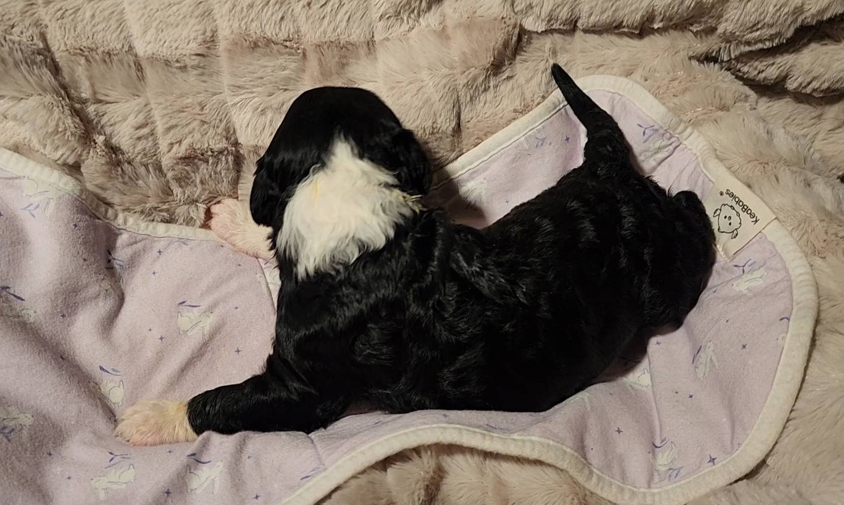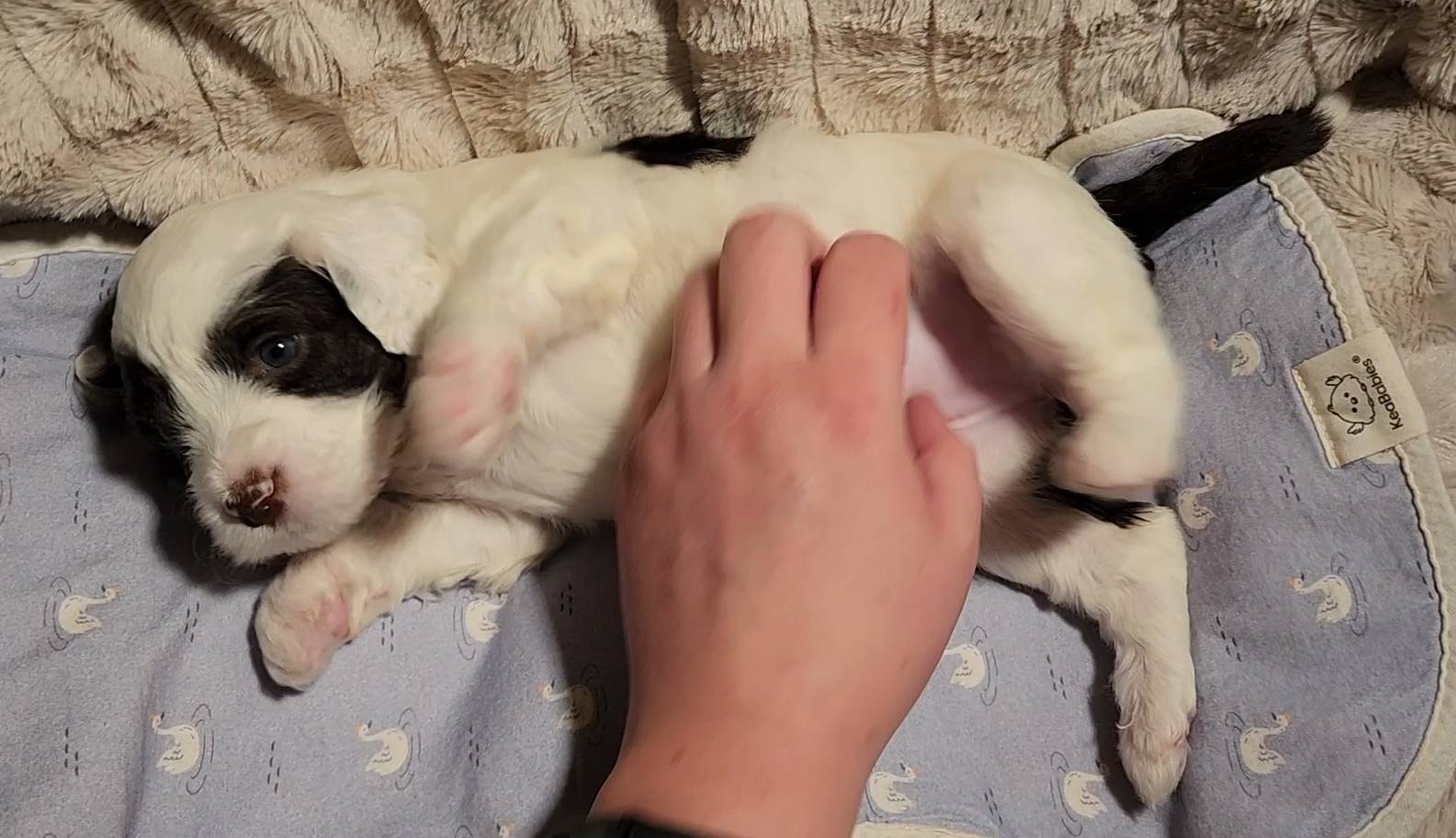 Born on 11/22, 2025, at 1:24pm, this boy is our only black parti puppy! He's a very handsome layout, in my opinion, reminds me a tuxedo with buttons so far, quite dashing (in my opinion). We're accustomed to pups being 'born in pairs,' followed by a bit more of a break, so to have him come in less than 20 minutes later was a welcome surprise - this his brother outdid him. This little boy, our only black parti coat, weighted in at 9.9oz.