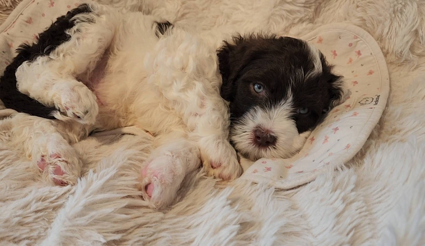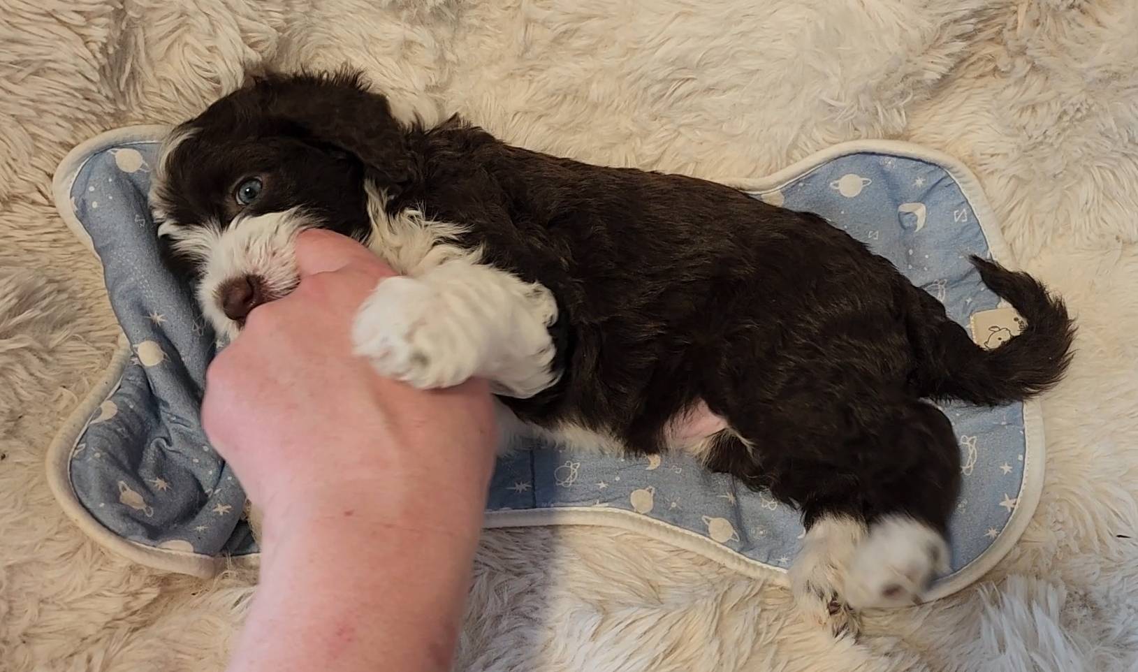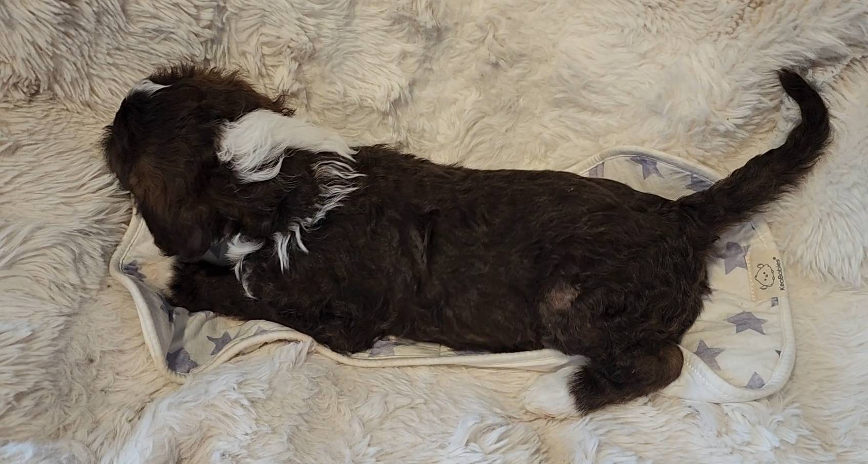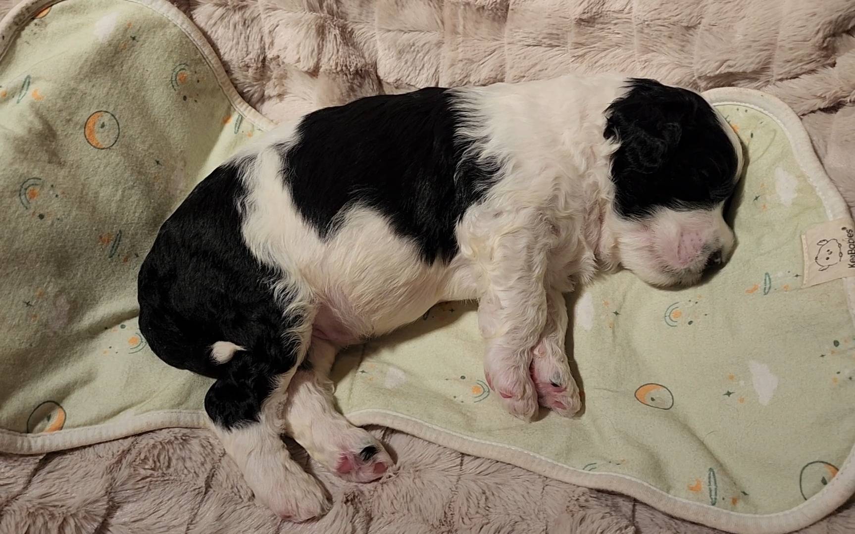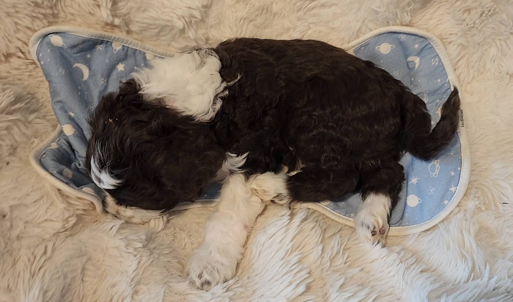 Born on 11/22, 2025, at 1:24pm, this boy is our only black parti puppy! He's a very handsome layout, in my opinion, reminds me a tuxedo with buttons so far, quite dashing (in my opinion). We're accustomed to pups being 'born in pairs,' followed by a bit more of a break, so to have him come in less than 20 minutes later was a welcome surprise - this his brother outdid him. This little boy, our only black parti coat, weighted in at 9.9oz.