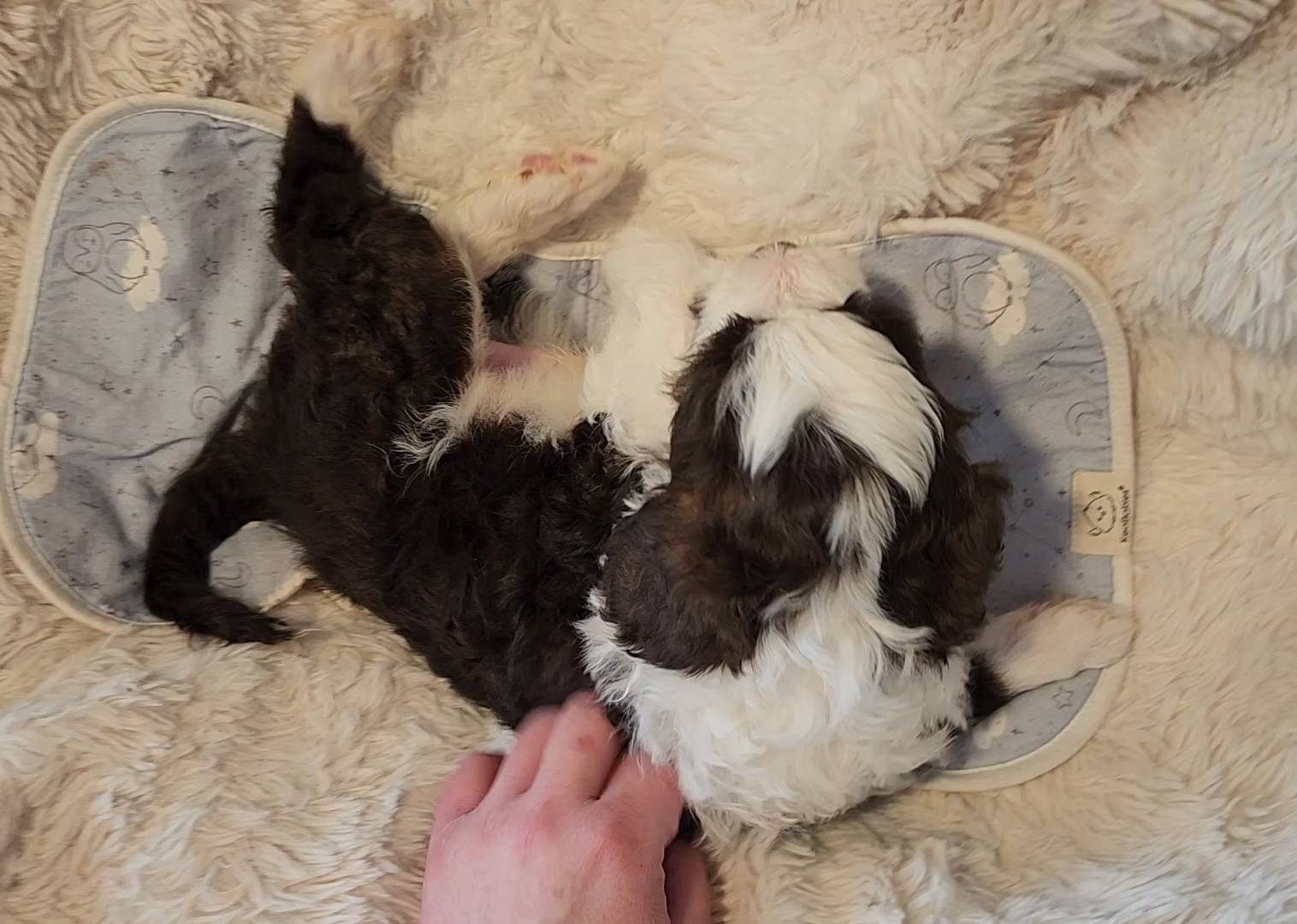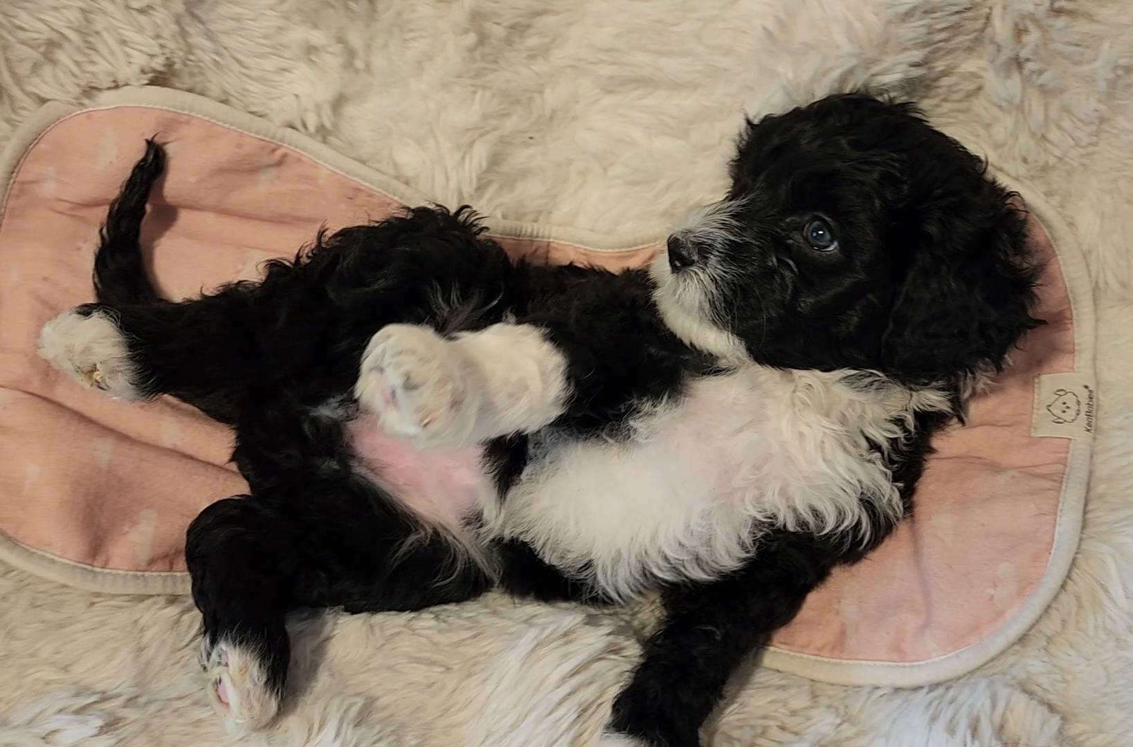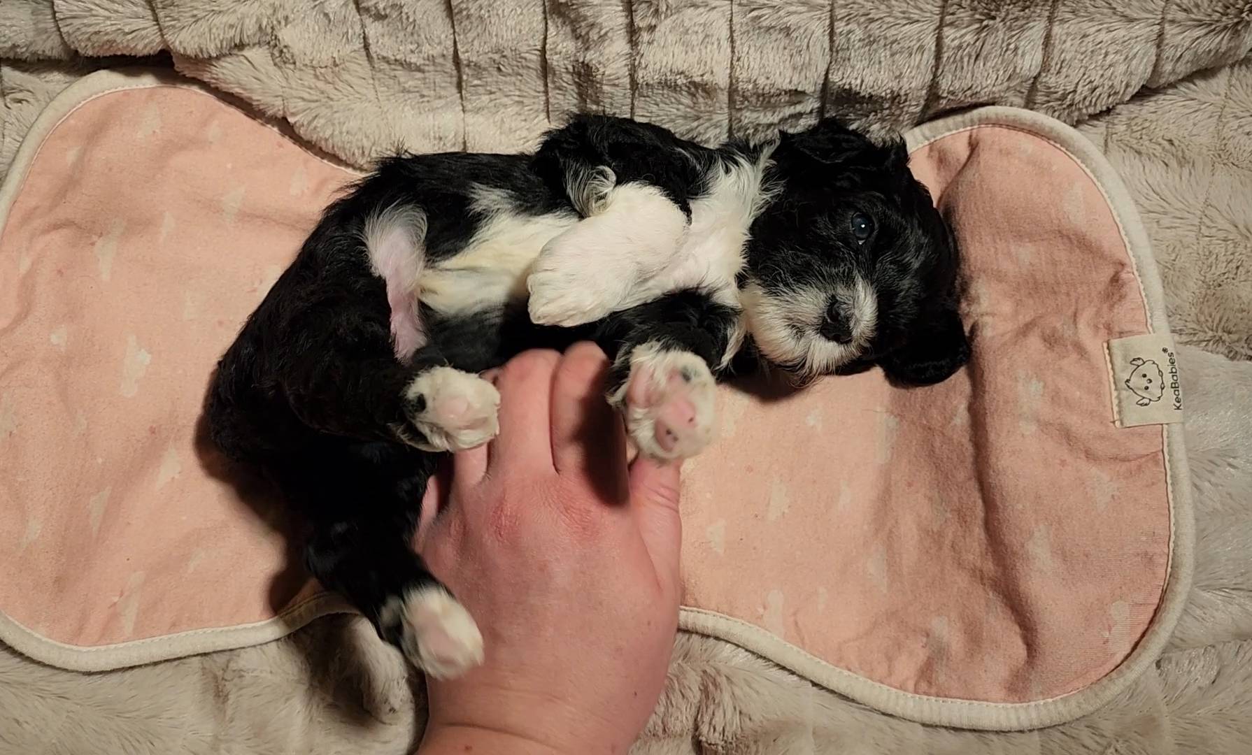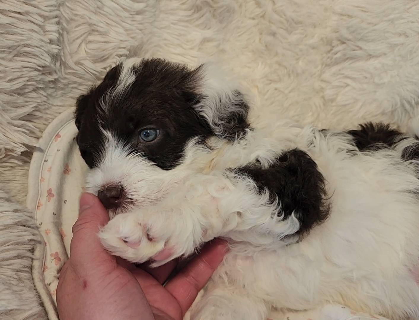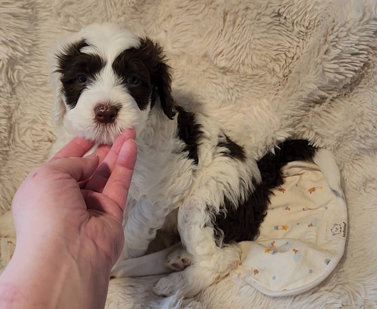 Born on 11/22, 2025, at 1:24pm, this boy is our only black parti puppy! He's a very handsome layout, in my opinion, reminds me a tuxedo with buttons so far, quite dashing (in my opinion). We're accustomed to pups being 'born in pairs,' followed by a bit more of a break, so to have him come in less than 20 minutes later was a welcome surprise - this his brother outdid him. This little boy, our only black parti coat, weighted in at 9.9oz.