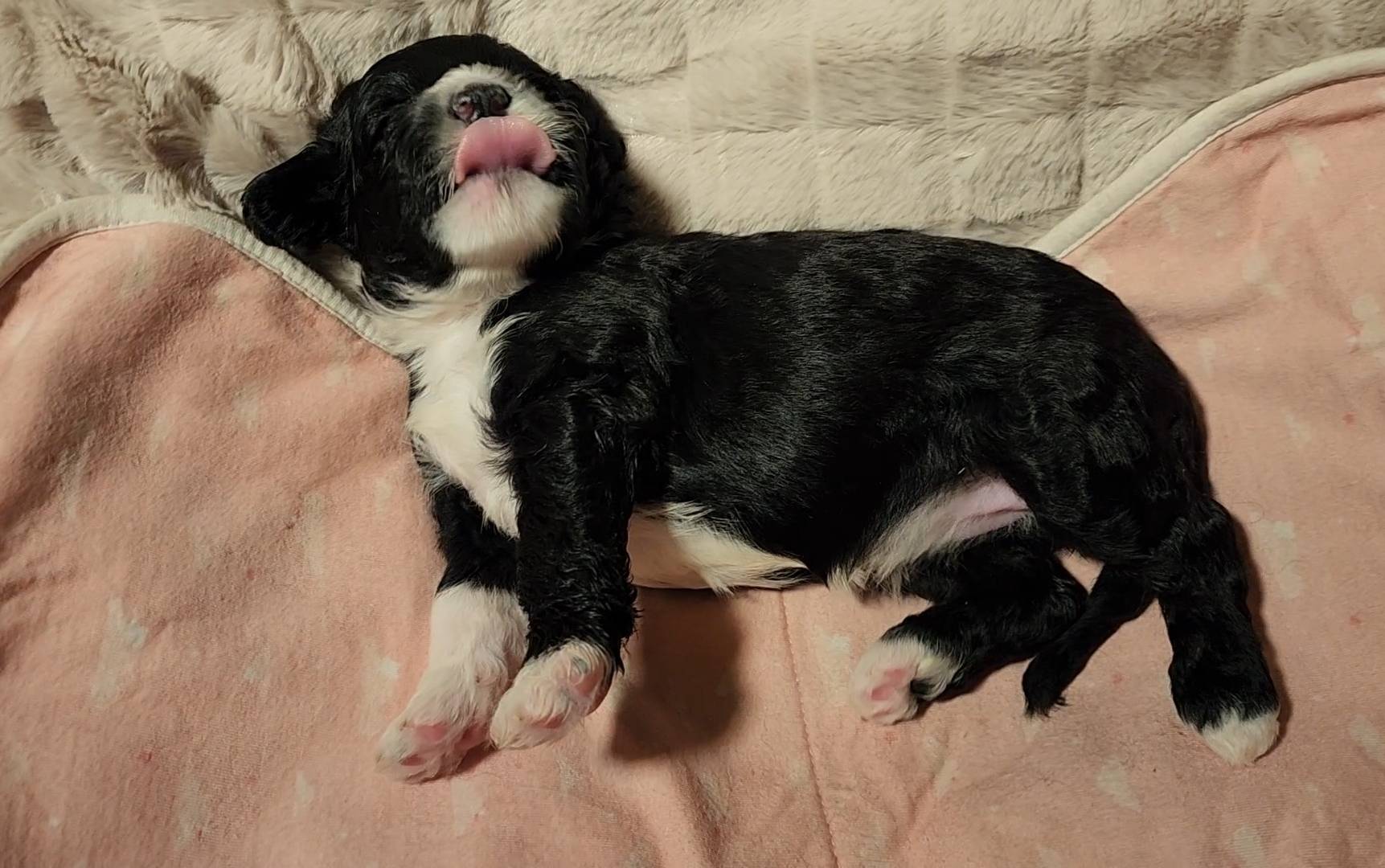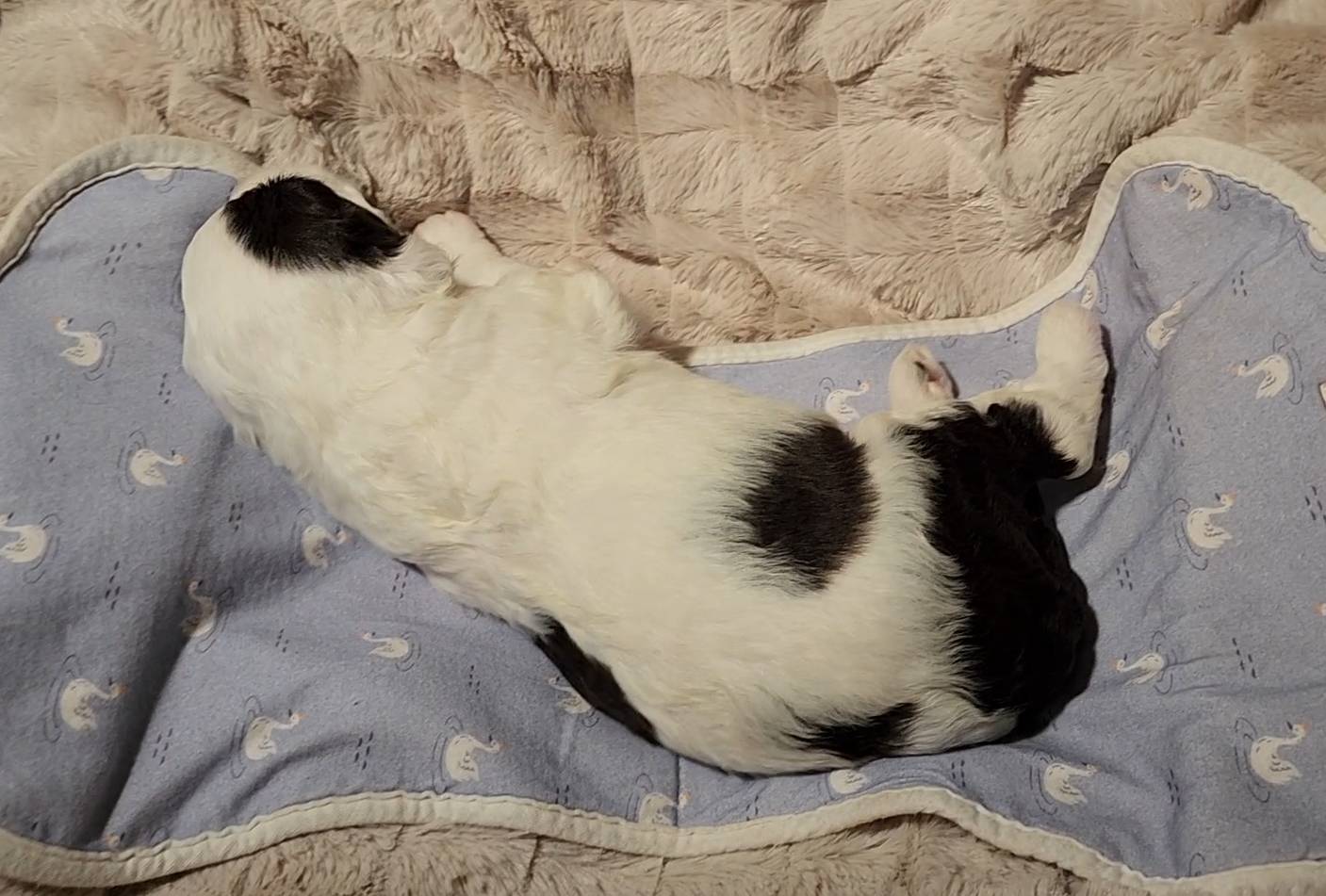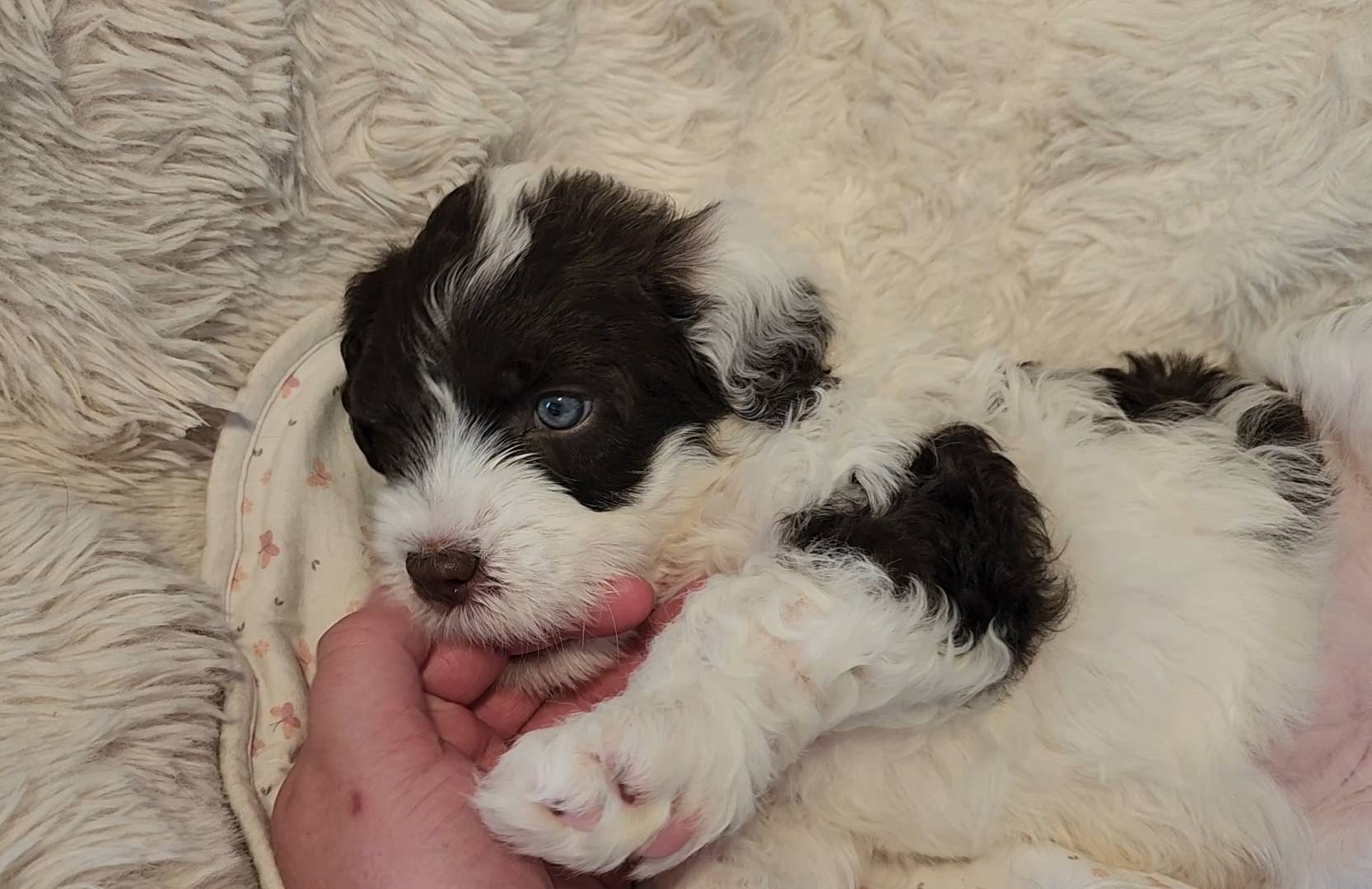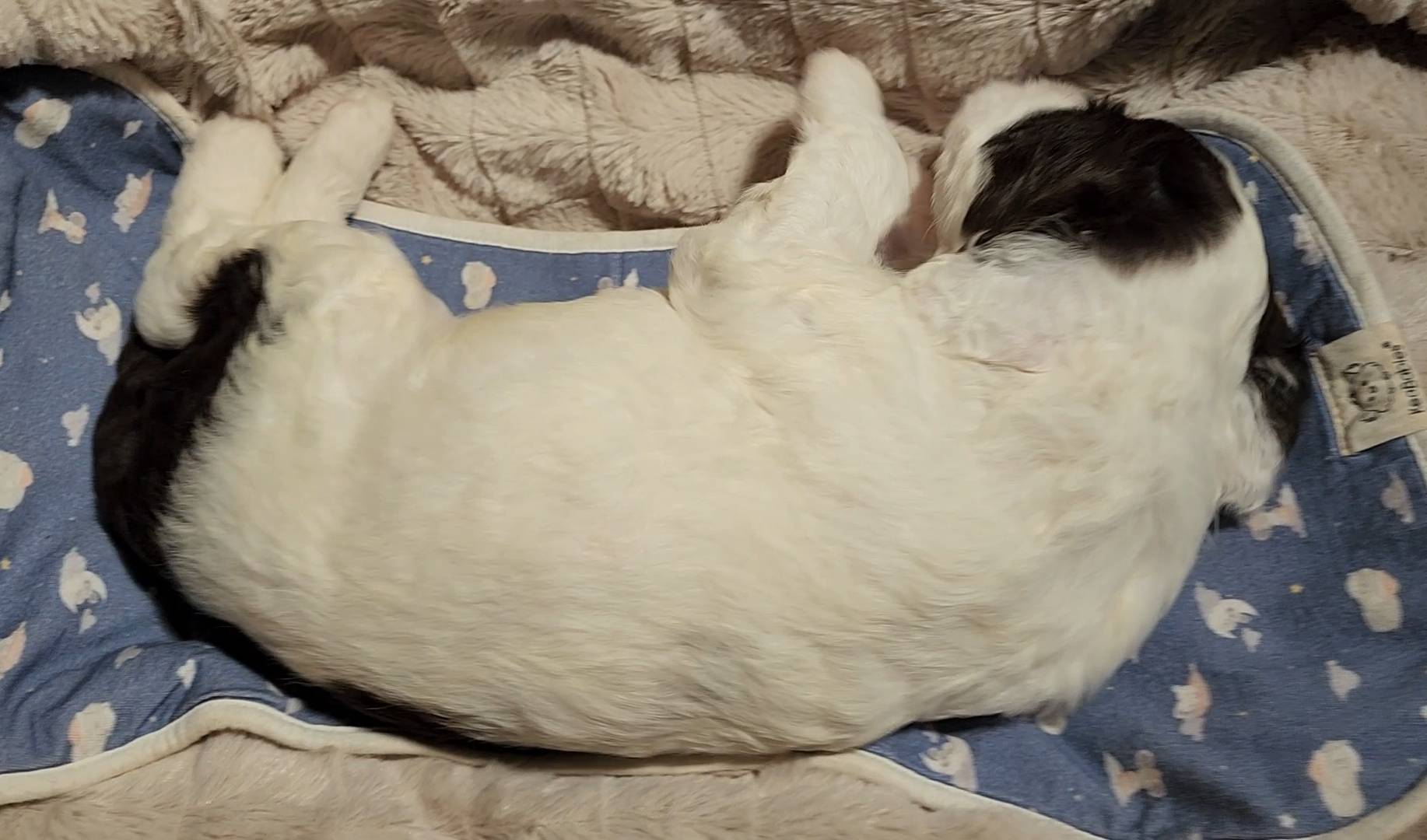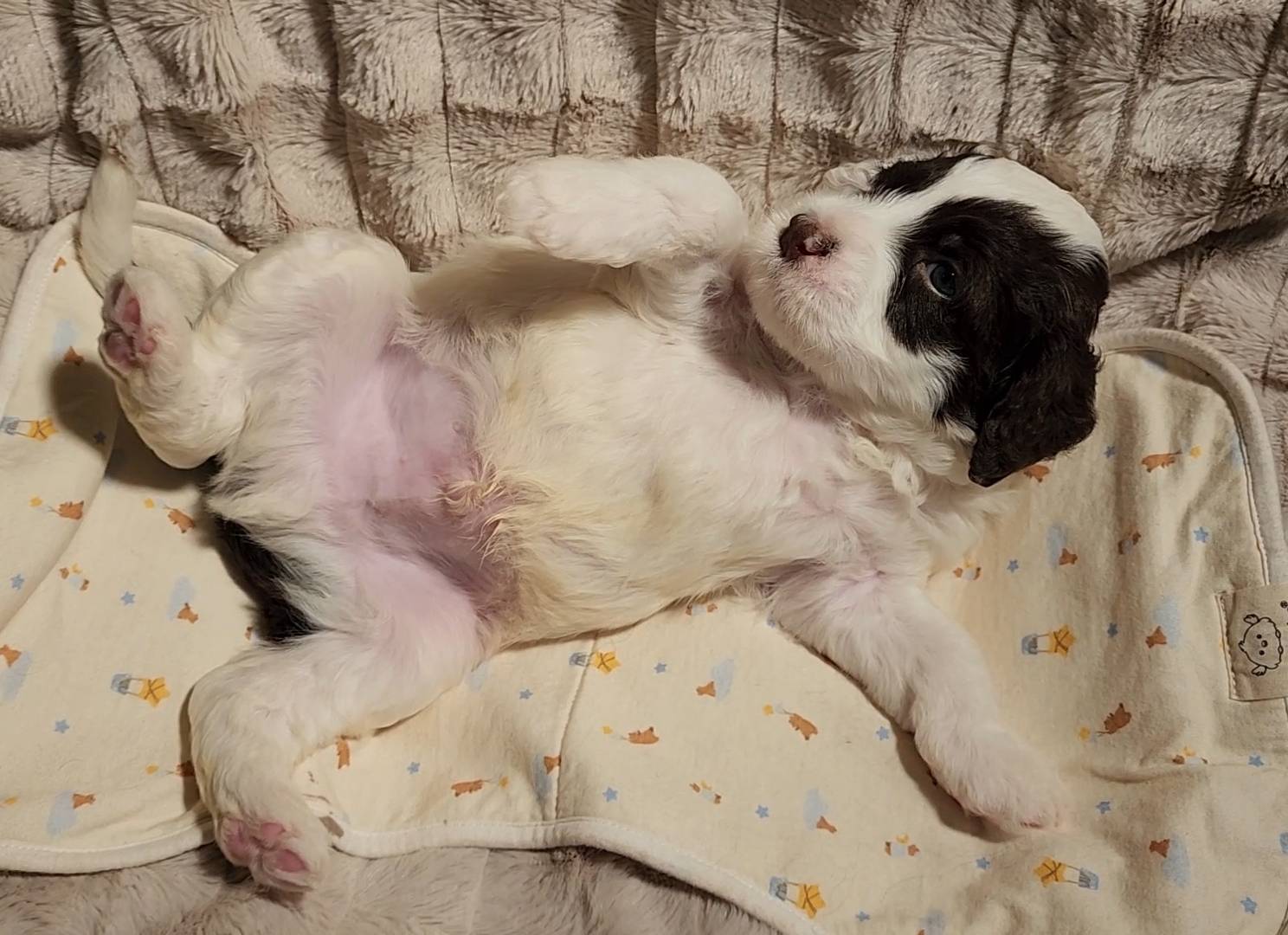 Born on 11/22, 2025, at 1:24pm, this boy is our only black parti puppy! He's a very handsome layout, in my opinion, reminds me a tuxedo with buttons so far, quite dashing (in my opinion). We're accustomed to pups being 'born in pairs,' followed by a bit more of a break, so to have him come in less than 20 minutes later was a welcome surprise - this his brother outdid him. This little boy, our only black parti coat, weighted in at 9.9oz.