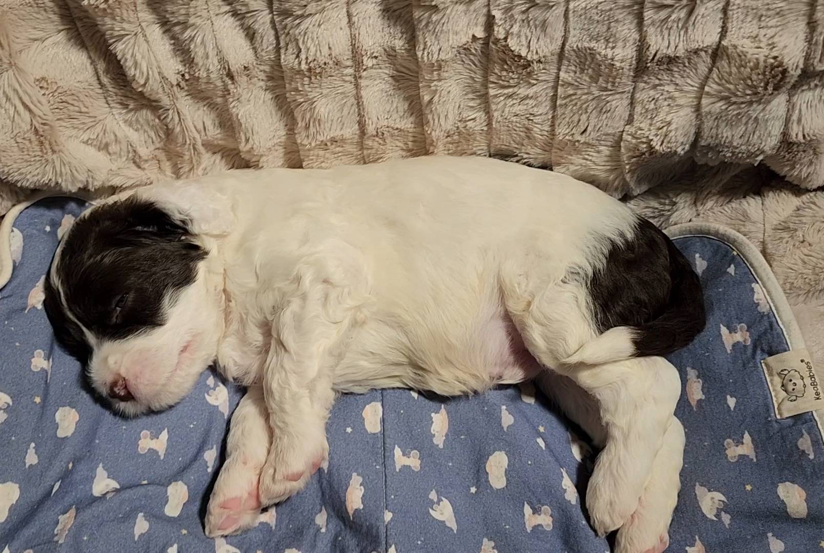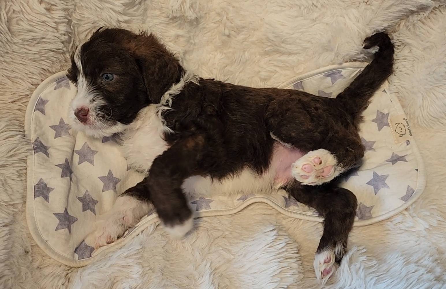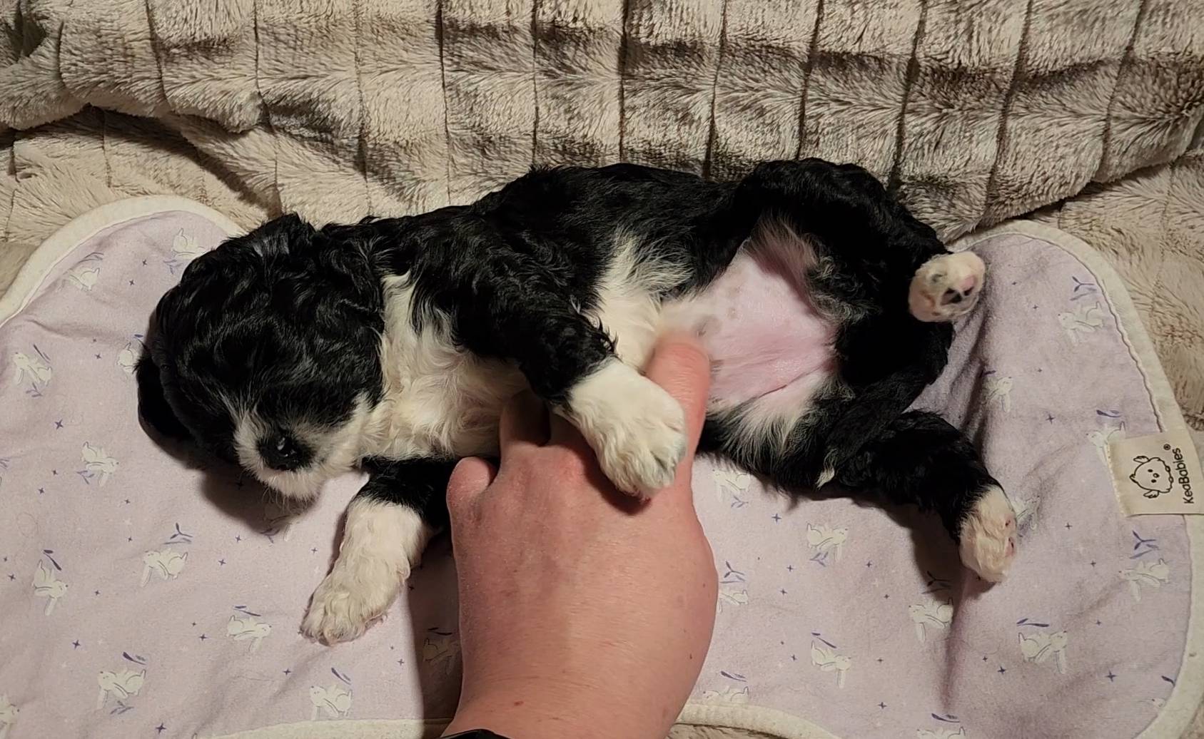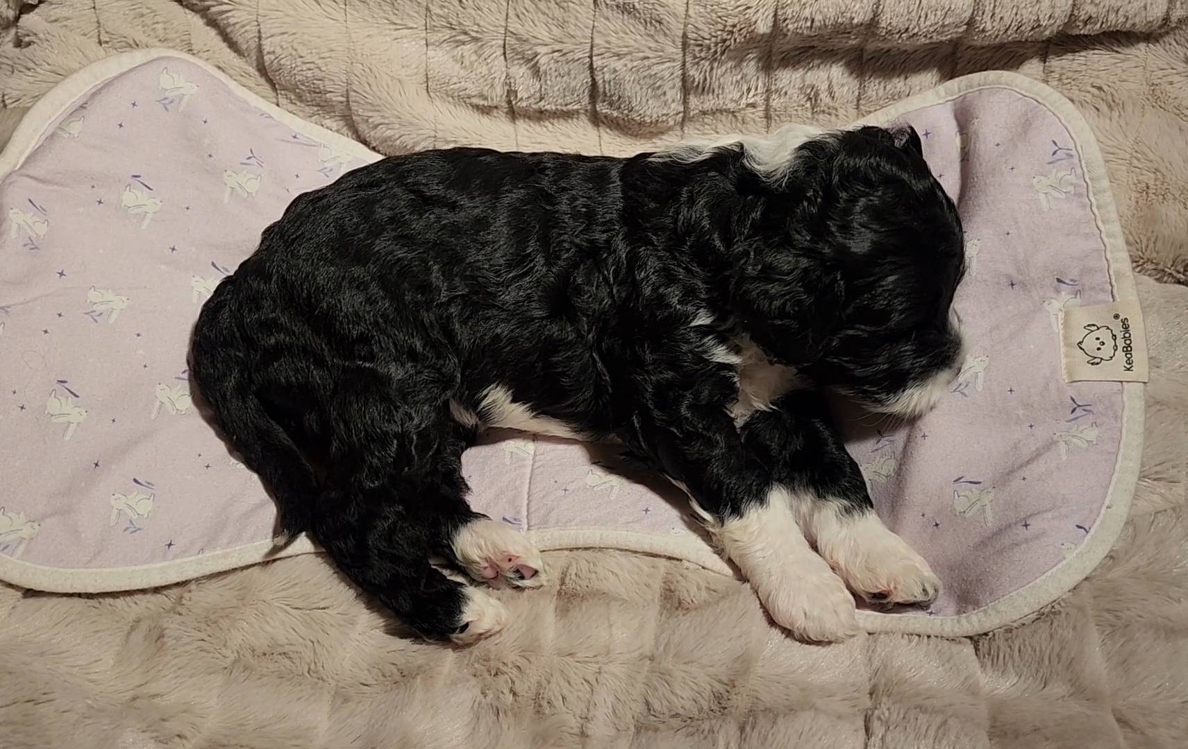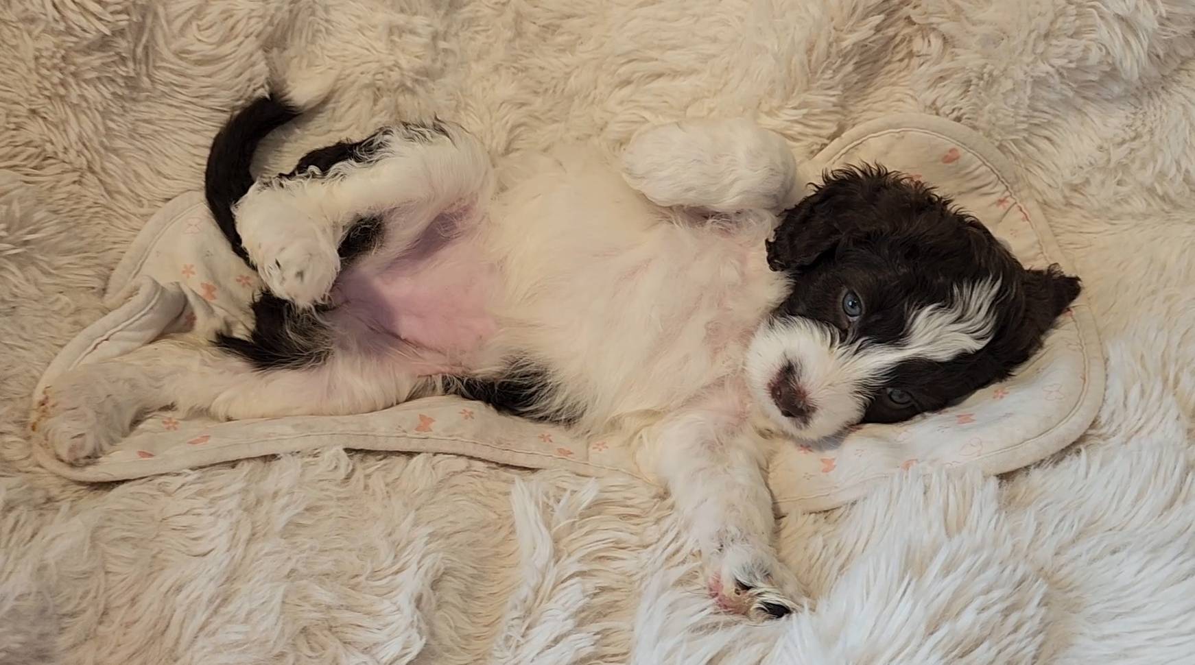 Born on 11/22, 2025, at 1:24pm, this boy is our only black parti puppy! He's a very handsome layout, in my opinion, reminds me a tuxedo with buttons so far, quite dashing (in my opinion). We're accustomed to pups being 'born in pairs,' followed by a bit more of a break, so to have him come in less than 20 minutes later was a welcome surprise - this his brother outdid him. This little boy, our only black parti coat, weighted in at 9.9oz.