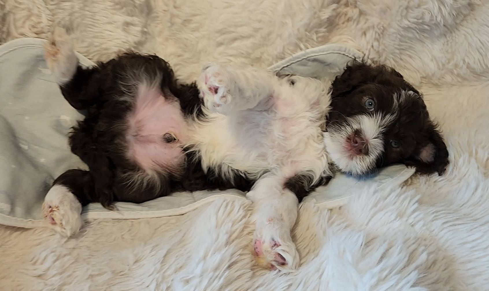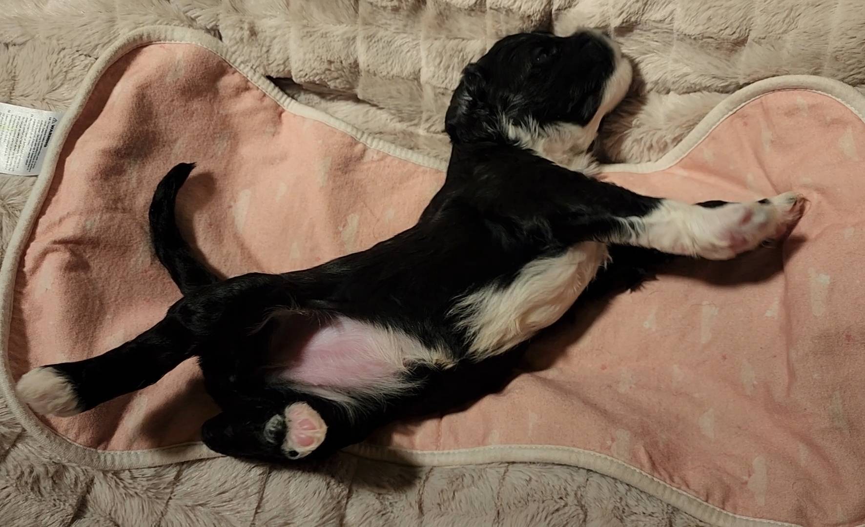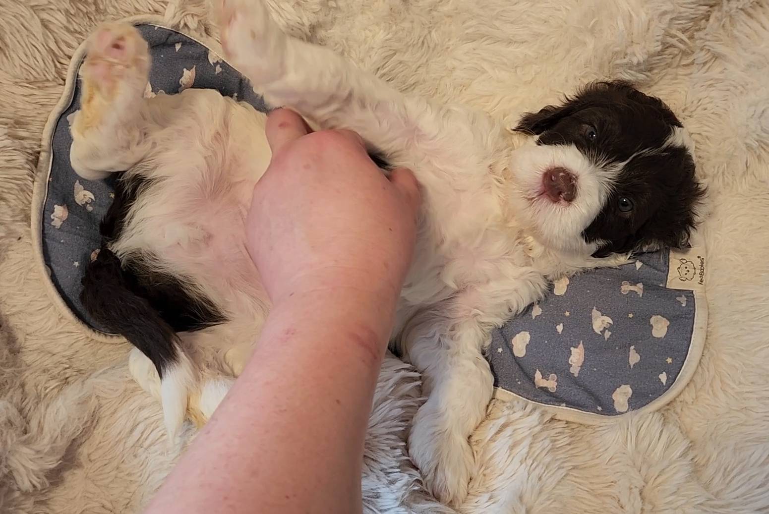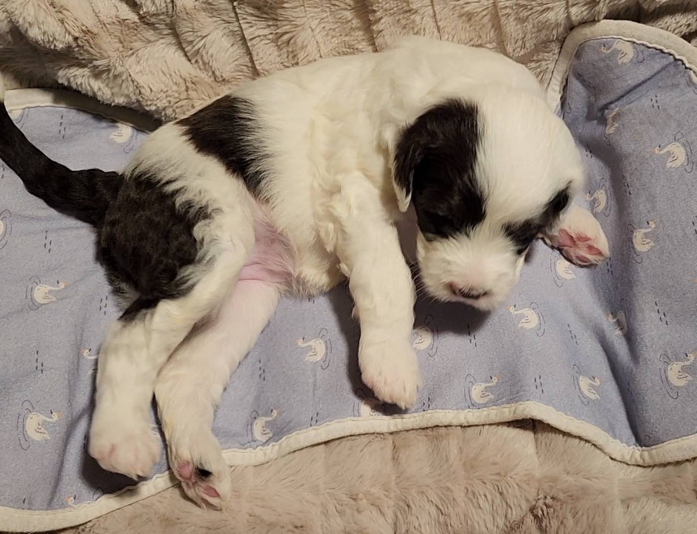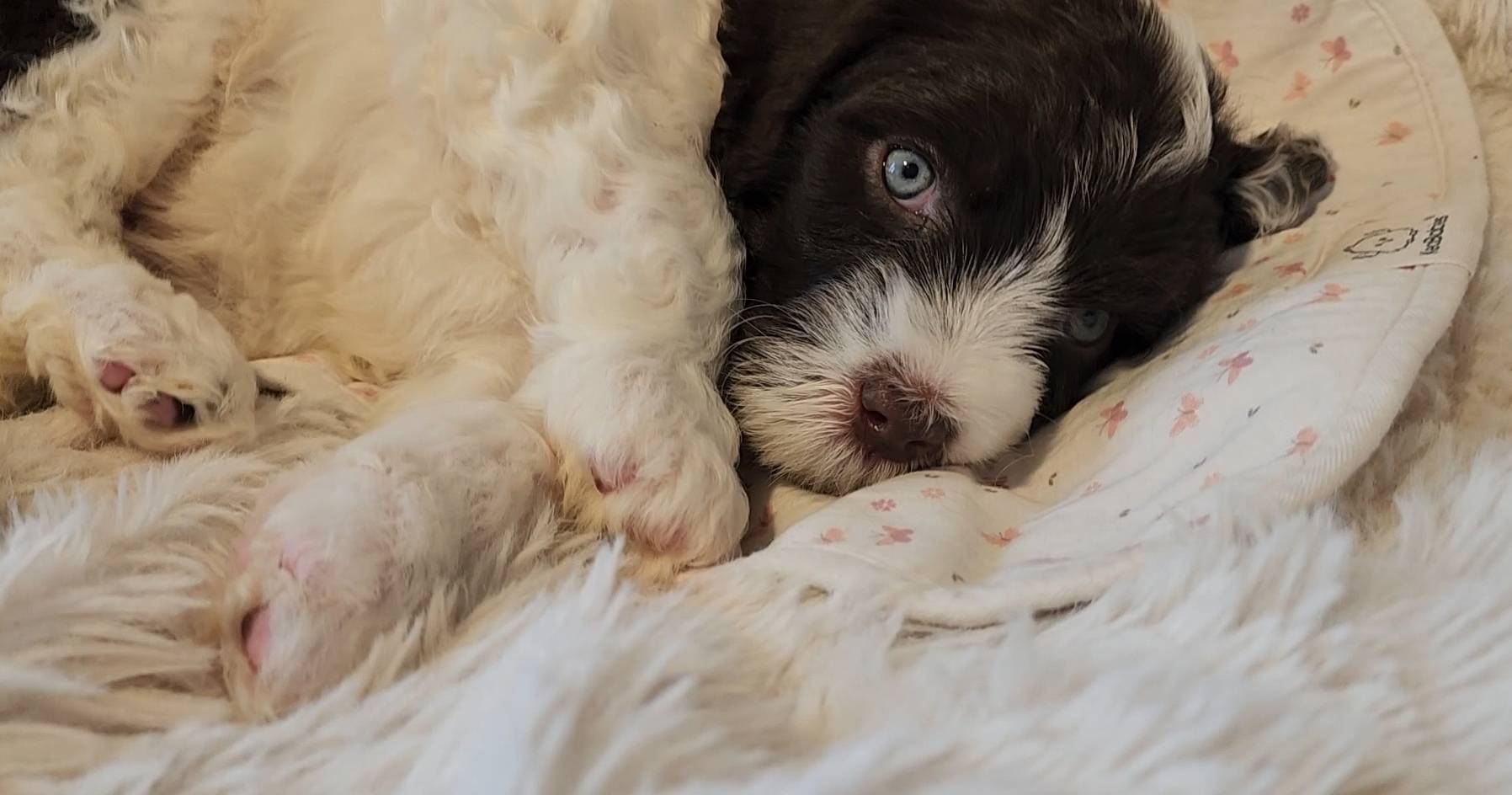 Born on 11/22, 2025, at 1:24pm, this boy is our only black parti puppy! He's a very handsome layout, in my opinion, reminds me a tuxedo with buttons so far, quite dashing (in my opinion). We're accustomed to pups being 'born in pairs,' followed by a bit more of a break, so to have him come in less than 20 minutes later was a welcome surprise - this his brother outdid him. This little boy, our only black parti coat, weighted in at 9.9oz.