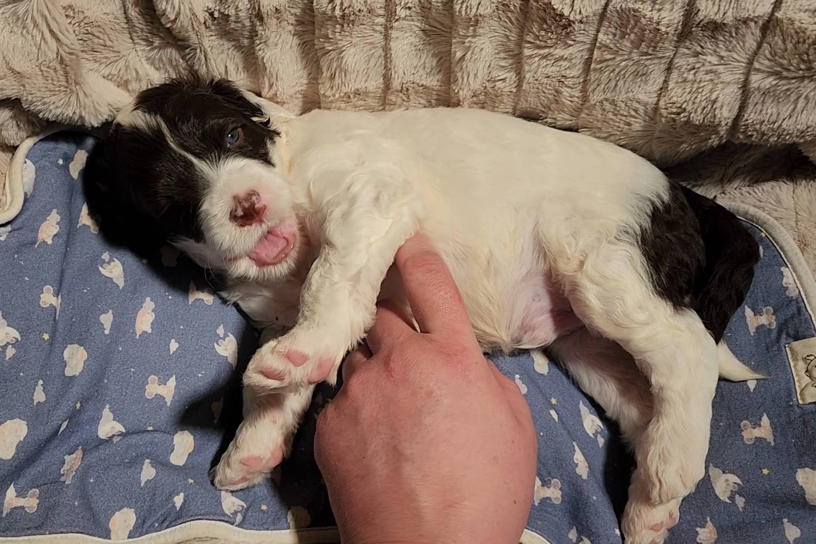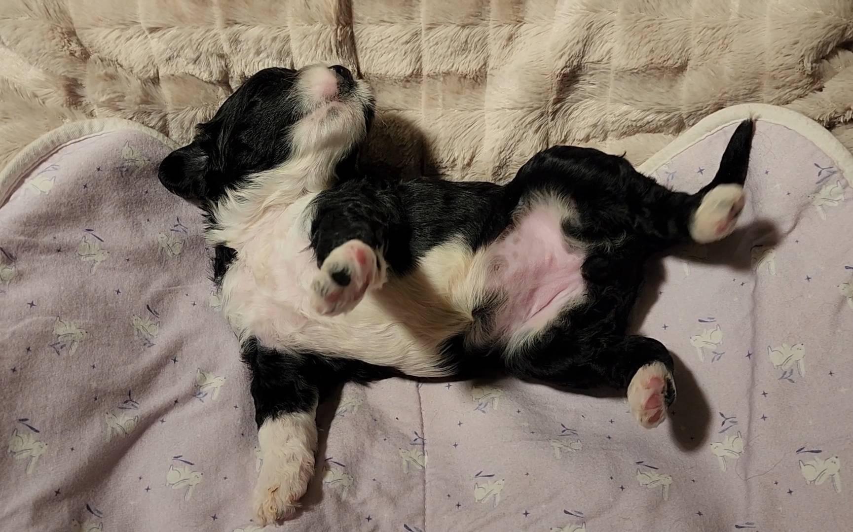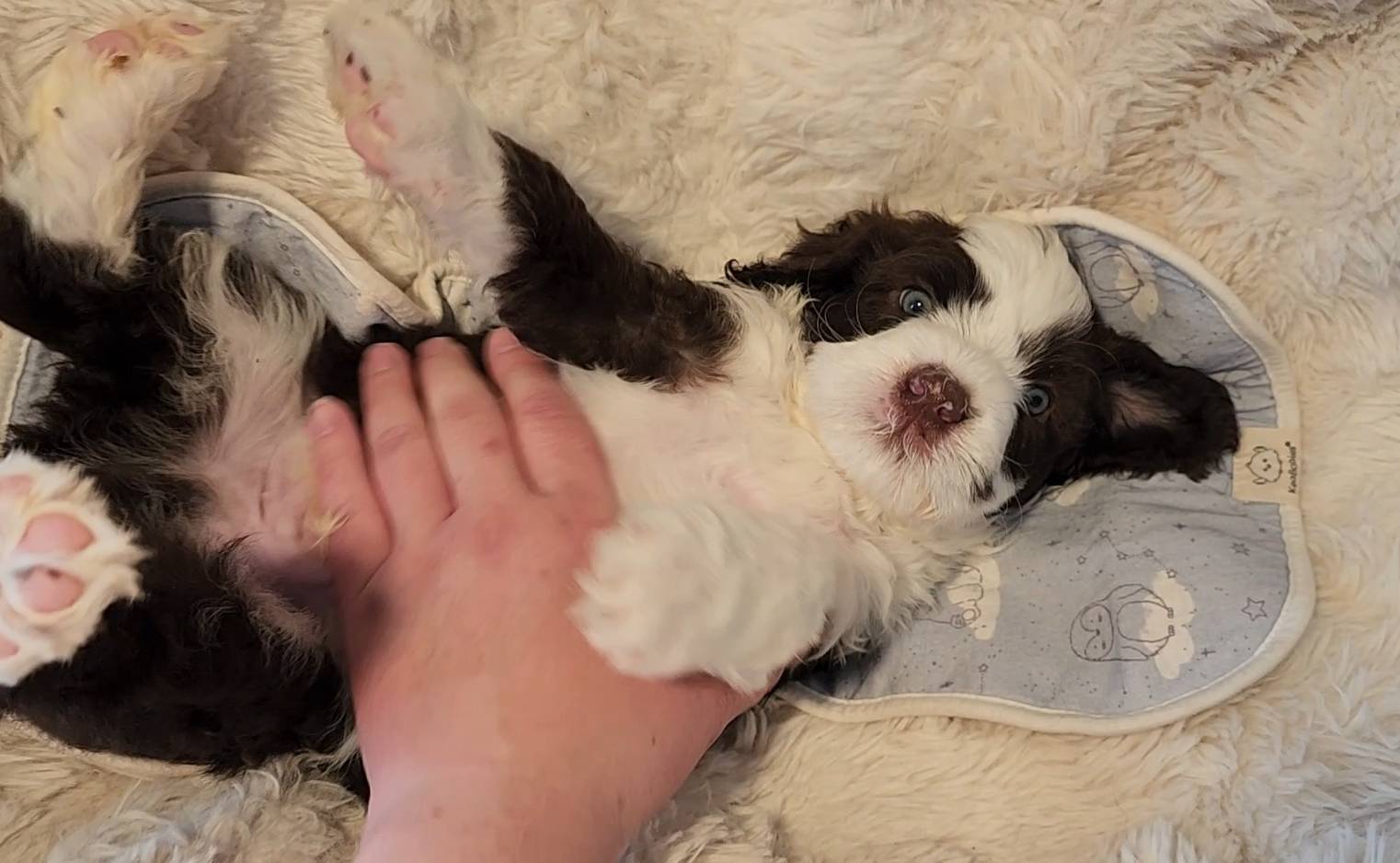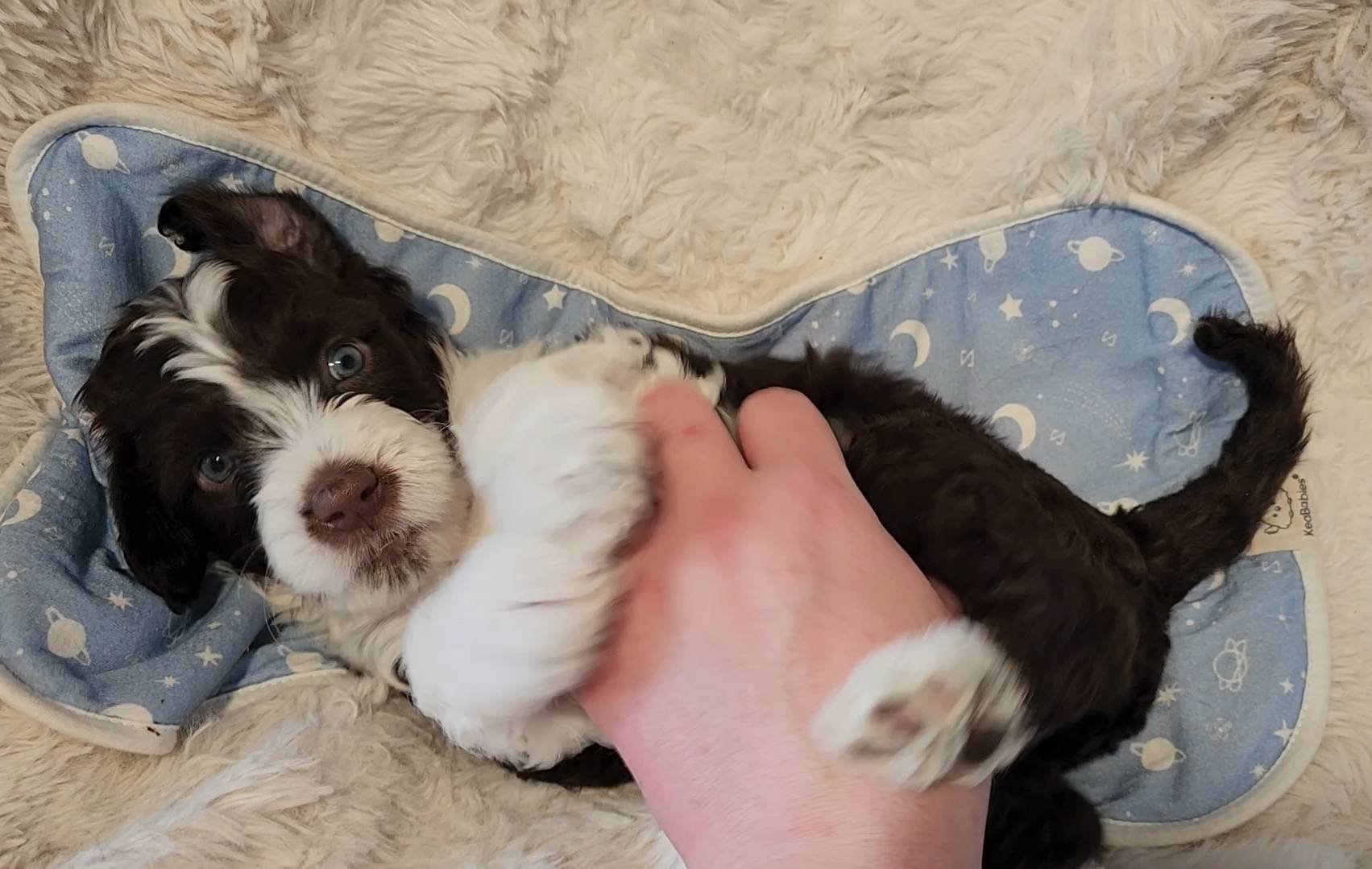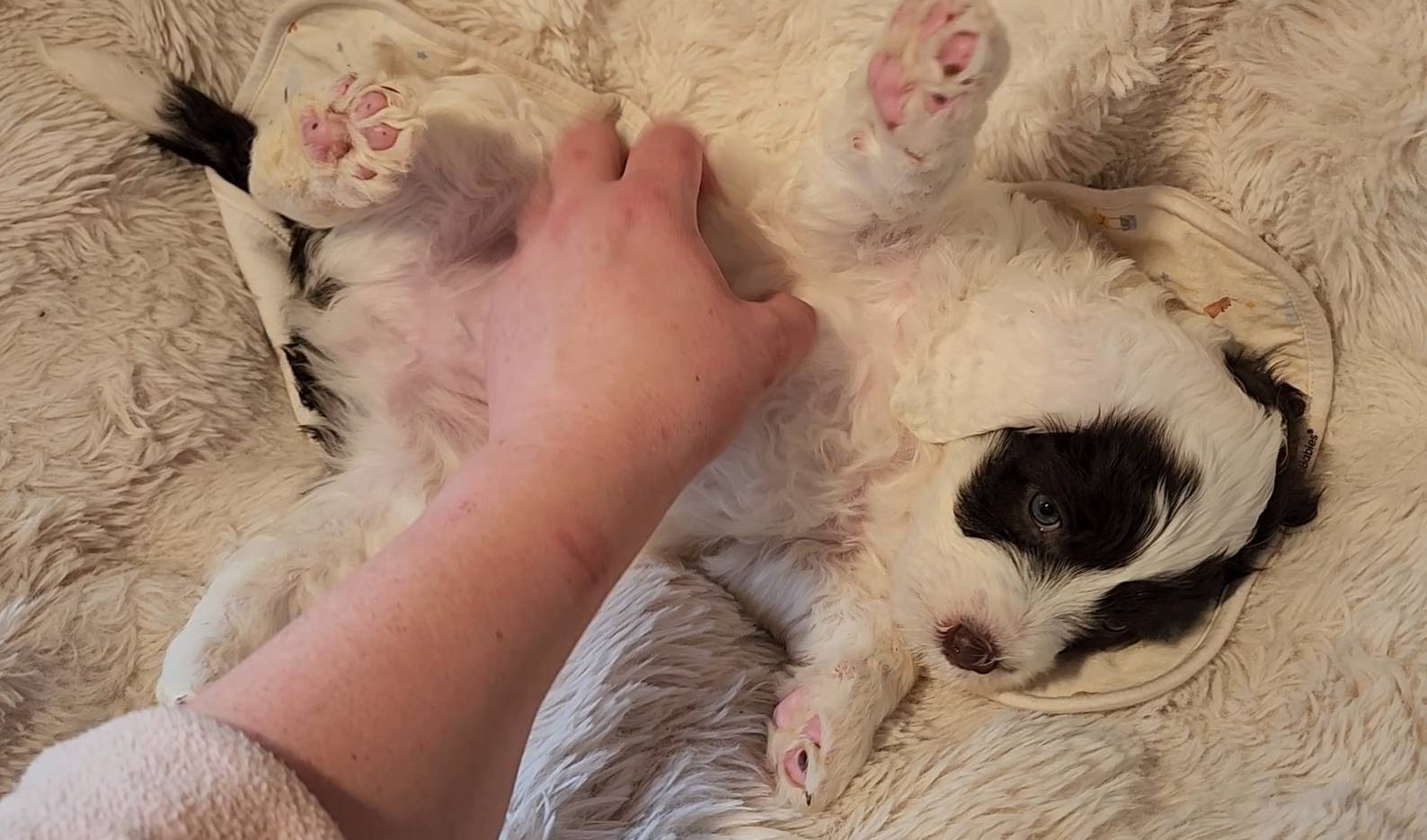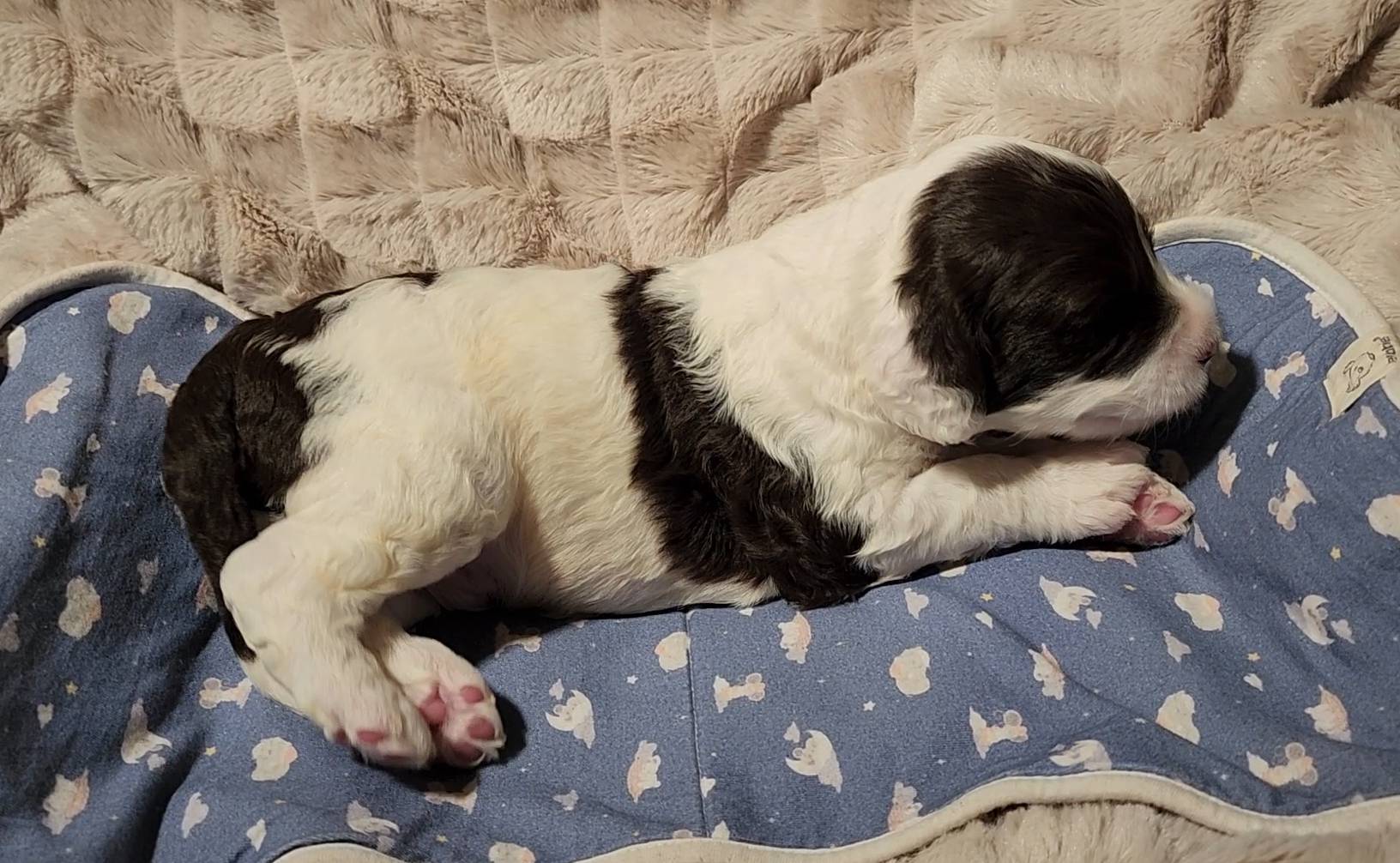Born on 11/22, 2025, at 1:24pm, this boy is our only black parti puppy! He's a very handsome layout, in my opinion, reminds me a tuxedo with buttons so far, quite dashing (in my opinion). We're accustomed to pups being 'born in pairs,' followed by a bit more of a break, so to have him come in less than 20 minutes later was a welcome surprise - this his brother outdid him. This little boy, our only black parti coat, weighted in at 9.9oz.