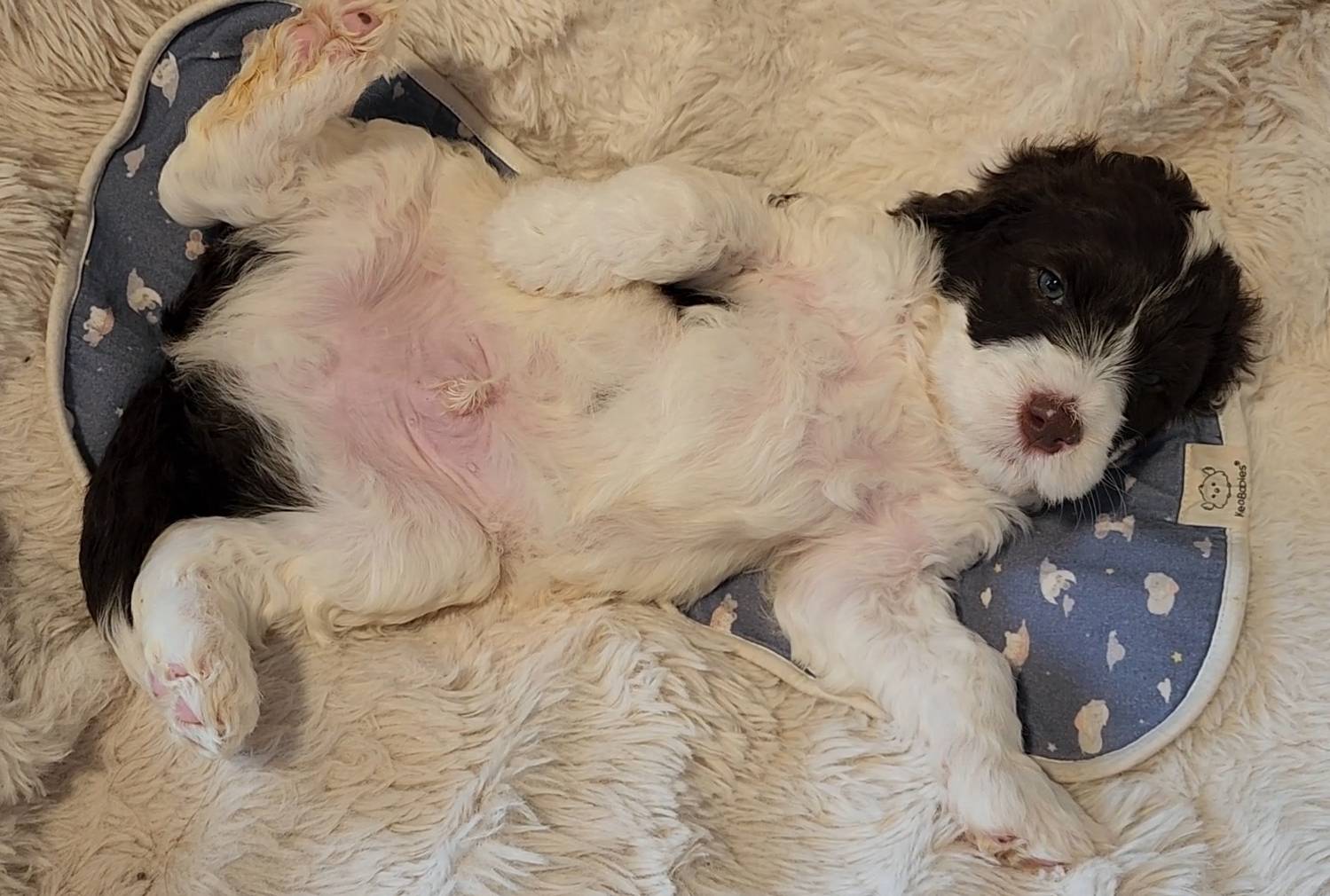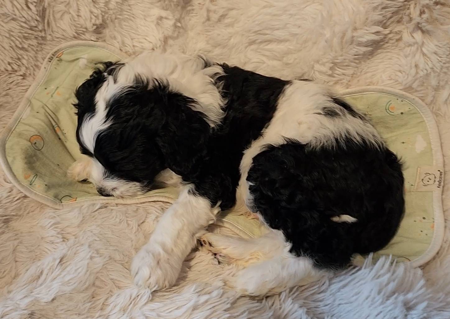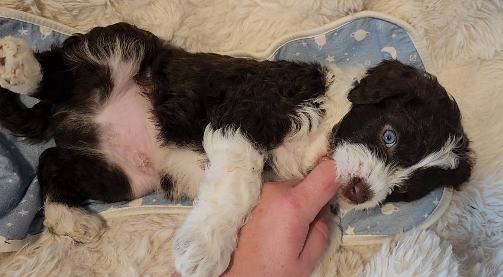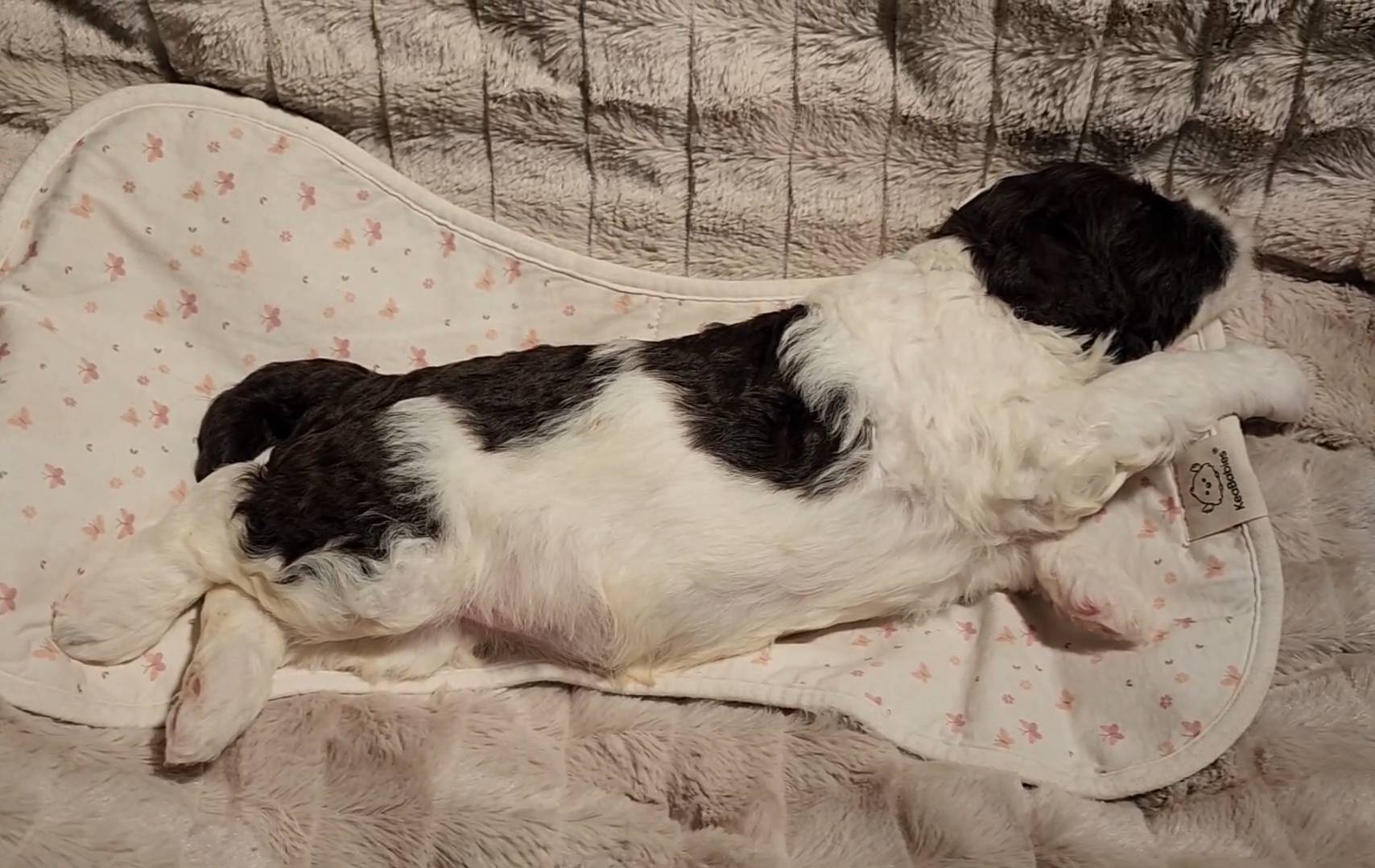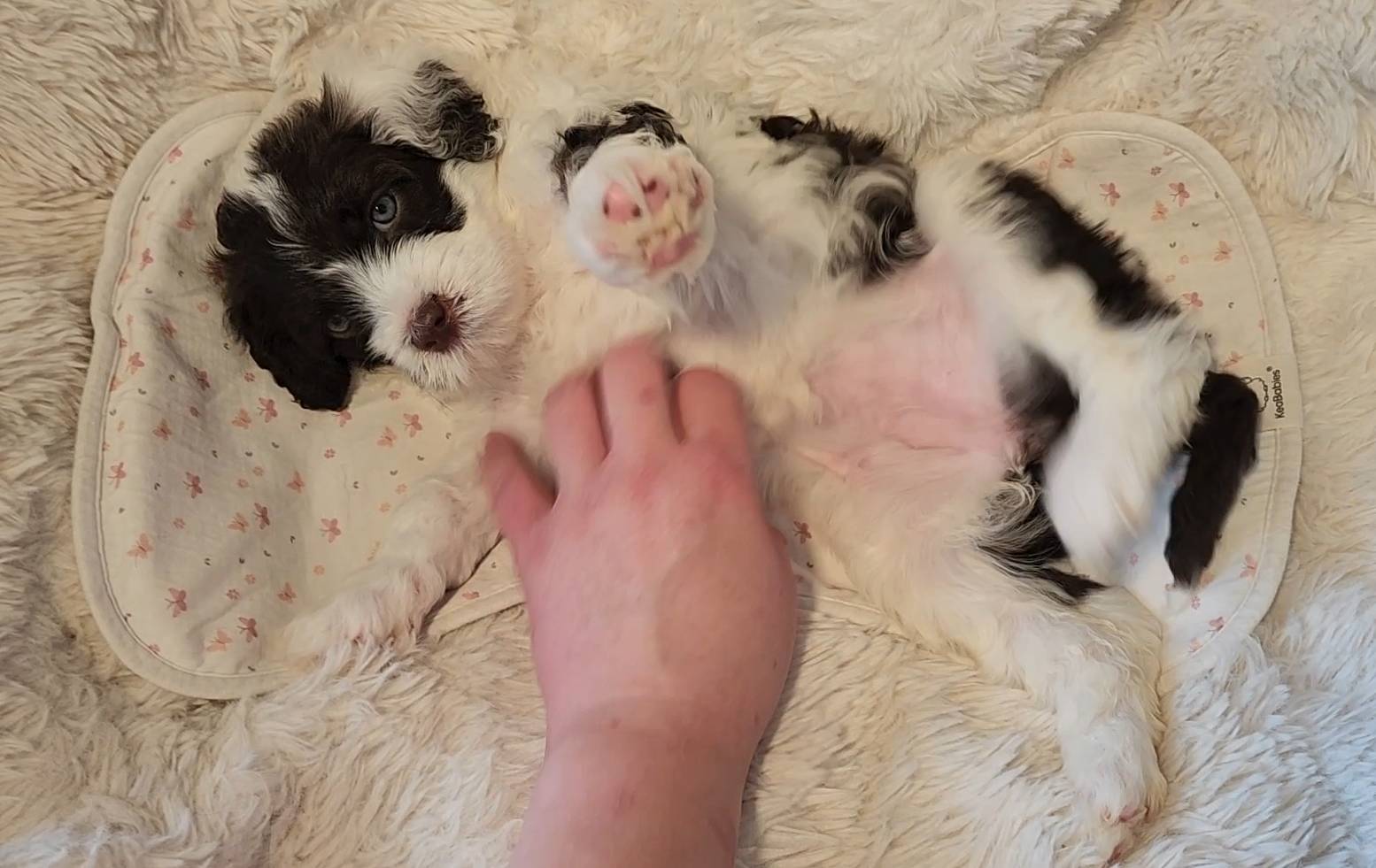 Born on 11/22, 2025, at 1:24pm, this boy is our only black parti puppy! He's a very handsome layout, in my opinion, reminds me a tuxedo with buttons so far, quite dashing (in my opinion). We're accustomed to pups being 'born in pairs,' followed by a bit more of a break, so to have him come in less than 20 minutes later was a welcome surprise - this his brother outdid him. This little boy, our only black parti coat, weighted in at 9.9oz.