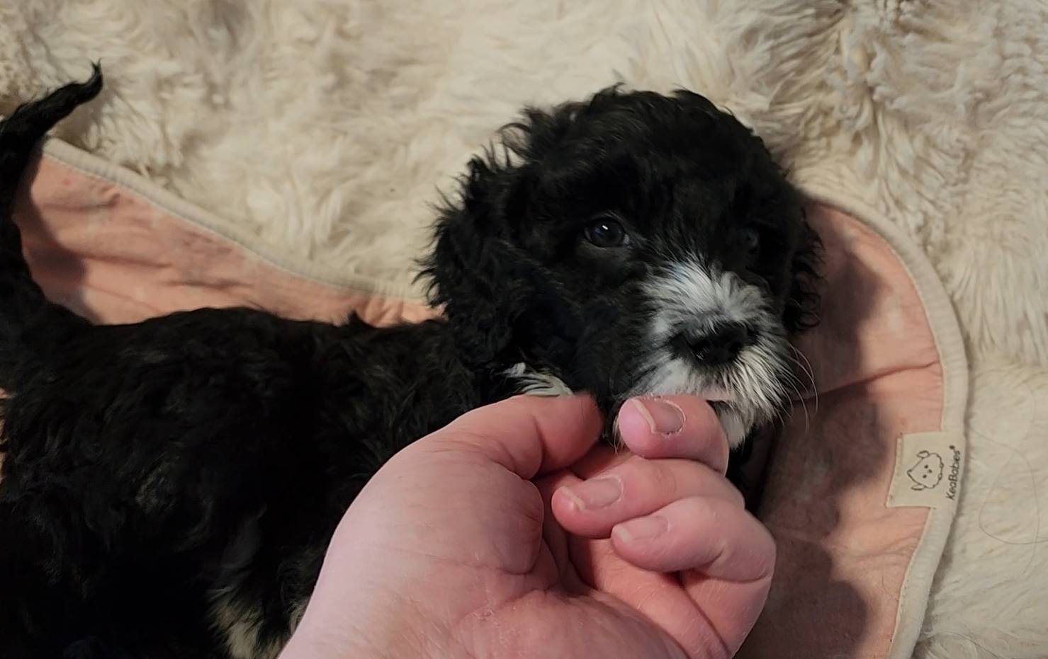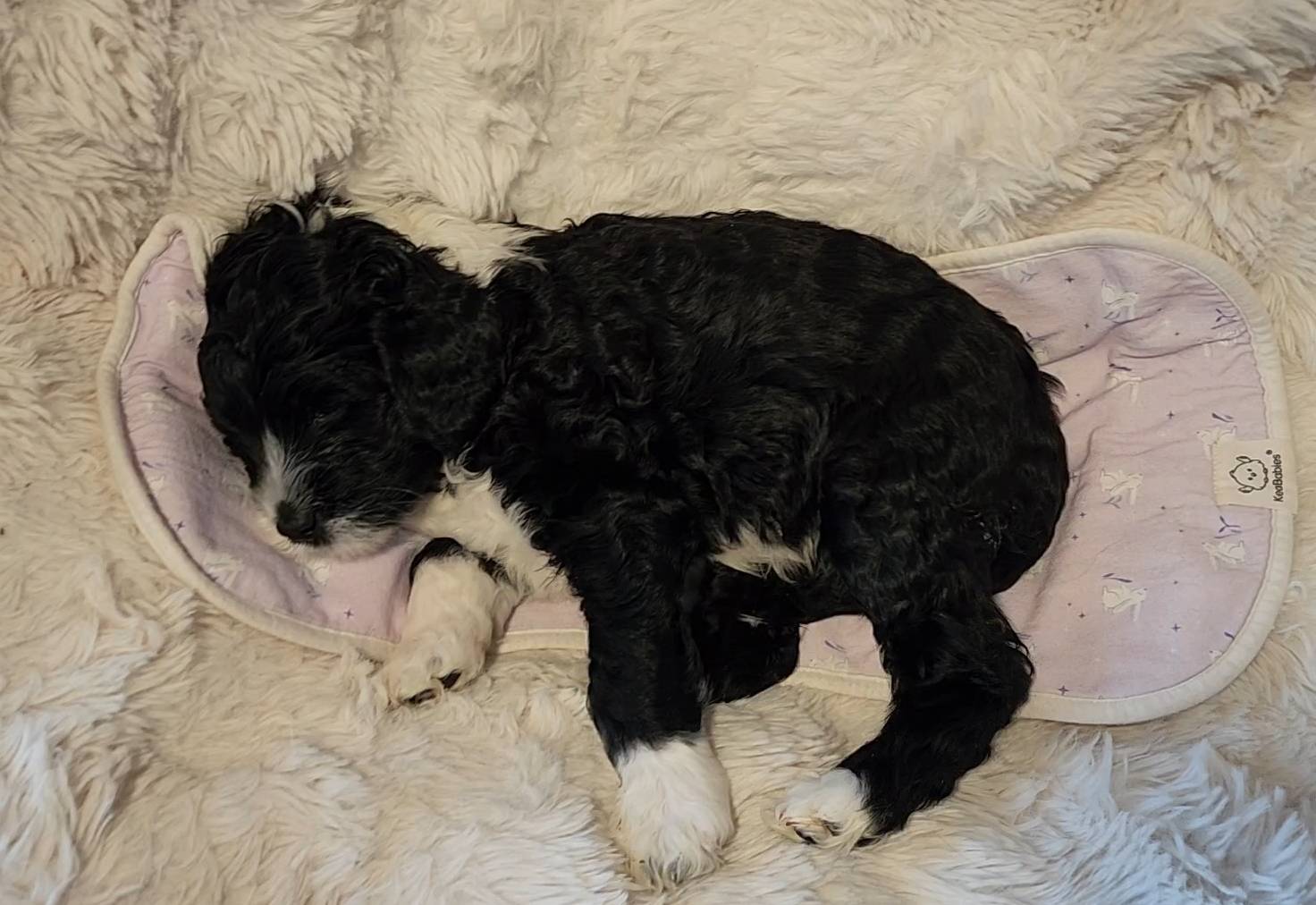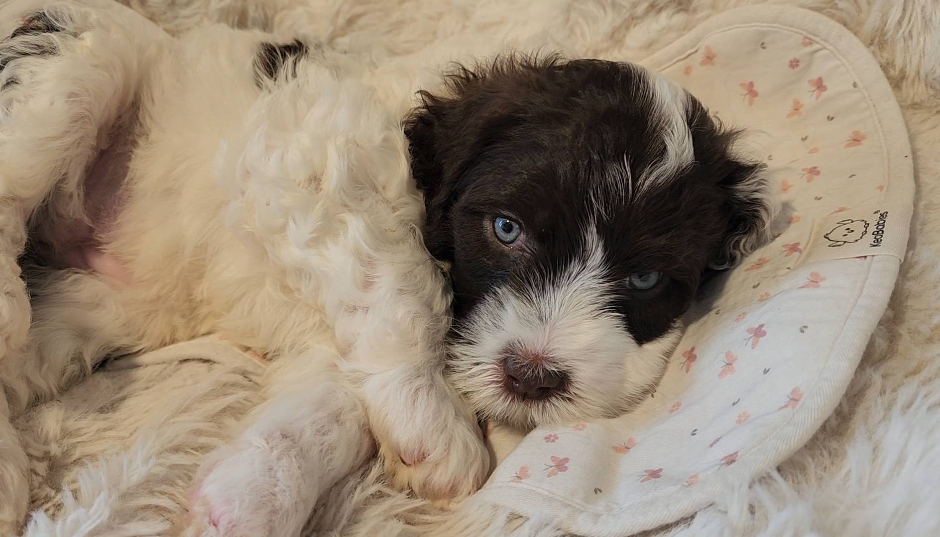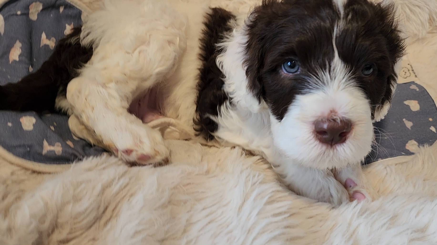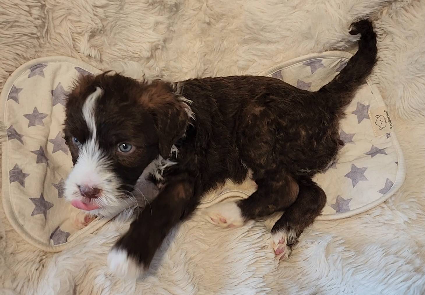 Born on 11/22, 2025, at 1:24pm, this boy is our only black parti puppy! He's a very handsome layout, in my opinion, reminds me a tuxedo with buttons so far, quite dashing (in my opinion). We're accustomed to pups being 'born in pairs,' followed by a bit more of a break, so to have him come in less than 20 minutes later was a welcome surprise - this his brother outdid him. This little boy, our only black parti coat, weighted in at 9.9oz.
