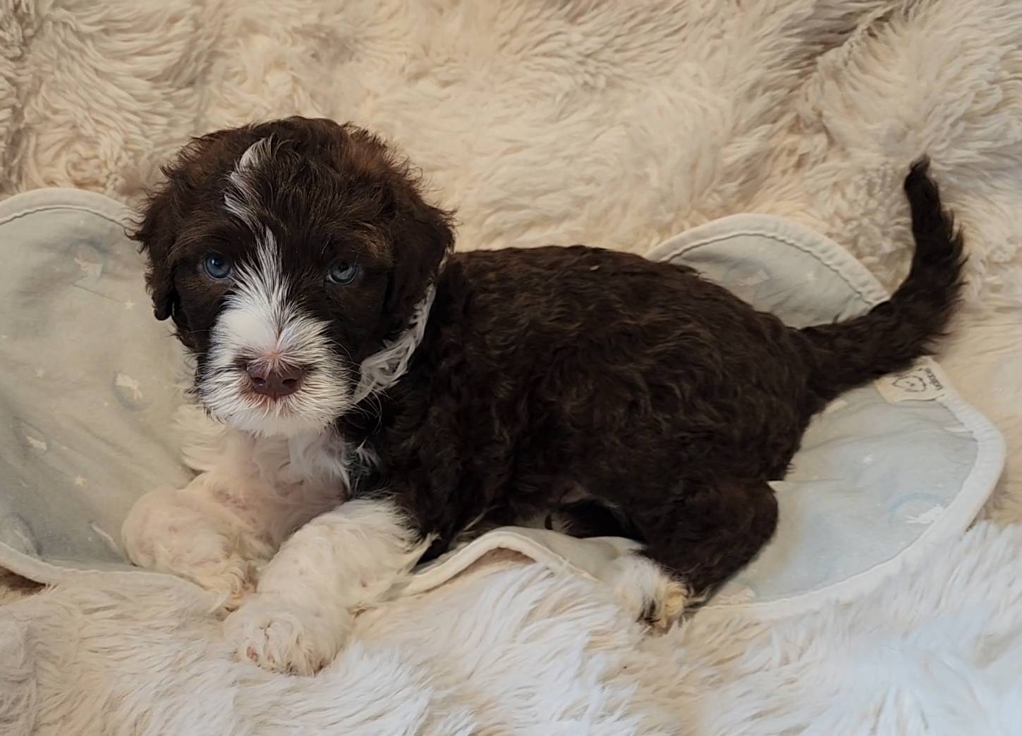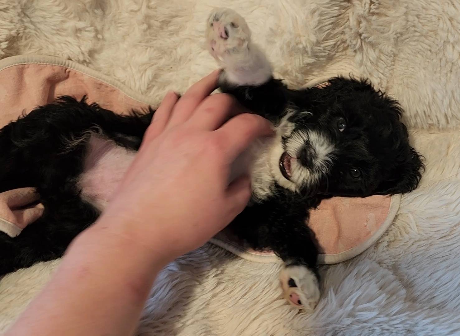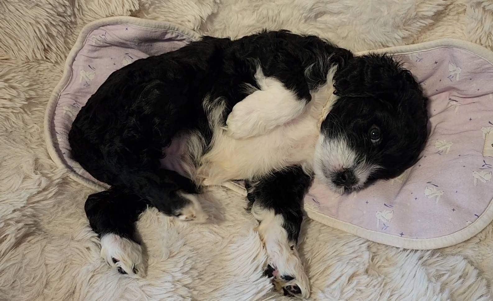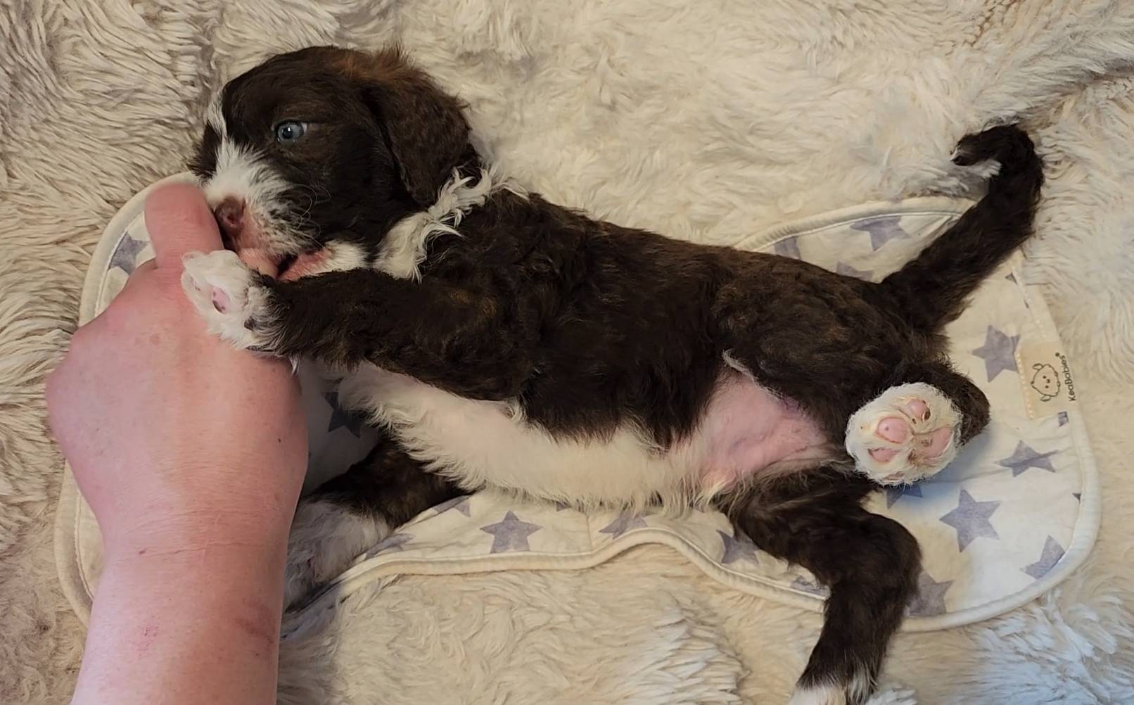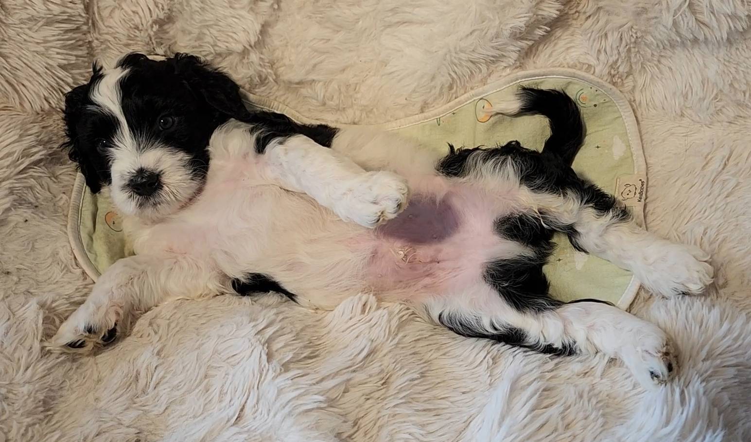 Born on 11/22, 2025, at 1:24pm, this boy is our only black parti puppy! He's a very handsome layout, in my opinion, reminds me a tuxedo with buttons so far, quite dashing (in my opinion). We're accustomed to pups being 'born in pairs,' followed by a bit more of a break, so to have him come in less than 20 minutes later was a welcome surprise - this his brother outdid him. This little boy, our only black parti coat, weighted in at 9.9oz.