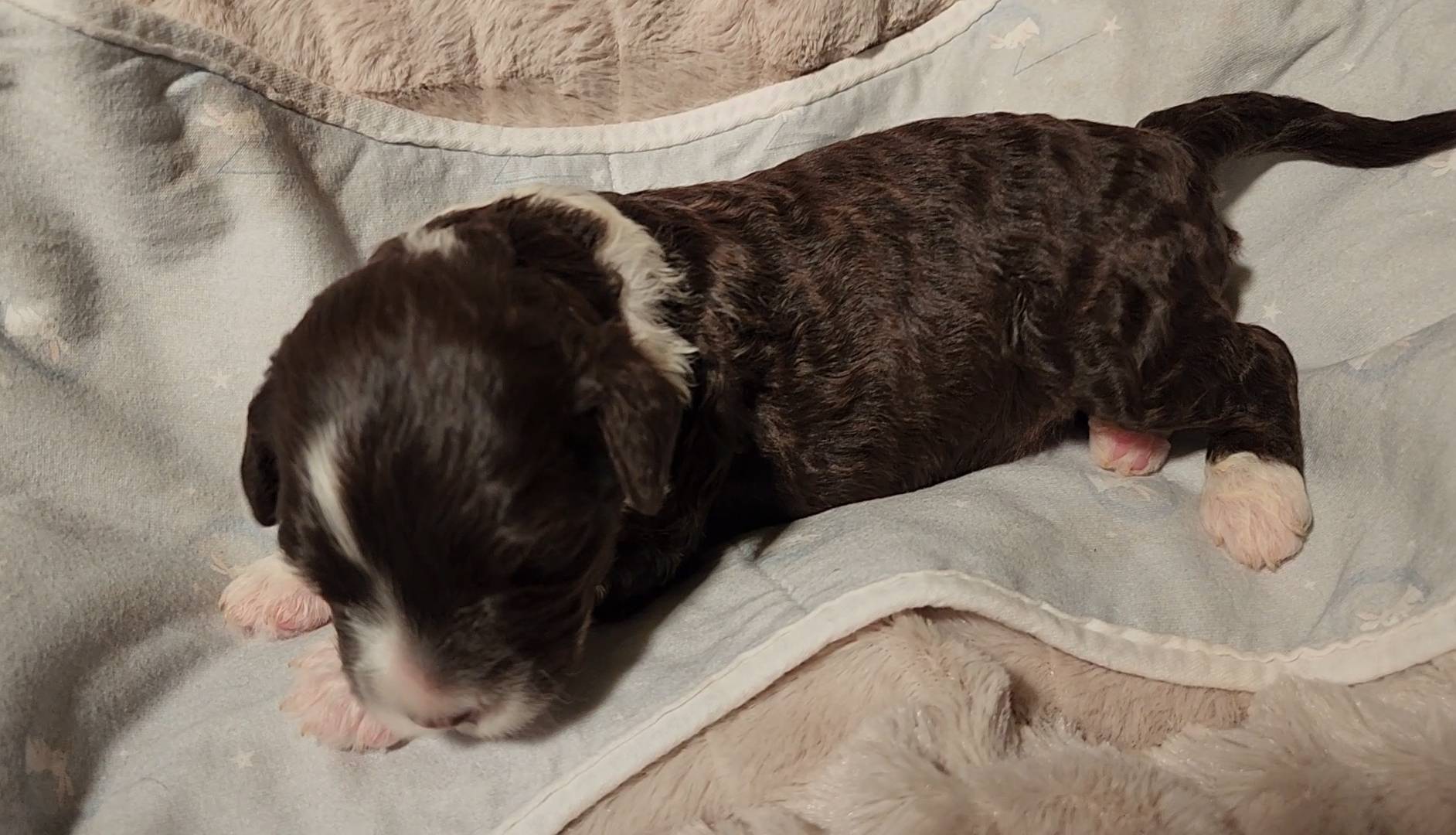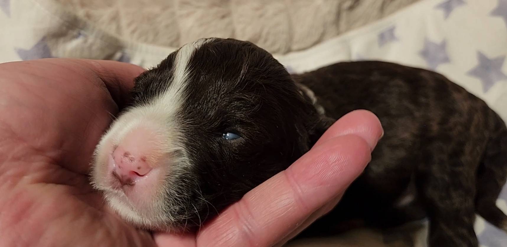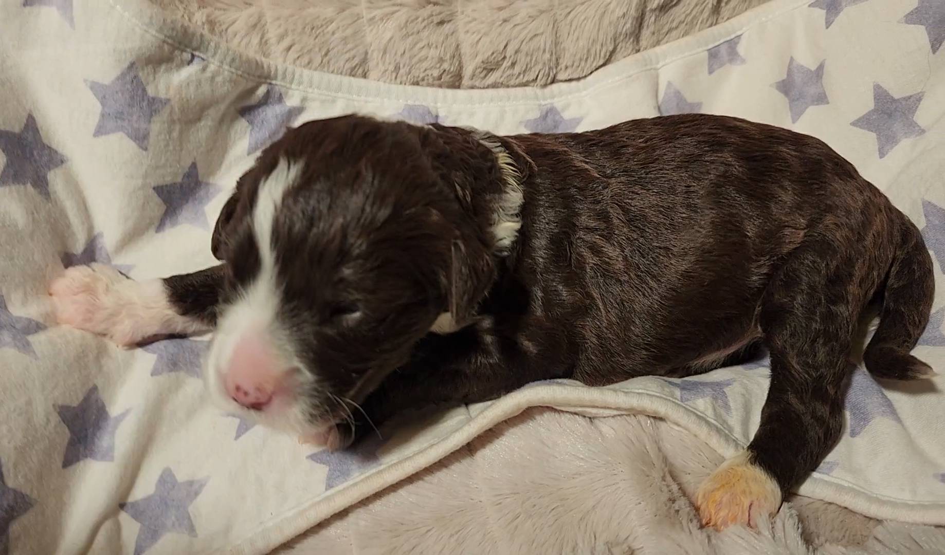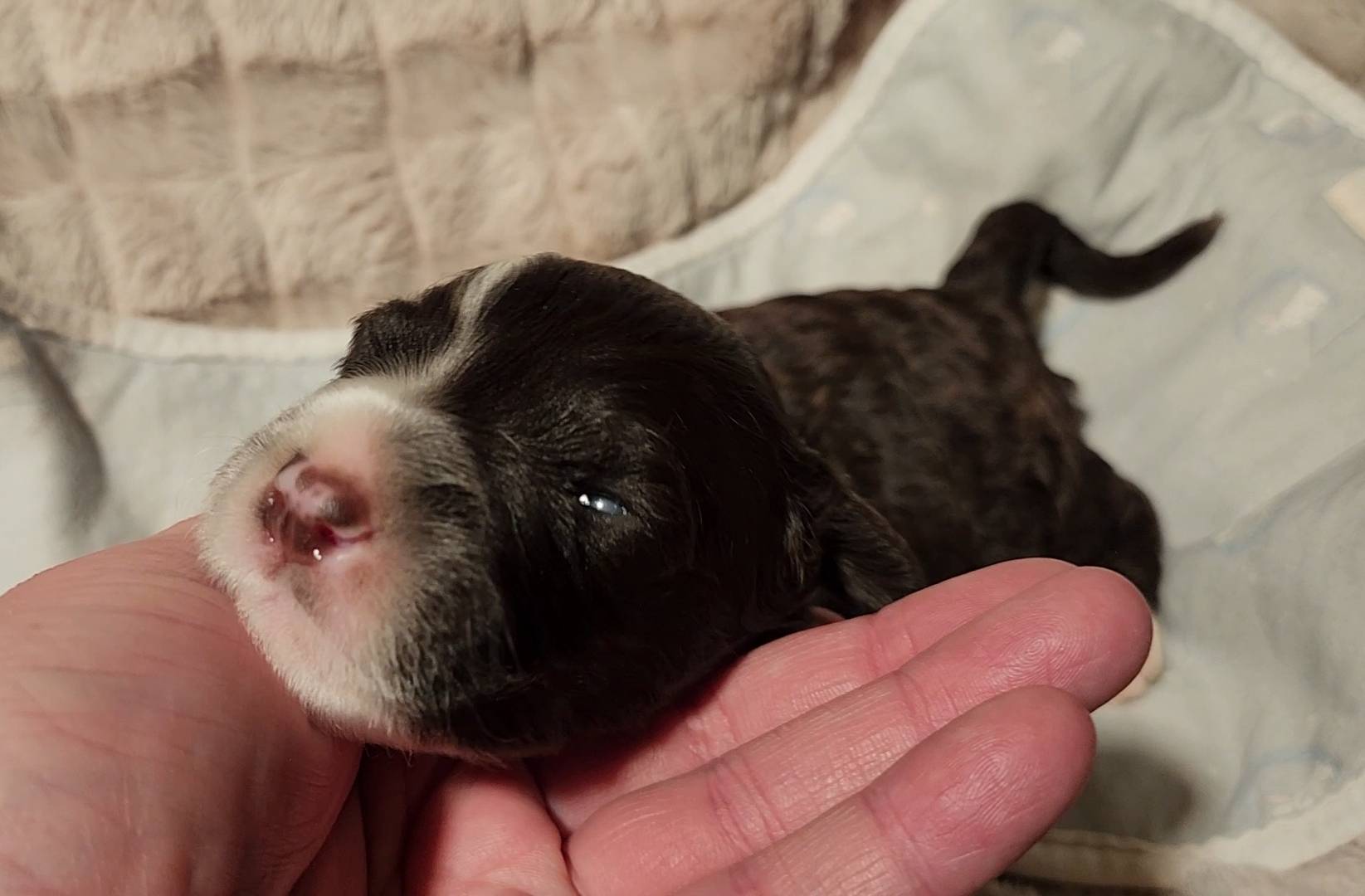 Born on 11/22, 2025, at 3:33pm, this brown boy has a 'freckle' on his lip, just like his dad! But this little stud's freckle is on the left of his face. I also like how thick his brow line is, connecting from nose to collar, that's going to be dashing when he's older. He weighed in at 10 oz day one, our largest pup of the litter this early on!