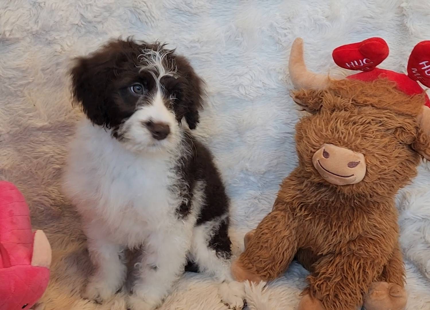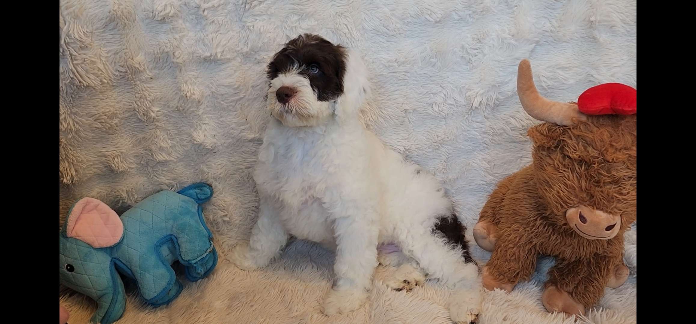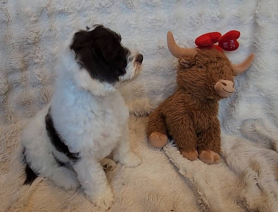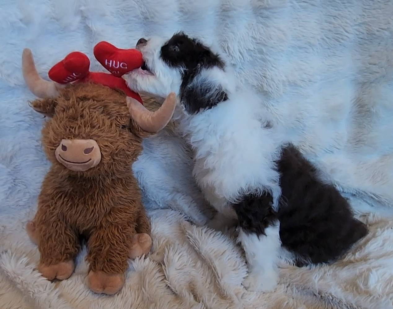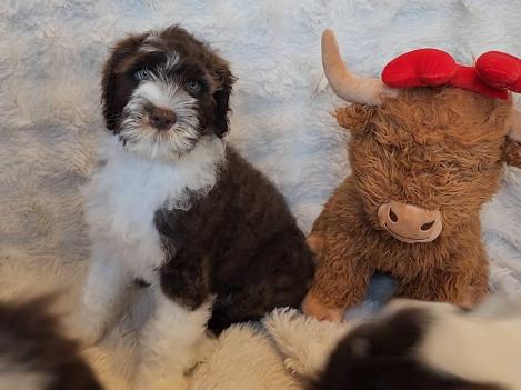 This amazing little boy is a happy little cuddlebug. He's going to be easy to train for his forever family, very responsiveand eager to learn. He's got a lot of love to give, and is both a fan of quiet down time and letting his voice be heard in play~ We love it when our pups sing for joy, the little yaps of puppyhood are an absolute delight, especially when they're in play pose with their little tails wagging high up overhead. He's showing the PWD cleverness trait very clearly, and we're looking at little puzzle boards for him to play with. We expect he'll get a bigger kick out of them than the others, but who knows! He's got an inner calm he's able to summon with a greater ease, his observation skills and willingness to pay attention very promising. When around the home playing, he is the first to cliimb uip on my lap or climb up behind me and lean against me. He is such a personable little pup and will be hard to let go. He will bond so well with his new family and bring you his lifetime of joy. Guaranteed to make his future family very happy.