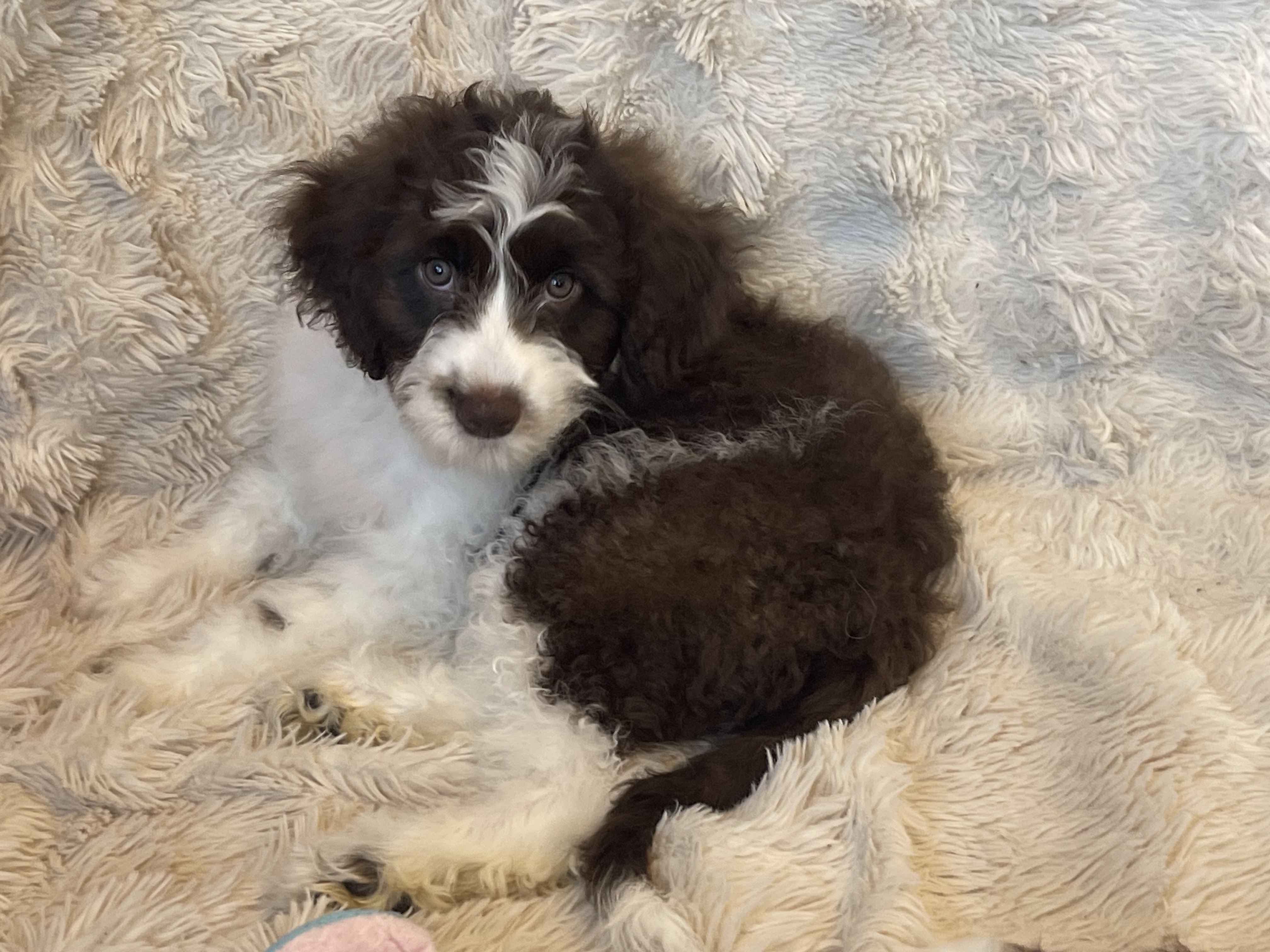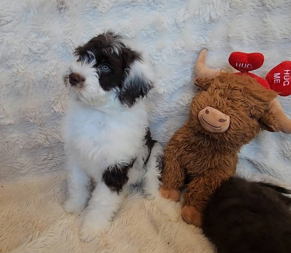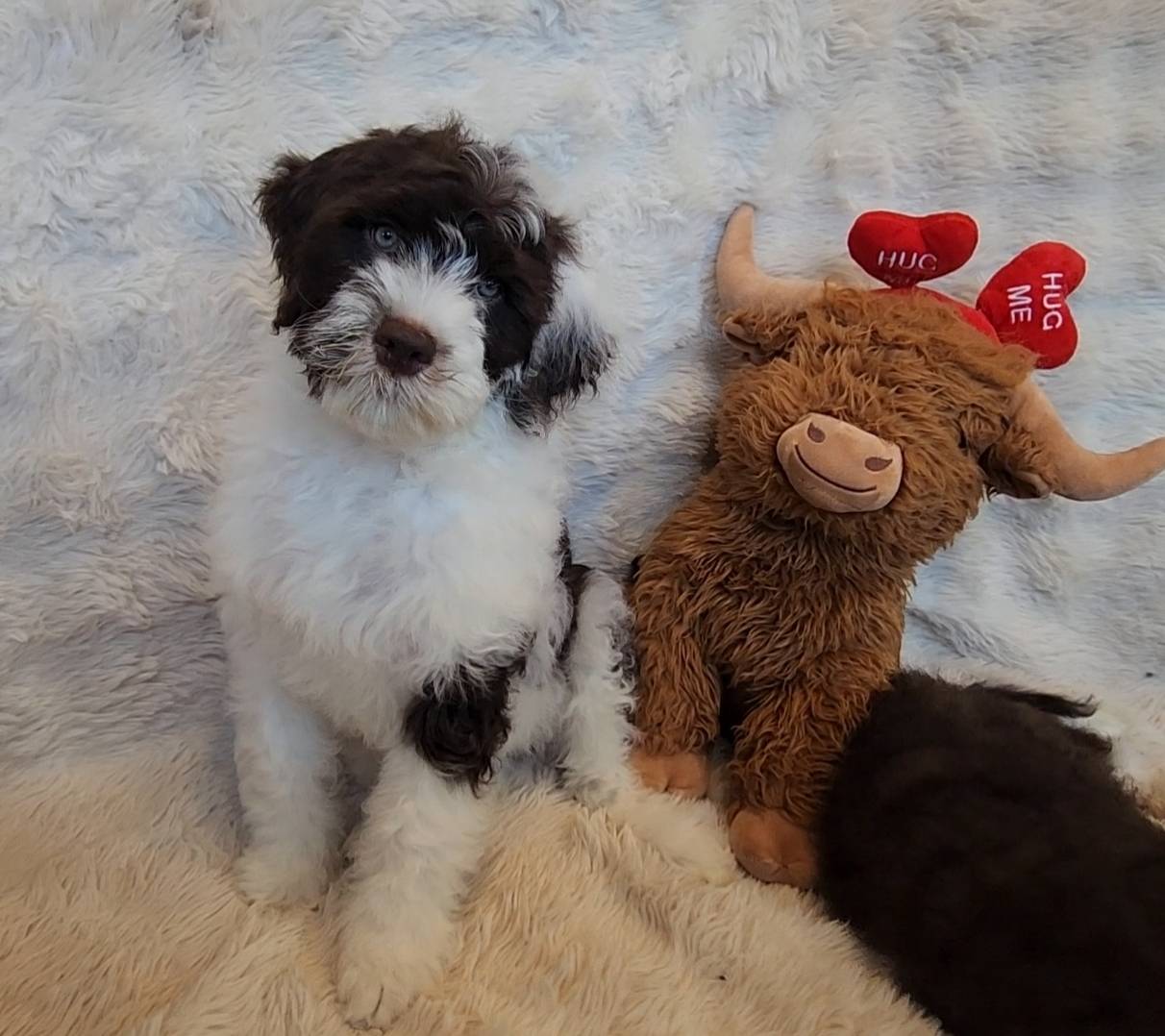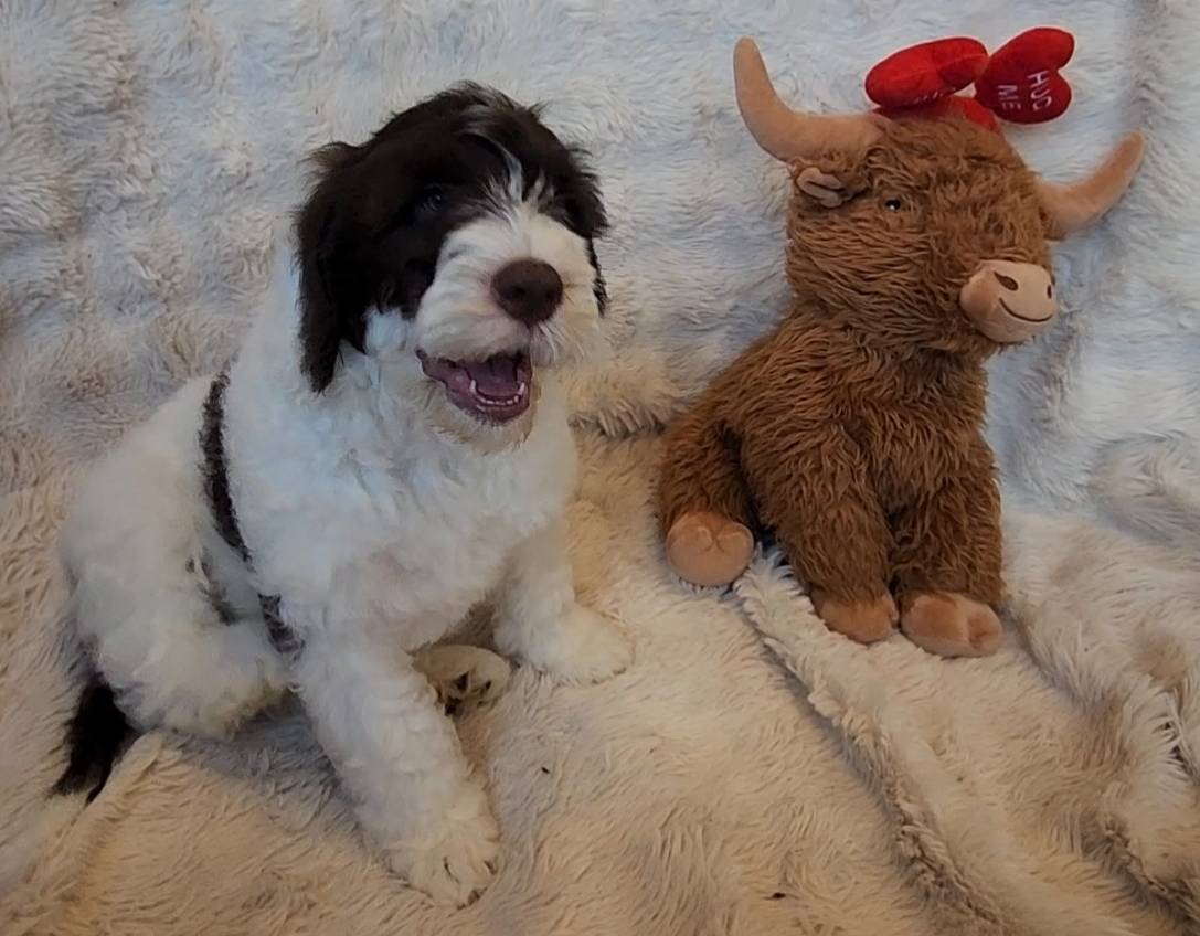 This amazing little boy is a happy little cuddlebug. He's going to be easy to train for his forever family, very responsiveand eager to learn. He's got a lot of love to give, and is both a fan of quiet down time and letting his voice be heard in play~ We love it when our pups sing for joy, the little yaps of puppyhood are an absolute delight, especially when they're in play pose with their little tails wagging high up overhead. He's showing the PWD cleverness trait very clearly, and we're looking at little puzzle boards for him to play with. We expect he'll get a bigger kick out of them than the others, but who knows! He's got an inner calm he's able to summon with a greater ease, his observation skills and willingness to pay attention very promising. When around the home playing, he is the first to cliimb uip on my lap or climb up behind me and lean against me. He is such a personable little pup and will be hard to let go. He will bond so well with his new family and bring you his lifetime of joy. Guaranteed to make his future family very happy.